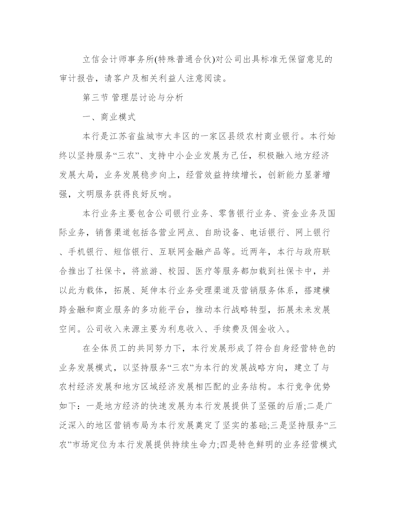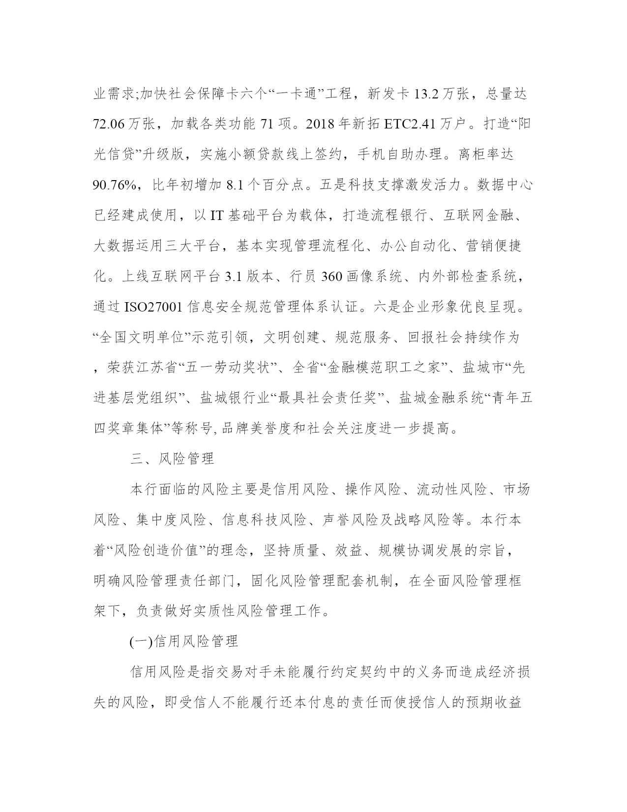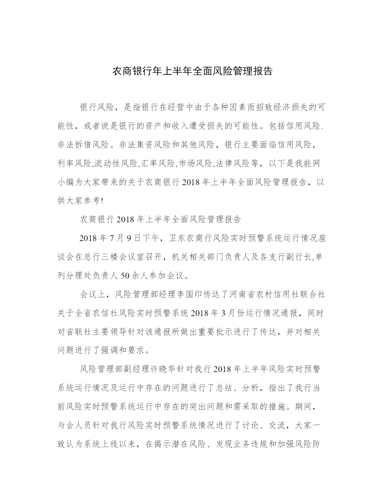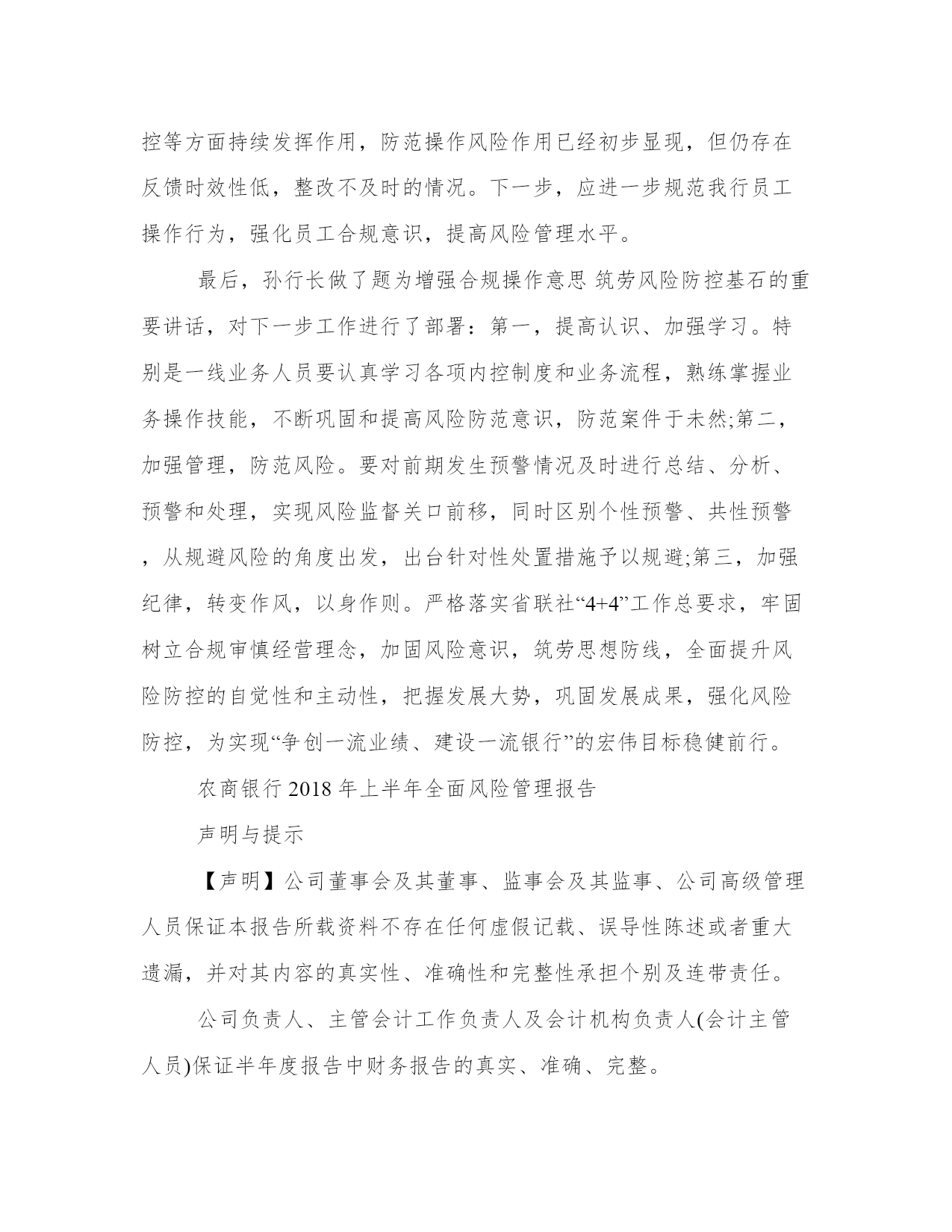 农商银行年上半年全面风险管理报告银行风险,是指银行在经营中由于各种因素而招致经济损失的可能性,或者说是银行的资产和收入遭受损失的可能性。包括信用风险.非法拆借风险。非法集资风险和其他风险,银行主要面临信用风险,利率风险,流动性风险,汇率风险,市场风险,法律风险等,以下是我能网小编为大家带来的关于农商银行2018年上半年全面风险管理报告,以供大家参考!农商银行2018年上半年全面风险管理报告2018年7月9日下午,卫东农商行风险实时预警系统运行情况座谈会在总行三楼会议室召开,机关相关部门负责人及各支行副行长,单列分理处负责人50余人参加会议。会议上,风险管理部经理李国印传达了河南省农村信用社联合社关于全省农信社风险实时预警系统2018年3月份运行情况通报,同时对省联社主要领导针对该通报所做出重要批示进行了传达,并对相关问题进行了强调和要求。风险管理部副经理许晓华针对我行2018年上半年风险实时预警系统运行情况及运行中存在的问题进行了总结、分析,指出了我行当前风险实时预警系统运行中存在的突出问题和需采取的措施。期间,与会人员针对我行风险实时预警系统情况进行了讨论、交流,大家一致认为系统上线以来,在揭示潜在风险、发现业务违规和加强风险防控等方面持续发挥作用,防范操作风险作用已经初步显现,但仍存在反馈时效性低,整改不及时的情况。下一步,应进一步规范我行员工操作行为,强化员工合规意识,提高风险管理水平。最后,孙行长做了题为增强合规操作意思筑劳风险防控基石的重要讲话,对下一步工作进行了部署:第一,提高认识、加强学习。特别是一线业务人员要认真学习各项内控制度和业务流程,熟练掌握业务操作技能,不断巩固和提高风险防范意识,防范案件于未然;第二,加强管理,防范风险。要对前期发生预警情况及时进行总结、分析、预警和处理,实现风险监督关口前移,同时区别个性预警、共性预警,从规避风险的角度出发,出台针对性处置措施予以规避;第三,加强纪律,转变作风,以身作则。严格落实省联社“4+4”工作总要求,牢固树立合规审慎经营理念,加固风险意识,筑劳思想防线,全面提升风险防控的自觉性和主动性,把握发展大势,巩固发展成果,强化风险防控,为实现“争创一流业绩、建设一流银行”的宏伟目标稳健前行。农商银行2018年上半年全面风险管理报告声明与提示【声明】公司董事会及其董事、监事会及其监事、公司高级管理人员保证本报告所载资料不存在任何虚假记载、误导性陈述或者重大遗漏,并对其内容的真实性、准确性和完整性承担个别及连带责任。公司负责人、主管会计工作负责人及会计机构负责人(会计主管人员)保证半年度报告中财务报告的真实、准确、完整。立信会计师事务所(特殊普通合伙)对公司出具标准无保留意见的审计报告,请客户及相关利益人注意阅读。第三节管理层讨论与分析一、商业模式本行是江苏省盐城市大丰区的一家区县级农村商业银行。本行始终以坚持服务“三农”、支持中小企业发展为己任,积极融入地方经济发展大局,业务发展稳步向上,经营效益持续增长,创新能力显著增强,文明服务获得良好反响。本行业务主要包含公司银行业务、零售银行业务、资金业务及国际业务,销售渠道包括各营业网点、自助设备、电话银行、网上银行、手机银行、短信银行、互联网金融产品等。近两年,本行与政府联合推出了社保卡,将旅游、校园、医疗等服务都加载到社保卡中,并以此为载体,拓展、延伸本行业务受理渠道及营销服务体系,搭建横跨金融和商业服务的多功能平台,推动本行战略转型,拓展未来发展空间。公司收入来源主要为利息收入、手续费及佣金收入。在全体员工的共同努力下,本行发展形成了符合自身经营特色的业务发展模式,以坚持服务“三农”为本行的发展战略方向,建立了与农村经济发展和地方区域经济发展相匹配的业务结构。本行竞争优势如下:一是地方经济的快速发展为本行发展提供了坚强的后盾;二是广泛深入的地区营销布局为本行发展奠定了坚实的基础;三是坚持服务“三农”市场定位为本行发展提供持续生命力;四是特色鲜明的业务经营模式为持续发展增添了活力;五是成熟高效的资金业务模式为本行实现新的利润增长点;六是开办国际业务拓宽了本行业务发展渠道。截至报告披露日,本行商业模式较上年度未发生较大变化。二、经营情况回顾2018年,经营层贯彻落实董事会决策部署,分析落实年度目标任务,聚焦新目标,对标高质量,在强监管、治乱象、降杠杆的政策背景下,各项工作取得了新的成绩。一是业务经营稳中求进。至年末,全行各项存款余额336.09亿元,比上年增加31.29亿元,增幅10.27%;各项贷款余额231.81亿元,比上年增加40.44亿元,增幅21.13%;存贷款总量、增量在大丰区银行业机构中排名第一。国际业务结算量达4.36亿美元,突破4亿美元大关。二是质量效益同步提升。至年末,全行不良贷款余额3.47亿元,不良率1