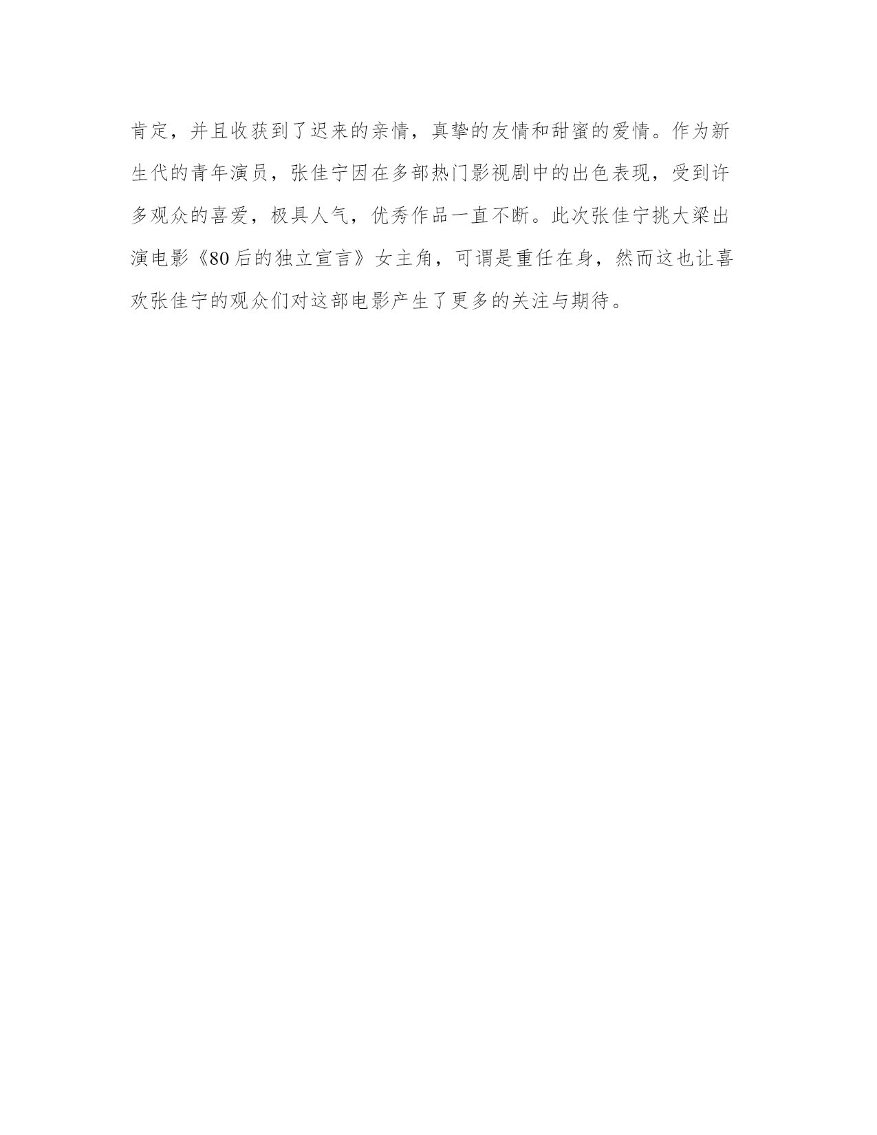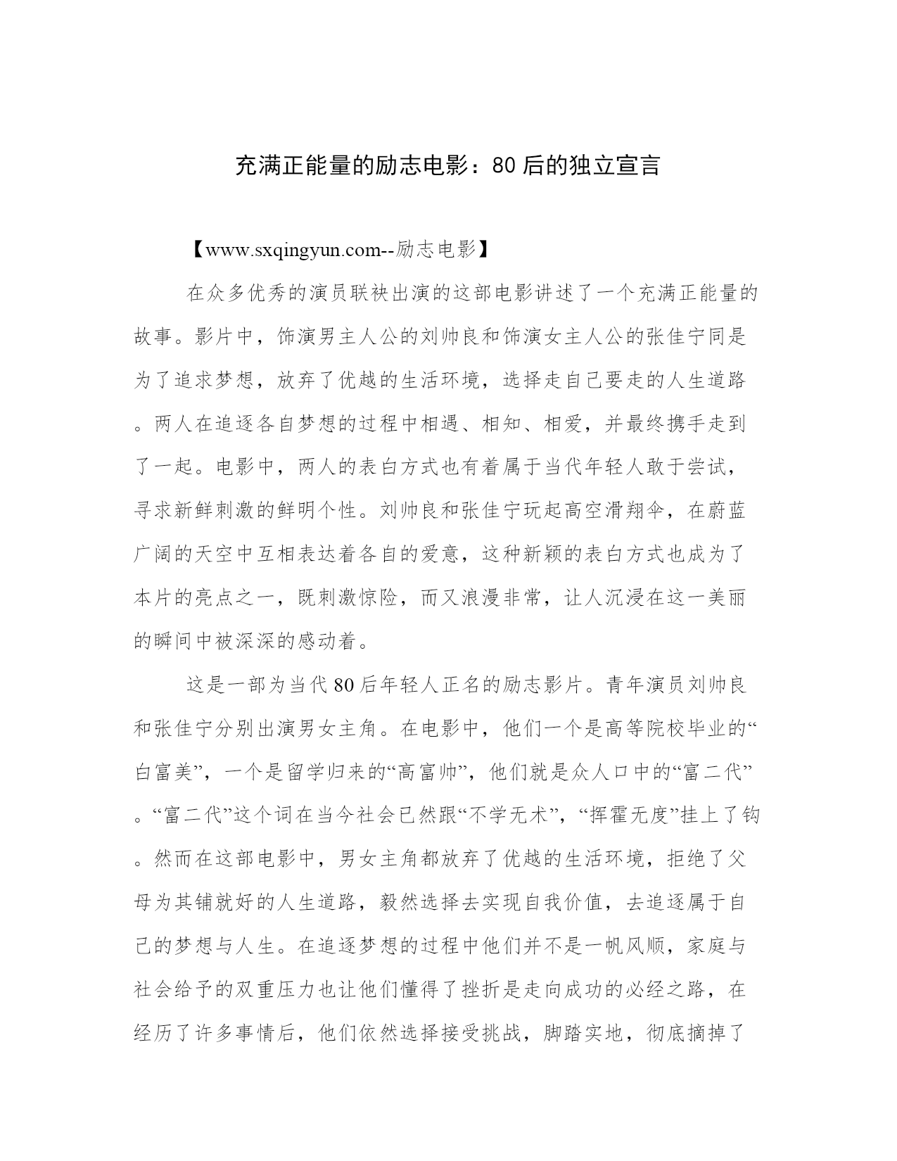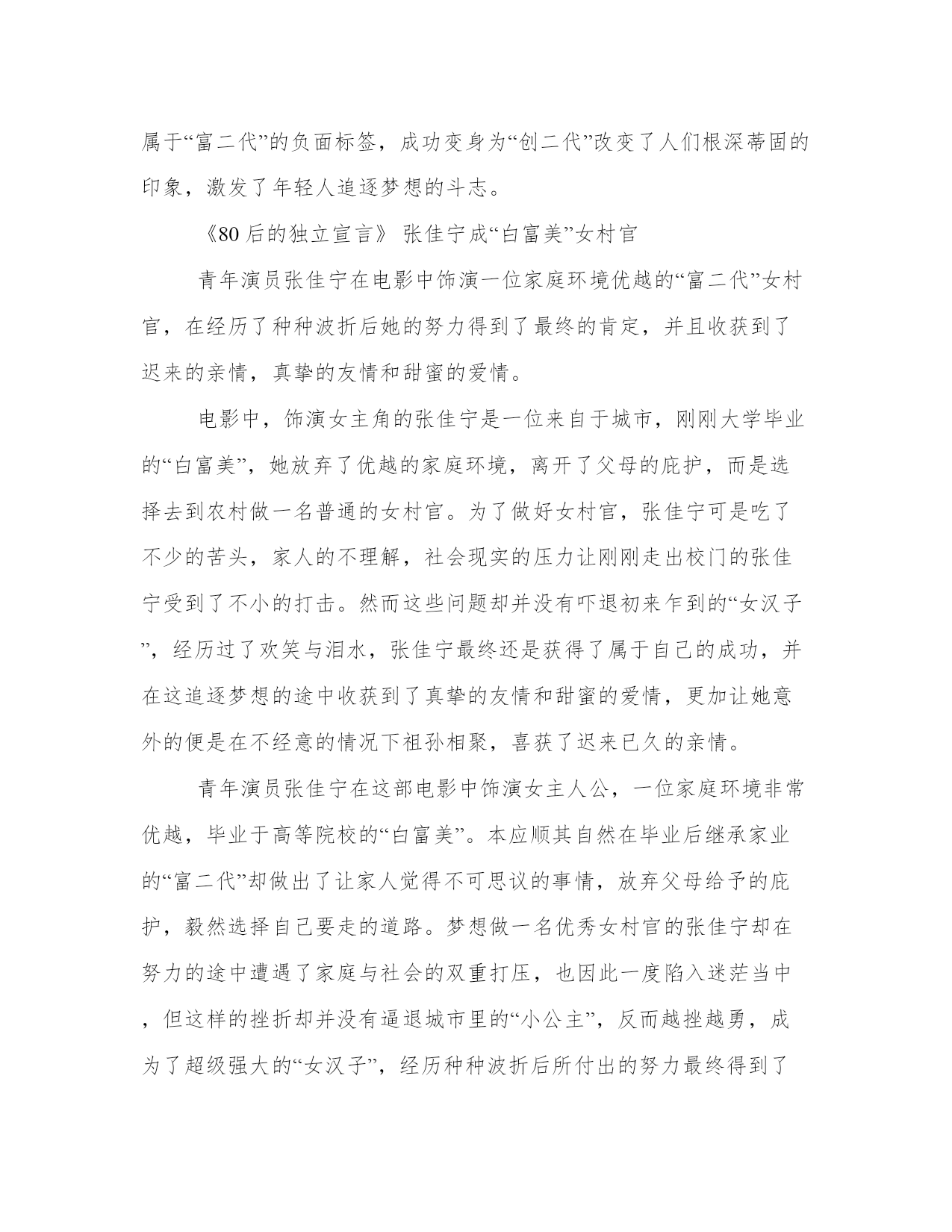 充满正能量的励志电影:80后的独立宣言【www.sxqingyun.com--励志电影】在众多优秀的演员联袂出演的这部电影讲述了一个充满正能量的故事。影片中,饰演男主人公的刘帅良和饰演女主人公的张佳宁同是为了追求梦想,放弃了优越的生活环境,选择走自己要走的人生道路。两人在追逐各自梦想的过程中相遇、相知、相爱,并最终携手走到了一起。电影中,两人的表白方式也有着属于当代年轻人敢于尝试,寻求新鲜刺激的鲜明个性。刘帅良和张佳宁玩起高空滑翔伞,在蔚蓝广阔的天空中互相表达着各自的爱意,这种新颖的表白方式也成为了本片的亮点之一,既刺激惊险,而又浪漫非常,让人沉浸在这一美丽的瞬间中被深深的感动着。这是一部为当代80后年轻人正名的励志影片。青年演员刘帅良和张佳宁分别出演男女主角。在电影中,他们一个是高等院校毕业的“白富美”,一个是留学归来的“高富帅”,他们就是众人口中的“富二代”。“富二代”这个词在当今社会已然跟“不学无术”,“挥霍无度”挂上了钩。然而在这部电影中,男女主角都放弃了优越的生活环境,拒绝了父母为其铺就好的人生道路,毅然选择去实现自我价值,去追逐属于自己的梦想与人生。在追逐梦想的过程中他们并不是一帆风顺,家庭与社会给予的双重压力也让他们懂得了挫折是走向成功的必经之路,在经历了许多事情后,他们依然选择接受挑战,脚踏实地,彻底摘掉了属于“富二代”的负面标签,成功变身为“创二代”改变了人们根深蒂固的印象,激发了年轻人追逐梦想的斗志。《80后的独立宣言》张佳宁成“白富美”女村官青年演员张佳宁在电影中饰演一位家庭环境优越的“富二代”女村官,在经历了种种波折后她的努力得到了最终的肯定,并且收获到了迟来的亲情,真挚的友情和甜蜜的爱情。电影中,饰演女主角的张佳宁是一位来自于城市,刚刚大学毕业的“白富美”,她放弃了优越的家庭环境,离开了父母的庇护,而是选择去到农村做一名普通的女村官。为了做好女村官,张佳宁可是吃了不少的苦头,家人的不理解,社会现实的压力让刚刚走出校门的张佳宁受到了不小的打击。然而这些问题却并没有吓退初来乍到的“女汉子”,经历过了欢笑与泪水,张佳宁最终还是获得了属于自己的成功,并在这追逐梦想的途中收获到了真挚的友情和甜蜜的爱情,更加让她意外的便是在不经意的情况下祖孙相聚,喜获了迟来已久的亲情。青年演员张佳宁在这部电影中饰演女主人公,一位家庭环境非常优越,毕业于高等院校的“白富美”。本应顺其自然在毕业后继承家业的“富二代”却做出了让家人觉得不可思议的事情,放弃父母给予的庇护,毅然选择自己要走的道路。梦想做一名优秀女村官的张佳宁却在努力的途中遭遇了家庭与社会的双重打压,也因此一度陷入迷茫当中,但这样的挫折却并没有逼退城市里的“小公主”,反而越挫越勇,成为了超级强大的“女汉子”,经历种种波折后所付出的努力最终得到了肯定,并且收获到了迟来的亲情,真挚的友情和甜蜜的爱情。作为新生代的青年演员,张佳宁因在多部热门影视剧中的出色表现,受到许多观众的喜爱,极具人气,优秀作品一直不断。此次张佳宁挑大梁出演电影《80后的独立宣言》女主角,可谓是重任在身,然而这也让喜欢张佳宁的观众们对这部电影产生了更多的关注与期待。