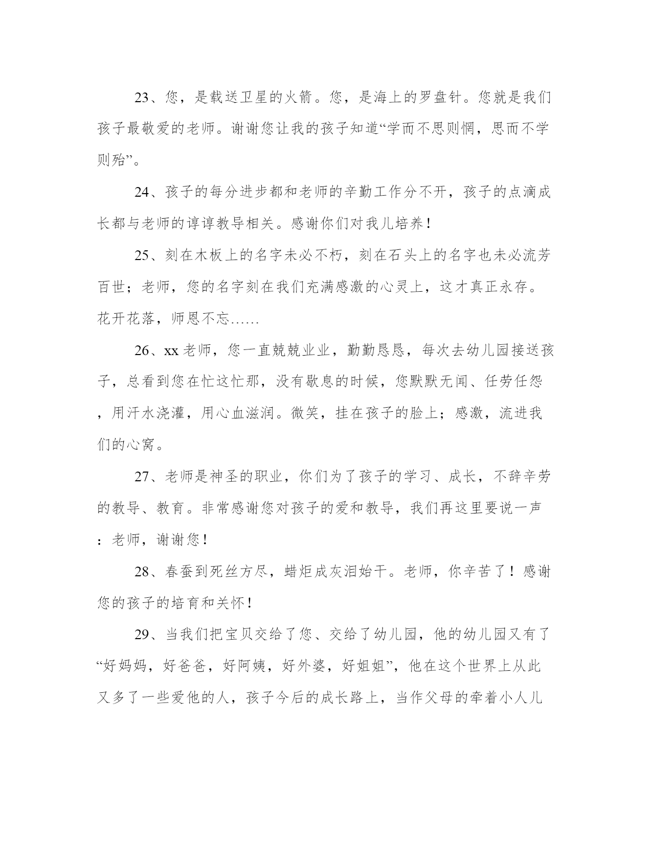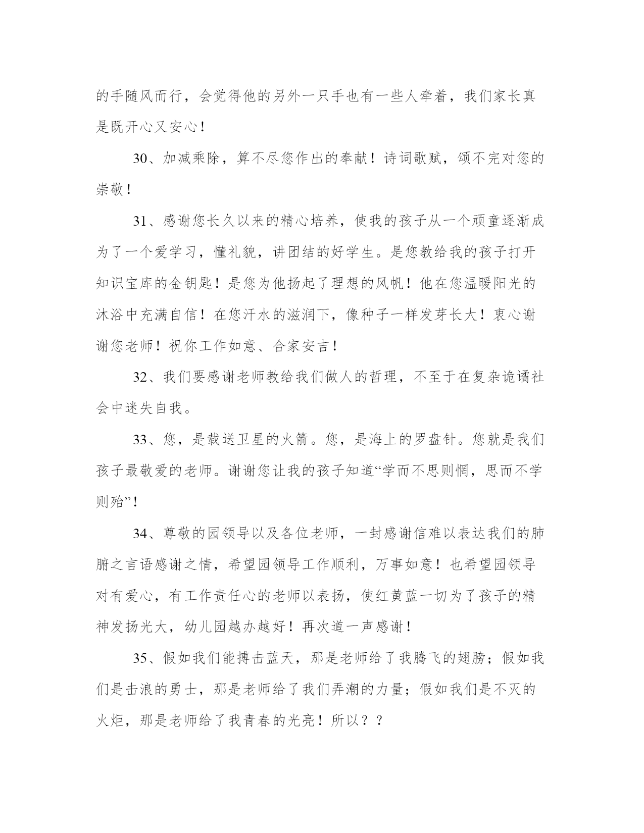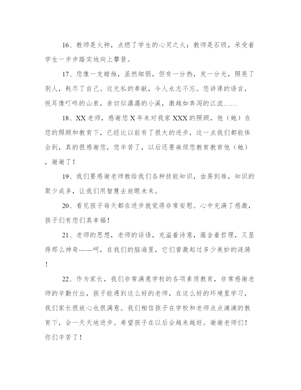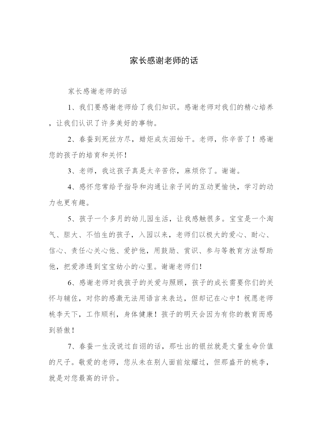 家长感谢老师的话家长感谢老师的话1、我们要感谢老师给了我们知识。感谢老师对我们的精心培养,让我们认识了许多美好的事物。2、春蚕到死丝方尽,蜡炬成灰泪始干。老师,你辛苦了!感谢您的孩子的培育和关怀!3、老师,我这孩子真是太辛苦你,麻烦你了。谢谢。4、感怀您常给予指导和沟通让亲子间的互动更愉快,学习的动力也更有趣。5、孩子一个多月的幼儿园生活,让我感触很多。宝宝是一个淘气、胆大、不怕生的孩子,入园以来,老师们以极大的爱心、耐心、信心、责任心关心他、爱护他,用鼓励、赏识、参与等教育方法帮助他,把爱渗透到宝宝幼小的心里。谢谢老师们!6、感谢老师对我孩子的关爱与照顾,孩子的成长需要你们的关怀与辅佐,对你的感激无法用语言来表达,但却记在心中!祝愿老师桃李天下,工作顺利,身体健康!孩子的明天会因为有你的教育而感到骄傲!7、春蚕一生没说过自诩的话,那吐出的银丝就是丈量生命价值的尺子。敬爱的老师,您从未在别人面前炫耀过,但那盛开的桃李,就是对您最高的评价。8、悦耳的铃声,妖艳的鲜花,都受时间的限制,只有我的祝福永恒,永远永远祝福您,给我孩子智慧之泉的老师!祝您身体健康、生活幸福!9、孩子的成长不仅需要阳光和水分,更需要我们真诚的理解、尊重和关爱。我们相信,爱是沟通我们与孩子心灵的桥梁。在这一点,你们的做的真的很好很到位,我的孩子时常表现出来对别人的关爱让我们很欣慰,谢谢你们,希望孩子们今后在你们那边能够越来越懂事,越来越开朗!10、对您的感激千言万语也无法表达,对您的祝福百十万年也不会改变――老师,祝您万事如意!11、您的爱,太阳一般温暖,春风一般和煦,清泉一般甘甜。您的爱,比父爱更严峻,比母爱更细腻,比友爱更纯洁。您——老师的爱,天下最伟大,最高洁。12、老师,我对您的了解不深,可是,我还是要说一句:谢谢,多注意身体,别为孩子们太劳累了。13、我们随时准备好调整脚步,希望能与陈老师有最好的亲师沟通,支持您的教育理念。祝福您!14、对您的感激千言万语也无法表达,对您的祝福百十万年也不会改变——老师,祝您万事如意!15、感谢恩师有一道彩虹不出现在雨后也出现在天空它却常出现在我心中敲击着我……认认真直地做事清清白白地做人。16、教师是火种,点燃了学生的心灵之火;教师是石级,承受着学生一步步踏实地向上攀登。17、您像一支蜡烛,虽然细弱,但有一分热,发一分光,照亮了别人,耗尽了自己。这无私的奉献,令人永志不忘。您讲课的语言,悦耳像叮咚的山泉,亲切似潺潺的小溪,激越如奔泻的江流……18、XX老师,感谢您X年来对我家XXX的照顾,他(她)在您的照顾和教育下,已经比以前有了很大的进步,这一点我们都能体会到,真的很感谢您,您辛苦了,以后还要麻烦您教育教育他(她),谢谢了!19、我们要感谢老师教给我们各种技能知识,由易到难,知识的聚少成多,让我们用智慧去放眼未来。20、看见孩子每天都在进步就觉得非常安慰。心中充满了感激,孩子们有您们真幸福!21、老师的思想,老师的话语,充溢着诗意,蕴含着哲理,又显得那么神奇――呵,在我们的脑海里,它们曾激起过多少美妙的涟漪!22、作为家长,我们非常满意学校的各项素质教育,非常感谢老师的辛勤付出,孩子能遇到这么好的老师,在这么好的环境里学习,我们家长很放心也很满意。我们相信孩子在学校和老师点点滴滴的教育下,会一天天地进步。希望孩子在以后会越来越好。谢谢老师们!你们辛苦了!23、您,是载送卫星的火箭。您,是海上的罗盘针。您就是我们孩子最敬爱的老师。谢谢您让我的孩子知道“学而不思则惘,思而不学则殆”。24、孩子的每分进步都和老师的辛勤工作分不开,孩子的点滴成长都与老师的谆谆教导相关。感谢你们对我儿培养!25、刻在木板上的名字未必不朽,刻在石头上的名字也未必流芳百世;老师,您的名字刻在我们充满感激的心灵上,这才真正永存。花开花落,师恩不忘……26、xx老师,您一直兢兢业业,勤勤恳恳,每次去幼儿园接送孩子,总看到您在忙这忙那,没有歇息的时候,您默默无闻、任劳任怨,用汗水浇灌,用心血滋润。微笑,挂在孩子的脸上;感激,流进我们的心窝。27、老师是神圣的职业,你们为了孩子的学习、成长,不辞辛劳的教导、教育。非常感谢您对孩子的爱和教导,我们再这里要说一声:老师,谢谢您!28、春蚕到死丝方尽,蜡炬成灰泪始干。老师,你辛苦了!感谢您的孩子的培育和关怀!29、当我们把宝贝交给了您、交给了幼儿园,他的幼儿园又有了“好妈妈,好爸爸,好阿姨,好外婆,好姐姐”,他在这个世界上从此又多了一些爱他的人,孩子今后的成长路上,当作父母的牵着小人儿的手随风而行,会觉得他的另外一只手也有一些人牵着,我们家长真是既开心又安心!30、加减乘除,算不尽您作出的奉献!诗词歌赋,颂不完对您的崇敬!31、感谢您长久以来的精心培养,使我的孩子从一个顽童逐渐成为了一个爱学习,懂礼貌,讲团