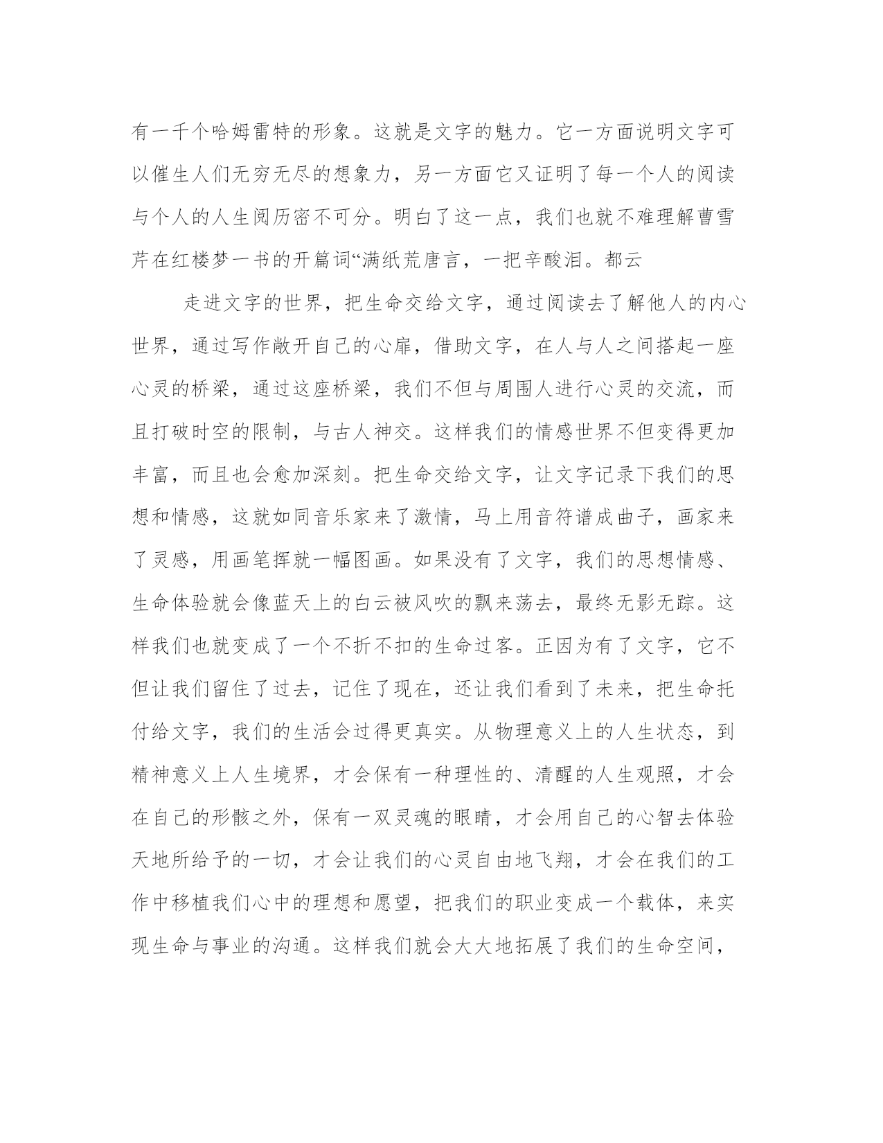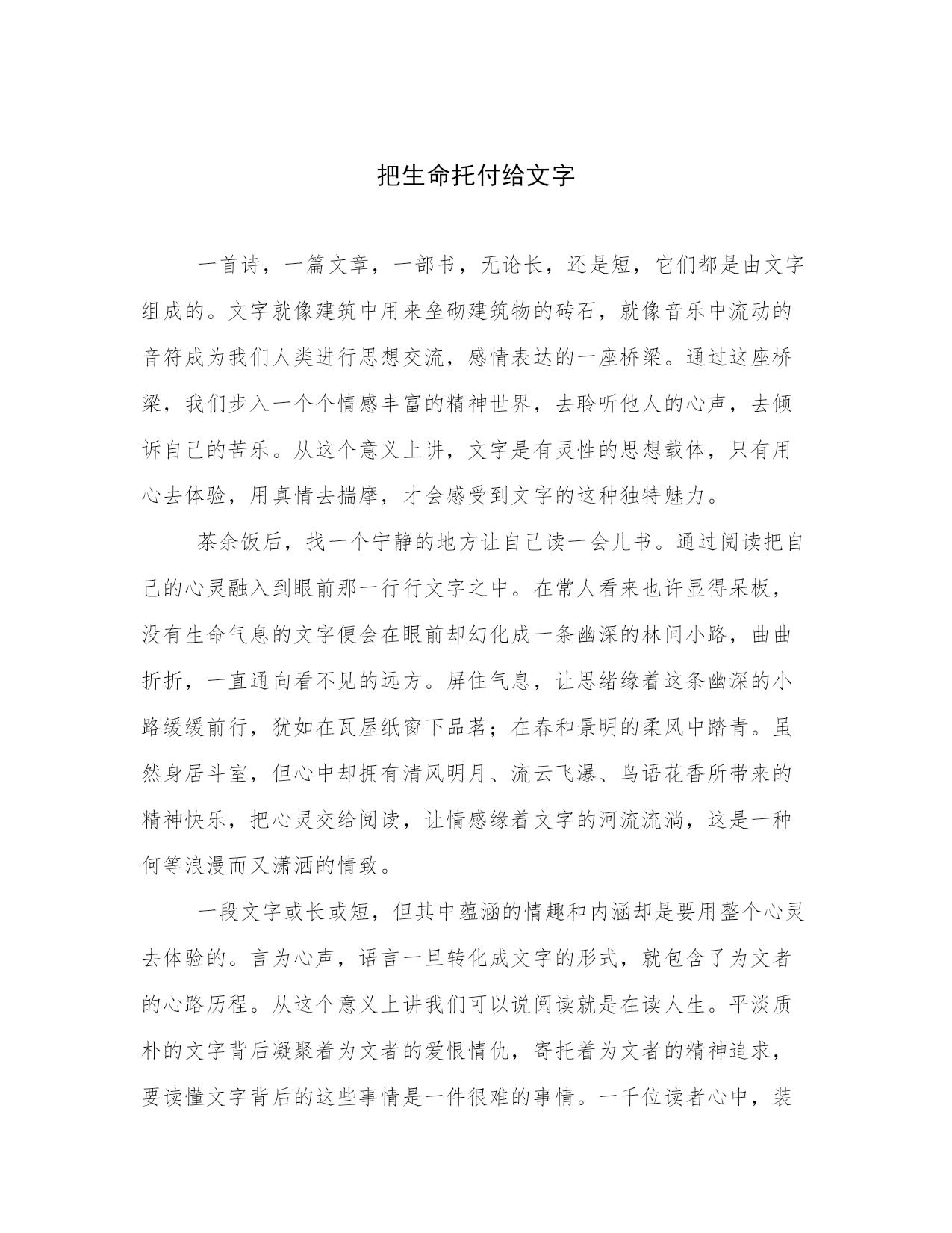 把生命托付给文字一首诗,一篇文章,一部书,无论长,还是短,它们都是由文字组成的。文字就像建筑中用来垒砌建筑物的砖石,就像音乐中流动的音符成为我们人类进行思想交流,感情表达的一座桥梁。通过这座桥梁,我们步入一个个情感丰富的精神世界,去聆听他人的心声,去倾诉自己的苦乐。从这个意义上讲,文字是有灵性的思想载体,只有用心去体验,用真情去揣摩,才会感受到文字的这种独特魅力。茶余饭后,找一个宁静的地方让自己读一会儿书。通过阅读把自己的心灵融入到眼前那一行行文字之中。在常人看来也许显得呆板,没有生命气息的文字便会在眼前却幻化成一条幽深的林间小路,曲曲折折,一直通向看不见的远方。屏住气息,让思绪缘着这条幽深的小路缓缓前行,犹如在瓦屋纸窗下品茗;在春和景明的柔风中踏青。虽然身居斗室,但心中却拥有清风明月、流云飞瀑、鸟语花香所带来的精神快乐,把心灵交给阅读,让情感缘着文字的河流流淌,这是一种何等浪漫而又潇洒的情致。一段文字或长或短,但其中蕴涵的情趣和内涵却是要用整个心灵去体验的。言为心声,语言一旦转化成文字的形式,就包含了为文者的心路历程。从这个意义上讲我们可以说阅读就是在读人生。平淡质朴的文字背后凝聚着为文者的爱恨情仇,寄托着为文者的精神追求,要读懂文字背后的这些事情是一件很难的事情。一千位读者心中,装有一千个哈姆雷特的形象。这就是文字的魅力。它一方面说明文字可以催生人们无穷无尽的想象力,另一方面它又证明了每一个人的阅读与个人的人生阅历密不可分。明白了这一点,我们也就不难理解曹雪芹在红楼梦一书的开篇词“满纸荒唐言,一把辛酸泪。都云走进文字的世界,把生命交给文字,通过阅读去了解他人的内心世界,通过写作敞开自己的心扉,借助文字,在人与人之间搭起一座心灵的桥梁,通过这座桥梁,我们不但与周围人进行心灵的交流,而且打破时空的限制,与古人神交。这样我们的情感世界不但变得更加丰富,而且也会愈加深刻。把生命交给文字,让文字记录下我们的思想和情感,这就如同音乐家来了激情,马上用音符谱成曲子,画家来了灵感,用画笔挥就一幅图画。如果没有了文字,我们的思想情感、生命体验就会像蓝天上的白云被风吹的飘来荡去,最终无影无踪。这样我们也就变成了一个不折不扣的生命过客。正因为有了文字,它不但让我们留住了过去,记住了现在,还让我们看到了未来,把生命托付给文字,我们的生活会过得更真实。从物理意义上的人生状态,到精神意义上人生境界,才会保有一种理性的、清醒的人生观照,才会在自己的形骸之外,保有一双灵魂的眼睛,才会用自己的心智去体验天地所给予的一切,才会让我们的心灵自由地飞翔,才会在我们的工作中移植我们心中的理想和愿望,把我们的职业变成一个载体,来实现生命与事业的沟通。这样我们就会大大地拓展了我们的生命空间,让我们更充分,更自由、更和谐地行走在人生的旅途上,去欣赏沿途一道道靓丽的生命风景。