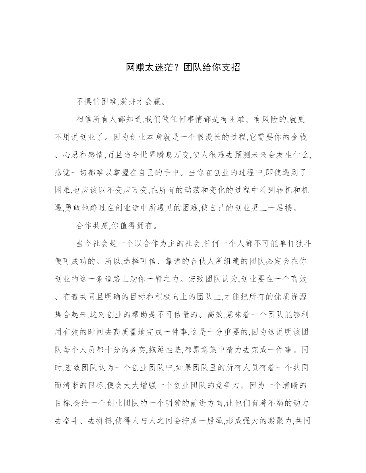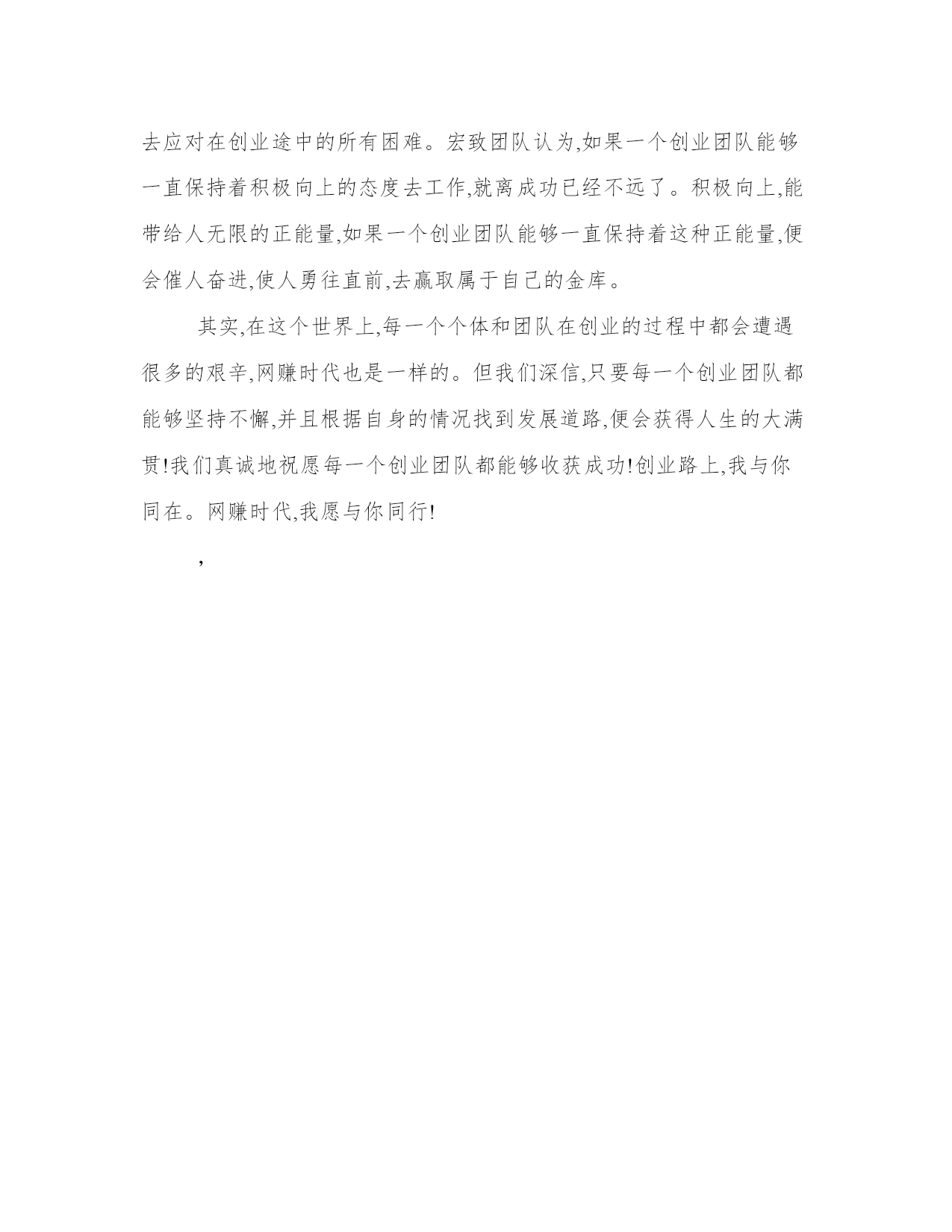 网赚太迷茫?团队给你支招不惧怕困难,爱拼才会赢。相信所有人都知道,我们做任何事情都是有困难、有风险的,就更不用说创业了。因为创业本身就是一个很漫长的过程,它需要你的金钱、心思和感情,而且当今世界瞬息万变,使人很难去预测未来会发生什么,感觉一切都难以掌握在自己的手中。当你在创业的过程中,即使遇到了困难,也应该以不变应万变,在所有的动荡和变化的过程中看到转机和机遇,勇敢地跨过在创业途中所遇见的困难,使自己的创业更上一层楼。合作共赢,你值得拥有。当今社会是一个以合作为主的社会,任何一个人都不可能单打独斗便可成功的。所以,选择可信、靠谱的合伙人所组建的团队必定会在你创业的这一条道路上助你一臂之力。宏致团队认为,创业要在一个高效、有着共同且明确的目标和积极向上的团队上,才能把所有的优质资源集合起来,这对创业的帮助是不可估量的。高效,意味着一个团队能够利用有效的时间去高质量地完成一件事,这是十分重要的,因为这说明该团队每个人员都十分的务实,拖延性差,都愿意集中精力去完成一件事。同时,宏致团队认为一个创业团队中,如果团队里的所有人员有着一个共同而清晰的目标,便会大大增强一个创业团队的竞争力。因为一个清晰的目标,会给一个创业团队的一个明确的前进方向,让他们有着不竭的动力去奋斗、去拼搏,使得人与人之间会拧成一股绳,形成强大的凝聚力,共同去应对在创业途中的所有困难。宏致团队认为,如果一个创业团队能够一直保持着积极向上的态度去工作,就离成功已经不远了。积极向上,能带给人无限的正能量,如果一个创业团队能够一直保持着这种正能量,便会催人奋进,使人勇往直前,去赢取属于自己的金库。其实,在这个世界上,每一个个体和团队在创业的过程中都会遭遇很多的艰辛,网赚时代也是一样的。但我们深信,只要每一个创业团队都能够坚持不懈,并且根据自身的情况找到发展道路,便会获得人生的大满贯!我们真诚地祝愿每一个创业团队都能够收获成功!创业路上,我与你同在。网赚时代,我愿与你同行!,