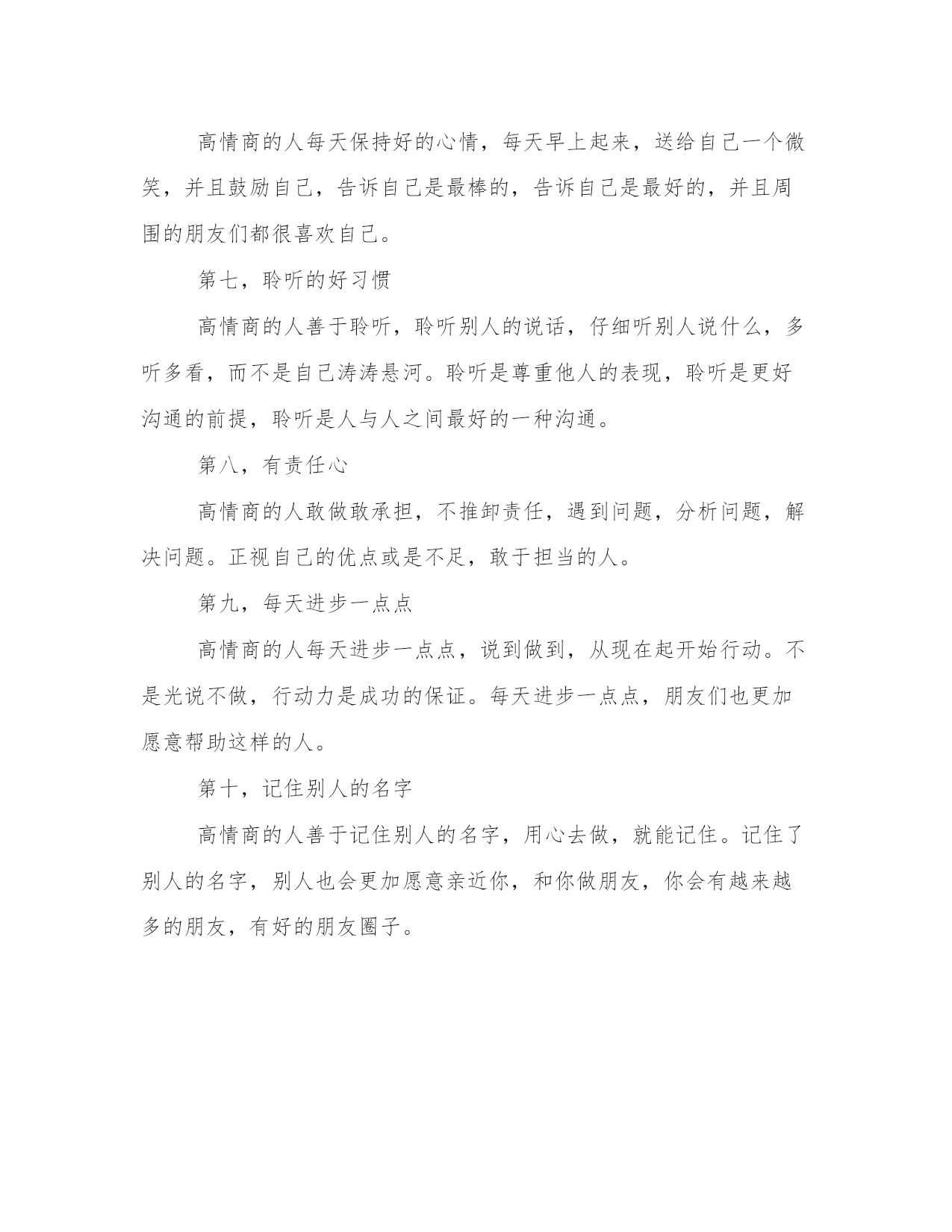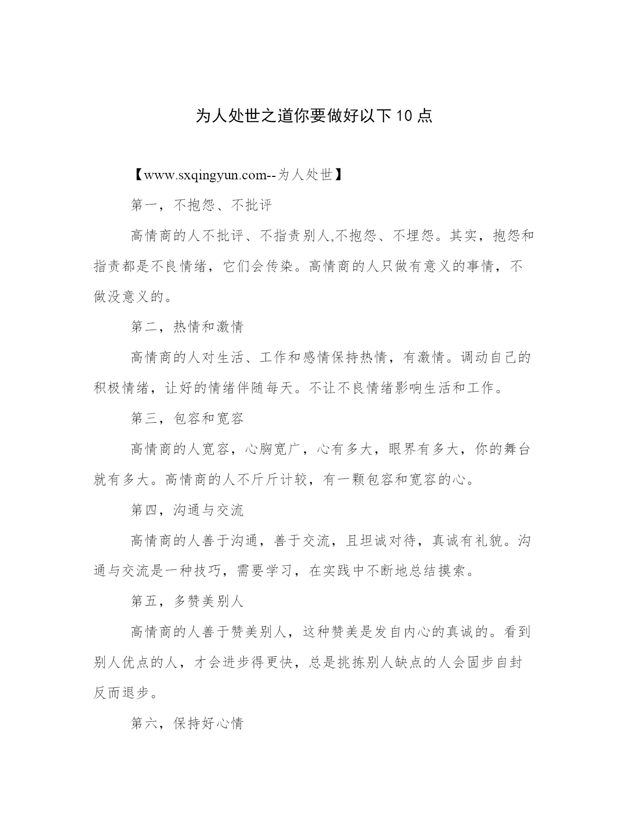 为人处世之道你要做好以下10点【www.sxqingyun.com--为人处世】第一,不抱怨、不批评高情商的人不批评、不指责别人,不抱怨、不埋怨。其实,抱怨和指责都是不良情绪,它们会传染。高情商的人只做有意义的事情,不做没意义的。第二,热情和激情高情商的人对生活、工作和感情保持热情,有激情。调动自己的积极情绪,让好的情绪伴随每天。不让不良情绪影响生活和工作。第三,包容和宽容高情商的人宽容,心胸宽广,心有多大,眼界有多大,你的舞台就有多大。高情商的人不斤斤计较,有一颗包容和宽容的心。第四,沟通与交流高情商的人善于沟通,善于交流,且坦诚对待,真诚有礼貌。沟通与交流是一种技巧,需要学习,在实践中不断地总结摸索。第五,多赞美别人高情商的人善于赞美别人,这种赞美是发自内心的真诚的。看到别人优点的人,才会进步得更快,总是挑拣别人缺点的人会固步自封反而退步。第六,保持好心情高情商的人每天保持好的心情,每天早上起来,送给自己一个微笑,并且鼓励自己,告诉自己是最棒的,告诉自己是最好的,并且周围的朋友们都很喜欢自己。第七,聆听的好习惯高情商的人善于聆听,聆听别人的说话,仔细听别人说什么,多听多看,而不是自己涛涛悬河。聆听是尊重他人的表现,聆听是更好沟通的前提,聆听是人与人之间最好的一种沟通。第八,有责任心高情商的人敢做敢承担,不推卸责任,遇到问题,分析问题,解决问题。正视自己的优点或是不足,敢于担当的人。第九,每天进步一点点高情商的人每天进步一点点,说到做到,从现在起开始行动。不是光说不做,行动力是成功的保证。每天进步一点点,朋友们也更加愿意帮助这样的人。第十,记住别人的名字高情商的人善于记住别人的名字,用心去做,就能记住。记住了别人的名字,别人也会更加愿意亲近你,和你做朋友,你会有越来越多的朋友,有好的朋友圈子。