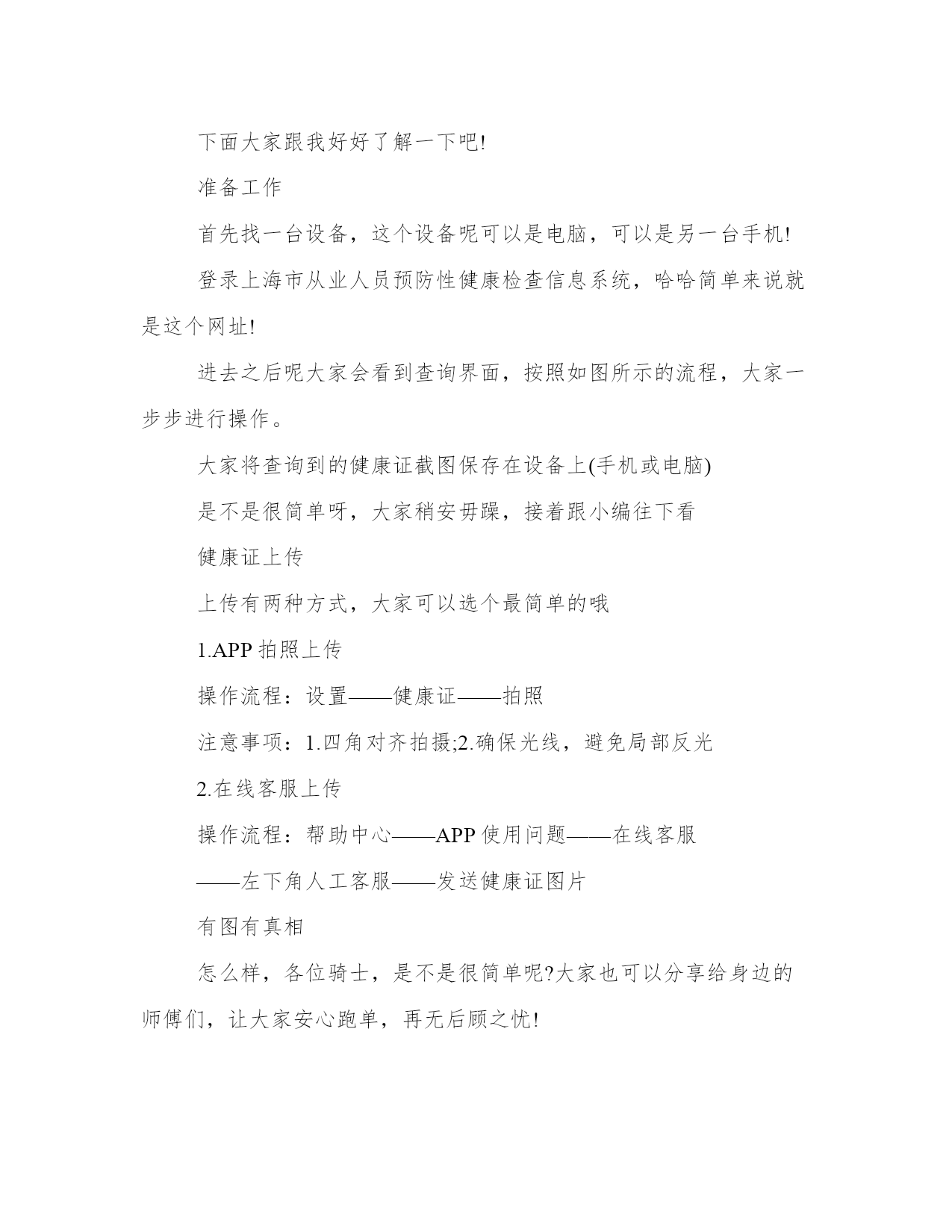 美团众包不上传健康证能接单吗_美团怎么上传健康证健康证是指预防性健康检查证明,证明受检者具备做从业规定的健康素质。下面是大家网为大家整理的美团怎么上传健康证,供大家参考。美团怎么上传健康证首先我们要去办理健康证:方法:联系这个人加他微信号412767607此人专业审核诚信第一,百分百审核包过简单方便免体检!众所周知,在食品行业,健康安全是最重要的,从食品的加工生产到包装运输,每个人参与者都要有健康保证,说到这里大家肯定猜到了,今天的主角就是我们人手一份的——健康证!据小编了解,不论是新入门的师傅还是已经跑单多年的老师傅们,都面临上传健康证经常被驳回的情况,今天小编就给大家分享一下,健康证上传的锦囊妙计!健康证目前有两种样式的,一种是卡片式健康证,办理医院直接会给咱们一张卡片,这种呢上传最简单,直接拍照就完事,今天小编要着重讲的是电子版健康证。目前大多数医院办理的健康证就是电子版,医院会给大家一张办理回执单(一张打印出来的黑白版的健康证),如果直接拍照上传,会被系统认定复印件驳回,那这时候我们怎么办呢?下面大家跟我好好了解一下吧!准备工作首先找一台设备,这个设备呢可以是电脑,可以是另一台手机!登录上海市从业人员预防性健康检查信息系统,哈哈简单来说就是这个网址!进去之后呢大家会看到查询界面,按照如图所示的流程,大家一步步进行操作。大家将查询到的健康证截图保存在设备上(手机或电脑)是不是很简单呀,大家稍安毋躁,接着跟小编往下看健康证上传上传有两种方式,大家可以选个最简单的哦1.APP拍照上传操作流程:设置——健康证——拍照注意事项:1.四角对齐拍摄;2.确保光线,避免局部反光2.在线客服上传操作流程:帮助中心——APP使用问题——在线客服——左下角人工客服——发送健康证图片有图有真相怎么样,各位骑士,是不是很简单呢?大家也可以分享给身边的师傅们,让大家安心跑单,再无后顾之忧!