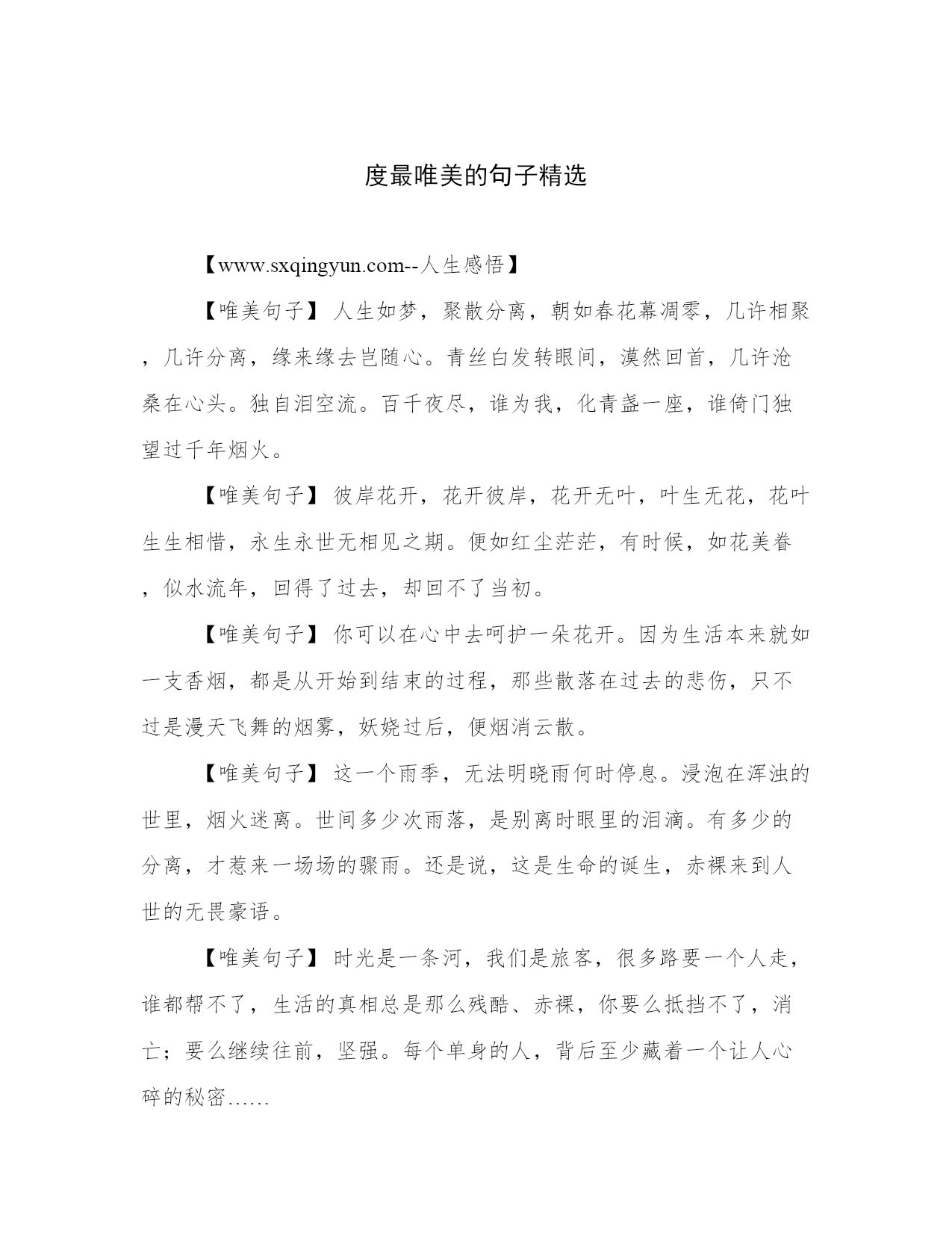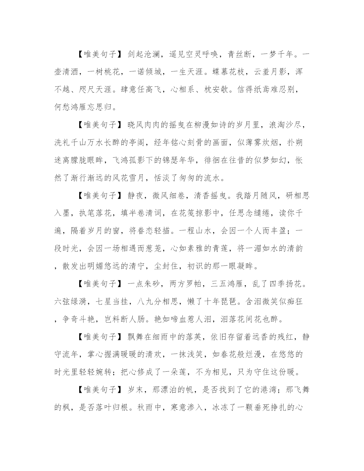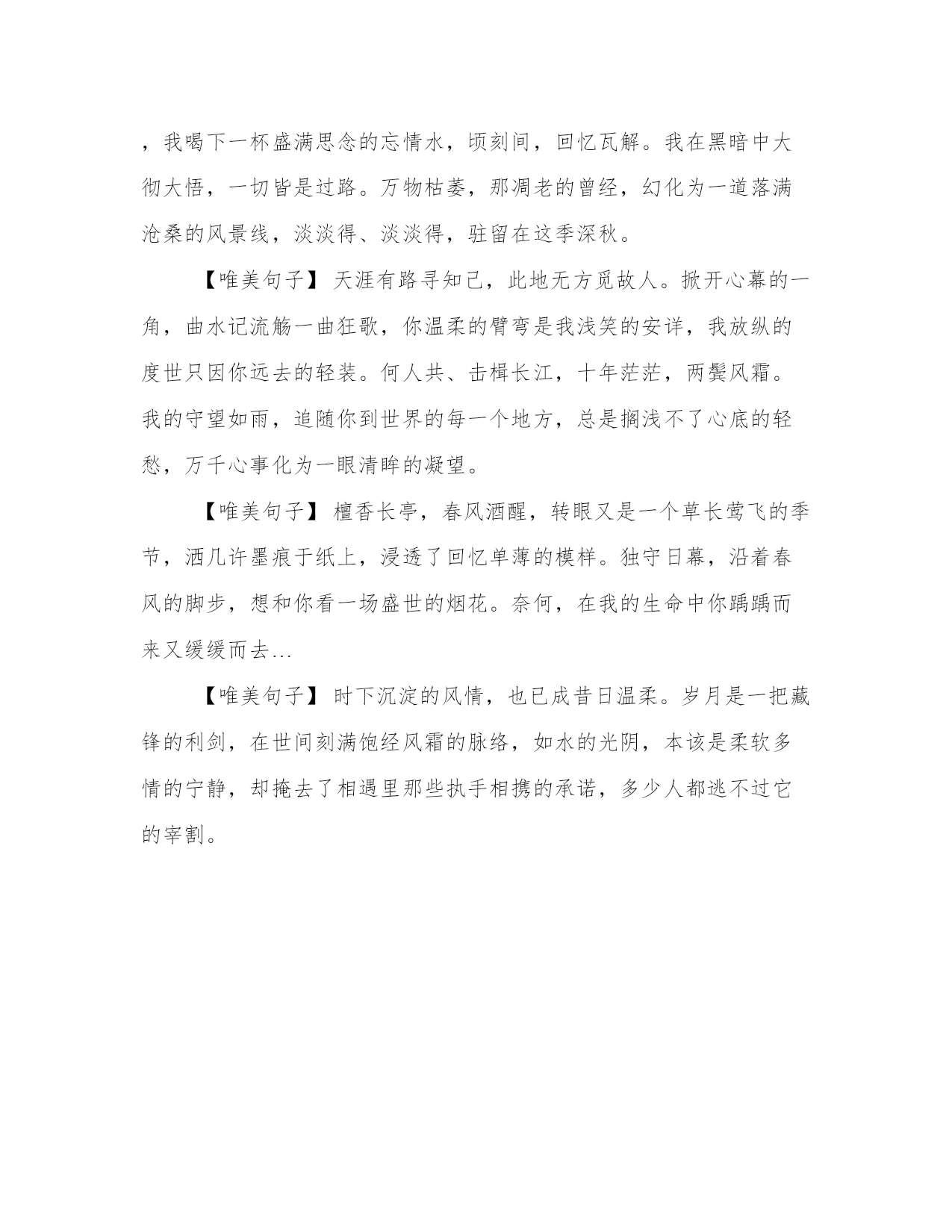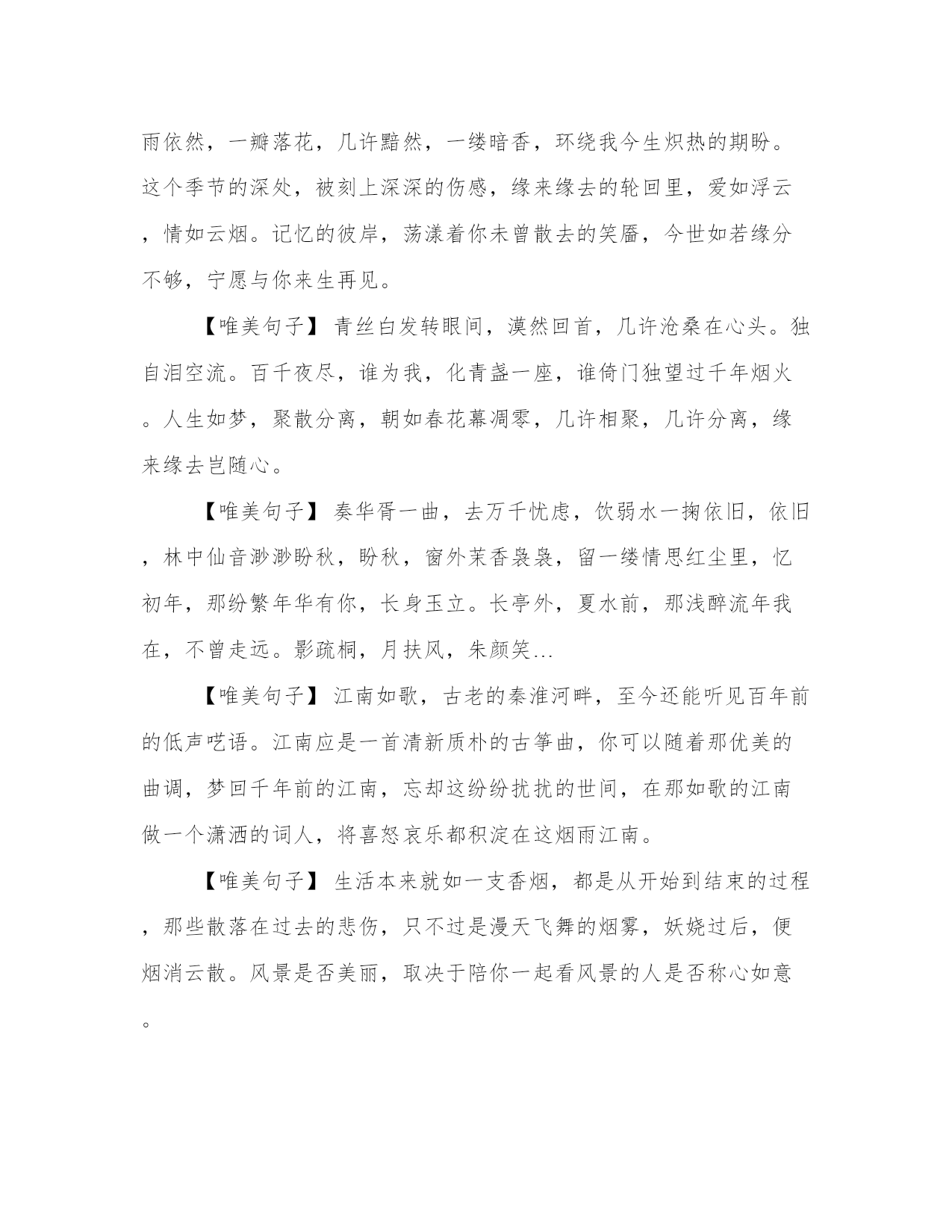 度最唯美的句子精选【www.sxqingyun.com--人生感悟】【唯美句子】人生如梦,聚散分离,朝如春花幕凋零,几许相聚,几许分离,缘来缘去岂随心。青丝白发转眼间,漠然回首,几许沧桑在心头。独自泪空流。百千夜尽,谁为我,化青盏一座,谁倚门独望过千年烟火。【唯美句子】彼岸花开,花开彼岸,花开无叶,叶生无花,花叶生生相惜,永生永世无相见之期。便如红尘茫茫,有时候,如花美眷,似水流年,回得了过去,却回不了当初。【唯美句子】你可以在心中去呵护一朵花开。因为生活本来就如一支香烟,都是从开始到结束的过程,那些散落在过去的悲伤,只不过是漫天飞舞的烟雾,妖娆过后,便烟消云散。【唯美句子】这一个雨季,无法明晓雨何时停息。浸泡在浑浊的世里,烟火迷离。世间多少次雨落,是别离时眼里的泪滴。有多少的分离,才惹来一场场的骤雨。还是说,这是生命的诞生,赤裸来到人世的无畏豪语。【唯美句子】时光是一条河,我们是旅客,很多路要一个人走,谁都帮不了,生活的真相总是那么残酷、赤裸,你要么抵挡不了,消亡;要么继续往前,坚强。每个单身的人,背后至少藏着一个让人心碎的秘密……【唯美句子】故知情,写满离恨,谁饮下无知,不知何处是月明,笔连意,墨哀情,斜阳暮西归,谁在荒凉的余辉下,凄然着昨日的誓言,文笔赋下是谁的凌乱,那寂寞的天空,是不是依然不见一丝云彩的飘过。风铃的哀怨,我的寂寞红尘,闯进了你月下霓裳的思念。【唯美句子】仰天叹,望月迁,繁星闪烁度华年,悠悠白羽断此缘,岁月尽迁惘消融,步步伤情谱新篇,繁华尽,红尘断,生死离别花离散!落花随流意,相思愁悲续,今生凭栏度,梦里叹浮生!【唯美句子】或许青春就是一首谱不完的曲子。曲子跌宕起伏的,时而忧伤、时而开心。然而,曲子仍然没有谱完,它一直在无止境的望着前方,无止境的向前延伸,一直在延续着每一个跃动的音符。【唯美句子】如果你是微风,我愿做风中的细雨,千丝万缕化作绕指缠绵,那是扯不断的情愫,剪不断,理还乱。那日,我站在山之巅,水之湄,只为经年以后,你能够第一眼就掠过我纯净的目光。雨中的世界是那么清新,泛起淡淡的寂寞,只是这寂寞也飘出一股婉约的诗意。【唯美句子】多少次淡墨轻舞时看见的是你清逸的眉眼,剪一段经纶,伴你高山流水,林间鸟语。剪一段时光,把一段情缘,一份念想,在不经意间珍藏。剪一段月光,为你吟诗作画,轻嗅一世墨香。一次温暖的邂逅,成为魂牵梦萦的眷恋,明媚了几许流年。【唯美句子】风摇疏影,繁华落尽,相思成殇,我的眷恋被搁浅在今夜摇曳的烛光里,烛光灿漫,烛影缠绵。窗外风声依旧,窗外细雨依然,一瓣落花,几许黯然,一缕暗香,环绕我今生炽热的期盼。这个季节的深处,被刻上深深的伤感,缘来缘去的轮回里,爱如浮云,情如云烟。记忆的彼岸,荡漾着你未曾散去的笑靥,今世如若缘分不够,宁愿与你来生再见。【唯美句子】青丝白发转眼间,漠然回首,几许沧桑在心头。独自泪空流。百千夜尽,谁为我,化青盏一座,谁倚门独望过千年烟火。人生如梦,聚散分离,朝如春花幕凋零,几许相聚,几许分离,缘来缘去岂随心。【唯美句子】奏华胥一曲,去万千忧虑,饮弱水一掬依旧,依旧,林中仙音渺渺盼秋,盼秋,窗外茉香袅袅,留一缕情思红尘里,忆初年,那纷繁年华有你,长身玉立。长亭外,夏水前,那浅醉流年我在,不曾走远。影疏桐,月扶风,朱颜笑…【唯美句子】江南如歌,古老的秦淮河畔,至今还能听见百年前的低声呓语。江南应是一首清新质朴的古筝曲,你可以随着那优美的曲调,梦回千年前的江南,忘却这纷纷扰扰的世间,在那如歌的江南做一个潇洒的词人,将喜怒哀乐都积淀在这烟雨江南。【唯美句子】生活本来就如一支香烟,都是从开始到结束的过程,那些散落在过去的悲伤,只不过是漫天飞舞的烟雾,妖娆过后,便烟消云散。风景是否美丽,取决于陪你一起看风景的人是否称心如意。【唯美句子】剑起沧澜,遥见空灵呼唤,青丝断,一梦千年。一壶清酒,一树桃花,一诺倾城,一生天涯。蝶慕花枝,云羞月影,浑不越、咫尺天涯。肆意任高飞,心相系、枕安欹。信得纸鸢难忍别,何愁鸿雁忘思归。【唯美句子】晓风肉肉的摇曳在柳漫如诗的岁月里,浪淘沙尽,洗礼千山万水长醉的亭阁,经年铭心刻骨的画面,似薄雾炊烟,扑朔迷离朦胧眼眸,飞鸿孤影下的锦瑟年华,徘徊在往昔的似梦如幻,怅然了渐行渐远的风花雪月,恬淡了匆匆的流水。【唯美句子】静夜,微风细卷,清香摇曳。我踏月随风,研相思入墨,执笔落花,填半卷清词,在花笺掠影中,任思念缱绻,读你千遍,隔着岁月的窗,将眷恋轻描。一程山水,会因一个人而丰盈;一段时光,会因一场相遇而葱茏,心如素雅的青莲,将一湄如水的清韵,散发出明媚悠远的清宁,尘封住,初识的那一眼凝眸。【唯美句子】一点朱砂,两方罗帕,三五鸿雁,乱了四季扬花。六弦绿漪,七星当挂,八九分相思,懒了十年琵琶。含泪微笑似痴狂,争奇斗艳,岂料断人肠。艳如啼血惹人泪,泪落花间花也醉。【