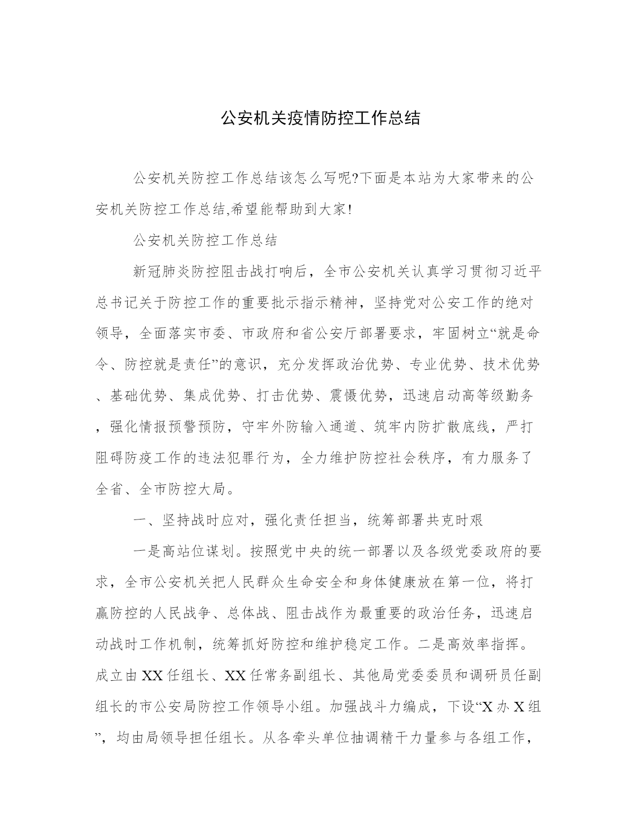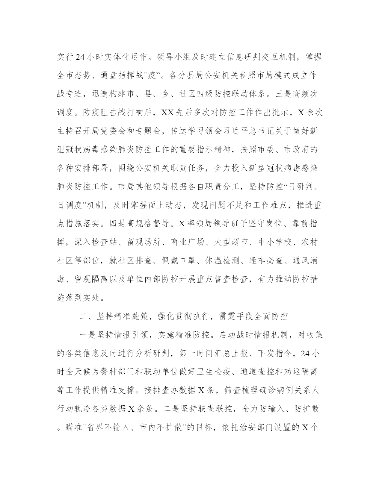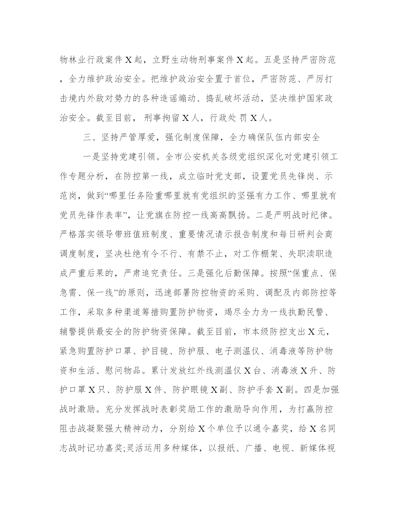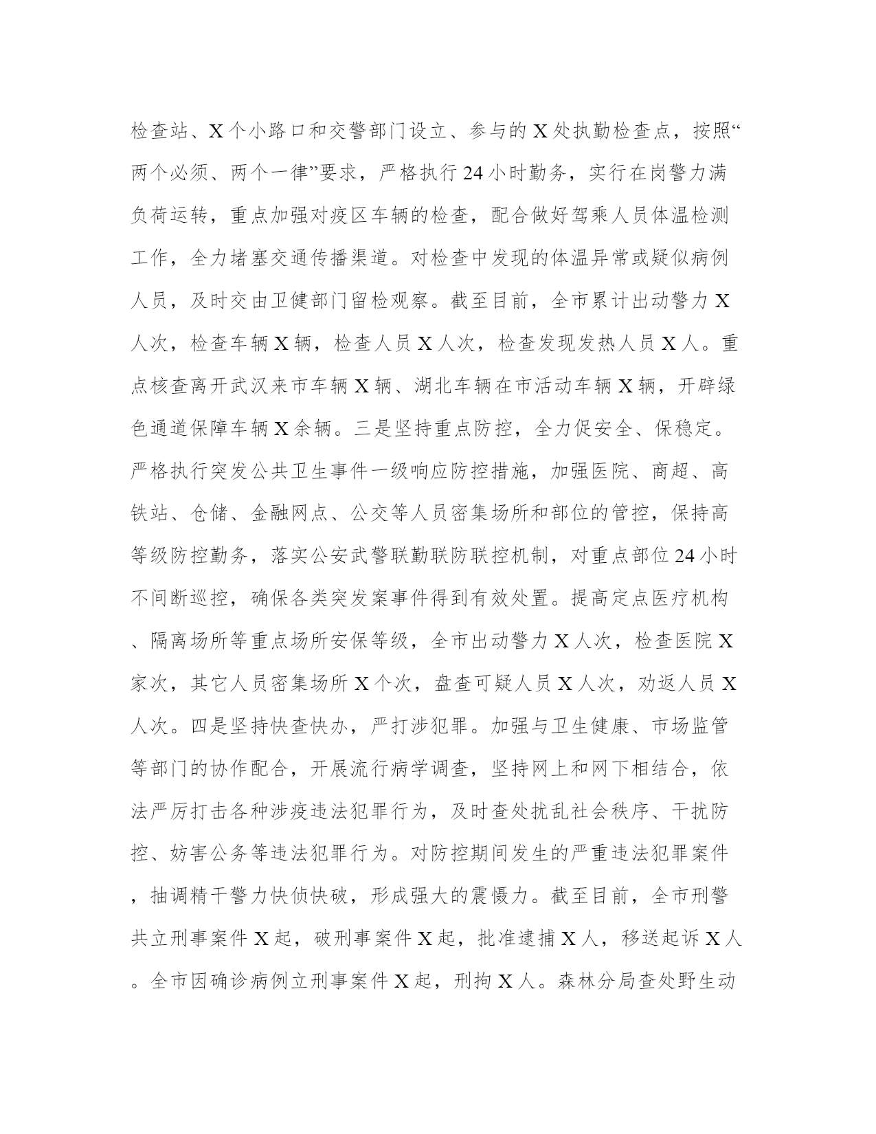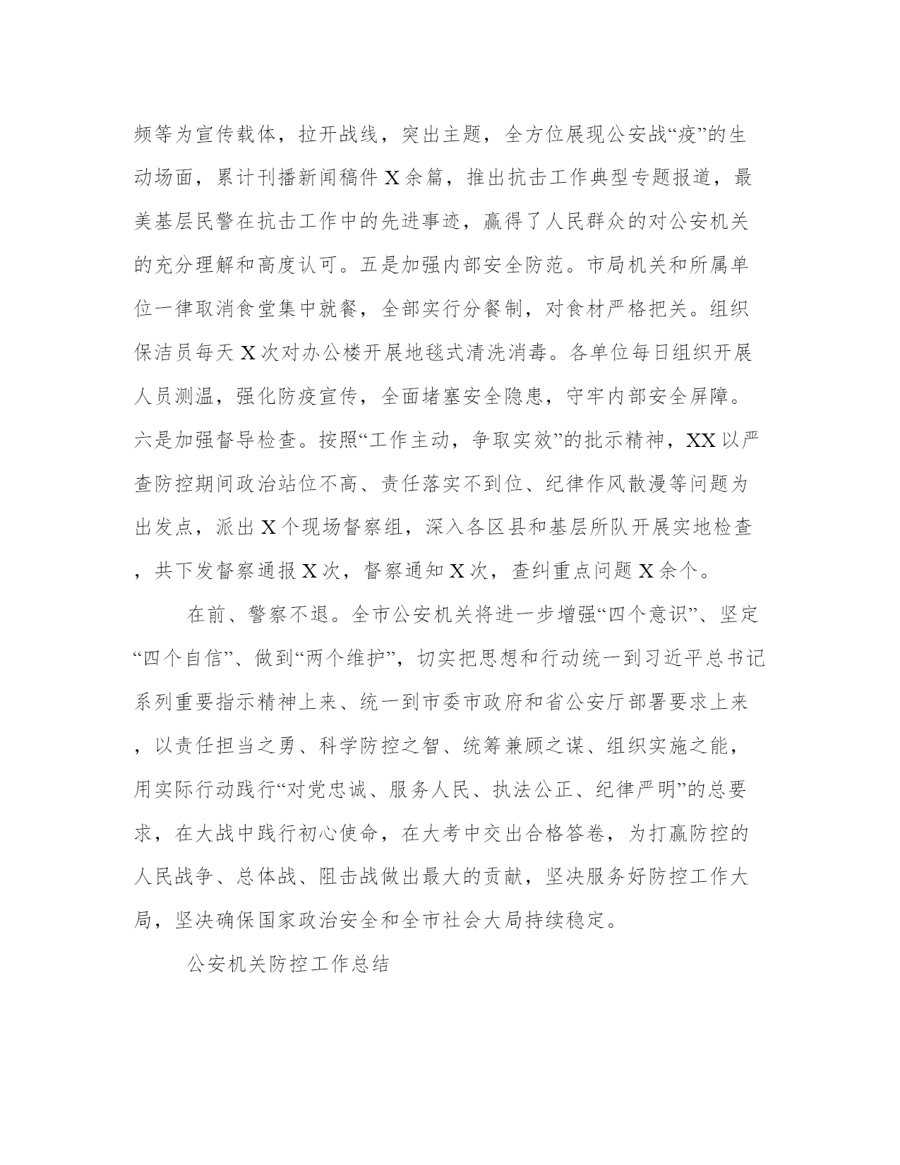 公安机关疫情防控工作总结公安机关防控工作总结该怎么写呢?下面是本站为大家带来的公安机关防控工作总结,希望能帮助到大家!公安机关防控工作总结新冠肺炎防控阻击战打响后,全市公安机关认真学习贯彻习近平总书记关于防控工作的重要批示指示精神,坚持党对公安工作的绝对领导,全面落实市委、市政府和省公安厅部署要求,牢固树立“就是命令、防控就是责任”的意识,充分发挥政治优势、专业优势、技术优势、基础优势、集成优势、打击优势、震慑优势,迅速启动高等级勤务,强化情报预警预防,守牢外防输入通道、筑牢内防扩散底线,严打阻碍防疫工作的违法犯罪行为,全力维护防控社会秩序,有力服务了全省、全市防控大局。一、坚持战时应对,强化责任担当,统筹部署共克时艰一是高站位谋划。按照党中央的统一部署以及各级党委政府的要求,全市公安机关把人民群众生命安全和身体健康放在第一位,将打赢防控的人民战争、总体战、阻击战作为最重要的政治任务,迅速启动战时工作机制,统筹抓好防控和维护稳定工作。二是高效率指挥。成立由XX任组长、XX任常务副组长、其他局党委委员和调研员任副组长的市公安局防控工作领导小组。加强战斗力编成,下设“X办X组”,均由局领导担任组长。从各牵头单位抽调精干力量参与各组工作,实行24小时实体化运作。领导小组及时建立信息研判交互机制,掌握全市态势、通盘指挥战“疫”。各分县局公安机关参照市局模式成立作战专班,迅速构建市、县、乡、社区四级防控联动体系。三是高频次调度。防疫阻击战打响后,XX先后多次对防控工作作出批示,X余次主持召开局党委会和专题会,传达学习领会习近平总书记关于做好新型冠状病毒感染肺炎防控工作的重要指示精神,按照市委、市政府的各种安排部署,围绕公安机关职责任务,全力投入新型冠状病毒感染肺炎防控工作。市局其他领导根据各自职责分工,坚持防控“日研判、日调度”机制,及时掌握面上动态,发现问题不足和工作难点,推进重点措施落实。四是高规格督导。X率领局领导班子坚守岗位、靠前指挥,深入检查站、留观场所、商业广场、大型超市、中小学校、农村社区等部位,就社区排查、佩戴口罩、体温检测、逢车必查、通风消毒、留观隔离以及单位内部防控开展重点督查检查,有力推动防控措施落到实处。二、坚持精准施策,强化贯彻执行,雷霆手段全面防控一是坚持情报引领,实施精准防控。启动战时情报机制,对收集的各类信息及时进行分析研判,第一时间汇总上报、下发指令,24小时全天候为警种部门和联动单位做好卫生检疫、通道查控和劝返隔离等工作提供精准支撑。接排查办数据X条,筛查梳理确诊病例关系人行动轨迹各类数据X余条。二是坚持联查联控,全力防输入、防扩散。瞄准“省界不输入、市内不扩散”的目标,依托治安部门设置的X个检查站、X个小路口和交警部门设立、参与的X处执勤检查点,按照“两个必须、两个一律”要求,严格执行24小时勤务,实行在岗警力满负荷运转,重点加强对疫区车辆的检查,配合做好驾乘人员体温检测工作,全力堵塞交通传播渠道。对检查中发现的体温异常或疑似病例人员,及时交由卫健部门留检观察。截至目前,全市累计出动警力X人次,检查车辆X辆,检查人员X人次,检查发现发热人员X人。重点核查离开武汉来市车辆X辆、湖北车辆在市活动车辆X辆,开辟绿色通道保障车辆X余辆。三是坚持重点防控,全力促安全、保稳定。严格执行突发公共卫生事件一级响应防控措施,加强医院、商超、高铁站、仓储、金融网点、公交等人员密集场所和部位的管控,保持高等级防控勤务,落实公安武警联勤联防联控机制,对重点部位24小时不间断巡控,确保各类突发案事件得到有效处置。提高定点医疗机构、隔离场所等重点场所安保等级,全市出动警力X人次,检查医院X家次,其它人员密集场所X个次,盘查可疑人员X人次,劝返人员X人次。四是坚持快查快办,严打涉犯罪。加强与卫生健康、市场监管等部门的协作配合,开展流行病学调查,坚持网上和网下相结合,依法严厉打击各种涉疫违法犯罪行为,及时查处扰乱社会秩序、干扰防控、妨害公务等违法犯罪行为。对防控期间发生的严重违法犯罪案件,抽调精干警力快侦快破,形成强大的震慑力。截至目前,全市刑警共立刑事案件X起,破刑事案件X起,批准逮捕X人,移送起诉X人。全市因确诊病例立刑事案件X起,刑拘X人。森林分局查处野生动物林业行政案件X起,立野生动物刑事案件X起。五是坚持严密防范,全力维护政治安全。把维护政治安全置于首位,严密防范、严厉打击境内外敌对势力的各种造谣煽动、捣乱破坏活动,坚决维护国家政治安全。截至目前,刑事拘留X人,行政处罚X人。三、坚持严管厚爱,强化制度保障,全力确保队伍内部安全一是坚持党建引领。全市公安机关各级党组织深化对党建引领工作专题分析,在防控第一线,成立临时党支部,设置党员先锋岗、示范岗,做到“哪里任务险重哪里就有党组织的坚强有力工作、哪里就有党员先锋作表率”,让