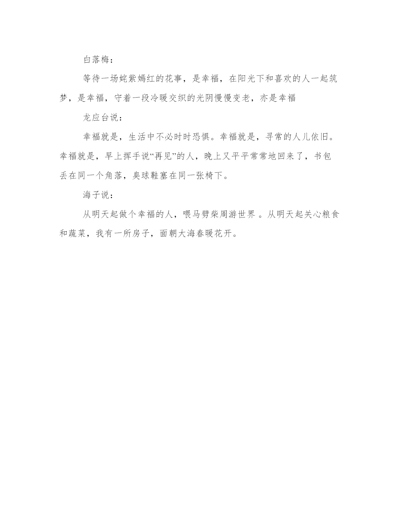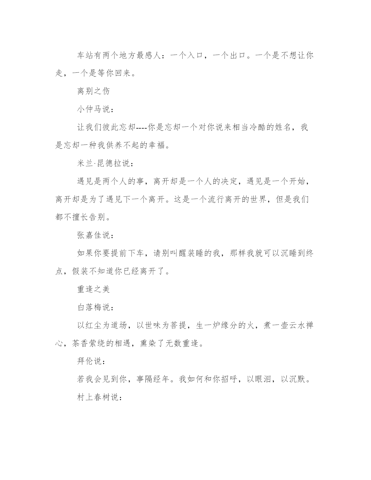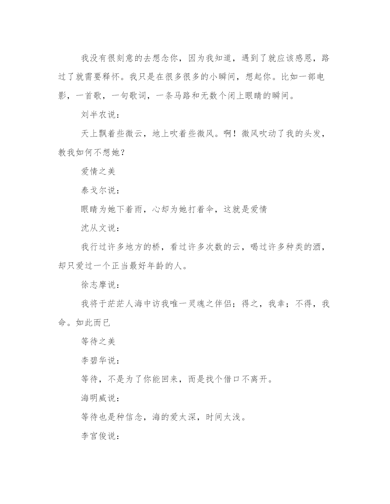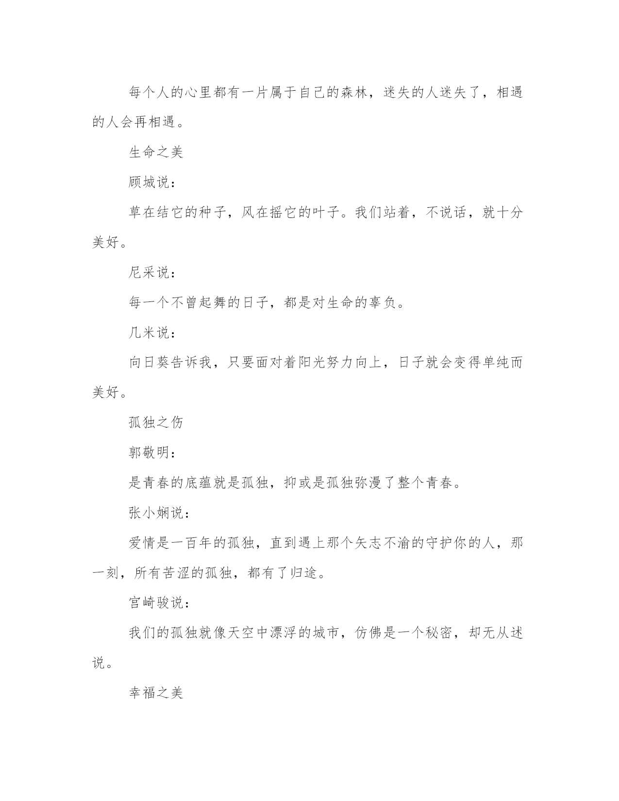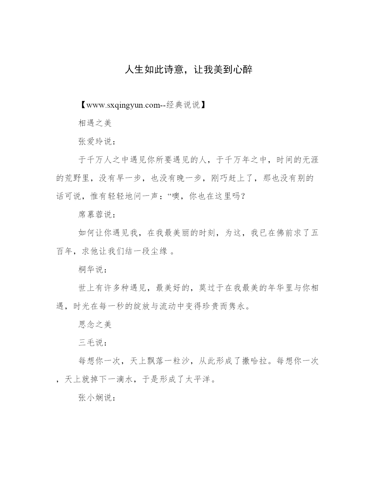人生如此诗意,让我美到心醉【www.sxqingyun.com--经典说说】相遇之美张爱玲说:于千万人之中遇见你所要遇见的人,于千万年之中,时间的无涯的荒野里,没有早一步,也没有晚一步,刚巧赶上了,那也没有别的话可说,惟有轻轻地问一声:“噢,你也在这里吗?席慕蓉说:如何让你遇见我,在我最美丽的时刻,为这,我已在佛前求了五百年,求他让我们结一段尘缘。桐华说:世上有许多种遇见,最美好的,莫过于在我最美的年华里与你相遇,时光在每一秒的绽放与流动中变得珍贵而隽永。思念之美三毛说:每想你一次,天上飘落一粒沙,从此形成了撒哈拉。每想你一次,天上就掉下一滴水,于是形成了太平洋。张小娴说:我没有很刻意的去想念你,因为我知道,遇到了就应该感恩,路过了就需要释怀。我只是在很多很多的小瞬间,想起你。比如一部电影,一首歌,一句歌词,一条马路和无数个闭上眼睛的瞬间。刘半农说:天上飘着些微云,地上吹着些微风。啊!微风吹动了我的头发,教我如何不想她?爱情之美泰戈尔说:眼睛为她下着雨,心却为她打着伞,这就是爱情沈从文说:我行过许多地方的桥,看过许多次数的云,喝过许多种类的酒,却只爱过一个正当最好年龄的人。徐志摩说:我将于茫茫人海中访我唯一灵魂之伴侣;得之,我幸;不得,我命。如此而已等待之美李碧华说:等待,不是为了你能回来,而是找个借口不离开。海明威说:等待也是种信念,海的爱太深,时间太浅。李宫俊说:车站有两个地方最感人:一个入口,一个出口。一个是不想让你走,一个是等你回来。离别之伤小仲马说:让我们彼此忘却----你是忘却一个对你说来相当冷酷的姓名,我是忘却一种我供养不起的幸福。米兰·昆德拉说:遇见是两个人的事,离开却是一个人的决定,遇见是一个开始,离开却是为了遇见下一个离开。这是一个流行离开的世界,但是我们都不擅长告别。张嘉佳说:如果你要提前下车,请别叫醒装睡的我,那样我就可以沉睡到终点,假装不知道你已经离开了。重逢之美白落梅说:以红尘为道场,以世味为菩提,生一炉缘分的火,煮一壶云水禅心,茶香萦绕的相遇,熏染了无数重逢。拜伦说:若我会见到你,事隔经年。我如何和你招呼,以眼泪,以沉默。村上春树说:每个人的心里都有一片属于自己的森林,迷失的人迷失了,相遇的人会再相遇。生命之美顾城说:草在结它的种子,风在摇它的叶子。我们站着,不说话,就十分美好。尼采说:每一个不曾起舞的日子,都是对生命的辜负。几米说:向日葵告诉我,只要面对着阳光努力向上,日子就会变得单纯而美好。孤独之伤郭敬明:是青春的底蕴就是孤独,抑或是孤独弥漫了整个青春。张小娴说:爱情是一百年的孤独,直到遇上那个矢志不渝的守护你的人,那一刻,所有苦涩的孤独,都有了归途。宫崎骏说:我们的孤独就像天空中漂浮的城市,仿佛是一个秘密,却无从述说。幸福之美白落梅:等待一场姹紫嫣红的花事,是幸福,在阳光下和喜欢的人一起筑梦,是幸福,守着一段冷暖交织的光阴慢慢变老,亦是幸福龙应台说:幸福就是,生活中不必时时恐惧。幸福就是,寻常的人儿依旧。幸福就是,早上挥手说“再见”的人,晚上又平平常常地回来了,书包丢在同一个角落,臭球鞋塞在同一张椅下。海子说:从明天起做个幸福的人,喂马劈柴周游世界。从明天起关心粮食和蔬菜,我有一所房子,面朝大海春暖花开。