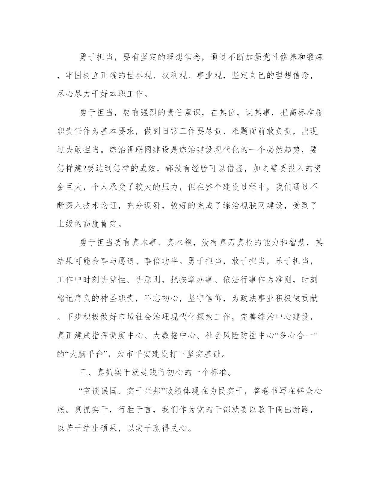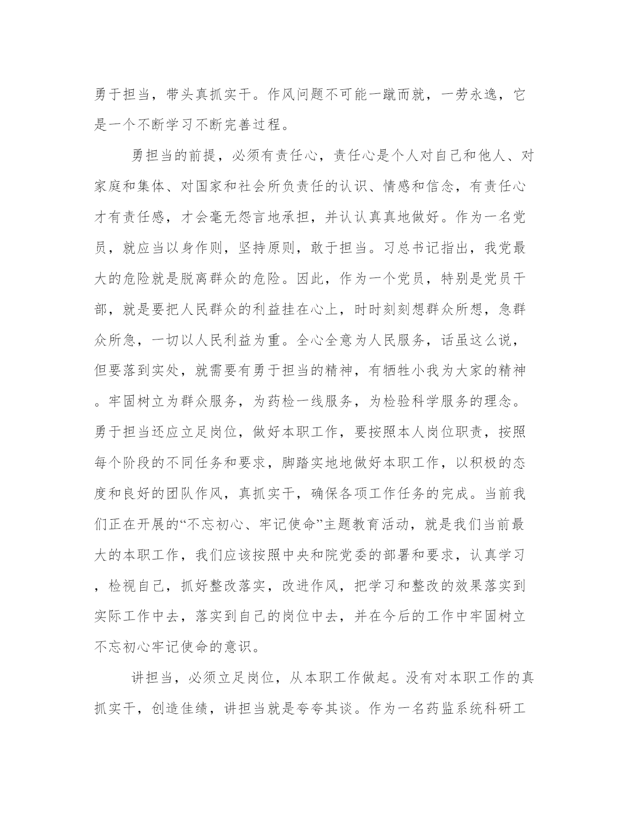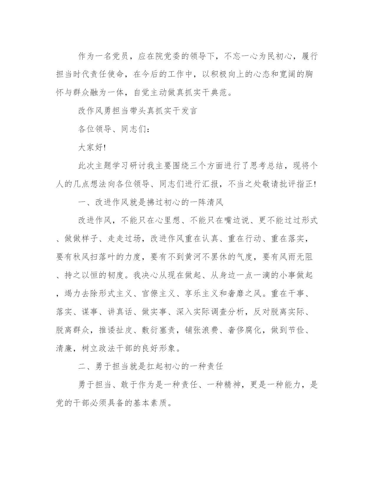 改作风勇担当带头真抓实干发言作风问题是党同人民群众的关系问题。我党来自人民、根植人民、服务人民,一旦脱离群众,就会失去生命力。本站为大家整理的相关的改作风勇担当带头真抓实干发言,供大家参考选择。改作风勇担当带头真抓实干发言近期,全党上下正在开展轰轰烈烈的“不忘初心、牢记使命”主题教育之际,我院全体职工在院党委的带领下,也积极投入其中,我院深入开展“改作风、勇担当,带头真抓实干”第三专题学习,开创单位事业新局面。习近平总书记强调“牢记初心使命,推进自我革命”,不忘初心、牢记使命,初心,是我们不断前进的根本动力,是我们奋斗历程的不变主题,是我们应对挑战的思想武器。作为一名共产党员,我们要按照党中央对本次主题教育提出的“守初心、担使命,找差距、抓落实”的总要求,以正视问题刮骨疗伤的勇气,结合自己思想作风与业务水平存在的问题,深学彻悟,抓紧整改,提高思想认识、政治站位水平。作风问题是党同人民群众的关系问题。我党来自人民、根植人民、服务人民,一旦脱离群众,就会失去生命力。加强作风建设,必须紧紧围绕保持党同人民群众的血肉联系,增强群众观念和群众感情,不断筑牢我党执政的群众基础。必须坚决反对形式主义、官僚主义、享乐主义和奢靡之风。坚持实事求是的思想路线,树立正确政绩观,勇于担当,带头真抓实干。作风问题不可能一蹴而就,一劳永逸,它是一个不断学习不断完善过程。勇担当的前提,必须有责任心,责任心是个人对自己和他人、对家庭和集体、对国家和社会所负责任的认识、情感和信念,有责任心才有责任感,才会毫无怨言地承担,并认认真真地做好。作为一名党员,就应当以身作则,坚持原则,敢于担当。习总书记指出,我党最大的危险就是脱离群众的危险。因此,作为一个党员,特别是党员干部,就是要把人民群众的利益挂在心上,时时刻刻想群众所想,急群众所急,一切以人民利益为重。全心全意为人民服务,话虽这么说,但要落到实处,就需要有勇于担当的精神,有牺牲小我为大家的精神。牢固树立为群众服务,为药检一线服务,为检验科学服务的理念。勇于担当还应立足岗位,做好本职工作,要按照本人岗位职责,按照每个阶段的不同任务和要求,脚踏实地地做好本职工作,以积极的态度和良好的团队作风,真抓实干,确保各项工作任务的完成。当前我们正在开展的“不忘初心、牢记使命”主题教育活动,就是我们当前最大的本职工作,我们应该按照中央和院党委的部署和要求,认真学习,检视自己,抓好整改落实,改进作风,把学习和整改的效果落实到实际工作中去,落实到自己的岗位中去,并在今后的工作中牢固树立不忘初心牢记使命的意识。讲担当,必须立足岗位,从本职工作做起。没有对本职工作的真抓实干,创造佳绩,讲担当就是夸夸其谈。作为一名药监系统科研工作为一名党员,应在院党委的领导下,不忘一心为民初心,履行担当时代责任使命,在今后的工作中,以积极向上的心态和宽阔的胸怀与群众融为一体,自觉主动做真抓实干典范。改作风勇担当带头真抓实干发言各位领导、同志们:大家好!此次主题学习研讨我主要围绕三个方面进行了思考总结,现将个人的几点想法向各位领导、同志们进行汇报,不当之处敬请批评指正!一、改进作风就是拂过初心的一阵清风改进作风,不能只在心里想、不能只在嘴边说、更不能过过形式、做做样子、走走过场,改进作风重在认真、重在行动、重在落实,要有秋风扫落叶的力度,要有不到黄河不罢休的气度,要有风雨无阻、持之以恒的韧度。我决心从现在做起、从身边一点一滴的小事做起,竭力去除形式主义、官僚主义、享乐主义和奢靡之风。重在干事、落实、谋事、讲真话、做实事、深入实际调查分析,反对脱离实际、脱离群众,推诿扯皮、敷衍塞责,铺张浪费、奢侈腐化,做到节俭、清廉,树立政法干部的良好形象。二、勇于担当就是扛起初心的一种责任勇于担当、敢于作为是一种责任、一种精神,更是一种能力,是党的干部必须具备的基本素质。勇于担当,要有坚定的理想信念,通过不断加强党性修养和锻炼,牢固树立正确的世界观、权利观、事业观,坚定自己的理想信念,尽心尽力干好本职工作。勇于担当,要有强烈的责任意识,在其位,谋其事,把高标准履职责任作为基本要求,做到日常工作要尽责、难题面前敢负责,出现过失敢担当。综治视联网建设是综治建设现代化的一个必然趋势,要怎样建?要达到怎样的成效,都没有经验可以借鉴,加之需要投入的资金巨大,个人承受了较大的压力,但在整个建设过程中,我们通过不断深入技术论证,充分调研,较好的完成了综治视联网建设,受到了上级的高度肯定。勇于担当要有真本事、真本领,没有真刀真枪的能力和智慧,其结果可能会事与愿违、事倍功半。勇于担当,敢于担当,乐于担当,工作中时刻讲党性、讲原则,把按章办事、依法行事作为准则,时刻铭记肩负的神圣职责,不忘初心,坚守信仰,为政法事业积极做贡献。下步积极做好市域社会治理现代化探索工作,完善综治中心建设,真正建