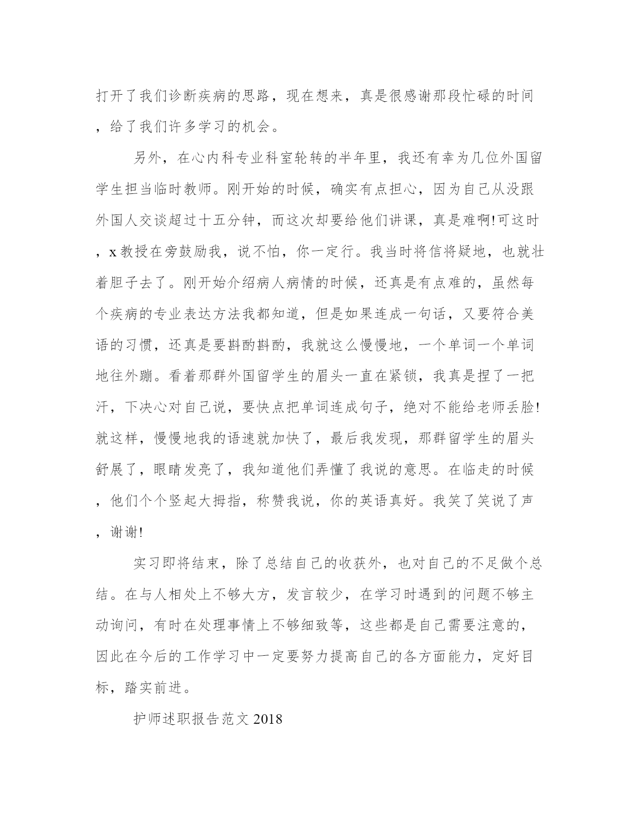 护师述职报告范文护士时刻以救死扶伤,全心全意为人民服务为天职,不负国家的人民的期望。以下是我能网小编为大家带来的关于护师述职报告2018,以供大家参考!时间稍纵即逝,转眼已是x月,我们护理实习快接近尾声了。回顾这一路走来,心里满满地装着丰收的喜悦,每天都在进步中,日子过得忙碌,倒也安静踏实。想起刚进临床时候的自己,带着对实习生活美好憧憬和期待来到xx省xx医院,心中怀揣着满满的激情;不觉当中九个月的学习时光悄然过去了,收获颇丰,下面我对自己的实习生活做一个总结。第一,思想品德及医德医风方面。在这近一年的临床实习中,我深刻地感受到:护理,不仅是一个专业性很强的学科,而且是一个综合性很强的学科,作为一名护士,除了专业知识和技能过硬之外,个人的品德和作风都要体现着大家风范。古时的文人都以“悬壶济世”、“妙手仁心”等成语来形容医生,近代也已“白衣天使”来形容护士,可见护士和医生同等的重要。在心血管内科实习中,我亲眼看到黎教授不顾辛劳,为一个个诊断不明的病人跑上跑下地请会诊;考虑到病人的经济情况,他在不影响治疗效果的条件下往往选用的降压药或降血脂药。在呼吸内科的实习中,我曾亲眼看到丁续红教授把两百块钱塞进一位丢了治疗费的穷苦支气管扩张的病人手里。这一幕幕的场景深深地烙在了我的心里,让我相信,一位医生绝不是只看病人的钱救命的黑心人,而是有血有肉、无私奉献的白衣天使。在他们身上,我看到了热情、看到了责任心、看到了真诚的一群在生命线上努力挽救生命的兢兢业业的老实人,人类的伟大莫过于此。第二,医疗工作方面。在这短暂而又漫长的九个月中,我按照学校教学办公室所规定的要求,总共轮转了13个医院科室,其中包括内科、外科、儿科、妇科。这近一年的实习是一个医学生走向医务工作最重要的过渡。实习生的工作无非就是和正式工作一样的参与,治疗班给病人作治疗,配药打针及各项专科护理操作,主班就帮病人拿药,送病历,请会诊,副主班就是坐在电脑面前为病人记账,打印输液卡,贴瓶签,护记班就写护理查房,补护理记录等等,内容看似简单枯燥,但是过程却烦琐冗长,等忙完了这一切,这一天的光景就结束了。时间寸土寸金,只有晚上的时间才是自己的。面对一天的工作,总结是很重要的,头脑中必须强迫自己回忆一天发生的事情:某某床病人今天添加了什么药,又撤除了什么药,增加了什么药的剂量,又减少了什么药的剂量,可为什么教授要更改这些药品的使用呢?该药品的使用指证又是什么呢?有时候,教授会故意不告诉我,锻炼一下我的思考能力,我就从它的临床症状和体征入手,一个个的对着来,可是往往出差错,第二天跑去告诉教授,常常受打击,但也就是这样的打击,我才把这一个个的知识点牢固地刻在了心里,即使在以后找工作的三个月中,我也没忘记,回到临床上来,跟三个月前的一样。在既往的实习岁月中,我不断的感受到内科与外科的强烈不同,其中一个重要的不同点就是:内科强调诊断的思维,而外科强调手术治疗的过程。针对病人身上的某个症状或体征,内科往往考虑多种疾病。拿急性腹痛做一个例子,内科医生往往考虑的不仅是简单而常见的胃肠溃疡穿孔,还有急性胰腺炎、急性阑尾炎、急性心肌梗死、胆道疾病、肠梗阻、宫外孕等等,这些疾病的确诊需要我们医生做详细的病史采集和体格检查,除此之外,还必须辅以实验室和影像学方面的检查,逐步排除相应的疾病,最后得出明确的诊断。我的临床教授曾这样对我说过,内科医生有时就像是一名侦探,想尽一切办法和手段去寻找病人身上的蛛丝马迹,最后抓出“作案真凶”。这无疑揭露了一位内科医生的工作实质。所以说,内科不光是要学会处理多少个疾病,更重要的是对一种疾病的一个严谨的诊断思维,不断的总结,每天都在进步,就像蝉蛹一样,一层一层地蜕变,最后一定会变成一只美丽的蝴蝶。医学路漫漫,吾将上下而求索,而待宝剑锋从磨砺出,梅花方可香自苦寒来。第三,临床教学方面。在这一年的实习过程中,我和小组的其他实习成员总共经历了三次教学查房,虽然花了我们许多精力和时间来准备,但是我们却收获了许多课本上看不到的临床知识,加深了我们对疾病的理解和认识,打开了我们诊断疾病的思路,现在想来,真是很感谢那段忙碌的时间,给了我们许多学习的机会。另外,在心内科专业科室轮转的半年里,我还有幸为几位外国留学生担当临时教师。刚开始的时候,确实有点担心,因为自己从没跟外国人交谈超过十五分钟,而这次却要给他们讲课,真是难啊!可这时,x教授在旁鼓励我,说不怕,你一定行。我当时将信将疑地,也就壮着胆子去了。刚开始介绍病人病情的时候,还真是有点难的,虽然每个疾病的专业表达方法我都知道,但是如果连成一句话,又要符合美语的习惯,还真是要斟酌斟酌,我就这么慢慢地,一个单词一个单词地往外蹦。看着那群外国留学生的眉头一直在紧锁,我真是捏了一把汗,下决心对自己说,要快点把单词连成句子,绝对不能给老师丢脸!就这样,慢