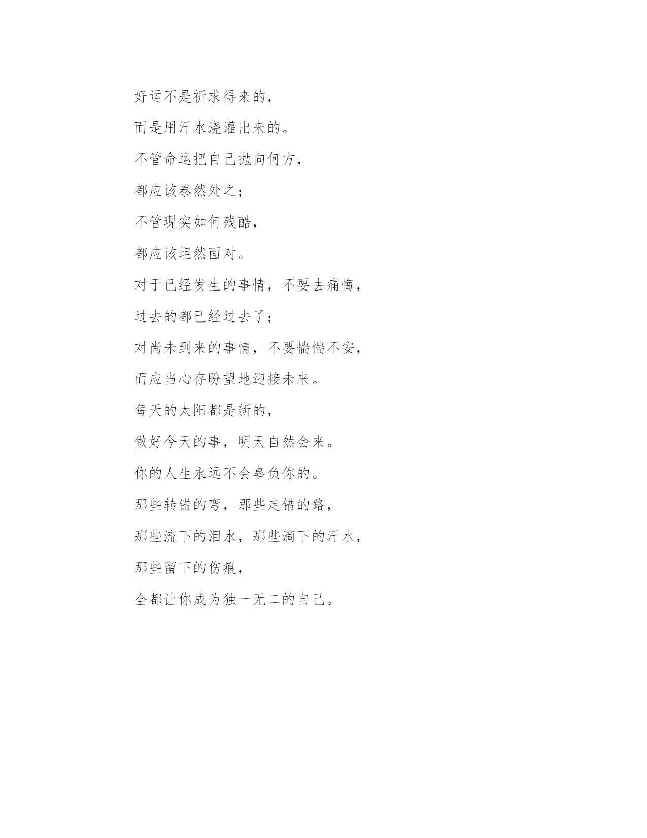 你流下的汗水,永远不会辜负你【www.sxqingyun.com--经典说说】人生之初,就是伴着泪水,汗水,血水呱呱落地,不管环境多么优越,人生之路也不会一帆风顺,一生会遇到太多困难,只有坚定地为达到目标努力奋斗,遇挫不被吓倒,屡战屡败,用汗水冲洗掉脸上的泪水和伤口的血水,才会换来成功后的酒水。不为掌声的诠释,不为刻意的征服,只有辛勤的汗水化作追求的脚步,心中坚定的信念,脚下沉稳的步伐,你用行动诉说着一个不变的真理,没有比脚更长的路,没有比人更高的山,希望在终点向你招手,努力吧用你坚韧不拔的毅志,去迎接终点的鲜花与掌声,相信成功属于你。好运不是祈求得来的,而是用汗水浇灌出来的。不管命运把自己抛向何方,都应该泰然处之;不管现实如何残酷,都应该坦然面对。对于已经发生的事情,不要去痛悔,过去的都已经过去了;对尚未到来的事情,不要惴惴不安,而应当心存盼望地迎接未来。每天的太阳都是新的,做好今天的事,明天自然会来。你的人生永远不会辜负你的。那些转错的弯,那些走错的路,那些流下的泪水,那些滴下的汗水,那些留下的伤痕,全都让你成为独一无二的自己。
