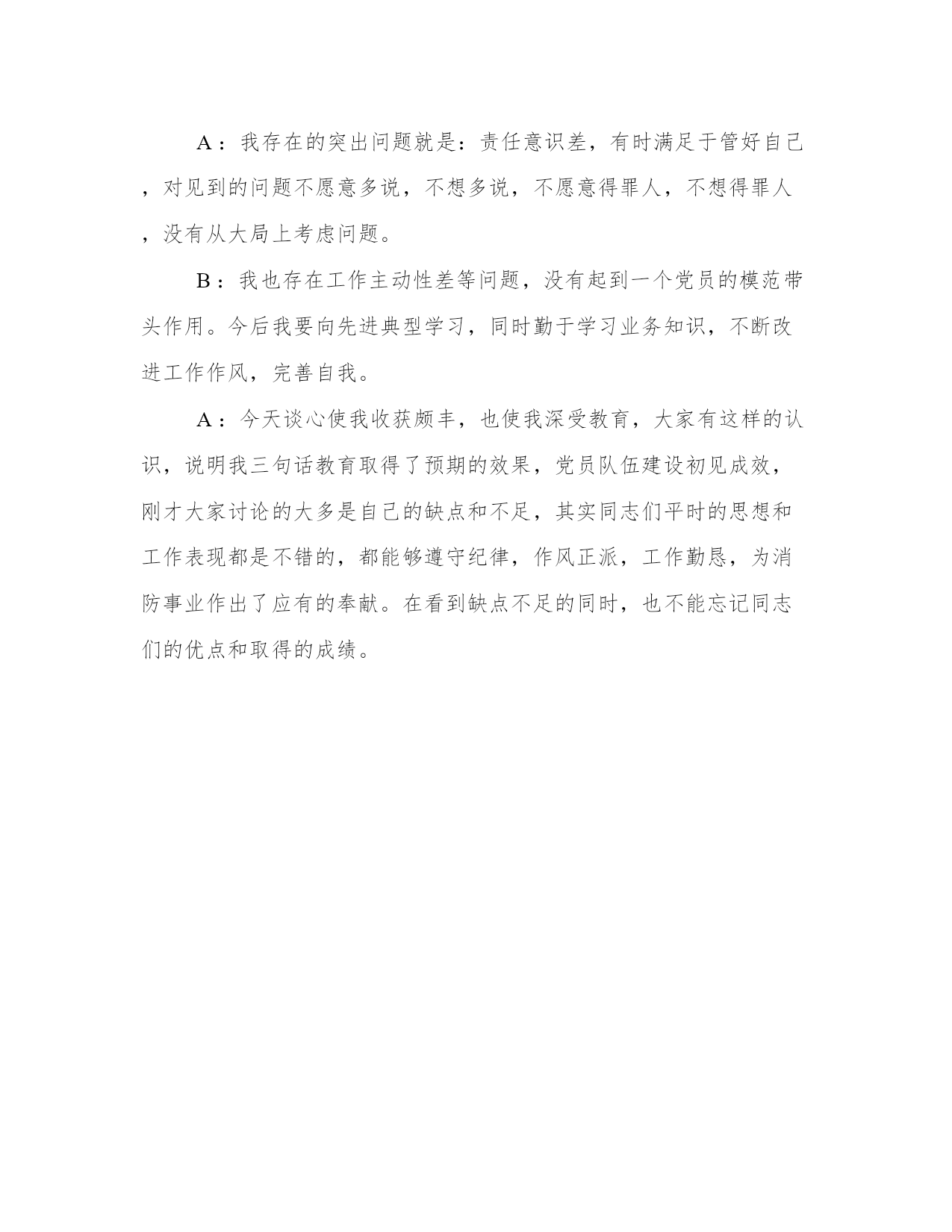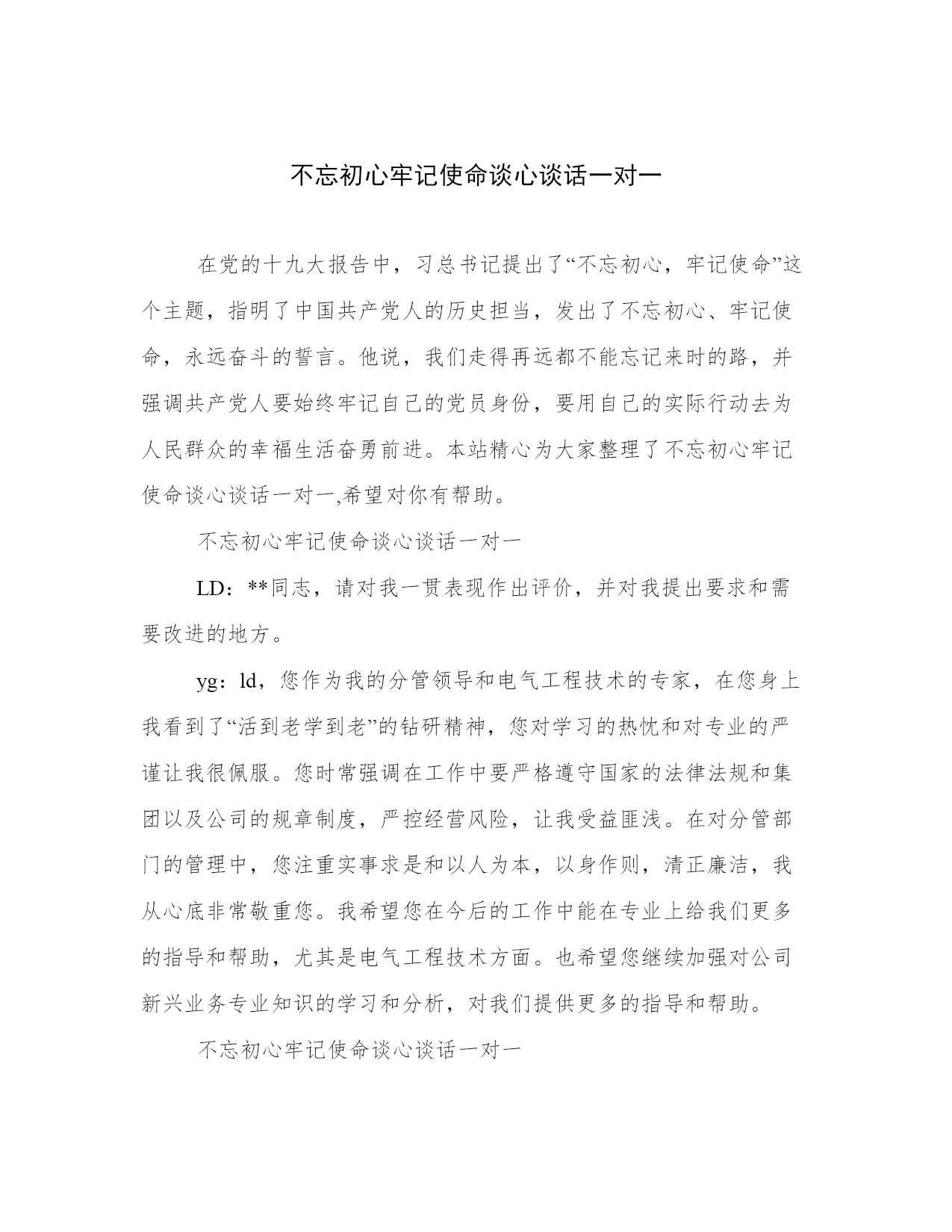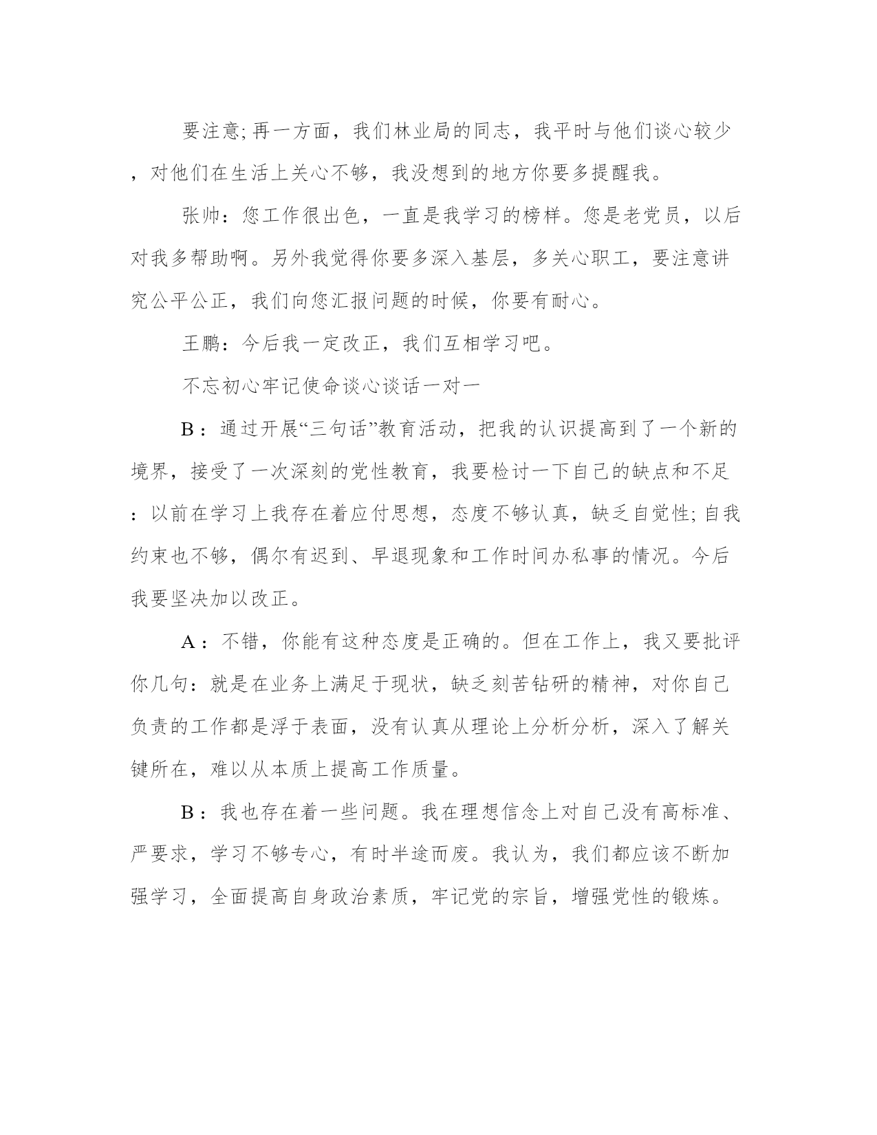 不忘初心牢记使命谈心谈话一对一在党的十九大报告中,习总书记提出了“不忘初心,牢记使命”这个主题,指明了中国共产党人的历史担当,发出了不忘初心、牢记使命,永远奋斗的誓言。他说,我们走得再远都不能忘记来时的路,并强调共产党人要始终牢记自己的党员身份,要用自己的实际行动去为人民群众的幸福生活奋勇前进。本站精心为大家整理了不忘初心牢记使命谈心谈话一对一,希望对你有帮助。不忘初心牢记使命谈心谈话一对一LD:**同志,请对我一贯表现作出评价,并对我提出要求和需要改进的地方。yg:ld,您作为我的分管领导和电气工程技术的专家,在您身上我看到了“活到老学到老”的钻研精神,您对学习的热忱和对专业的严谨让我很佩服。您时常强调在工作中要严格遵守国家的法律法规和集团以及公司的规章制度,严控经营风险,让我受益匪浅。在对分管部门的管理中,您注重实事求是和以人为本,以身作则,清正廉洁,我从心底非常敬重您。我希望您在今后的工作中能在专业上给我们更多的指导和帮助,尤其是电气工程技术方面。也希望您继续加强对公司新兴业务专业知识的学习和分析,对我们提供更多的指导和帮助。不忘初心牢记使命谈心谈话一对一要注意;再一方面,我们林业局的同志,我平时与他们谈心较少,对他们在生活上关心不够,我没想到的地方你要多提醒我。张帅:您工作很出色,一直是我学习的榜样。您是老党员,以后对我多帮助啊。另外我觉得你要多深入基层,多关心职工,要注意讲究公平公正,我们向您汇报问题的时候,你要有耐心。王鹏:今后我一定改正,我们互相学习吧。不忘初心牢记使命谈心谈话一对一B:通过开展“三句话”教育活动,把我的认识提高到了一个新的境界,接受了一次深刻的党性教育,我要检讨一下自己的缺点和不足:以前在学习上我存在着应付思想,态度不够认真,缺乏自觉性;自我约束也不够,偶尔有迟到、早退现象和工作时间办私事的情况。今后我要坚决加以改正。A:不错,你能有这种态度是正确的。但在工作上,我又要批评你几句:就是在业务上满足于现状,缺乏刻苦钻研的精神,对你自己负责的工作都是浮于表面,没有认真从理论上分析分析,深入了解关键所在,难以从本质上提高工作质量。B:我也存在着一些问题。我在理想信念上对自己没有高标准、严要求,学习不够专心,有时半途而废。我认为,我们都应该不断加强学习,全面提高自身政治素质,牢记党的宗旨,增强党性的锻炼。A:我存在的突出问题就是:责任意识差,有时满足于管好自己,对见到的问题不愿意多说,不想多说,不愿意得罪人,不想得罪人,没有从大局上考虑问题。B:我也存在工作主动性差等问题,没有起到一个党员的模范带头作用。今后我要向先进典型学习,同时勤于学习业务知识,不断改进工作作风,完善自我。A:今天谈心使我收获颇丰,也使我深受教育,大家有这样的认识,说明我三句话教育取得了预期的效果,党员队伍建设初见成效,刚才大家讨论的大多是自己的缺点和不足,其实同志们平时的思想和工作表现都是不错的,都能够遵守纪律,作风正派,工作勤恳,为消防事业作出了应有的奉献。在看到缺点不足的同时,也不能忘记同志们的优点和取得的成绩。
