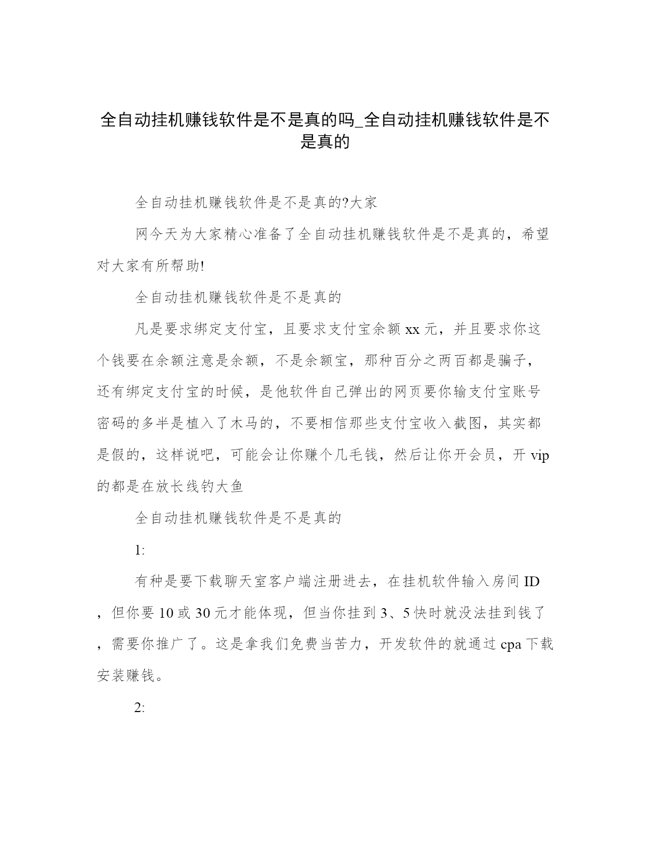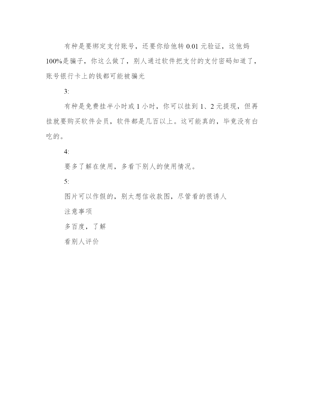 全自动挂机赚钱软件是不是真的吗_全自动挂机赚钱软件是不是真的全自动挂机赚钱软件是不是真的?大家网今天为大家精心准备了全自动挂机赚钱软件是不是真的,希望对大家有所帮助!全自动挂机赚钱软件是不是真的凡是要求绑定支付宝,且要求支付宝余额xx元,并且要求你这个钱要在余额注意是余额,不是余额宝,那种百分之两百都是骗子,还有绑定支付宝的时候,是他软件自己弹出的网页要你输支付宝账号密码的多半是植入了木马的,不要相信那些支付宝收入截图,其实都是假的,这样说吧,可能会让你赚个几毛钱,然后让你开会员,开vip的都是在放长线钓大鱼全自动挂机赚钱软件是不是真的1:有种是要下载聊天室客户端注册进去,在挂机软件输入房间ID,但你要10或30元才能体现,但当你挂到3、5快时就没法挂到钱了,需要你推广了。这是拿我们免费当苦力,开发软件的就通过cpa下载安装赚钱。2:有种是要绑定支付账号,还要你给他转0.01元验证,这他妈100%是骗子,你这么做了,别人通过软件把支付的支付密码知道了,账号银行卡上的钱都可能被骗光3:有种是免费挂半小时或1小时,你可以挂到1、2元提现,但再挂就要购买软件会员,软件都是几百以上。这可能真的,毕竟没有白吃的。4:要多了解在使用,多看下别人的使用情况。5:图片可以作假的,别太想信收款图,尽管看的很诱人注意事项多百度,了解看别人评价