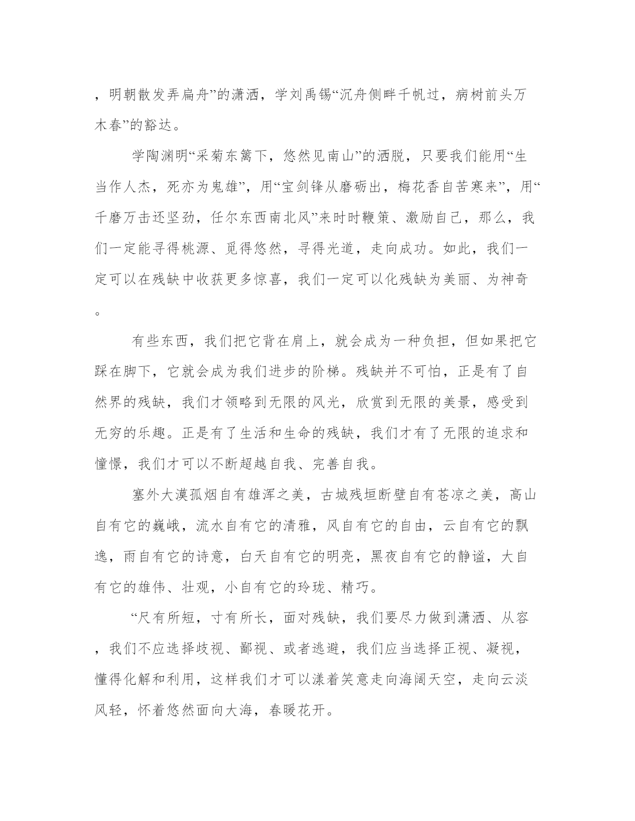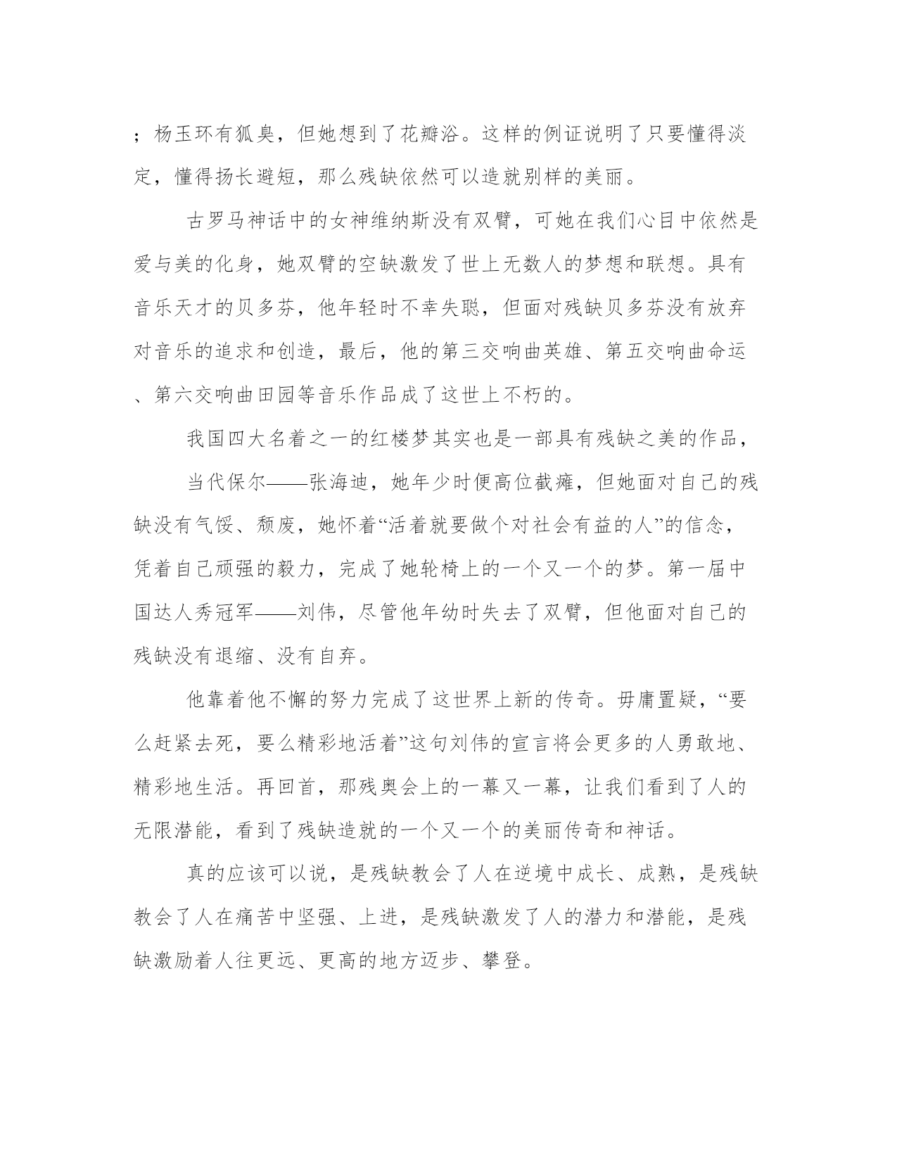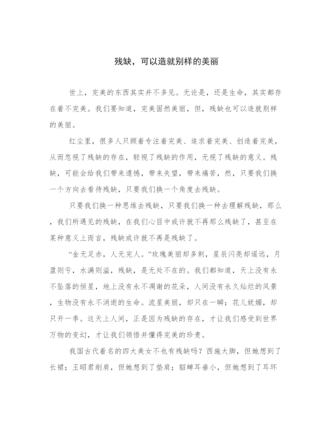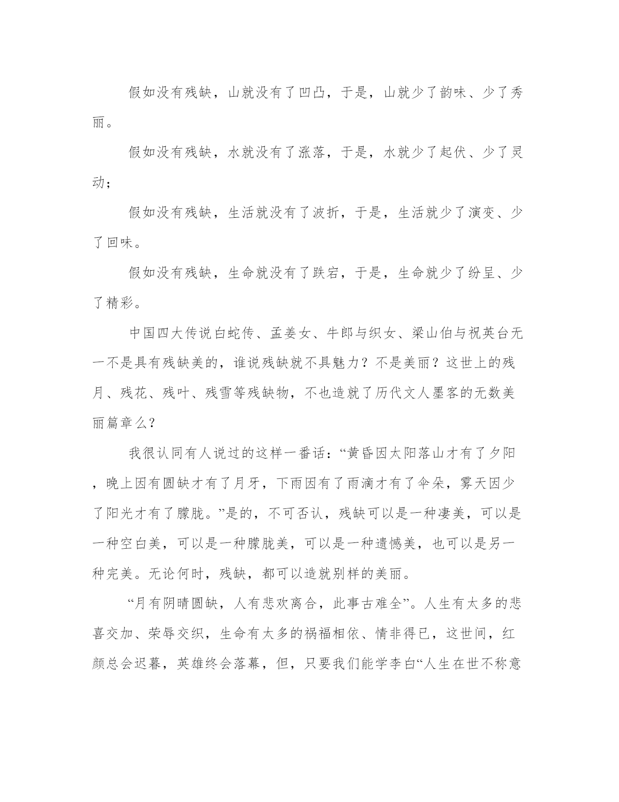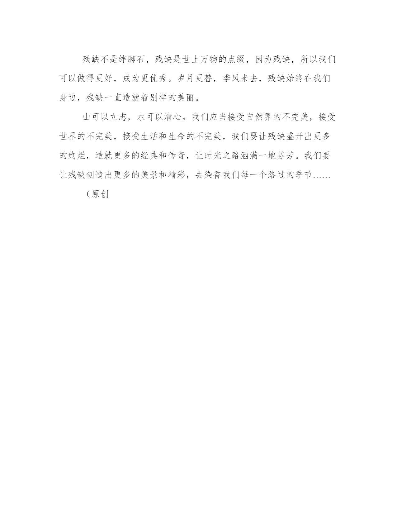 残缺,可以造就别样的美丽世上,完美的东西其实并不多见。无论是,还是生命,其实都存在着不完美。我们要知道,完美固然美丽,但,残缺也可以造就别样的美丽。红尘里,很多人只顾着专注着完美、追求着完美、创造着完美,从而忽视了残缺的存在,轻视了残缺的作用,无视了残缺的意义。残缺,可能会给我们带来遗憾,带来失望,带来痛苦,然,只要我们换一个方向去看待残缺,只要我们换一个角度去残缺。只要我们换一种思维去残缺,只要我们换一种去理解残缺,那么,我们所遇见的残缺,在我们心目中或许就不再那么残缺了,甚至在某种意义上而言,残缺或许就不再是残缺了。“金无足赤,人无完人。”玫瑰美丽却多刺,星辰闪亮却遥远,月盈则亏,水满则溢,残缺,是无处不在的。我们都知道,天上没有永不坠落的恒星,地上没有永不凋谢的花朵,人间没有永久灿烂的风景,生物没有永不消逝的生命。流星美丽,却只在一瞬;花儿妩媚,却只开一季。这天上人间,正是因为残缺的存在,才让我们感受到世界万物的变幻,才让我们领悟并懂得完美的珍贵。我国古代着名的四大美女不也有残缺吗?西施大脚,但她想到了长裙;王昭君削肩,但她想到了垫肩;貂蝉耳垂小,但她想到了耳环;杨玉环有狐臭,但她想到了花瓣浴。这样的例证说明了只要懂得淡定,懂得扬长避短,那么残缺依然可以造就别样的美丽。古罗马神话中的女神维纳斯没有双臂,可她在我们心目中依然是爱与美的化身,她双臂的空缺激发了世上无数人的梦想和联想。具有音乐天才的贝多芬,他年轻时不幸失聪,但面对残缺贝多芬没有放弃对音乐的追求和创造,最后,他的第三交响曲英雄、第五交响曲命运、第六交响曲田园等音乐作品成了这世上不朽的。我国四大名着之一的红楼梦其实也是一部具有残缺之美的作品,当代保尔——张海迪,她年少时便高位截瘫,但她面对自己的残缺没有气馁、颓废,她怀着“活着就要做个对社会有益的人”的信念,凭着自己顽强的毅力,完成了她轮椅上的一个又一个的梦。第一届中国达人秀冠军——刘伟,尽管他年幼时失去了双臂,但他面对自己的残缺没有退缩、没有自弃。他靠着他不懈的努力完成了这世界上新的传奇。毋庸置疑,“要么赶紧去死,要么精彩地活着”这句刘伟的宣言将会更多的人勇敢地、精彩地生活。再回首,那残奥会上的一幕又一幕,让我们看到了人的无限潜能,看到了残缺造就的一个又一个的美丽传奇和神话。真的应该可以说,是残缺教会了人在逆境中成长、成熟,是残缺教会了人在痛苦中坚强、上进,是残缺激发了人的潜力和潜能,是残缺激励着人往更远、更高的地方迈步、攀登。假如没有残缺,山就没有了凹凸,于是,山就少了韵味、少了秀丽。假如没有残缺,水就没有了涨落,于是,水就少了起伏、少了灵动;假如没有残缺,生活就没有了波折,于是,生活就少了演变、少了回味。假如没有残缺,生命就没有了跌宕,于是,生命就少了纷呈、少了精彩。中国四大传说白蛇传、孟姜女、牛郎与织女、梁山伯与祝英台无一不是具有残缺美的,谁说残缺就不具魅力?不是美丽?这世上的残月、残花、残叶、残雪等残缺物,不也造就了历代文人墨客的无数美丽篇章么?我很认同有人说过的这样一番话:“黄昏因太阳落山才有了夕阳,晚上因有圆缺才有了月牙,下雨因有了雨滴才有了伞朵,雾天因少了阳光才有了朦胧。”是的,不可否认,残缺可以是一种凄美,可以是一种空白美,可以是一种朦胧美,可以是一种遗憾美,也可以是另一种完美。无论何时,残缺,都可以造就别样的美丽。“月有阴晴圆缺,人有悲欢离合,此事古难全”。人生有太多的悲喜交加、荣辱交织,生命有太多的祸福相依、情非得已,这世间,红颜总会迟暮,英雄终会落幕,但,只要我们能学李白“人生在世不称意,明朝散发弄扁舟”的潇洒,学刘禹锡“沉舟侧畔千帆过,病树前头万木春”的豁达。学陶渊明“采菊东篱下,悠然见南山”的洒脱,只要我们能用“生当作人杰,死亦为鬼雄”,用“宝剑锋从磨砺出,梅花香自苦寒来”,用“千磨万击还坚劲,任尔东西南北风”来时时鞭策、激励自己,那么,我们一定能寻得桃源、觅得悠然,寻得光道,走向成功。如此,我们一定可以在残缺中收获更多惊喜,我们一定可以化残缺为美丽、为神奇。有些东西,我们把它背在肩上,就会成为一种负担,但如果把它踩在脚下,它就会成为我们进步的阶梯。残缺并不可怕,正是有了自然界的残缺,我们才领略到无限的风光,欣赏到无限的美景,感受到无穷的乐趣。正是有了生活和生命的残缺,我们才有了无限的追求和憧憬,我们才可以不断超越自我、完善自我。塞外大漠孤烟自有雄浑之美,古城残垣断壁自有苍凉之美,高山自有它的巍峨,流水自有它的清雅,风自有它的自由,云自有它的飘逸,雨自有它的诗意,白天自有它的明亮,黑夜自有它的静谧,大自有它的雄伟、壮观,小自有它的玲珑、精巧。“尺有所短,寸有所长,面对残缺,我们要尽力做到潇洒、从容,我们不应选择歧视、鄙视、或者逃避,我们应当选择正视、凝视,懂得化解和利用,这样我们才可以漾