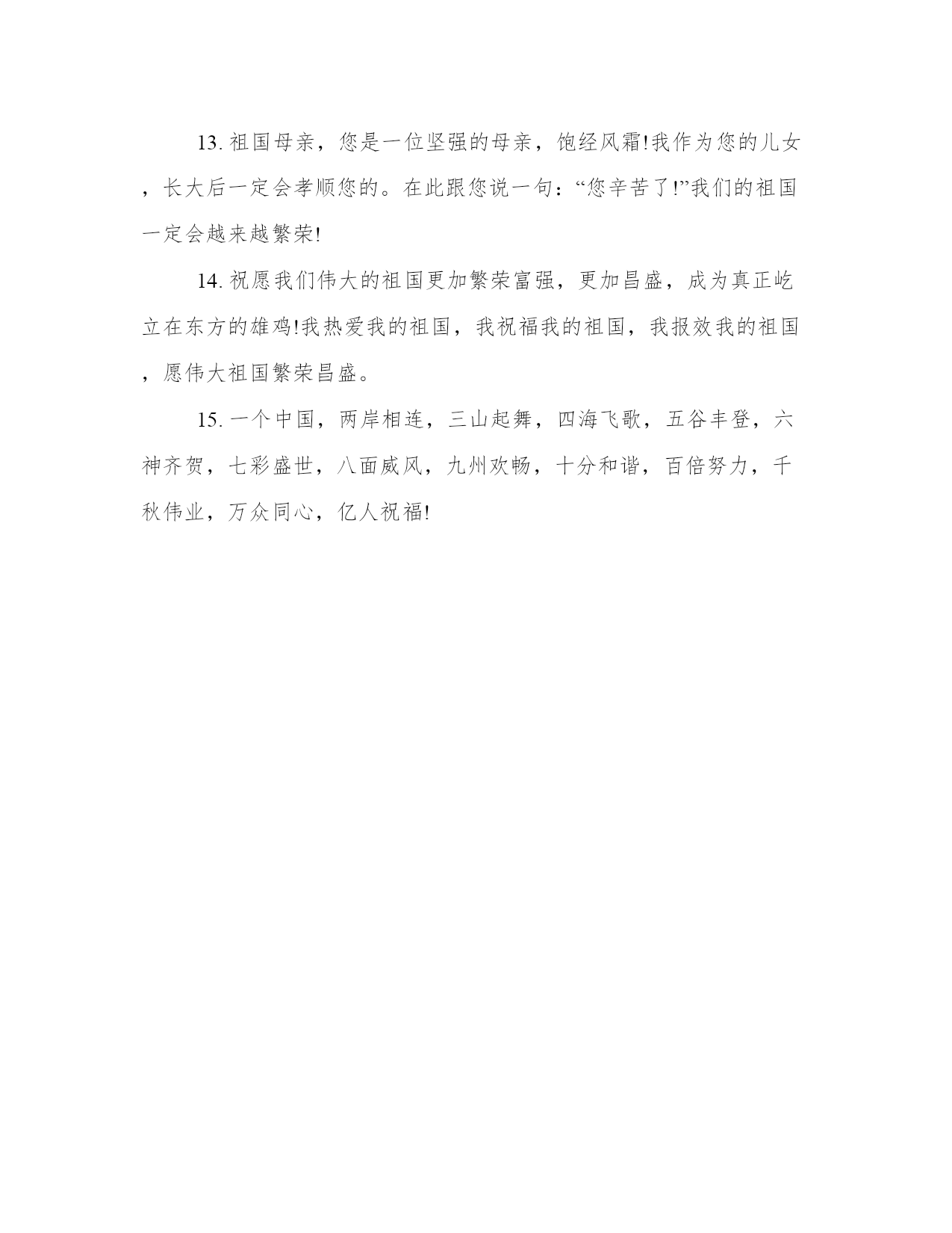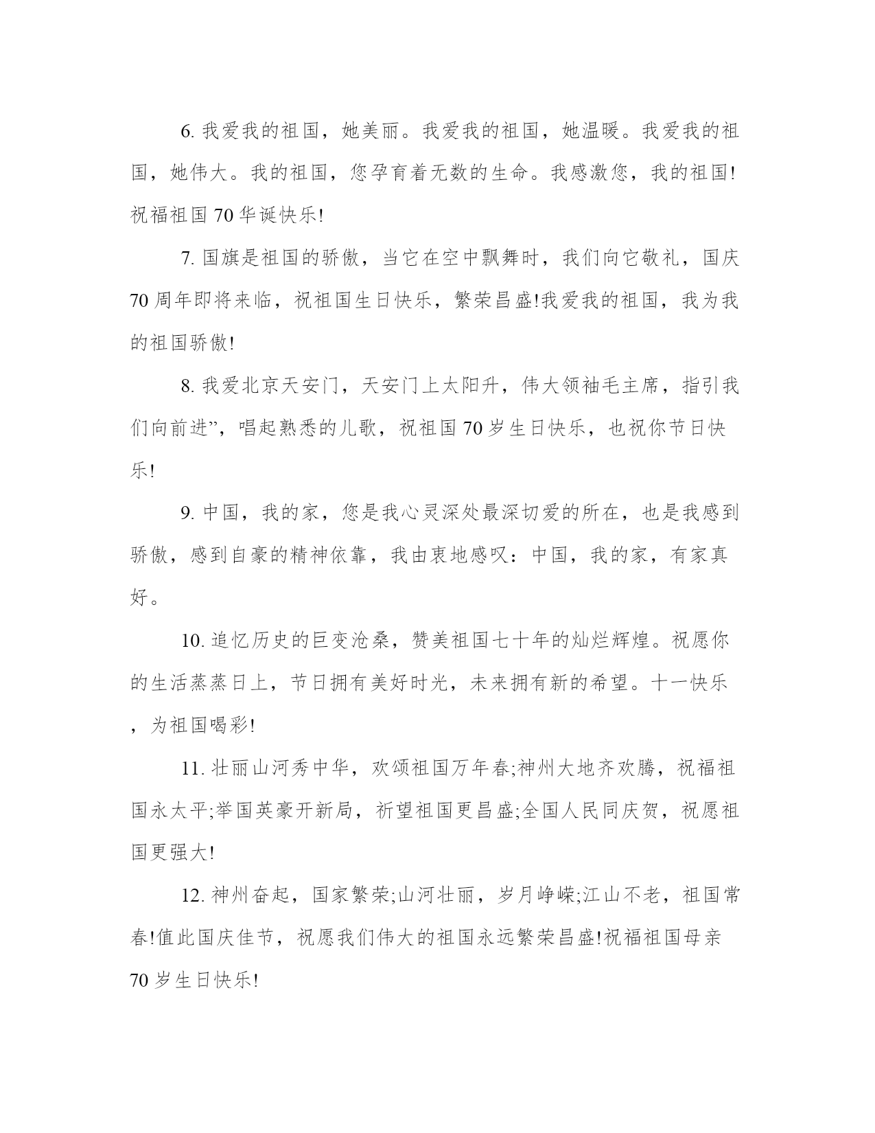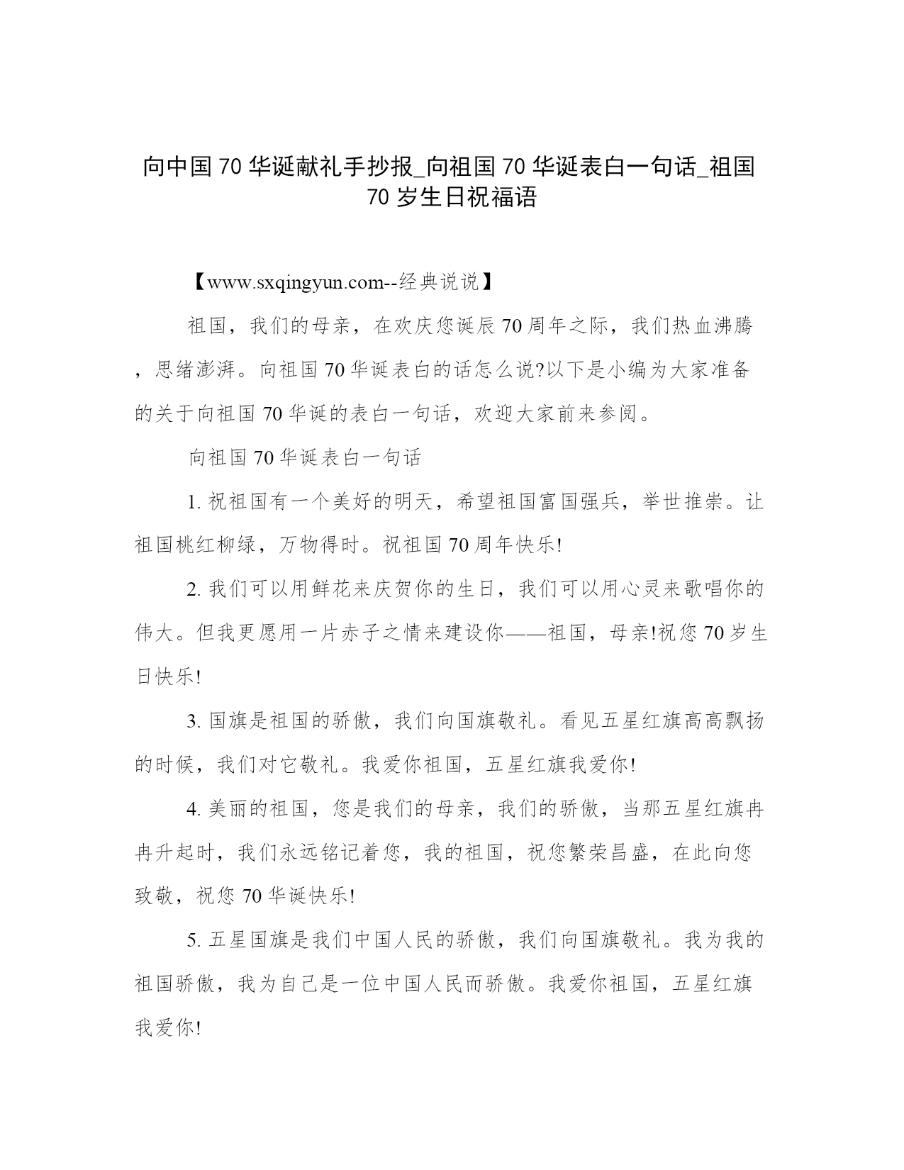 向中国70华诞献礼手抄报_向祖国70华诞表白一句话_祖国70岁生日祝福语【www.sxqingyun.com--经典说说】祖国,我们的母亲,在欢庆您诞辰70周年之际,我们热血沸腾,思绪澎湃。向祖国70华诞表白的话怎么说?以下是小编为大家准备的关于向祖国70华诞的表白一句话,欢迎大家前来参阅。向祖国70华诞表白一句话1.祝祖国有一个美好的明天,希望祖国富国强兵,举世推崇。让祖国桃红柳绿,万物得时。祝祖国70周年快乐!2.我们可以用鲜花来庆贺你的生日,我们可以用心灵来歌唱你的伟大。但我更愿用一片赤子之情来建设你――祖国,母亲!祝您70岁生日快乐!3.国旗是祖国的骄傲,我们向国旗敬礼。看见五星红旗高高飘扬的时候,我们对它敬礼。我爱你祖国,五星红旗我爱你!4.美丽的祖国,您是我们的母亲,我们的骄傲,当那五星红旗冉冉升起时,我们永远铭记着您,我的祖国,祝您繁荣昌盛,在此向您致敬,祝您70华诞快乐!5.五星国旗是我们中国人民的骄傲,我们向国旗敬礼。我为我的祖国骄傲,我为自己是一位中国人民而骄傲。我爱你祖国,五星红旗我爱你!6.我爱我的祖国,她美丽。我爱我的祖国,她温暖。我爱我的祖国,她伟大。我的祖国,您孕育着无数的生命。我感激您,我的祖国!祝福祖国70华诞快乐!7.国旗是祖国的骄傲,当它在空中飘舞时,我们向它敬礼,国庆70周年即将来临,祝祖国生日快乐,繁荣昌盛!我爱我的祖国,我为我的祖国骄傲!8.我爱北京天安门,天安门上太阳升,伟大领袖毛主席,指引我们向前进”,唱起熟悉的儿歌,祝祖国70岁生日快乐,也祝你节日快乐!9.中国,我的家,您是我心灵深处最深切爱的所在,也是我感到骄傲,感到自豪的精神依靠,我由衷地感叹:中国,我的家,有家真好。10.追忆历史的巨变沧桑,赞美祖国七十年的灿烂辉煌。祝愿你的生活蒸蒸日上,节日拥有美好时光,未来拥有新的希望。十一快乐,为祖国喝彩!11.壮丽山河秀中华,欢颂祖国万年春;神州大地齐欢腾,祝福祖国永太平;举国英豪开新局,祈望祖国更昌盛;全国人民同庆贺,祝愿祖国更强大!12.神州奋起,国家繁荣;山河壮丽,岁月峥嵘;江山不老,祖国常春!值此国庆佳节,祝愿我们伟大的祖国永远繁荣昌盛!祝福祖国母亲70岁生日快乐!13.祖国母亲,您是一位坚强的母亲,饱经风霜!我作为您的儿女,长大后一定会孝顺您的。在此跟您说一句:“您辛苦了!”我们的祖国一定会越来越繁荣!14.祝愿我们伟大的祖国更加繁荣富强,更加昌盛,成为真正屹立在东方的雄鸡!我热爱我的祖国,我祝福我的祖国,我报效我的祖国,愿伟大祖国繁荣昌盛。15.一个中国,两岸相连,三山起舞,四海飞歌,五谷丰登,六神齐贺,七彩盛世,八面威风,九州欢畅,十分和谐,百倍努力,千秋伟业,万众同心,亿人祝福!
