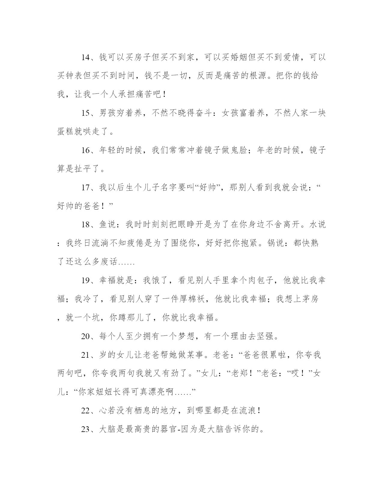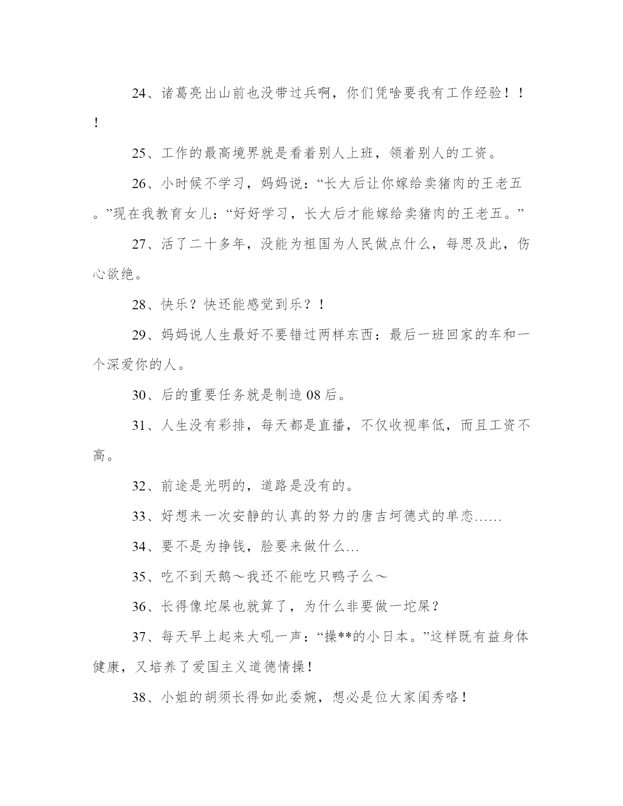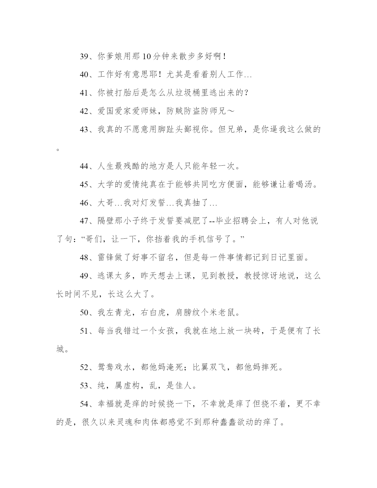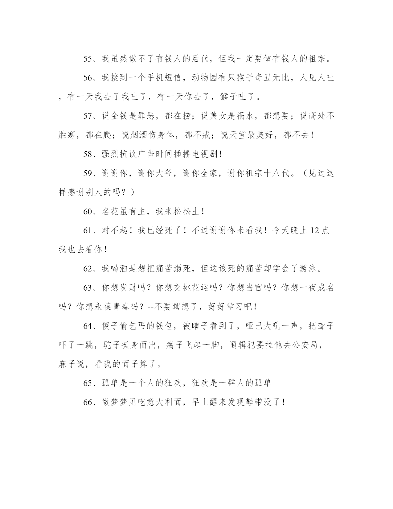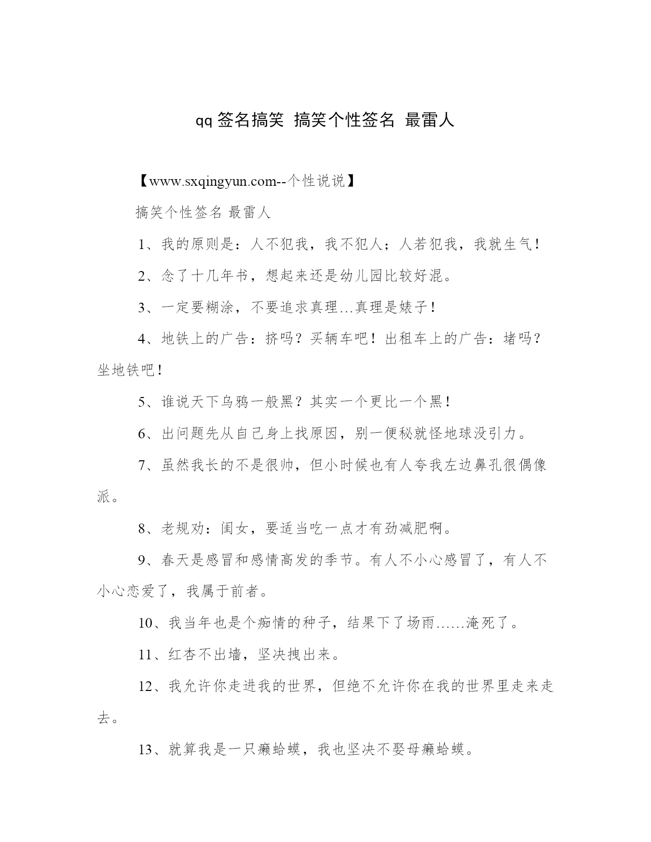 qq签名搞笑搞笑个性签名最雷人【www.sxqingyun.com--个性说说】搞笑个性签名最雷人1、我的原则是:人不犯我,我不犯人;人若犯我,我就生气!2、念了十几年书,想起来还是幼儿园比较好混。3、一定要糊涂,不要追求真理…真理是婊子!4、地铁上的广告:挤吗?买辆车吧!出租车上的广告:堵吗?坐地铁吧!5、谁说天下乌鸦一般黑?其实一个更比一个黑!6、出问题先从自己身上找原因,别一便秘就怪地球没引力。7、虽然我长的不是很帅,但小时候也有人夸我左边鼻孔很偶像派。8、老规劝:闺女,要适当吃一点才有劲减肥啊。9、春天是感冒和感情高发的季节。有人不小心感冒了,有人不小心恋爱了,我属于前者。10、我当年也是个痴情的种子,结果下了场雨……淹死了。11、红杏不出墙,坚决拽出来。12、我允许你走进我的世界,但绝不允许你在我的世界里走来走去。13、就算我是一只癞蛤蟆,我也坚决不娶母癞蛤蟆。14、钱可以买房子但买不到家,可以买婚姻但买不到爱情,可以买钟表但买不到时间,钱不是一切,反而是痛苦的根源。把你的钱给我,让我一个人承担痛苦吧!15、男孩穷着养,不然不晓得奋斗:女孩富着养,不然人家一块蛋糕就哄走了。16、年轻的时候,我们常常冲着镜子做鬼脸;年老的时候,镜子算是扯平了。17、我以后生个儿子名字要叫“好帅”,那别人看到我就会说:“好帅的爸爸!”18、鱼说:我时时刻刻把眼睁开是为了在你身边不舍离开。水说:我终日流淌不知疲倦是为了围绕你,好好把你抱紧。锅说:都快熟了还这么多废话……19、幸福就是:我饿了,看见别人手里拿个肉包子,他就比我幸福;我冷了,看见别人穿了一件厚棉袄,他就比我幸福;我想上茅房,就一个坑,你蹲那儿了,你就比我幸福。20、每个人至少拥有一个梦想,有一个理由去坚强。21、岁的女儿让老爸帮她做某事。老爸:“爸爸很累啦,你夸我两句吧,你夸我两句我就又有劲了。”女儿:“老郑!”老爸:“哎!”女儿:“你家妞妞长得可真漂亮啊……”22、心若没有栖息的地方,到哪里都是在流浪!23、大脑是最高贵的器官-因为是大脑告诉你的。24、诸葛亮出山前也没带过兵啊,你们凭啥要我有工作经验!!!25、工作的最高境界就是看着别人上班,领着别人的工资。26、小时候不学习,妈妈说:“长大后让你嫁给卖猪肉的王老五。”现在我教育女儿:“好好学习,长大后才能嫁给卖猪肉的王老五。”27、活了二十多年,没能为祖国为人民做点什么,每思及此,伤心欲绝。28、快乐?快还能感觉到乐?!29、妈妈说人生最好不要错过两样东西:最后一班回家的车和一个深爱你的人。30、后的重要任务就是制造08后。31、人生没有彩排,每天都是直播,不仅收视率低,而且工资不高。32、前途是光明的,道路是没有的。33、好想来一次安静的认真的努力的唐吉坷德式的单恋……34、要不是为挣钱,脸要来做什么…35、吃不到天鹅~我还不能吃只鸭子么~36、长得像坨屎也就算了,为什么非要做一坨屎?37、每天早上起来大吼一声:“操**的小日本。”这样既有益身体健康,又培养了爱国主义道德情操!38、小姐的胡须长得如此委婉,想必是位大家闺秀咯!39、你爹娘用那10分钟来散步多好啊!40、工作好有意思耶!尤其是看着别人工作…41、你被打胎后是怎么从垃圾桶里逃出来的?42、爱国爱家爱师妹,防贼防盗防师兄~43、我真的不愿意用脚趾头鄙视你。但兄弟,是你逼我这么做的。44、人生最残酷的地方是人只能年轻一次。45、大学的爱情纯真在于能够共同吃方便面,能够谦让着喝汤。46、大哥…我对灯发誓…我真抽了…47、隔壁那小子终于发誓要减肥了--毕业招聘会上,有人对他说了句:“哥们,让一下,你挡着我的手机信号了。”48、雷锋做了好事不留名,但是每一件事情都记到日记里面。49、逃课太多,昨天想去上课,见到教授,教授惊讶地说,这么长时间不见,长这么大了。50、我左青龙,右白虎,肩膀纹个米老鼠。51、每当我错过一个女孩,我就在地上放一块砖,于是便有了长城。52、鸳鸯戏水,都他妈淹死;比翼双飞,都他妈摔死。53、纯,属虚构,乱,是佳人。54、幸福就是痒的时候挠一下,不幸就是痒了但挠不着,更不幸的是,很久以来灵魂和肉体都感觉不到那种蠢蠢欲动的痒了。55、我虽然做不了有钱人的后代,但我一定要做有钱人的祖宗。56、我接到一个手机短信,动物园有只猴子奇丑无比,人见人吐,有一天我去了我吐了,有一天你去了,猴子吐了。57、说金钱是罪恶,都在捞;说美女是祸水,都想要;说高处不胜寒,都在爬;说烟酒伤身体,都不戒;说天堂最美好,都不去!58、强烈抗议广告时间插播电视剧!59、谢谢你,谢你大爷,谢你全家,谢你祖宗十八代。(见过这样感谢别人的吗?)60、名花虽有主,我来松松土!61、对不起!我已经死了!不过谢谢你来看我!今天晚上12点我也去看你!62、我喝酒是想把痛苦溺死,但这该死的痛苦