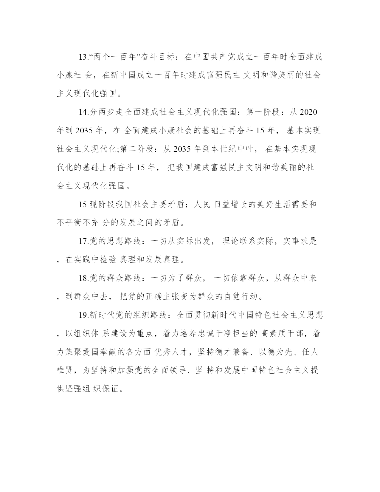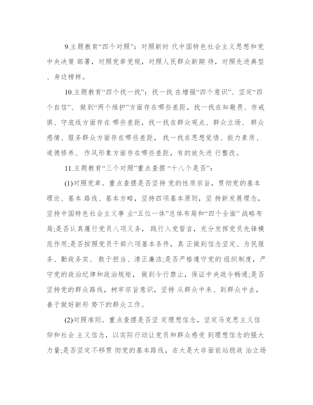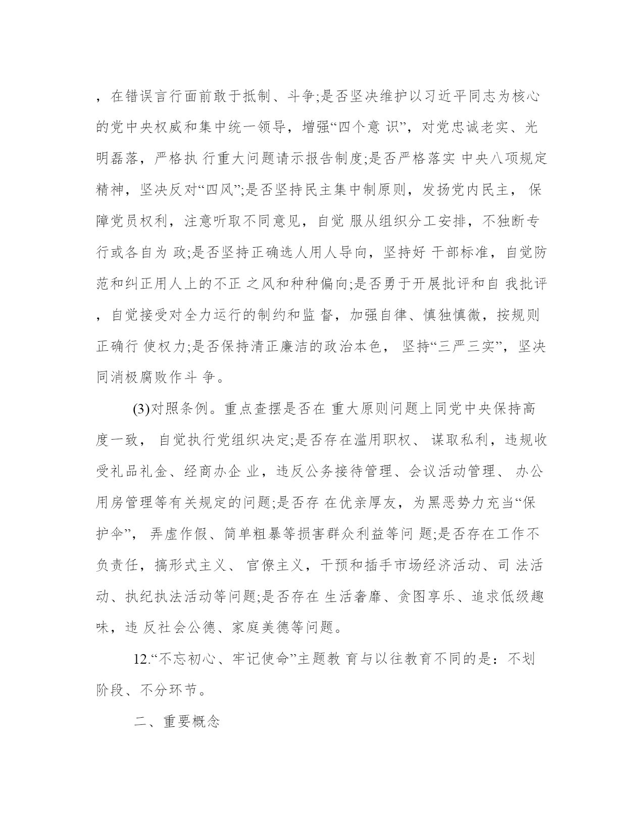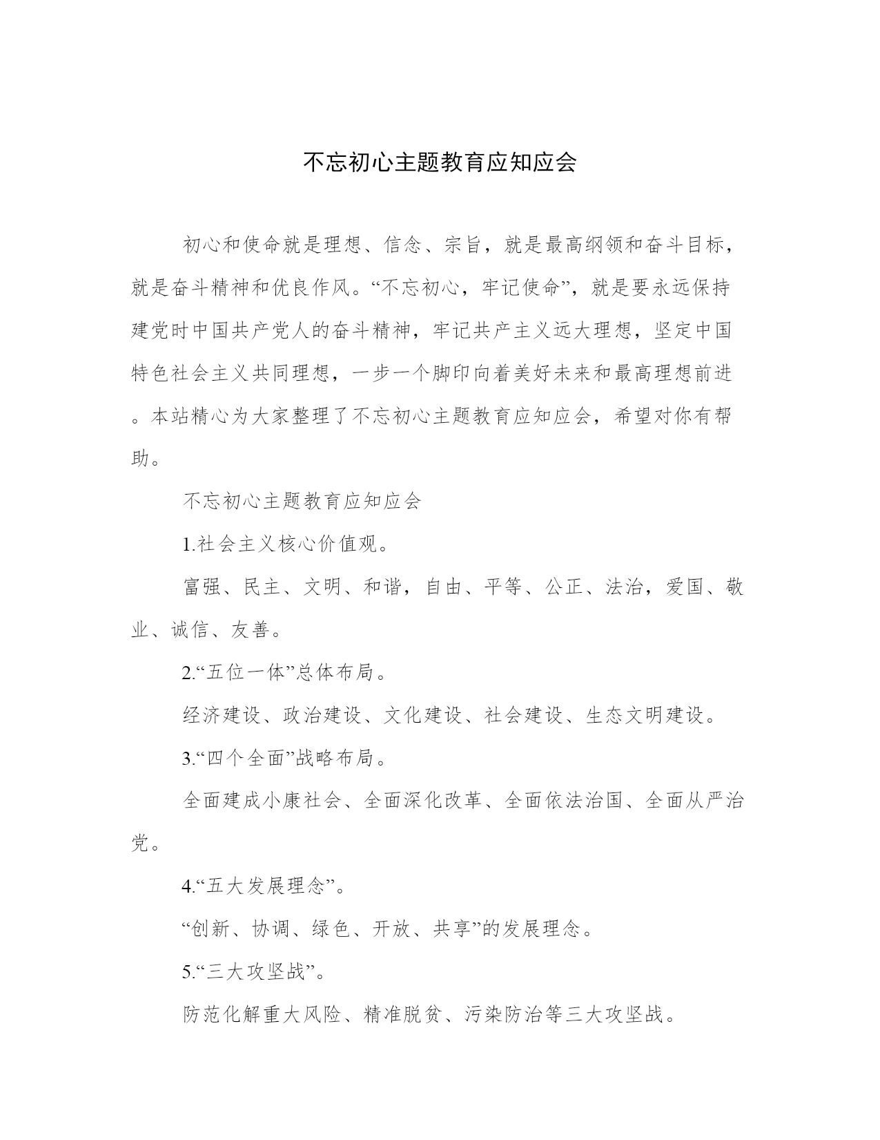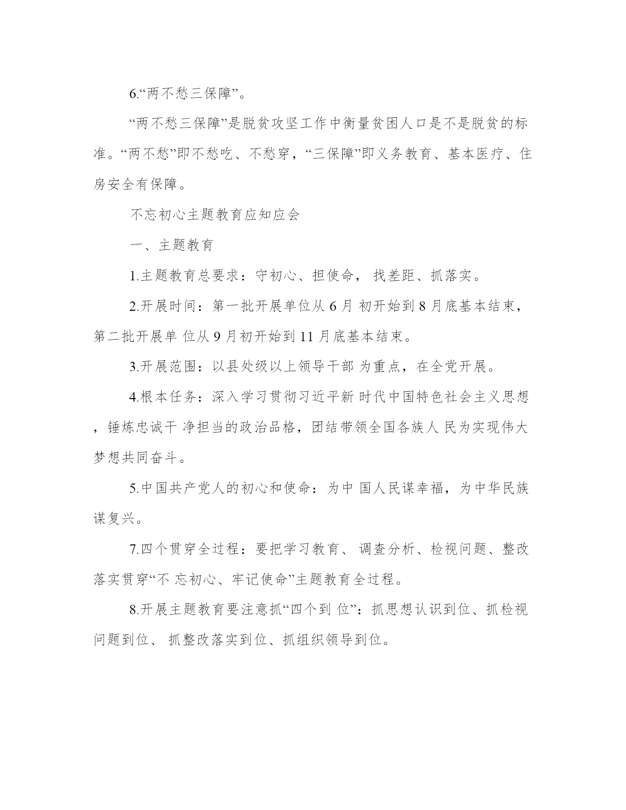 不忘初心主题教育应知应会初心和使命就是理想、信念、宗旨,就是最高纲领和奋斗目标,就是奋斗精神和优良作风。“不忘初心,牢记使命”,就是要永远保持建党时中国共产党人的奋斗精神,牢记共产主义远大理想,坚定中国特色社会主义共同理想,一步一个脚印向着美好未来和最高理想前进。本站精心为大家整理了不忘初心主题教育应知应会,希望对你有帮助。不忘初心主题教育应知应会1.社会主义核心价值观。富强、民主、文明、和谐,自由、平等、公正、法治,爱国、敬业、诚信、友善。2.“五位一体”总体布局。经济建设、政治建设、文化建设、社会建设、生态文明建设。3.“四个全面”战略布局。全面建成小康社会、全面深化改革、全面依法治国、全面从严治党。4.“五大发展理念”。“创新、协调、绿色、开放、共享”的发展理念。5.“三大攻坚战”。防范化解重大风险、精准脱贫、污染防治等三大攻坚战。6.“两不愁三保障”。“两不愁三保障”是脱贫攻坚工作中衡量贫困人口是不是脱贫的标准。“两不愁”即不愁吃、不愁穿,“三保障”即义务教育、基本医疗、住房安全有保障。不忘初心主题教育应知应会一、主题教育1.主题教育总要求:守初心、担使命,找差距、抓落实。2.开展时间:第一批开展单位从6月初开始到8月底基本结束,第二批开展单位从9月初开始到11月底基本结束。3.开展范围:以县处级以上领导干部为重点,在全党开展。4.根本任务:深入学习贯彻习近平新时代中国特色社会主义思想,锤炼忠诚干净担当的政治品格,团结带领全国各族人民为实现伟大梦想共同奋斗。5.中国共产党人的初心和使命:为中国人民谋幸福,为中华民族谋复兴。7.四个贯穿全过程:要把学习教育、调查分析、检视问题、整改落实贯穿“不忘初心、牢记使命”主题教育全过程。8.开展主题教育要注意抓“四个到位”:抓思想认识到位、抓检视问题到位、抓整改落实到位、抓组织领导到位。9.主题教育“四个对照”:对照新时代中国特色社会主义思想和党中央决策部署,对照党章党规,对照人民群众新期待,对照先进典型、身边榜样。10.主题教育“四个找一找”:找一找在增强“四个意识”、坚定“四个自信”、做到“两个维护”方面存在哪些差距,找一找在知敬畏、存戒惧、守底线方面存在哪些差距,找一找在群众观点、群众立场、群众感情、服务群众方面存在哪些差距,找一找在思想觉悟、能力素质、道德修养、作风形象方面存在哪些差距,有的放矢进行整改。11.主题教育“三个对照”重点查摆“十八个是否”:(1)对照党章。重点查摆是否坚持党的性质宗旨,贯彻党的基本理论、基本路线、基本方略,坚持四项基本原则,坚持新发展理念,坚持中国特色社会主义事业“五位一体”总体布局和“四个全面”战略布局;是否认真履行党员八项义务,践行入党誓言,充分发挥党员先锋模范作用;是否按照党员干部六项基本条件,真正做到信念坚定、为民服务、勤政务实、敢于担当、清正廉洁;是否严格遵守党的组织制度,严守党的政治纪律和政治规矩,做到令行禁止,保证中央政令畅通;是否坚持党的群众路线,树牢宗旨意识,坚持从群众中来、到群众中去,善于做好新形势下的群众工作。(2)对照准则。重点查摆是否坚定理想信念,坚定马克思主义信仰和社会主义信念,以实际行动让党员和群众感受到理想信念的强大力量;是否坚定不移贯彻党的基本路线,在大是大非面前站稳政治立场,在错误言行面前敢于抵制、斗争;是否坚决维护以习近平同志为核心的党中央权威和集中统一领导,增强“四个意识”,对党忠诚老实、光明磊落,严格执行重大问题请示报告制度;是否严格落实中央八项规定精神,坚决反对“四风”;是否坚持民主集中制原则,发扬党内民主,保障党员权利,注意听取不同意见,自觉服从组织分工安排,不独断专行或各自为政;是否坚持正确选人用人导向,坚持好干部标准,自觉防范和纠正用人上的不正之风和种种偏向;是否勇于开展批评和自我批评,自觉接受对全力运行的制约和监督,加强自律、慎独慎微,按规则正确行使权力;是否保持清正廉洁的政治本色,坚持“三严三实”,坚决同消极腐败作斗争。(3)对照条例。重点查摆是否在重大原则问题上同党中央保持高度一致,自觉执行党组织决定;是否存在滥用职权、谋取私利,违规收受礼品礼金、经商办企业,违反公务接待管理、会议活动管理、办公用房管理等有关规定的问题;是否存在优亲厚友,为黑恶势力充当“保护伞”,弄虚作假、简单粗暴等损害群众利益等问题;是否存在工作不负责任,搞形式主义、官僚主义,干预和插手市场经济活动、司法活动、执纪执法活动等问题;是否存在生活奢靡、贪图享乐、追求低级趣味,违反社会公德、家庭美德等问题。12.“不忘初心、牢记使命”主题教育与以往教育不同的是:不划阶段、不分环节。二、重要概念13.“两个一百年”奋斗目标:在中国共产党成立一百年时全面建成小康社会,在新中国成立一百年时建成富强民主文明和谐美丽的社会主义现代化强国