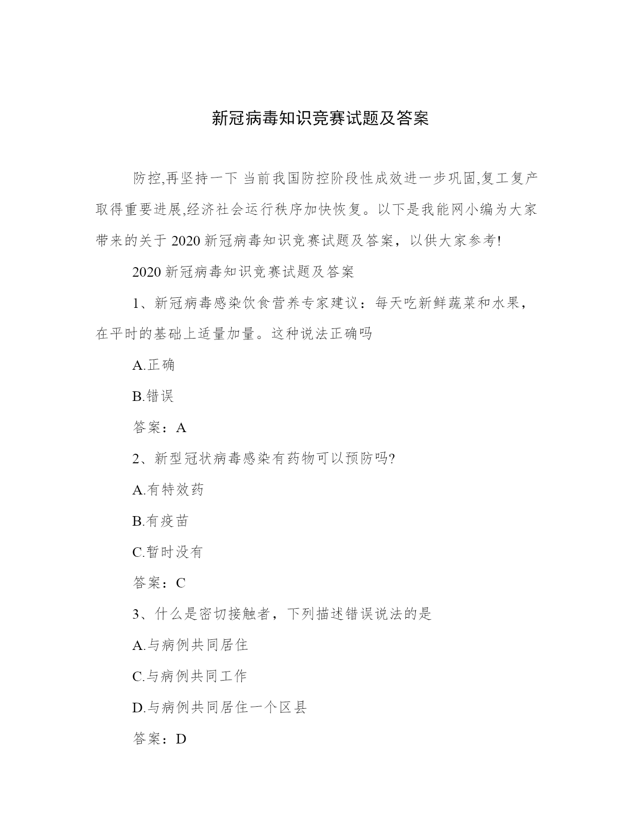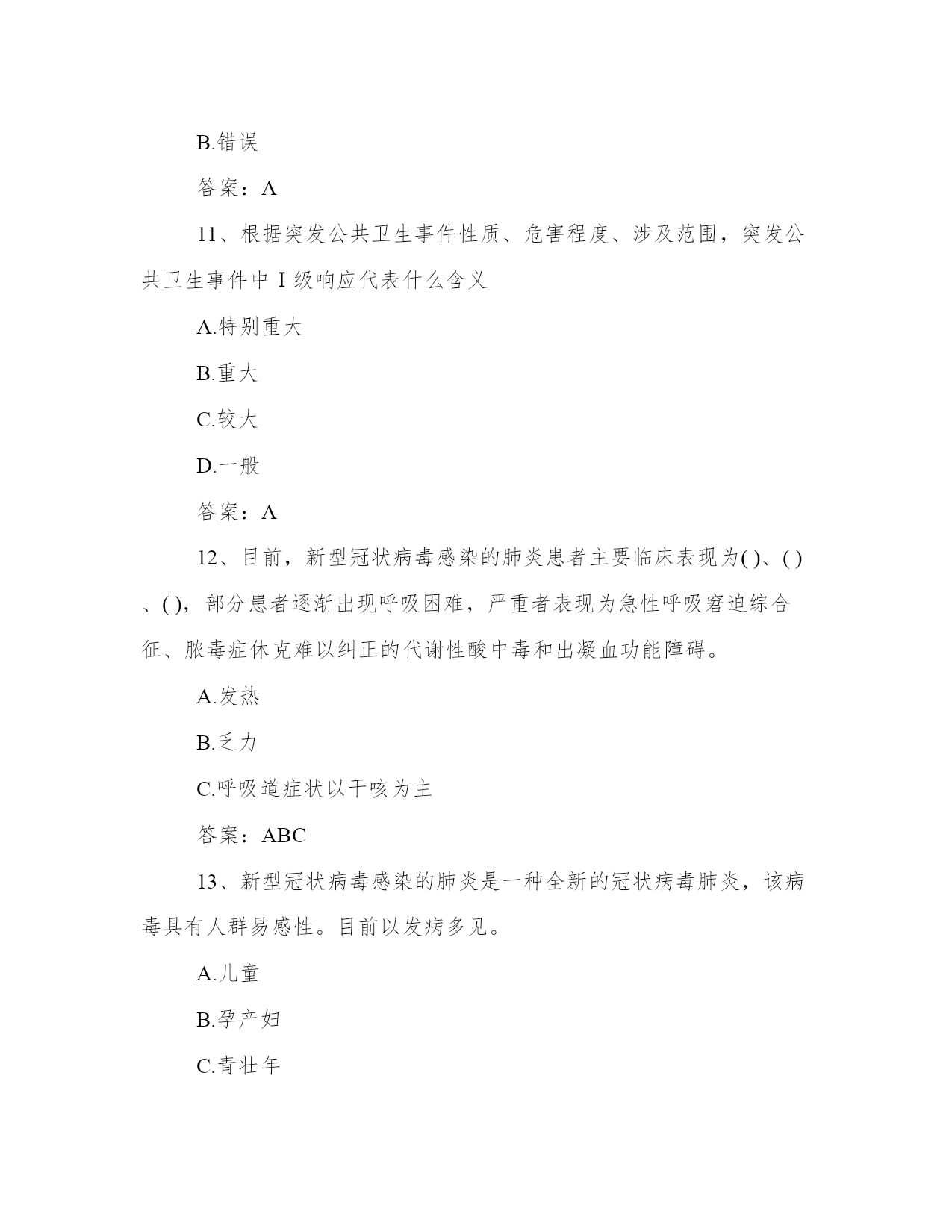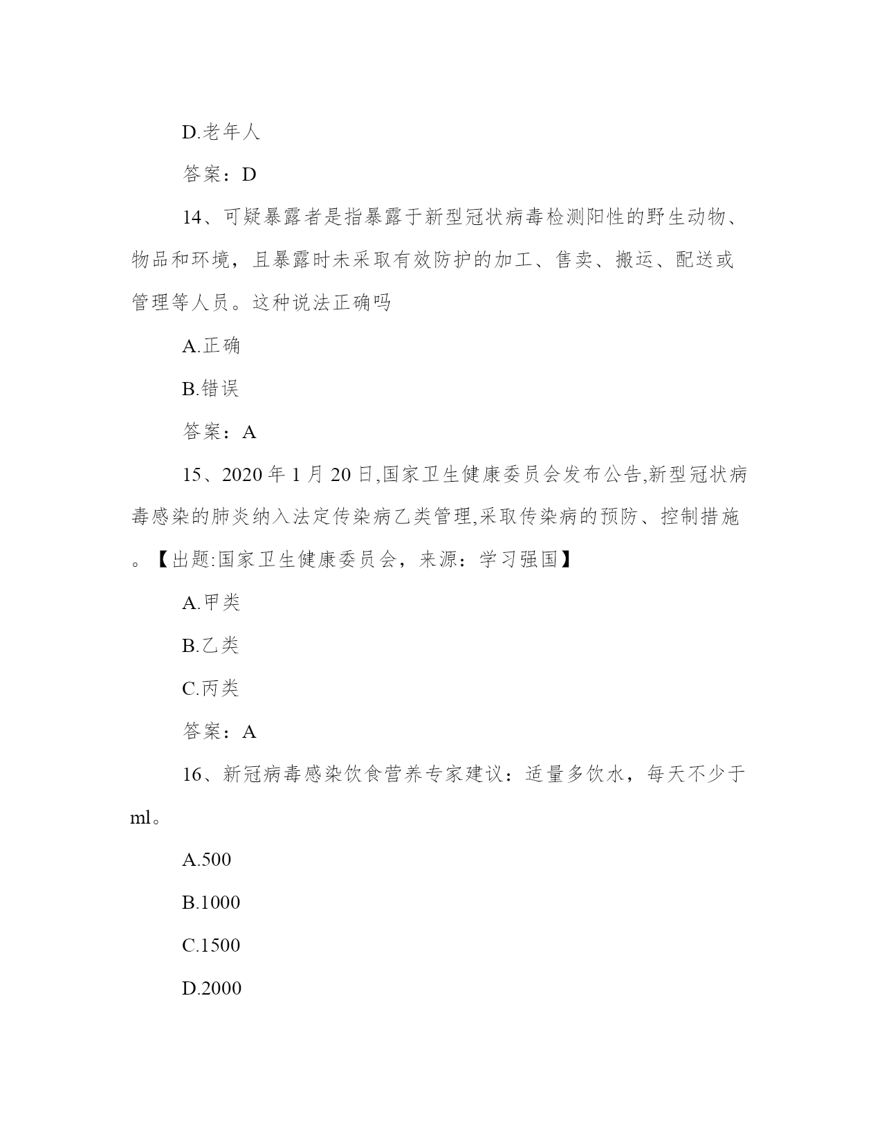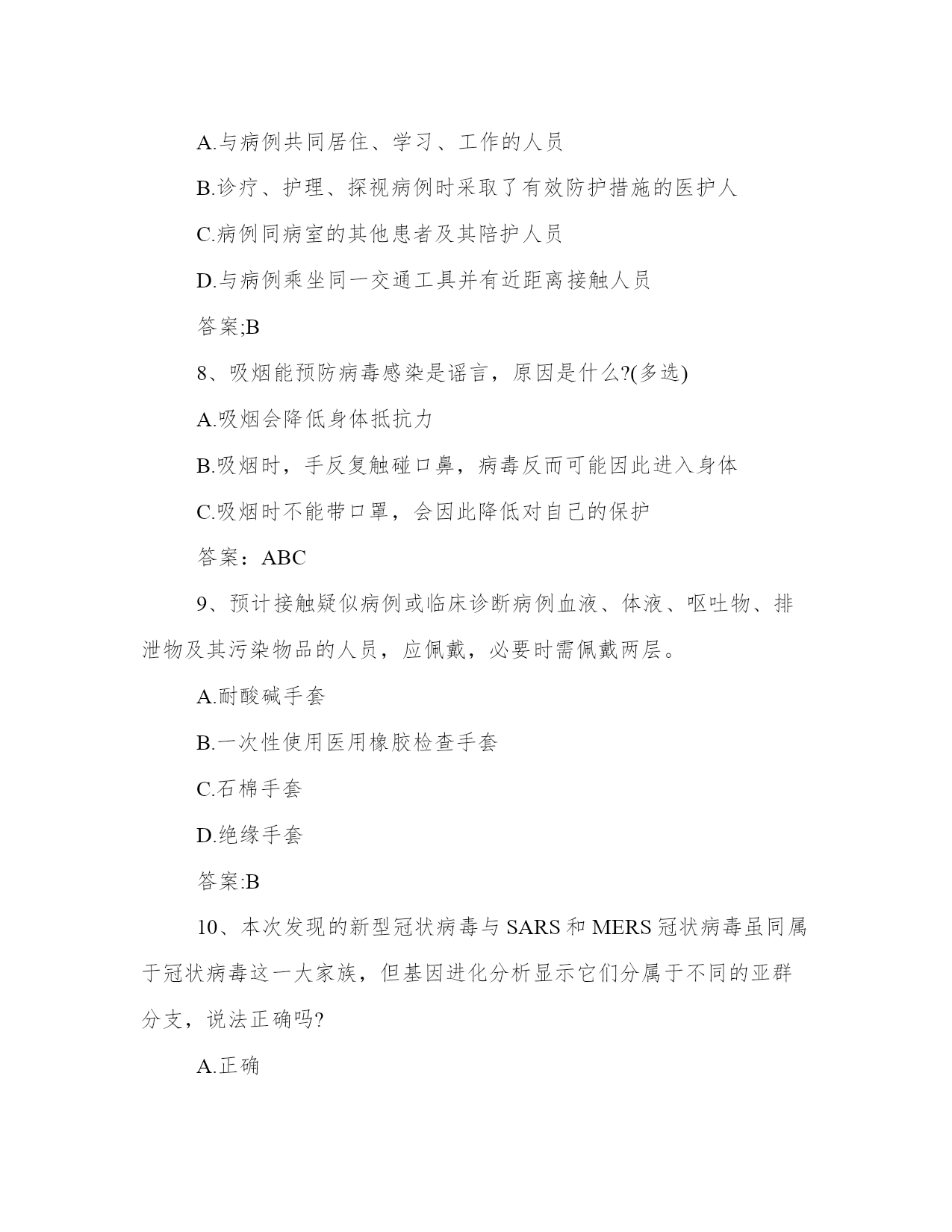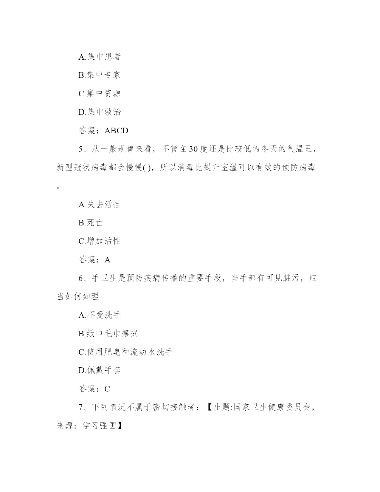 新冠病毒知识竞赛试题及答案防控,再坚持一下当前我国防控阶段性成效进一步巩固,复工复产取得重要进展,经济社会运行秩序加快恢复。以下是我能网小编为大家带来的关于2020新冠病毒知识竞赛试题及答案,以供大家参考!2020新冠病毒知识竞赛试题及答案1、新冠病毒感染饮食营养专家建议:每天吃新鲜蔬菜和水果,在平时的基础上适量加量。这种说法正确吗A.正确B.错误答案:A2、新型冠状病毒感染有药物可以预防吗?A.有特效药B.有疫苗C.暂时没有答案:C3、什么是密切接触者,下列描述错误说法的是A.与病例共同居住C.与病例共同工作D.与病例共同居住一个区县答案:DA.集中患者B.集中专家C.集中资源D.集中救治答案:ABCD5、从一般规律来看,不管在30度还是比较低的冬天的气温里,新型冠状病毒都会慢慢(),所以消毒比提升室温可以有效的预防病毒。A.失去活性B.死亡C.增加活性答案:A6、手卫生是预防疾病传播的重要手段,当手部有可见脏污,应当如何如理A.不爱洗手B.纸巾毛巾擦拭C.使用肥皂和流动水洗手D.佩戴手套答案:C7、下列情況不属于密切接触者:【出题:国家卫生健康委员会,来源:学习强国】A.与病例共同居住、学习、工作的人员B.诊疗、护理、探视病例时采取了有效防护措施的医护人C.病例同病室的其他患者及其陪护人员D.与病例乘坐同一交通工具并有近距离接触人员答案;B8、吸烟能预防病毒感染是谣言,原因是什么?(多选)A.吸烟会降低身体抵抗力B.吸烟时,手反复触碰口鼻,病毒反而可能因此进入身体C.吸烟时不能带口罩,会因此降低对自己的保护答案:ABC9、预计接触疑似病例或临床诊断病例血液、体液、呕吐物、排泄物及其污染物品的人员,应佩戴,必要时需佩戴两层。A.耐酸碱手套B.一次性使用医用橡胶检查手套C.石棉手套D.绝缘手套答案:B10、本次发现的新型冠状病毒与SARS和MERS冠状病毒虽同属于冠状病毒这一大家族,但基因进化分析显示它们分属于不同的亚群分支,说法正确吗?A.正确B.错误答案:A11、根据突发公共卫生事件性质、危害程度、涉及范围,突发公共卫生事件中Ⅰ级响应代表什么含义A.特别重大B.重大C.较大D.一般答案:A12、目前,新型冠状病毒感染的肺炎患者主要临床表现为()、()、(),部分患者逐渐出现呼吸困难,严重者表现为急性呼吸窘迫综合征、脓毒症休克难以纠正的代谢性酸中毒和出凝血功能障碍。A.发热B.乏力C.呼吸道症状以干咳为主答案:ABC13、新型冠状病毒感染的肺炎是一种全新的冠状病毒肺炎,该病毒具有人群易感性。目前以发病多见。A.儿童B.孕产妇C.青壮年D.老年人答案:D14、可疑暴露者是指暴露于新型冠状病毒检测阳性的野生动物、物品和环境,且暴露时未采取有效防护的加工、售卖、搬运、配送或管理等人员。这种说法正确吗A.正确B.错误答案:A15、2020年1月20日,国家卫生健康委员会发布公告,新型冠状病毒感染的肺炎纳入法定传染病乙类管理,采取传染病的预防、控制措施。【出题:国家卫生健康委员会,来源:学习强国】A.甲类B.乙类C.丙类答案:A16、新冠病毒感染饮食营养专家建议:适量多饮水,每天不少于ml。A.500B.1000C.1500D.2000正确答案:C17、发生新传染病或我国尚未发现的传染病发生或传入,并有扩散趋势,或发现我国已消灭的传染病重新流行。这类情形属于级特别重大突发公共卫生事件。A.一B.二C.三D.四正确答案:A18、作为普通民众,心理上如何应对这次新型冠状病毒肺炎,下列描述错误说法的是A.保持良好的心理状态B.理性平和的去面对C.引发焦虑、无理谩骂D.安慰替代指责与埋怨正确答案:C19、2020年1月25日,中共中央政治局常务委员会召开会议,习近平总书记指出,要加强联防联控工作,,,加强社会力量组织动员,维护社会大局稳定,确保人民群众度过一个安定祥和的新春佳节。【来源:学习强国】(多选)A.加强有关药品和物资供给保障工作B.加强医护人员安全防护工作C.加强市场供给保障工作D.加强舆论引导工作正确答案:ABCD20、如微信群内看到“未经证实”关于身边某某地又发现新的新型冠状病毒肺炎情况的文字和图片信息,应该如何应对。A.积极转发扩散B.不信谣,不传谣,等待官方消息C.不转发,但积极评论D.只转发给少部分好友正确答案:B21、2020年1月25日,中共中央政治局常务委员会召开会议,习近平总书记指出,面对新型冠状病毒感染的肺炎加快蔓延的严重形势,必须加强党中央集中统一领导。【来源:学习强国】A.正确B.错误正确答案:A22、接触大量疑似病例或临床诊断病例血液、体液、呕吐物、排泄物等的人员,应佩戴A.耐酸碱手套B.长袖橡胶手套C.石棉手套D.绝缘手套正确答案:B23、2020年1月25日,中共中央政治局常务委员会召开会议,习近平总书
