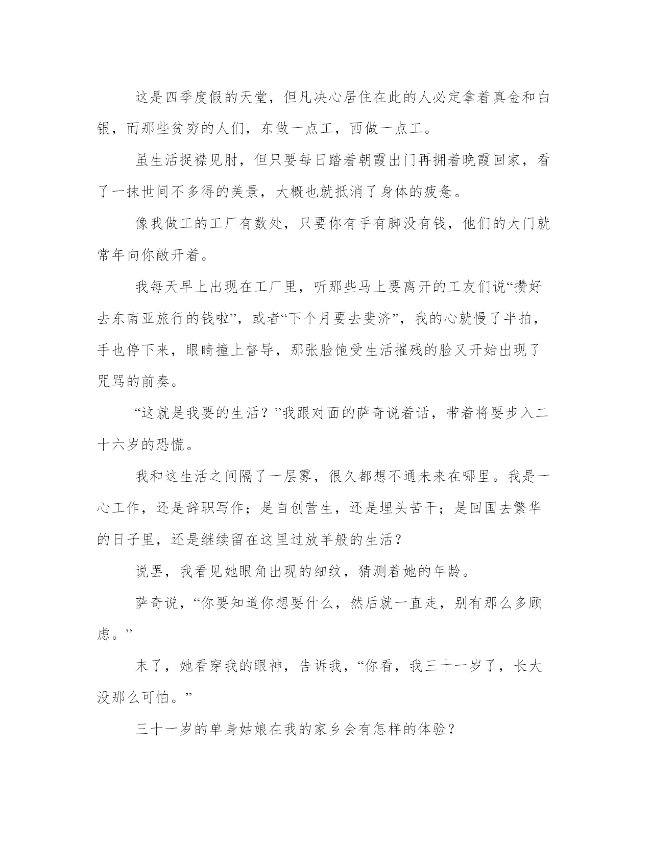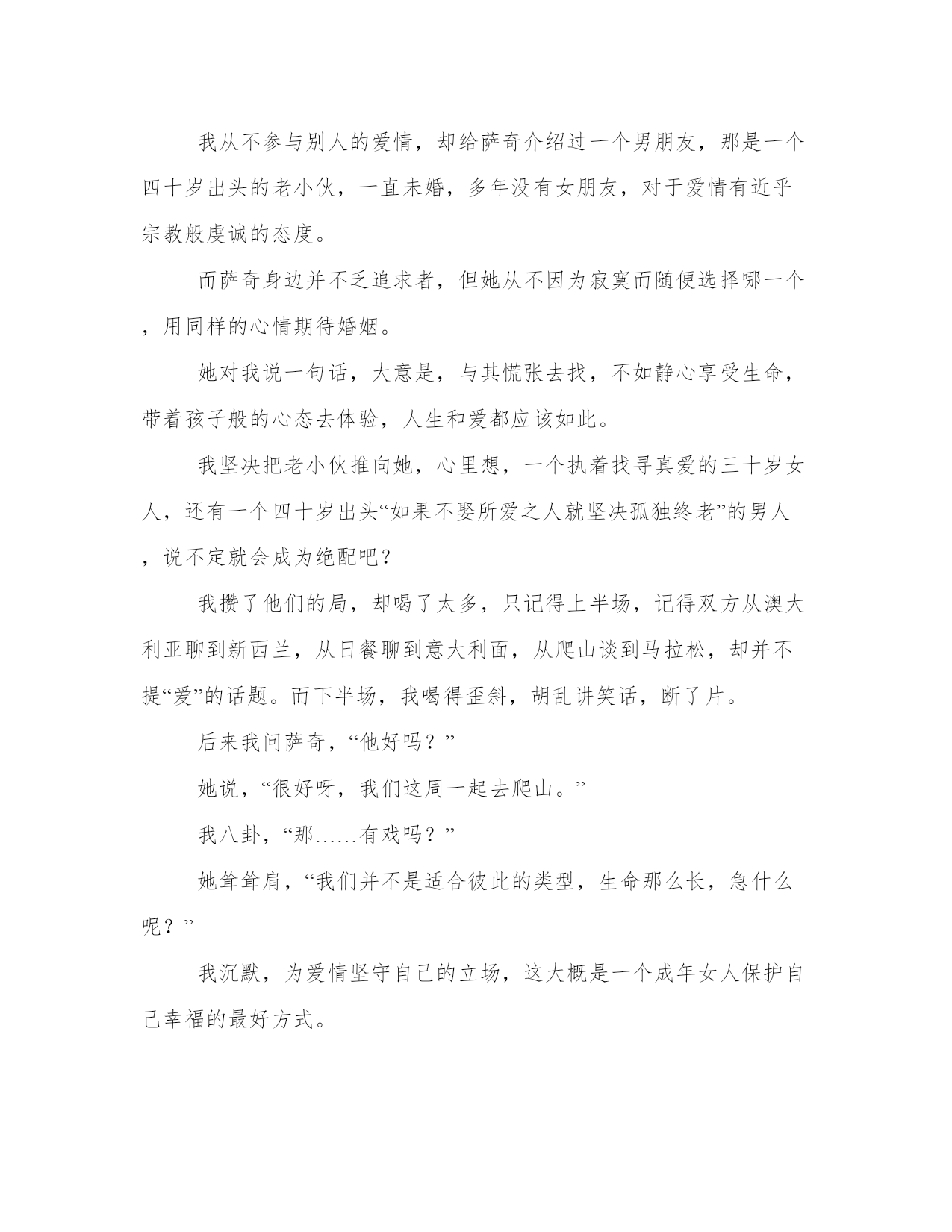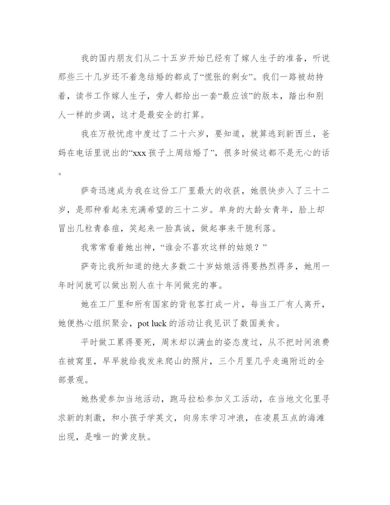 32岁不结婚的女人会怎样?【www.sxqingyun.com--经典说说】和她相识在工厂的流水线上,整家工厂都是背包客的聚集地,他们从巴西,韩国,阿根廷,马来西亚等遥远的国家来,到这里赚旅费,交朋友,谈恋爱,做足一两个月的工便离开,并不做什么用心的停留。然而我和她不是。她叫萨奇,清瘦,个子高,一头长发,是那种一眼看上去就知道活得干净漂亮的姑娘。几年前从日本漂到澳洲,扔掉做厨师的帽子,在珀斯停留两年整,却偏偏活成了不爱热闹的人。那之后她来到新西兰,爱上了这里的纯净和安逸。她和我讲自己过去的历史,而后感慨,“真想留在这里,一辈子哪也不去。”我在她对面的流水线打包,哈欠连天地回复着,“是啊,就是赚起钱来太费力了!”流水线督导经过我,戳了戳我的腰,告诉我“快点做工,不要这么多话。”那是我刚刚搬到陶朗加时的状态,顶着各方压力逃出了奥克兰,想迅速建立生活,从哪里开始都可以。陶朗加一向以“十纽币陶朗加”著称,一直以来挑战着全国最低工资的底线,而人们从不抗议,是因为这里依山傍海,气候宜人,常常在临近城市狂风暴雨时,偏偏这里阳光明媚,像是暴风之眼。这是四季度假的天堂,但凡决心居住在此的人必定拿着真金和白银,而那些贫穷的人们,东做一点工,西做一点工。虽生活捉襟见肘,但只要每日踏着朝霞出门再拥着晚霞回家,看了一抹世间不多得的美景,大概也就抵消了身体的疲惫。像我做工的工厂有数处,只要你有手有脚没有钱,他们的大门就常年向你敞开着。我每天早上出现在工厂里,听那些马上要离开的工友们说“攒好去东南亚旅行的钱啦”,或者“下个月要去斐济”,我的心就慢了半拍,手也停下来,眼睛撞上督导,那张脸饱受生活摧残的脸又开始出现了咒骂的前奏。“这就是我要的生活?”我跟对面的萨奇说着话,带着将要步入二十六岁的恐慌。我和这生活之间隔了一层雾,很久都想不通未来在哪里。我是一心工作,还是辞职写作;是自创营生,还是埋头苦干;是回国去繁华的日子里,还是继续留在这里过放羊般的生活?说罢,我看见她眼角出现的细纹,猜测着她的年龄。萨奇说,“你要知道你想要什么,然后就一直走,别有那么多顾虑。”末了,她看穿我的眼神,告诉我,“你看,我三十一岁了,长大没那么可怕。”三十一岁的单身姑娘在我的家乡会有怎样的体验?我的国内朋友们从二十五岁开始已经有了嫁人生子的准备,听说那些三十几岁还不着急结婚的都成了“慌张的剩女”。我们一路被劫持着,读书工作嫁人生子,旁人都给出一套“最应该”的版本,踏出和别人一样的步调,这才是最安全的打算。我在万般忧虑中度过了二十六岁,要知道,就算逃到新西兰,爸妈在电话里说出的“xxx孩子上周结婚了”,很多时候这都不是无心的话。萨奇迅速成为我在这份工厂里最大的收获,她很快步入了三十二岁,是那种看起来充满希望的三十二岁。单身的大龄女青年,脸上却冒出几粒青春痘,笑起来一脸真诚,做起事来干脆利落。我常常看着她出神,“谁会不喜欢这样的姑娘?”萨奇比我所知道的绝大多数二十岁姑娘活得要热烈得多,她用一年时间就可以做出别人在十年间做完的事。她在工厂里和所有国家的背包客打成一片,每当工厂有人离开,她便热心组织聚会,potluck的活动让我见识了数国美食。平时做工累得要死,周末却以满血的姿态度过,从不把时间浪费在被窝里,早早就给我发来爬山的照片,三个月里几乎走遍附近的全部景观。她热爱参加当地活动,跑马拉松参加义工活动,在当地文化里寻求新的刺激,和小孩子学英文,向房东学习冲浪,在凌晨五点的海滩出现,是唯一的黄皮肤。她努力赚钱,从工厂离开后尝试数份工作,终于得以停留在新西兰。她每年为自己安排一次旅行,去年一个人停留在墨西哥,潜水,见朋友,品尝美食,在街头遇见来自美国的帅哥,有了一次三十岁之后高品质的艳遇。见多了三十岁之后骤胖又堕落的女人,怕死了变老变丑,但突然有这么一个精瘦又热烈的女人站在我面前,让我预想出了自己生命中即将会来的美好。我在她的生活里,重活了对自己的期待。我粗鲁地问她,“日本真好,三十岁不结婚都不会有压力。”她瞪大眼睛,“怎么不会?爸妈也会担忧,社会也有约束,但这件事关乎你自己,你首先要对自己认真,对不对?”那时读到铁凝50岁时才结婚,铁凝在接受采访时说:“自己从骨子里还是一个相对传统的人,对婚姻的期待比较高,也才总觉得自己没有准备好。我宁愿没有,也不要一个凑合的婚姻。婚姻跟人的好坏没关系,好人非常多,但他不适合你,可能你也不适合他,这就是情感的难处。”我一字一句翻译给萨奇,“是这样的心情吗?”她点点头,“差不多,我不是不需要爱情,我只是在等一个正确的开始。”二十五岁之后,对待爱情的态度,大概就是对待人生的态度。我从不参与别人的爱情,却给萨奇介绍过一个男朋友,那是一个四十岁出头的老小伙,一直未婚,多年没有女朋友,对于爱情有近乎宗教般虔诚的态度。而萨奇身边并不乏追求者,但她从不因为寂寞而随便选择