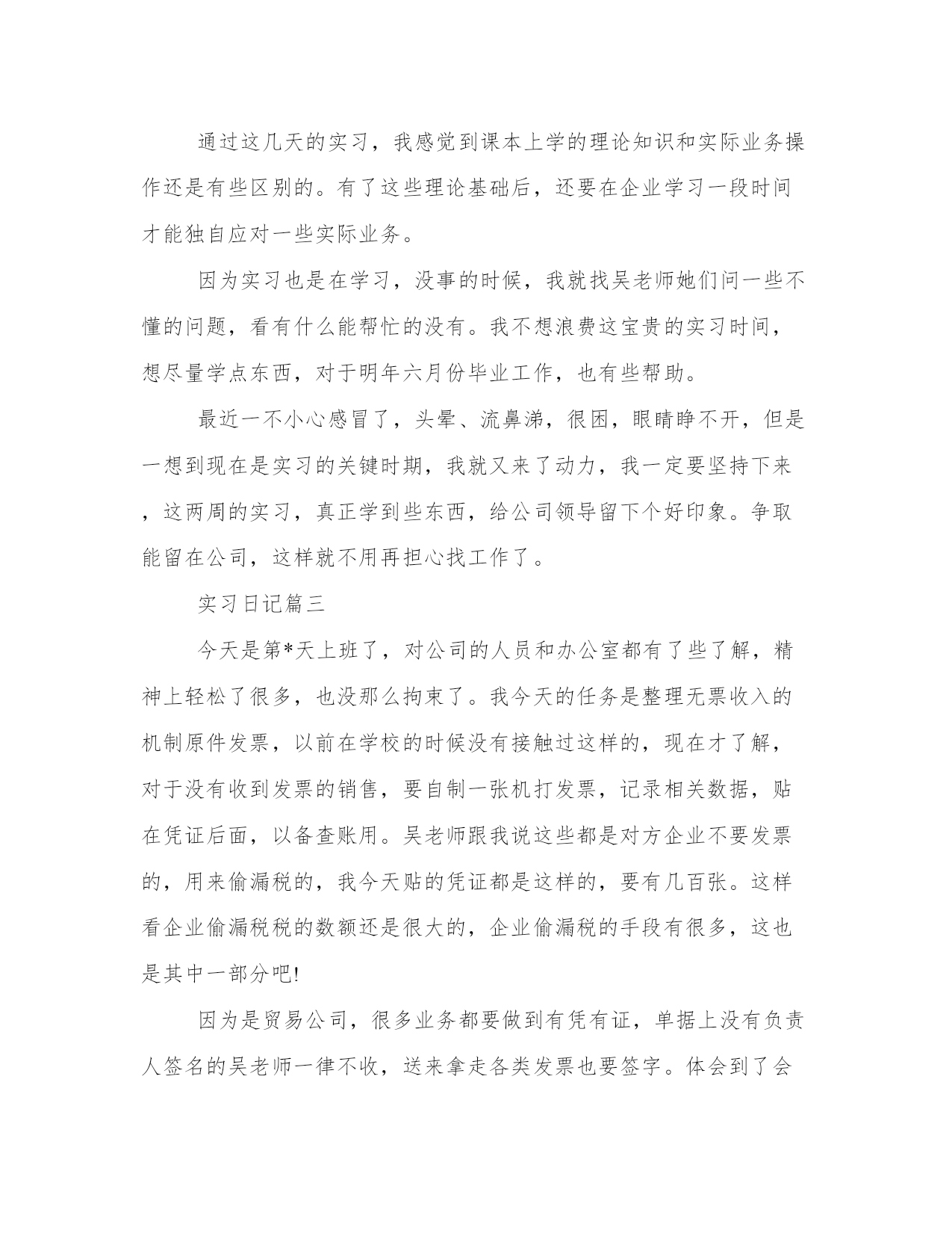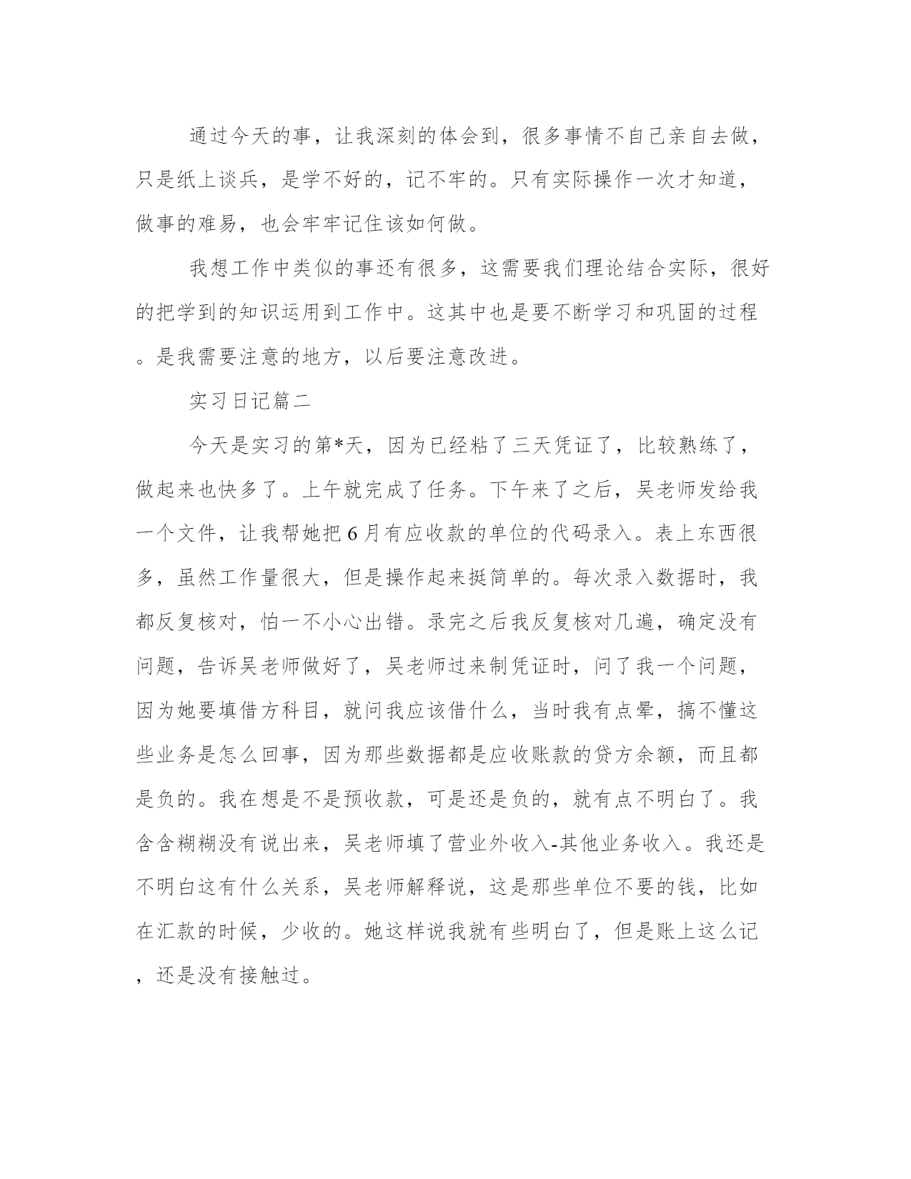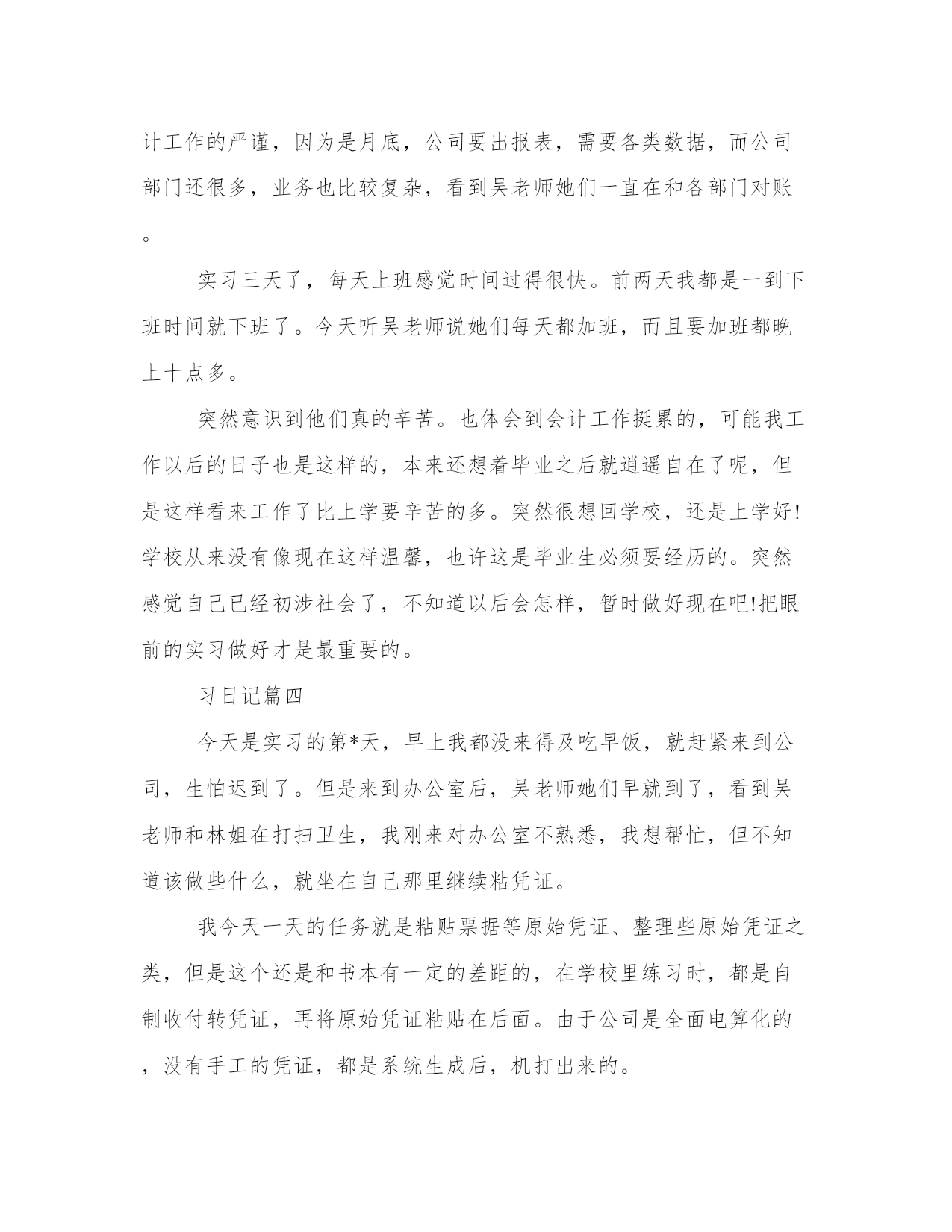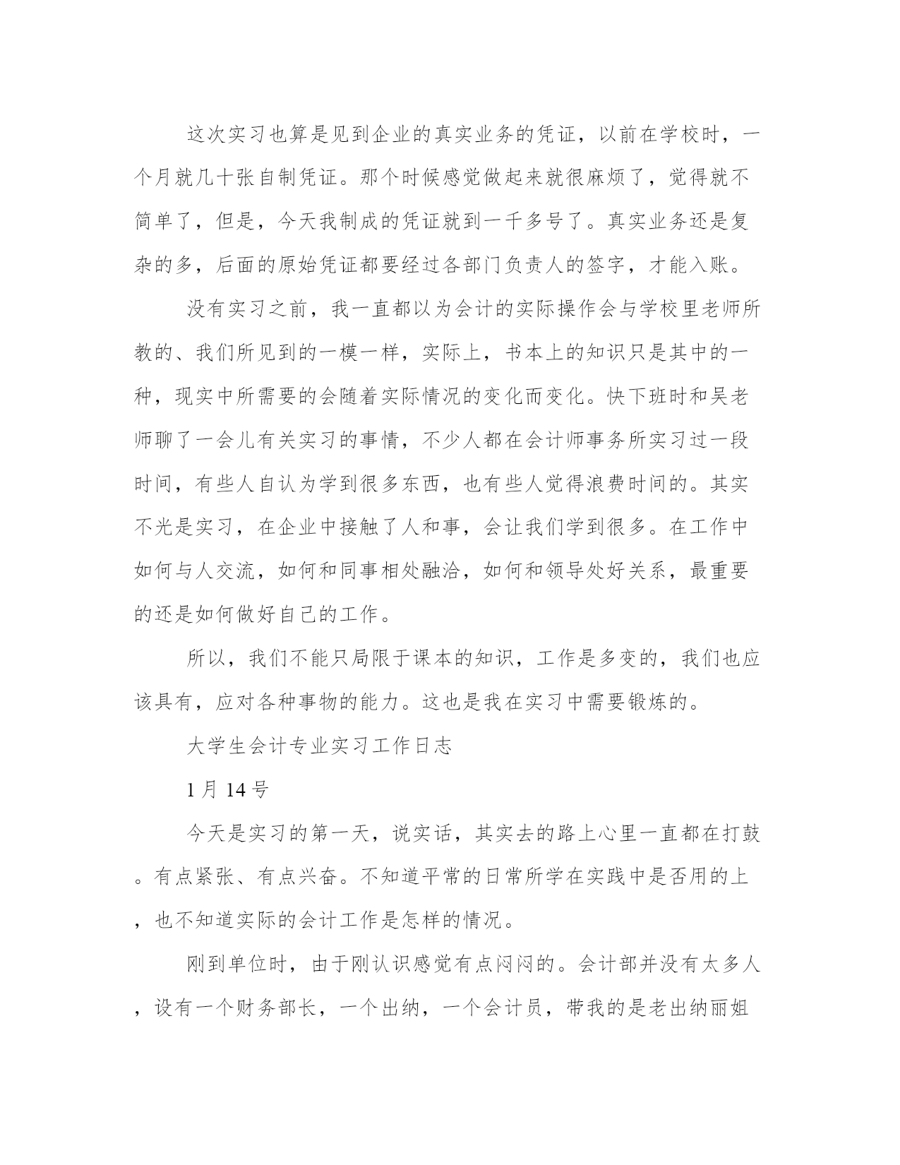 大学生会计专业实习工作日志会计工作人员是进行会计工作的人员,有会计主管,会计监督和核算,财产管理,出纳等人员。以下是我能网小编为大家带来的关于大学生会计专业实习工作日志,以供大家参考!大学生会计专业实习工作日志今天是实习的第*天,给我安排的任务是装订记账凭证,把打印好的记账凭证和原始凭证,汇总表按照时间顺序放好,每一天的记账凭证下面都放一张当天的原始凭证汇总表,因为记账凭证式打印出来的,两张纸刚好一般大,所以放在一起也非常整齐。装订记账凭证时,可以先用打眼机打三个眼,然后用棉线穿起来。这穿线也是有学问的,用曲别针扭一个穿线针,把线双这从中间带过去,再分别从两边的眼中穿出来,与中间预留的双线汇合,打成结,正好可以把结压入中间的眼中,从外观上看,平平的,根本看不出打结的痕迹。再贴上凭证封面,非常整齐好看。这些都是做会计的基本功,只有亲自作了以后才会知道其中的奥妙。下午吴老师将以前的转账凭证让我看,复习会计科目,不了解的明细科目就问,了解大概的会计科目有哪些。巩固了一下自己的会计基础知识通过今天的事,让我深刻的体会到,很多事情不自己亲自去做,只是纸上谈兵,是学不好的,记不牢的。只有实际操作一次才知道,做事的难易,也会牢牢记住该如何做。我想工作中类似的事还有很多,这需要我们理论结合实际,很好的把学到的知识运用到工作中。这其中也是要不断学习和巩固的过程。是我需要注意的地方,以后要注意改进。实习日记篇二今天是实习的第*天,因为已经粘了三天凭证了,比较熟练了,做起来也快多了。上午就完成了任务。下午来了之后,吴老师发给我一个文件,让我帮她把6月有应收款的单位的代码录入。表上东西很多,虽然工作量很大,但是操作起来挺简单的。每次录入数据时,我都反复核对,怕一不小心出错。录完之后我反复核对几遍,确定没有问题,告诉吴老师做好了,吴老师过来制凭证时,问了我一个问题,因为她要填借方科目,就问我应该借什么,当时我有点晕,搞不懂这些业务是怎么回事,因为那些数据都是应收账款的贷方余额,而且都是负的。我在想是不是预收款,可是还是负的,就有点不明白了。我含含糊糊没有说出来,吴老师填了营业外收入-其他业务收入。我还是不明白这有什么关系,吴老师解释说,这是那些单位不要的钱,比如在汇款的时候,少收的。她这样说我就有些明白了,但是账上这么记,还是没有接触过。通过这几天的实习,我感觉到课本上学的理论知识和实际业务操作还是有些区别的。有了这些理论基础后,还要在企业学习一段时间才能独自应对一些实际业务。因为实习也是在学习,没事的时候,我就找吴老师她们问一些不懂的问题,看有什么能帮忙的没有。我不想浪费这宝贵的实习时间,想尽量学点东西,对于明年六月份毕业工作,也有些帮助。最近一不小心感冒了,头晕、流鼻涕,很困,眼睛睁不开,但是一想到现在是实习的关键时期,我就又来了动力,我一定要坚持下来,这两周的实习,真正学到些东西,给公司领导留下个好印象。争取能留在公司,这样就不用再担心找工作了。实习日记篇三今天是第*天上班了,对公司的人员和办公室都有了些了解,精神上轻松了很多,也没那么拘束了。我今天的任务是整理无票收入的机制原件发票,以前在学校的时候没有接触过这样的,现在才了解,对于没有收到发票的销售,要自制一张机打发票,记录相关数据,贴在凭证后面,以备查账用。吴老师跟我说这些都是对方企业不要发票的,用来偷漏税的,我今天贴的凭证都是这样的,要有几百张。这样看企业偷漏税税的数额还是很大的,企业偷漏税的手段有很多,这也是其中一部分吧!因为是贸易公司,很多业务都要做到有凭有证,单据上没有负责人签名的吴老师一律不收,送来拿走各类发票也要签字。体会到了会计工作的严谨,因为是月底,公司要出报表,需要各类数据,而公司部门还很多,业务也比较复杂,看到吴老师她们一直在和各部门对账。实习三天了,每天上班感觉时间过得很快。前两天我都是一到下班时间就下班了。今天听吴老师说她们每天都加班,而且要加班都晚上十点多。突然意识到他们真的辛苦。也体会到会计工作挺累的,可能我工作以后的日子也是这样的,本来还想着毕业之后就逍遥自在了呢,但是这样看来工作了比上学要辛苦的多。突然很想回学校,还是上学好!学校从来没有像现在这样温馨,也许这是毕业生必须要经历的。突然感觉自己已经初涉社会了,不知道以后会怎样,暂时做好现在吧!把眼前的实习做好才是最重要的。习日记篇四今天是实习的第*天,早上我都没来得及吃早饭,就赶紧来到公司,生怕迟到了。但是来到办公室后,吴老师她们早就到了,看到吴老师和林姐在打扫卫生,我刚来对办公室不熟悉,我想帮忙,但不知道该做些什么,就坐在自己那里继续粘凭证。我今天一天的任务就是粘贴票据等原始凭证、整理些原始凭证之类,但是这个还是和书本有一定的差距的,在学校里练习时,都是自制收付转凭证,再将原始凭证粘贴在后面。由于公司是全面电