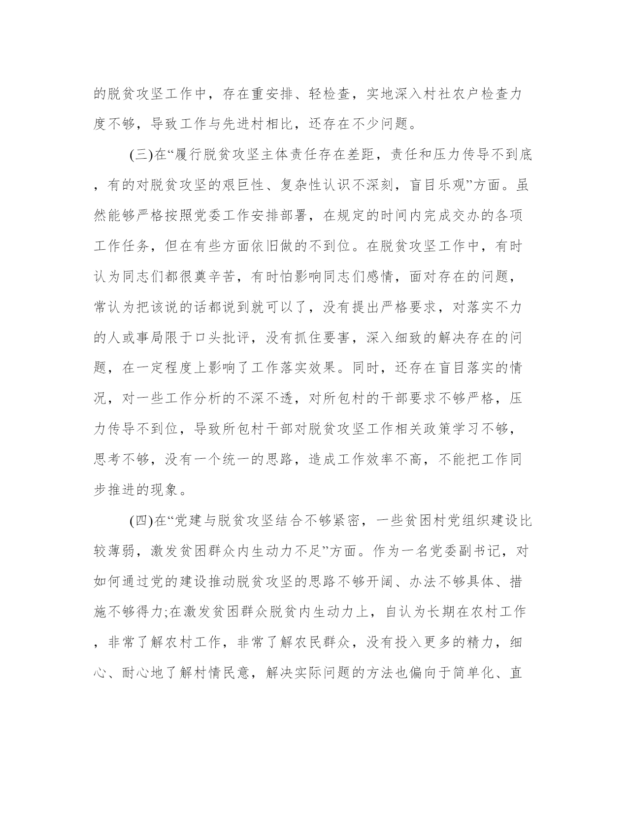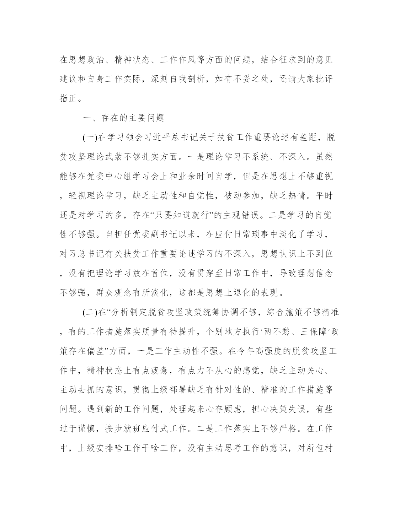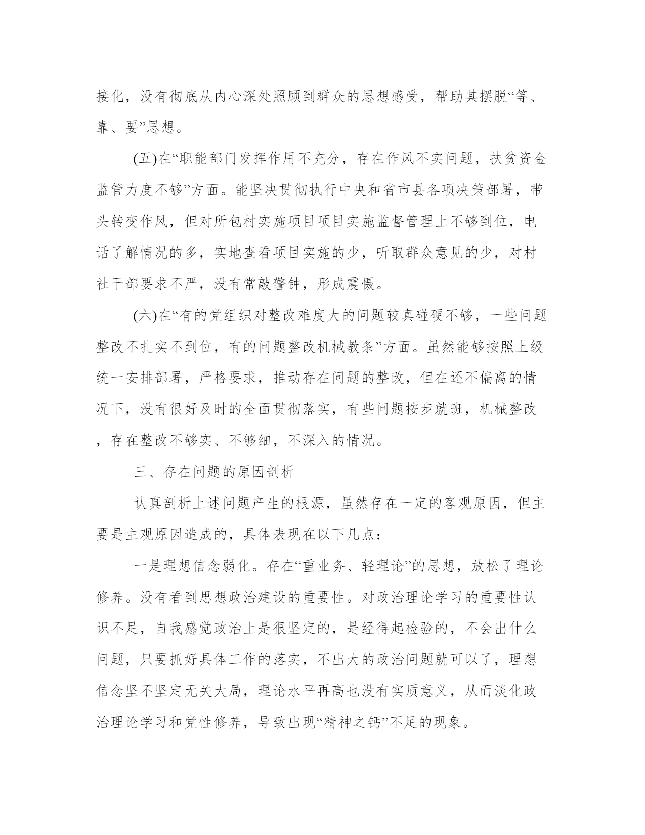 年脱贫攻坚专项巡视整改考核专题民主(组织)生活会个人对照检查材料(2篇)中国共产党中央政治局会议释放减贫新信号——坚决打赢脱贫攻坚战。以下是我能网小编为大家带来的关于2020年脱贫攻坚专项巡视整改考核专题民主(组织)生活会个人对照检查材料(2篇),以供大家参考!2020年脱贫攻坚专项巡视整改考核专题民主(组织)生活会个人对照检查材料(2篇)按照此次民主生活会要求,这次民主生活会的主题是:深入学习习近平新时代中国特色社会主义思想和党的十九大精神,深刻领会习近平总书记关于扶贫工作重要论述,认真贯彻落实习近平总书记视察甘肃重要讲话和“八个着力”重要指示以及习近平总书记在中央政治局听取脱贫攻坚专项巡视汇报时的讲话精神,全面对照中央第一巡视组对甘肃开展脱贫攻坚专项巡视反馈意见的中央巡视工作领导小组办公室主任王鸿津讲话要求,增强“四个意识”,坚定“四个自信”,提高政治站位、强化政治担当。结合这一主题,积极参加镇党委关于“习近平新时代中国特色社会主义思想和党的十九大精神,习近平总书记关于扶贫工作重要论述,认真贯彻落实习近平总书记视察甘肃重要讲话和“八个着力”重要讲话精神以及习近平总书记参加十三届全国人大二次会议甘肃代表团审议时的重要讲话”等精神学习,同时自觉对照重点查找了在思想政治、精神状态、工作作风等方面的问题,结合征求到的意见建议和自身工作实际,深刻自我剖析,如有不妥之处,还请大家批评指正。一、存在的主要问题(一)在学习领会习近平总书记关于扶贫工作重要论述有差距,脱贫攻坚理论武装不够扎实方面。一是理论学习不系统、不深入。虽然能够在党委中心组学习会上和业余时间自学,但是在思想上不够重视,轻视理论学习,缺乏主动性和自觉性,被动参加,缺乏热情。平时还是对学习的多,存在“只要知道就行”的主观错误。二是学习的自觉性不够强。自担任党委副书记以来,在应付日常琐事中淡化了学习,对习总书记有关扶贫工作重要论述学习的不深入,思想认识上不到位,没有把理论学习放在首位,没有贯穿至日常工作中,导致理想信念不够强,群众观念有所淡化,这都是思想上退化的表现。(二)在“分析制定脱贫攻坚政策统筹协调不够,综合施策不够精准,有的工作措施落实质量有待提升,个别地方执行‘两不愁、三保障’政策存在偏差”方面,一是工作主动性不强。在今年高强度的脱贫攻坚工作中,精神状态上有点疲惫,有点力不从心的感觉,缺乏主动关心、主动去抓的意识,贯彻上级部署缺乏有针对性的、精准的工作措施等问题。遇到新的工作问题,处理起来心存顾虑,担心决策失误,有些过于谨慎,按步就班应付式工作。二是工作落实上不够严格。在工作中,上级安排啥工作干啥工作,没有主动思考工作的意识,对所包村的脱贫攻坚工作中,存在重安排、轻检查,实地深入村社农户检查力度不够,导致工作与先进村相比,还存在不少问题。(三)在“履行脱贫攻坚主体责任存在差距,责任和压力传导不到底,有的对脱贫攻坚的艰巨性、复杂性认识不深刻,盲目乐观”方面。虽然能够严格按照党委工作安排部署,在规定的时间内完成交办的各项工作任务,但在有些方面依旧做的不到位。在脱贫攻坚工作中,有时认为同志们都很奠辛苦,有时怕影响同志们感情,面对存在的问题,常认为把该说的话都说到就可以了,没有提出严格要求,对落实不力的人或事局限于口头批评,没有抓住要害,深入细致的解决存在的问题,在一定程度上影响了工作落实效果。同时,还存在盲目落实的情况,对一些工作分析的不深不透,对所包村的干部要求不够严格,压力传导不到位,导致所包村干部对脱贫攻坚工作相关政策学习不够,思考不够,没有一个统一的思路,造成工作效率不高,不能把工作同步推进的现象。(四)在“党建与脱贫攻坚结合不够紧密,一些贫困村党组织建设比较薄弱,激发贫困群众内生动力不足”方面。作为一名党委副书记,对如何通过党的建设推动脱贫攻坚的思路不够开阔、办法不够具体、措施不够得力;在激发贫困群众脱贫内生动力上,自认为长期在农村工作,非常了解农村工作,非常了解农民群众,没有投入更多的精力,细心、耐心地了解村情民意,解决实际问题的方法也偏向于简单化、直接化,没有彻底从内心深处照顾到群众的思想感受,帮助其摆脱“等、靠、要”思想。(五)在“职能部门发挥作用不充分,存在作风不实问题,扶贫资金监管力度不够”方面。能坚决贯彻执行中央和省市县各项决策部署,带头转变作风,但对所包村实施项目项目实施监督管理上不够到位,电话了解情况的多,实地查看项目实施的少,听取群众意见的少,对村社干部要求不严,没有常敲警钟,形成震慑。(六)在“有的党组织对整改难度大的问题较真碰硬不够,一些问题整改不扎实不到位,有的问题整改机械教条”方面。虽然能够按照上级统一安排部署,严格要求,推动存在问题的整改,但在还不偏离的情况下,没有很好及时的全面贯彻落实,有些问题按步就班,机械整改,存在整改不够实、不