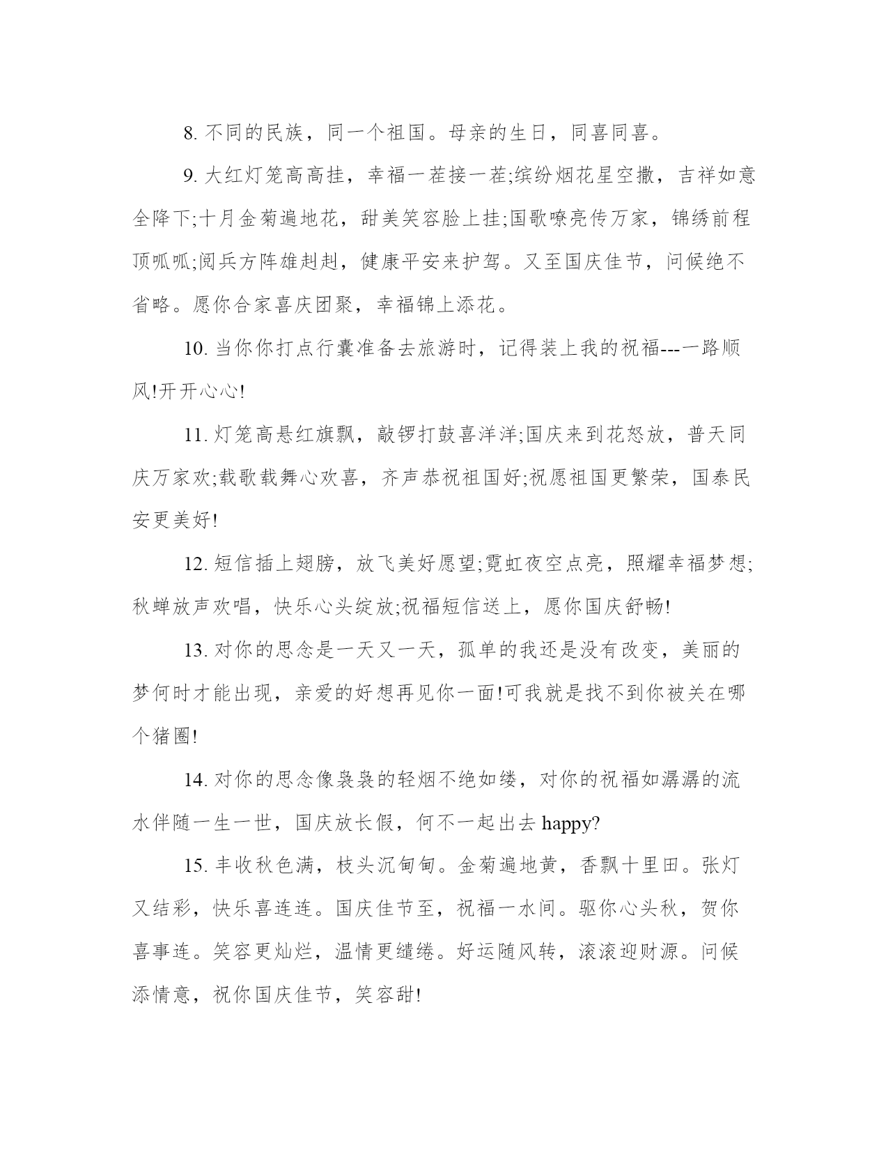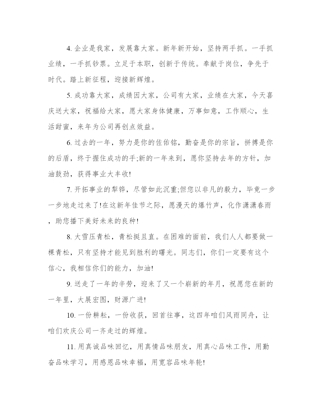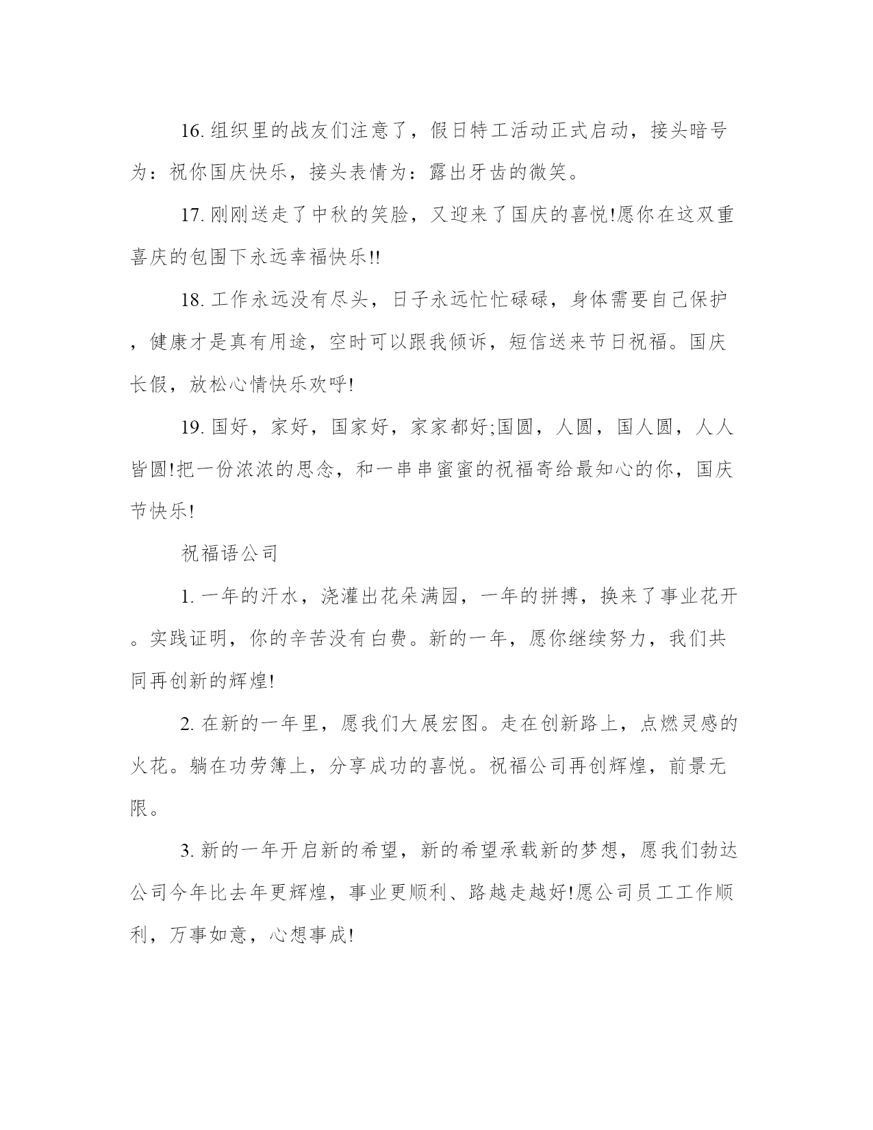 祝福语公司祝福语是指对人们的美好祝福的语句。本站精心为大家整理了祝福语公司,希望对你有帮助。祝福语公司1.祝福您:国庆、家庆、普天同庆,官源、财源、左右逢源,人缘、福缘、缘缘不断,情愿、心愿、愿愿随心。2.“我爱北京天安门,天安门上太阳升,伟大领袖,指引我们向前进”,唱起熟悉的儿歌,祝祖国生日快乐,也祝你节日快乐!3.走遍祖国最想母亲,走遍世界最想祖国。不同的民族,同一个祖国。母亲的生日,同喜同喜。祝福你在这个和平幸福的年代里节日快乐!4.把握时令,创造时运;成龙成凤,要有自信;态度端正,不要卖命;身体要紧,不要生病;好吃好玩,欢度国庆!5.把这满街飞舞的彩带,化作关切,遥寄给你。但愿我们间的关切,不再是国庆佳节来临的时刻。6.编辑我的祝福万语千言,发送我的问候到你的心田,删除你的痛苦到天边,回收我的回忆保存到永远,爱你不用蜜语甜言!国庆节快乐!7.不论潮涨潮落,让壮观永驻心间;不论钱多钱少,让快乐永驻心间;不论联系是多是少,让祝福永驻心间!祝国庆节快乐!8.不同的民族,同一个祖国。母亲的生日,同喜同喜。9.大红灯笼高高挂,幸福一茬接一茬;缤纷烟花星空撒,吉祥如意全降下;十月金菊遍地花,甜美笑容脸上挂;国歌嘹亮传万家,锦绣前程顶呱呱;阅兵方阵雄赳赳,健康平安来护驾。又至国庆佳节,问候绝不省略。愿你合家喜庆团聚,幸福锦上添花。10.当你你打点行囊准备去旅游时,记得装上我的祝福---一路顺风!开开心心!11.灯笼高悬红旗飘,敲锣打鼓喜洋洋;国庆来到花怒放,普天同庆万家欢;载歌载舞心欢喜,齐声恭祝祖国好;祝愿祖国更繁荣,国泰民安更美好!12.短信插上翅膀,放飞美好愿望;霓虹夜空点亮,照耀幸福梦想;秋蝉放声欢唱,快乐心头绽放;祝福短信送上,愿你国庆舒畅!13.对你的思念是一天又一天,孤单的我还是没有改变,美丽的梦何时才能出现,亲爱的好想再见你一面!可我就是找不到你被关在哪个猪圈!14.对你的思念像袅袅的轻烟不绝如缕,对你的祝福如潺潺的流水伴随一生一世,国庆放长假,何不一起出去happy?15.丰收秋色满,枝头沉甸甸。金菊遍地黄,香飘十里田。张灯又结彩,快乐喜连连。国庆佳节至,祝福一水间。驱你心头秋,贺你喜事连。笑容更灿烂,温情更缱绻。好运随风转,滚滚迎财源。问候添情意,祝你国庆佳节,笑容甜!16.组织里的战友们注意了,假日特工活动正式启动,接头暗号为:祝你国庆快乐,接头表情为:露出牙齿的微笑。17.刚刚送走了中秋的笑脸,又迎来了国庆的喜悦!愿你在这双重喜庆的包围下永远幸福快乐!!18.工作永远没有尽头,日子永远忙忙碌碌,身体需要自己保护,健康才是真有用途,空时可以跟我倾诉,短信送来节日祝福。国庆长假,放松心情快乐欢呼!19.国好,家好,国家好,家家都好;国圆,人圆,国人圆,人人皆圆!把一份浓浓的思念,和一串串蜜蜜的祝福寄给最知心的你,国庆节快乐!祝福语公司1.一年的汗水,浇灌出花朵满园,一年的拼搏,换来了事业花开。实践证明,你的辛苦没有白费。新的一年,愿你继续努力,我们共同再创新的辉煌!2.在新的一年里,愿我们大展宏图。走在创新路上,点燃灵感的火花。躺在功劳簿上,分享成功的喜悦。祝福公司再创辉煌,前景无限。3.新的一年开启新的希望,新的希望承载新的梦想,愿我们勃达公司今年比去年更辉煌,事业更顺利、路越走越好!愿公司员工工作顺利,万事如意,心想事成!4.企业是我家,发展靠大家。新年新开始,坚持两手抓。一手抓业绩,一手抓钞票。立足于本职,创新于传统。奉献于岗位,争先于时代。踏上新征程,迎接新辉煌。5.成功靠大家,成绩因大家,公司有大家,业绩在大家,今天喜庆送大家,祝福给大家,愿大家身体健康,万事如意,工作顺心,生活甜蜜,来年为公司再创点效益。6.过去的一年,努力是你的佐佑铭,勤奋是你的宗旨,拼搏是你的后盾,终于握住成功的手;新的一年来到,愿你坚持去年的方针,加油鼓劲,获得事业大丰收!7.开拓事业的犁铧,尽管如此沉重;但您以非凡的毅力,毕竟一步一步地走过来了!在这新年佳节之际,愿漫天的爆竹声,化作潇潇春雨,助您播下美好未来的良种!8.大雪压青松,青松挺且直。在困难的面前,我们人人都要做一棵青松,只有坚持才能见到胜利的曙光。同志们,你们一定要有这个信心,我相信你们的能力,加油!9.送走了一年的辛劳,迎来了又一个崭新的年月,祝愿您在新的一年里,大展宏图,财源广进!10.一份耕耘,一份收获,回首往事,这四年咱们风雨同舟,让咱们欢庆公司一齐走过的辉煌。11.用真诚品味回忆,用真情品味朋友,用真心品味工作,用勤奋品味学习,用感恩品味幸福,用宽容品味年轮!12.火红的事业财源广进,温馨的祝愿繁荣昌隆,美好的祝福送上来,愿您在收到我的短信后,事业顺利,公司兴旺。13.您永远微笑着,微笑着,您是一朵微笑的花,在四季里开放,永不凋谢。祝愿您的事业在微笑中愈展
