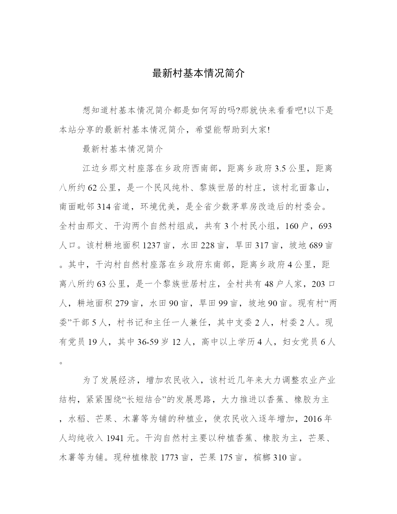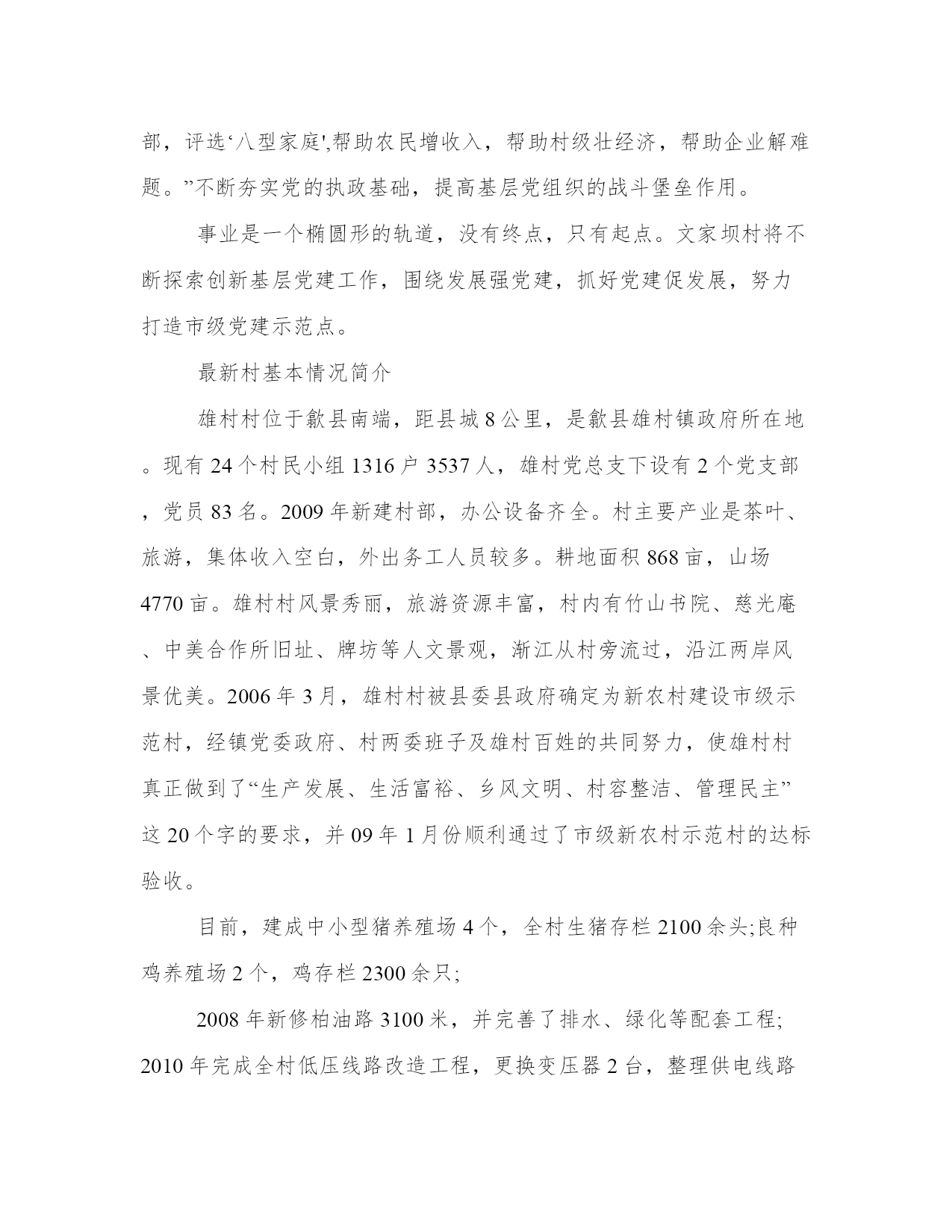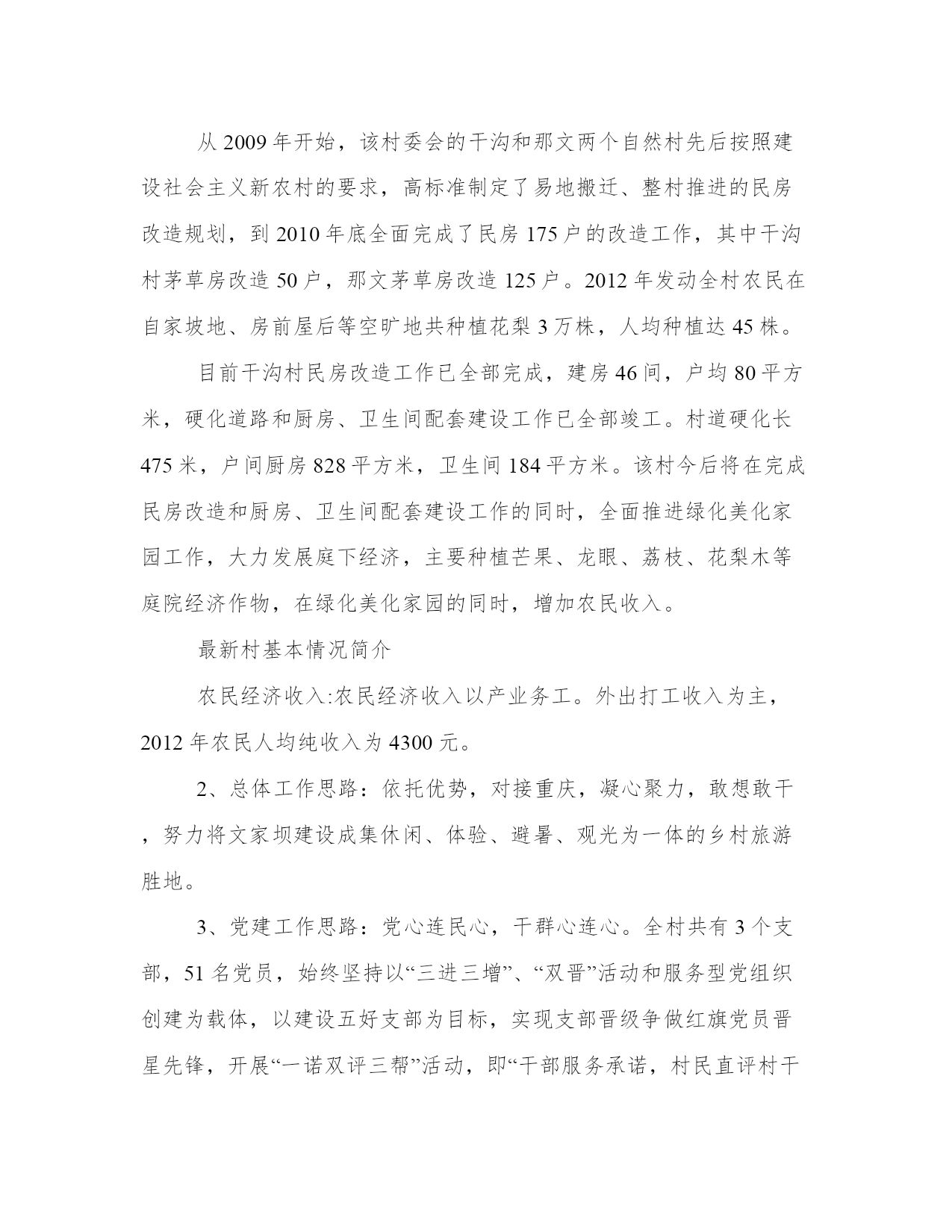最新村基本情况简介想知道村基本情况简介都是如何写的吗?那就快来看看吧!以下是本站分享的最新村基本情况简介,希望能帮助到大家!最新村基本情况简介江边乡那文村座落在乡政府西南部,距离乡政府3.5公里,距离八所约62公里,是一个民风纯朴、黎族世居的村庄,该村北面靠山,南面毗邻314省道,环境优美,是全省少数茅草房改造后的村委会。全村由那文、干沟两个自然村组成,共有3个村民小组,160户,693人口。该村耕地面积1237亩,水田228亩,旱田317亩,坡地689亩。其中,干沟村自然村座落在乡政府东南部,距离乡政府4公里,距离八所约63公里,是一个黎族世居村庄,全村共有48户人家,203口人,耕地面积279亩,水田90亩,旱田99亩,坡地90亩。现有村“两委”干部5人,村书记和主任一人兼任,其中支委2人,村委2人。现有党员19人,其中36-59岁12人,高中以上学历4人,妇女党员6人。为了发展经济,增加农民收入,该村近几年来大力调整农业产业结构,紧紧围绕“长短结合”的发展思路,大力推进以香蕉、橡胶为主,水稻、芒果、木薯等为铺的种植业,使农民收入逐年增加,2016年人均纯收入1941元。干沟自然村主要以种植香蕉、橡胶为主,芒果、木薯等为铺。现种植橡胶1773亩,芒果175亩,槟榔310亩。从2009年开始,该村委会的干沟和那文两个自然村先后按照建设社会主义新农村的要求,高标准制定了易地搬迁、整村推进的民房改造规划,到2010年底全面完成了民房175户的改造工作,其中干沟村茅草房改造50户,那文茅草房改造125户。2012年发动全村农民在自家坡地、房前屋后等空旷地共种植花梨3万株,人均种植达45株。目前干沟村民房改造工作已全部完成,建房46间,户均80平方米,硬化道路和厨房、卫生间配套建设工作已全部竣工。村道硬化长475米,户间厨房828平方米,卫生间184平方米。该村今后将在完成民房改造和厨房、卫生间配套建设工作的同时,全面推进绿化美化家园工作,大力发展庭下经济,主要种植芒果、龙眼、荔枝、花梨木等庭院经济作物,在绿化美化家园的同时,增加农民收入。最新村基本情况简介农民经济收入:农民经济收入以产业务工。外出打工收入为主,2012年农民人均纯收入为4300元。2、总体工作思路:依托优势,对接重庆,凝心聚力,敢想敢干,努力将文家坝建设成集休闲、体验、避暑、观光为一体的乡村旅游胜地。3、党建工作思路:党心连民心,干群心连心。全村共有3个支部,51名党员,始终坚持以“三进三增”、“双晋”活动和服务型党组织创建为载体,以建设五好支部为目标,实现支部晋级争做红旗党员晋星先锋,开展“一诺双评三帮”活动,即“干部服务承诺,村民直评村干部,评选‘八型家庭',帮助农民增收入,帮助村级壮经济,帮助企业解难题。”不断夯实党的执政基础,提高基层党组织的战斗堡垒作用。事业是一个椭圆形的轨道,没有终点,只有起点。文家坝村将不断探索创新基层党建工作,围绕发展强党建,抓好党建促发展,努力打造市级党建示范点。最新村基本情况简介雄村村位于歙县南端,距县城8公里,是歙县雄村镇政府所在地。现有24个村民小组1316户3537人,雄村党总支下设有2个党支部,党员83名。2009年新建村部,办公设备齐全。村主要产业是茶叶、旅游,集体收入空白,外出务工人员较多。耕地面积868亩,山场4770亩。雄村村风景秀丽,旅游资源丰富,村内有竹山书院、慈光庵、中美合作所旧址、牌坊等人文景观,渐江从村旁流过,沿江两岸风景优美。2006年3月,雄村村被县委县政府确定为新农村建设市级示范村,经镇党委政府、村两委班子及雄村百姓的共同努力,使雄村村真正做到了“生产发展、生活富裕、乡风文明、村容整洁、管理民主”这20个字的要求,并09年1月份顺利通过了市级新农村示范村的达标验收。目前,建成中小型猪养殖场4个,全村生猪存栏2100余头;良种鸡养殖场2个,鸡存栏2300余只;2008年新修柏油路3100米,并完善了排水、绿化等配套工程;2010年完成全村低压线路改造工程,更换变压器2台,整理供电线路4公里;2008年完成村庄规划修编,使宅基地布局更合理。全村60%的劳力经常外出务工,劳务收入占到农民收入近4成。
