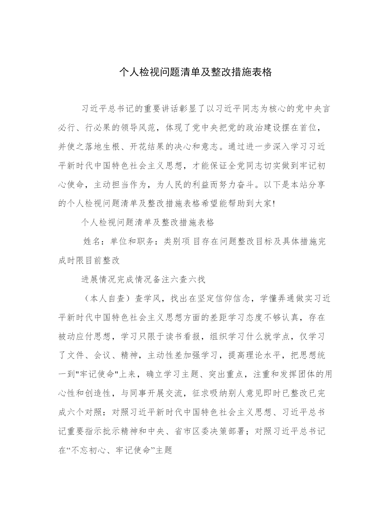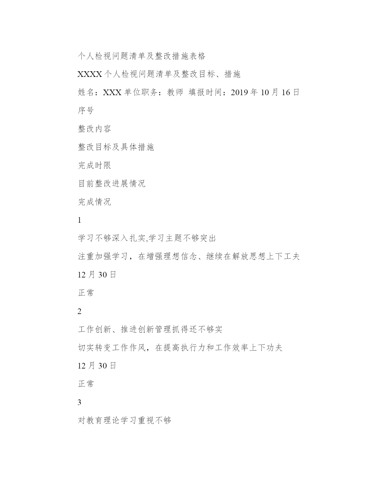 个人检视问题清单及整改措施表格习近平总书记的重要讲话彰显了以习近平同志为核心的党中央言必行、行必果的领导风范,体现了党中央把党的政治建设摆在首位,并使之落地生根、开花结果的决心和意志。通过进一步深入学习习近平新时代中国特色社会主义思想,才能保证全党同志切实做到牢记初心使命,主动担当作为,为人民的利益而努力奋斗。以下是本站分享的个人检视问题清单及整改措施表格希望能帮助到大家!个人检视问题清单及整改措施表格姓名:单位和职务:类别项目存在问题整改目标及具体措施完成时限目前整改进展情况完成情况备注六查六找(本人自查)查学风,找出在坚定信仰信念,学懂弄通做实习近平新时代中国特色社会主义思想方面的差距学习态度不够认真,存在被动应付思想,学习只限于读书看报,组织学习什么就学点,仅学习了文件、会议、精神,主动性差加强学习,提高理论水平,把思想统一到"牢记使命"上来,确立学习主题、突出重点,注重和发挥团体的用心性和创造性,与同事开展交流,征求吸纳别人意见即时已整改已完成六个对照:对照习近平新时代中国特色社会主义思想、习近平总书记重要指示批示精神和中央、省市区委决策部署;对照习近平总书记在“不忘初心、牢记使命”主题工作会议上的重要讲话中指出的突出问题;对照党章党规;对照初心使命;对照人民群众新期待;对照先进典型、身边榜样查党性,找出在对党绝对忠诚,增强“四个意识”、坚定“四个自信”、做到“两个维护”方面的差距大局意识不够强,做事情干工作只从自身业务或主抓业务出发,自己怎么方便怎么干,忽视了自己的“部分”应该服从于街道党委“整体”工作这个大局大局为上,服务至上,牢固树立党的纯洁性,大事大非面前坚定立场,坚决执行民主集中制,认真完成上级传达任务的同时,还要协调其他部门共同完成,时刻把全局的利益放在第一位即时已整改已完成查政绩观,找出在群众观点、群众立场、群众感情、服务群众,践行沂蒙精神,夯实党的执政根基方面的差距群众服务意识不够牢,“从群众中来,到群众中去”路线坚持不好,没深入到群众中,了解他们疾苦、关心他们冷暖,收集他们的需求,对他们的意见、情绪不以为然,理解和支持不够牢固树立服务意识,公仆意识,坚持立足“认识群众、了解群众、服务群众”,想群众之所想,急群众之所急,与群众交心,从他们那里掌握第一手资料,了解他们需求,解决他们的实际困难,真正践行全心全意为人民服务的思想即时已整改已完成查权责观,找出在为党尽责、为民用权、为事业担当,知敬畏、存戒惧、守底线方面的差距缺乏担当精神,不敢大胆得尝试,缺乏攻坚克难的锐气,没有先例的事不敢闯,工作中有等观望的心态注重中央、省、市大政方针,吃透文件精神并结合工作实际,虚心向领导同志们请教,不断提高自己认识问题和处理问题的能力即时已整改已完成查领导方式和工作方法,找出在践行新发展理念,实践实干实效,克服形式主义、官僚主义方面的差距思想不够解放,工作方式陈旧,对新形势下的工作没有深层次的分析,缺乏应有的政治敏锐性和洞察力,了解情况仅凭感觉或自以为是,处理问题方式方法简单,没有创新针对工作中的存在的问题,要解放思想,加大创新力度,增强危机意识,准确把握面临形势和任务,敢于负责,锐意进取,突破中创新,进取中创新,破除一切旧观念四季度正在整改查“对标先进”要求,结合省委“七赛七比”活动,开展以“对外对标一流、比学赶超,对内创先争优、争先进位”为主题的“追赶超越”活动,找出在思想境界、眼界格局、思路本领、能力素质等方面的差距一是思想能力存在着差距,干劲、闯劲、拼劲不足,思想观念还不够解放;二是工作作风上的差距,缺乏创新实干担当,工作效率不高、落实不力等问题。思想大转变,继续把学习贯彻习近平新时代中国特色社会主义思想作为重大政治任务,着力破除束缚发展的守旧思想,向先进同志和先进乡镇对标,以思想的大解放、观念的大更新、作风的大转变,推动各项工作落地落实。四季度正在整改收集问题(上级反馈)12345热线反映集中的问题违建拆除问题、危房修缮重建、道路硬化绿化,违章占道经营、“散乱污”治理等等对新出现的违建,绝不姑息迁就,发现一处,拆除一处;危房修缮重建凡符合政策的积极配合上级部门给予人、财、物以及审批工作的一路通行;道路硬化绿化配合“三年攻坚”任务正在有序推进;占道经营及“散、乱、污”等日夜巡查即时已整改已完成习近平总书记视察山东、视察XX重要指示批示精神不扎实、不到位等问题思想认识、重视程度不到位,忧患意识不强,工作缺乏主动性,危机意识、创新意识不强,工作成绩小富即安,满足应付,缺乏工作热情加强学习培训,提高政治敏锐,促进思想观念更新、转变,适应新时期工作要求,培养开拓创新工作能力四季度正在整改巡视巡察、干部考察、工作考核、督导督察、审计检查等发现的问题对上级的工作考核方案和考核指标学习程度不够,对自己分管的工作存在的问题底数不清