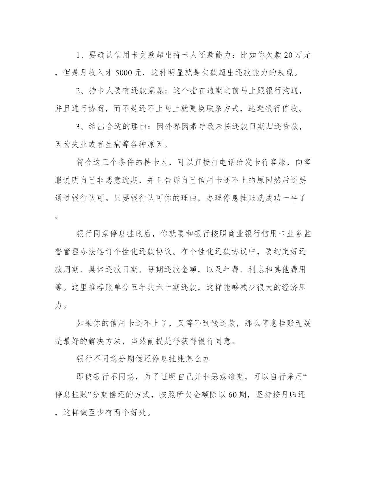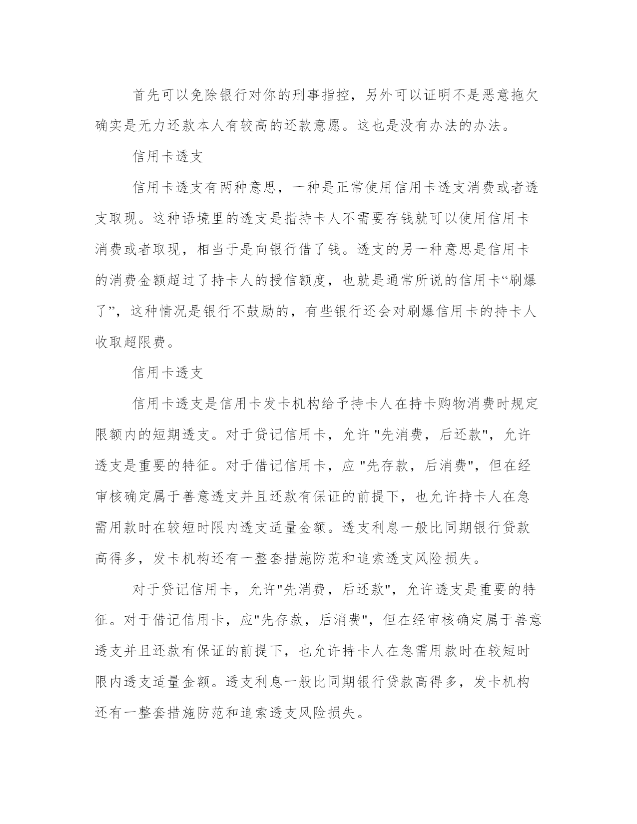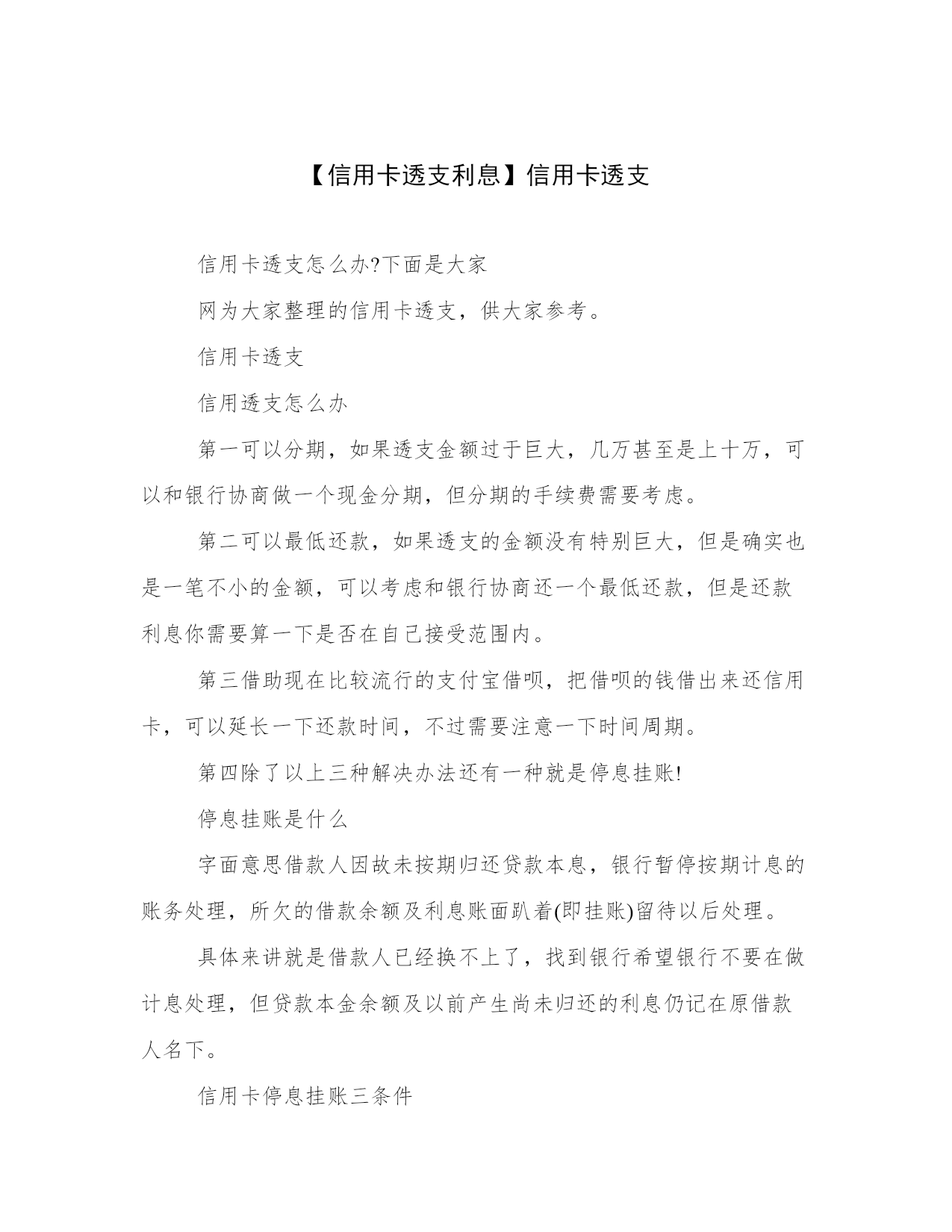 【信用卡透支利息】信用卡透支信用卡透支怎么办?下面是大家网为大家整理的信用卡透支,供大家参考。信用卡透支信用透支怎么办第一可以分期,如果透支金额过于巨大,几万甚至是上十万,可以和银行协商做一个现金分期,但分期的手续费需要考虑。第二可以最低还款,如果透支的金额没有特别巨大,但是确实也是一笔不小的金额,可以考虑和银行协商还一个最低还款,但是还款利息你需要算一下是否在自己接受范围内。第三借助现在比较流行的支付宝借呗,把借呗的钱借出来还信用卡,可以延长一下还款时间,不过需要注意一下时间周期。第四除了以上三种解决办法还有一种就是停息挂账!停息挂账是什么字面意思借款人因故未按期归还贷款本息,银行暂停按期计息的账务处理,所欠的借款余额及利息账面趴着(即挂账)留待以后处理。具体来讲就是借款人已经换不上了,找到银行希望银行不要在做计息处理,但贷款本金余额及以前产生尚未归还的利息仍记在原借款人名下。信用卡停息挂账三条件1、要确认信用卡欠款超出持卡人还款能力:比如你欠款20万元,但是月收入才5000元,这种明显就是欠款超出还款能力的表现。2、持卡人要有还款意愿:这个指在逾期之前马上跟银行沟通,并且进行协商,而不是还不上马上就更换联系方式,逃避银行催收。3、给出合适的理由:因外界因素导致未按还款日期归还贷款,因为失业或者生病等各种原因。符合这三个条件的持卡人,可以直接打电话给发卡行客服,向客服说明自己非恶意逾期,并且告诉自己信用卡还不上的原因然后还要通过银行认可。只要银行认可你的理由,办理停息挂账就成功一半了。银行同意停息挂账后,你就要和银行按照商业银行信用卡业务监督管理办法签订个性化还款协议。在个性化还款协议中,要约定好还款周期、具体还款日期、每期还款金额,以及年费、利息和其他费用等。这里推荐账单分五年共六十期还款,这样能够减少很大的经济压力。如果你的信用卡还不上了,又筹不到钱还款,那么停息挂账无疑是最好的解决方法,当然前提是得获得银行同意。银行不同意分期偿还停息挂账怎么办即使银行不同意,为了证明自己并非恶意逾期,可以自行采用“停息挂账”分期偿还的方式,按照所欠金额除以60期,坚持按月归还,这样做至少有两个好处。首先可以免除银行对你的刑事指控,另外可以证明不是恶意拖欠确实是无力还款本人有较高的还款意愿。这也是没有办法的办法。信用卡透支信用卡透支有两种意思,一种是正常使用信用卡透支消费或者透支取现。这种语境里的透支是指持卡人不需要存钱就可以使用信用卡消费或者取现,相当于是向银行借了钱。透支的另一种意思是信用卡的消费金额超过了持卡人的授信额度,也就是通常所说的信用卡“刷爆了”,这种情况是银行不鼓励的,有些银行还会对刷爆信用卡的持卡人收取超限费。信用卡透支信用卡透支是信用卡发卡机构给予持卡人在持卡购物消费时规定限额内的短期透支。对于贷记信用卡,允许"先消费,后还款",允许透支是重要的特征。对于借记信用卡,应"先存款,后消费",但在经审核确定属于善意透支并且还款有保证的前提下,也允许持卡人在急需用款时在较短时限内透支适量金额。透支利息一般比同期银行贷款高得多,发卡机构还有一整套措施防范和追索透支风险损失。对于贷记信用卡,允许"先消费,后还款",允许透支是重要的特征。对于借记信用卡,应"先存款,后消费",但在经审核确定属于善意透支并且还款有保证的前提下,也允许持卡人在急需用款时在较短时限内透支适量金额。透支利息一般比同期银行贷款高得多,发卡机构还有一整套措施防范和追索透支风险损失。