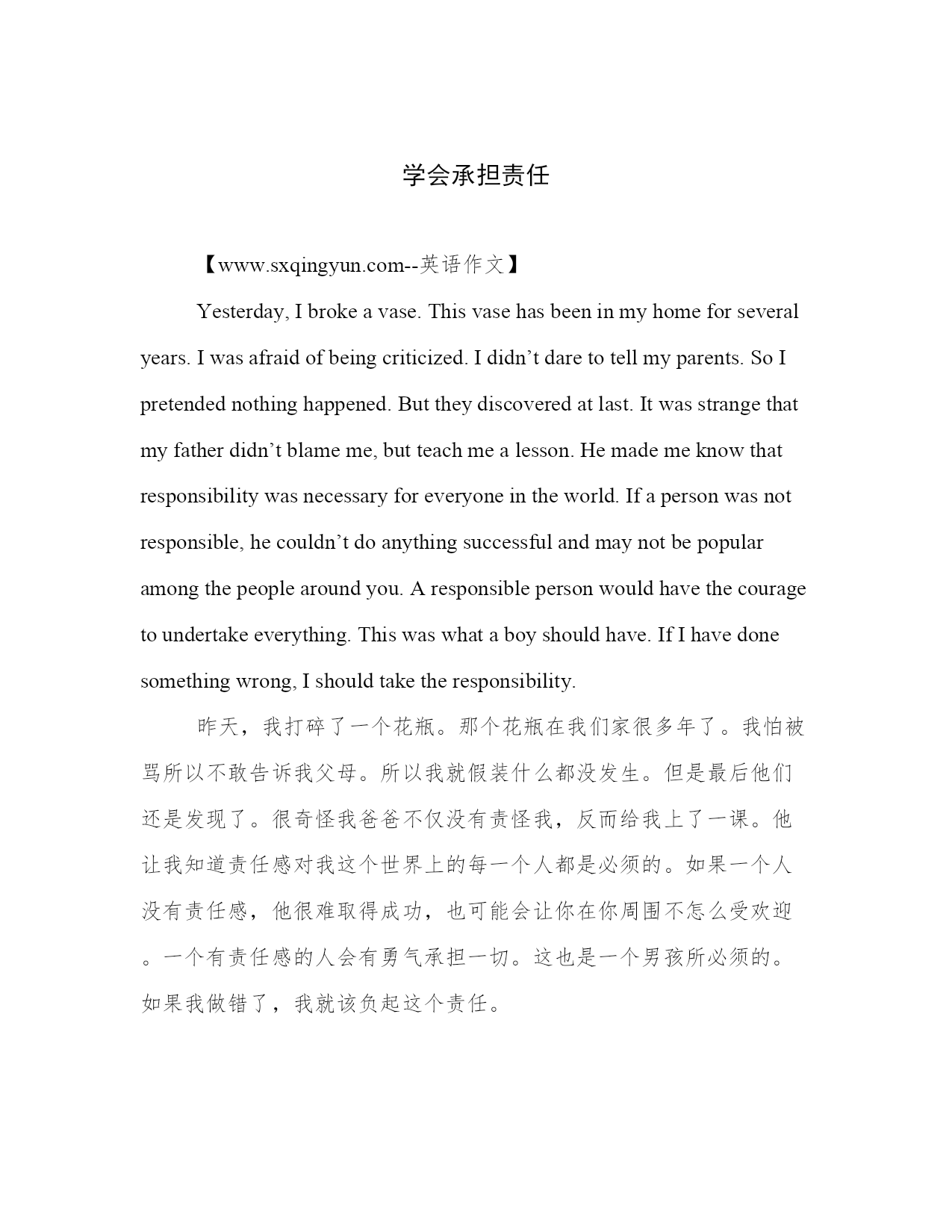 学会承担责任【www.sxqingyun.com--英语作文】Yesterday,Ibrokeavase.Thisvasehasbeeninmyhomeforseveralyears.Iwasafraidofbeingcriticized.Ididn’tdaretotellmyparents.SoIpretendednothinghappened.Buttheydiscoveredatlast.Itwasstrangethatmyfatherdidn’tblameme,butteachmealesson.Hemademeknowthatresponsibilitywasnecessaryforeveryoneintheworld.Ifapersonwasnotresponsible,hecouldn’tdoanythingsuccessfulandmaynotbepopularamongthepeoplearoundyou.Aresponsiblepersonwouldhavethecouragetoundertakeeverything.Thiswaswhataboyshouldhave.IfIhavedonesomethingwrong,Ishouldtaketheresponsibility.昨天,我打碎了一个花瓶。那个花瓶在我们家很多年了。我怕被骂所以不敢告诉我父母。所以我就假装什么都没发生。但是最后他们还是发现了。很奇怪我爸爸不仅没有责怪我,反而给我上了一课。他让我知道责任感对我这个世界上的每一个人都是必须的。如果一个人没有责任感,他很难取得成功,也可能会让你在你周围不怎么受欢迎。一个有责任感的人会有勇气承担一切。这也是一个男孩所必须的。如果我做错了,我就该负起这个责任。