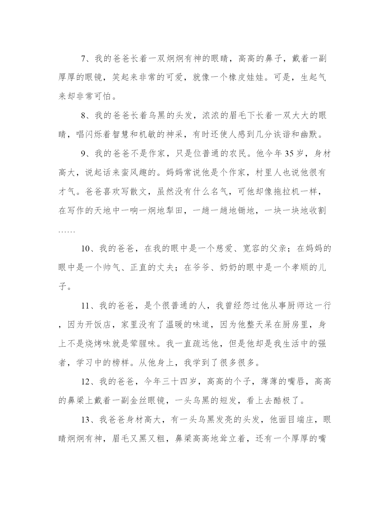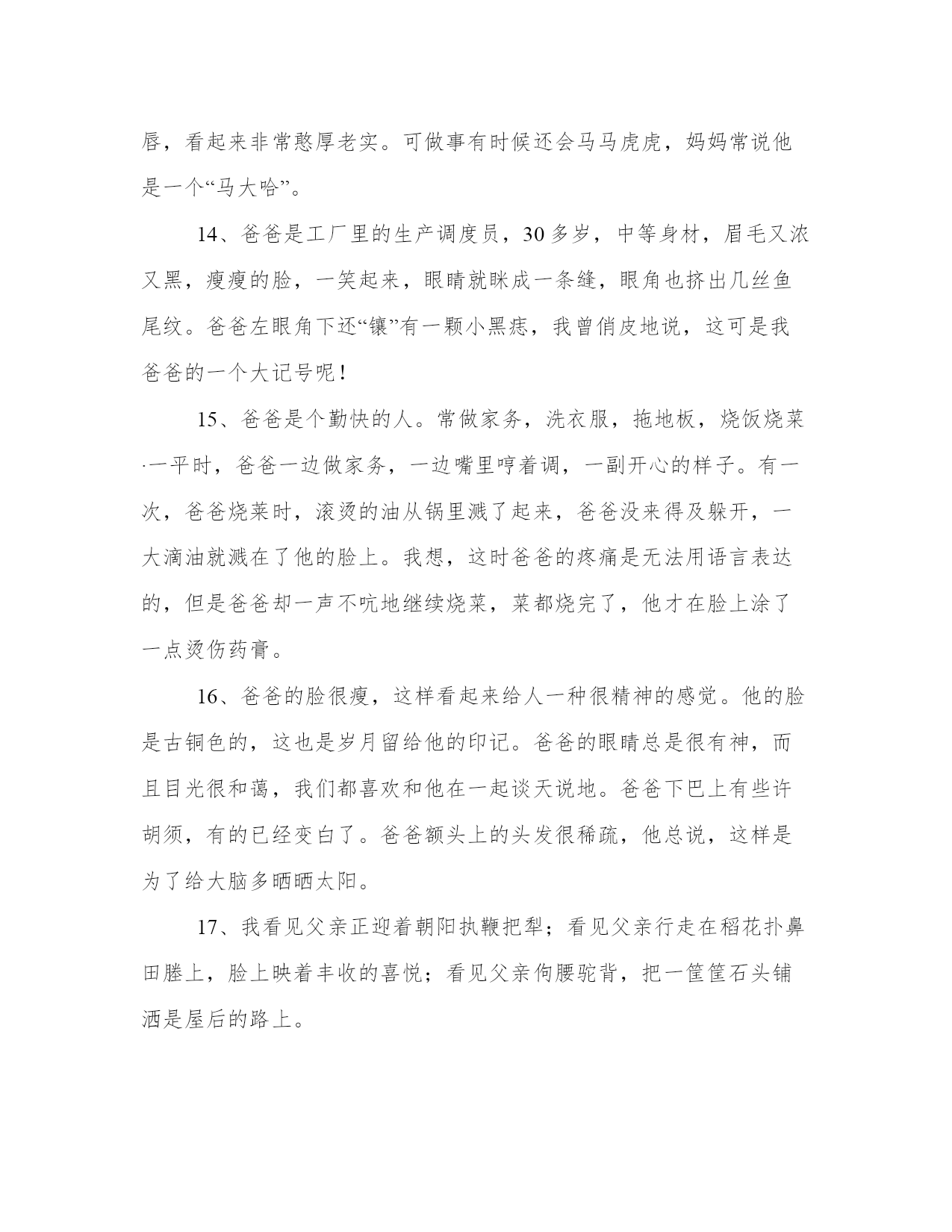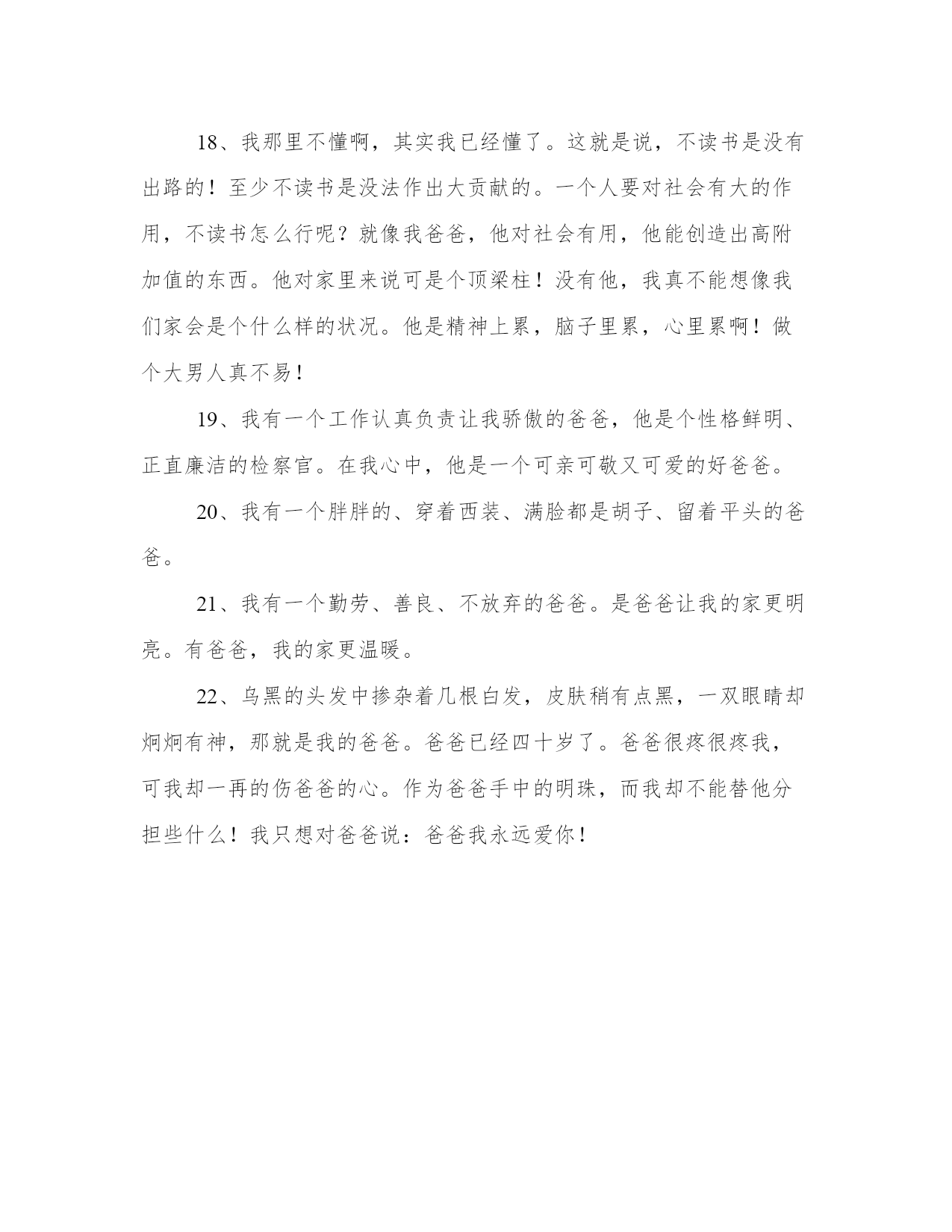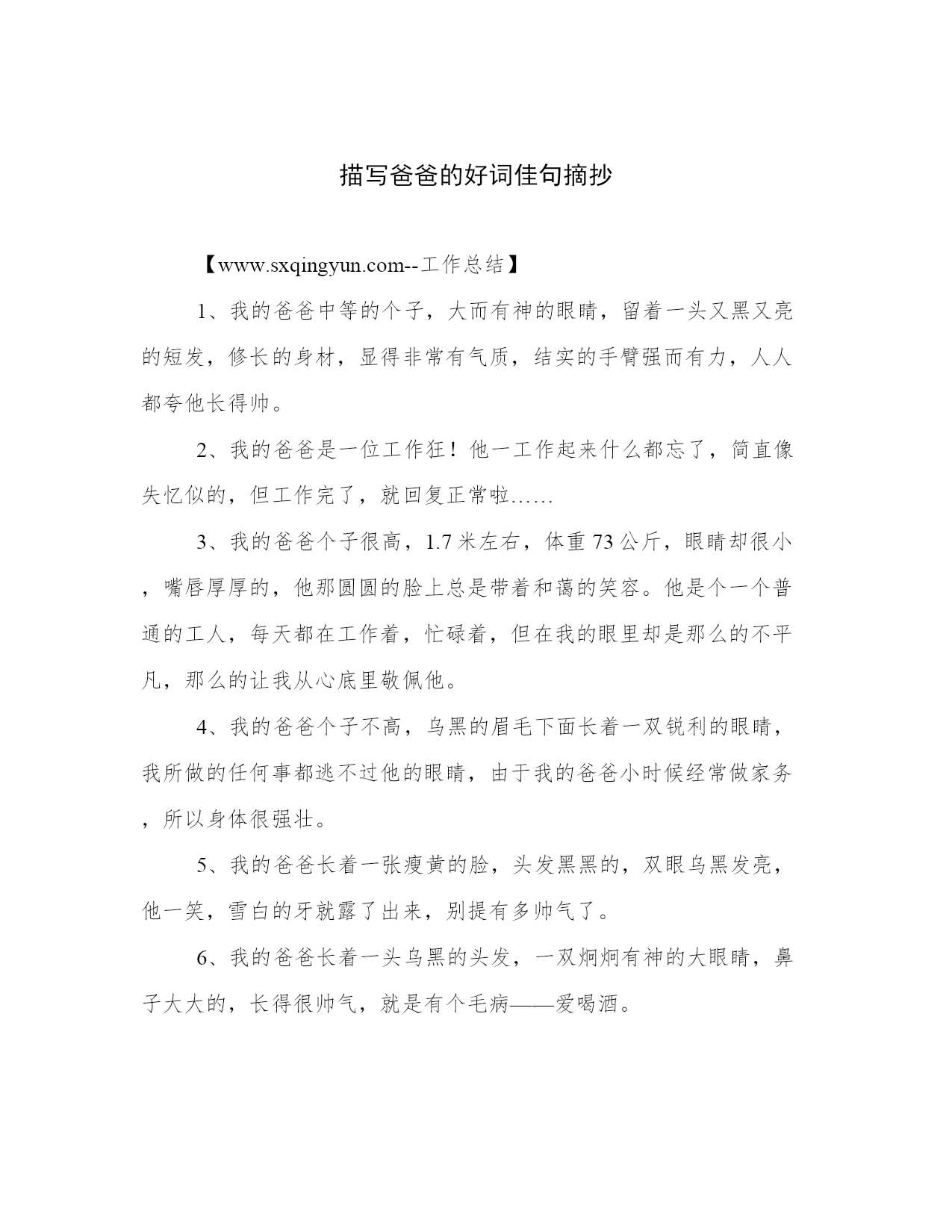 描写爸爸的好词佳句摘抄【www.sxqingyun.com--工作总结】1、我的爸爸中等的个子,大而有神的眼睛,留着一头又黑又亮的短发,修长的身材,显得非常有气质,结实的手臂强而有力,人人都夸他长得帅。2、我的爸爸是一位工作狂!他一工作起来什么都忘了,简直像失忆似的,但工作完了,就回复正常啦……3、我的爸爸个子很高,1.7米左右,体重73公斤,眼睛却很小,嘴唇厚厚的,他那圆圆的脸上总是带着和蔼的笑容。他是个一个普通的工人,每天都在工作着,忙碌着,但在我的眼里却是那么的不平凡,那么的让我从心底里敬佩他。4、我的爸爸个子不高,乌黑的眉毛下面长着一双锐利的眼睛,我所做的任何事都逃不过他的眼睛,由于我的爸爸小时候经常做家务,所以身体很强壮。5、我的爸爸长着一张瘦黄的脸,头发黑黑的,双眼乌黑发亮,他一笑,雪白的牙就露了出来,别提有多帅气了。6、我的爸爸长着一头乌黑的头发,一双炯炯有神的大眼睛,鼻子大大的,长得很帅气,就是有个毛病——爱喝酒。7、我的爸爸长着一双炯炯有神的眼睛,高高的鼻子,戴着一副厚厚的眼镜,笑起来非常的可爱,就像一个橡皮娃娃。可是,生起气来却非常可怕。8、我的爸爸长着乌黑的头发,浓浓的眉毛下长着一双大大的眼睛,唱闪烁着智慧和机敏的神采,有时还使人感到几分诙谐和幽默。9、我的爸爸不是作家,只是位普通的农民。他今年35岁,身材高大,说起话来蛮风趣的。妈妈常说他是个作家,村里人也说他很有才气。爸爸喜欢写散文,虽然没有什么名气,可他却像拖拉机一样,在写作的天地中一响一炯地犁田,一趟一趟地锄地,一块一块地收割……10、我的爸爸,在我的眼中是一个慈爱、宽容的父亲;在妈妈的眼中是一个帅气、正直的丈夫;在爷爷、奶奶的眼中是一个孝顺的儿子。11、我的爸爸,是个很普通的人,我曾经怨过他从事厨师这一行,因为开饭店,家里没有了温暖的味道,因为他整天呆在厨房里,身上不是烧烤味就是荤腥味。我一直疏远他,但是他却是我生活中的强者,学习中的榜样。从他身上,我学到了很多很多。12、我的爸爸,今年三十四岁,高高的个子,薄薄的嘴唇,高高的鼻梁上戴着一副金丝眼镜,一头乌黑的短发,看上去酷极了。13、我爸爸身材高大,有一头乌黑发亮的头发,他面目端庄,眼睛炯炯有神,眉毛又黑又粗,鼻梁高高地耸立着,还有一个厚厚的嘴唇,看起来非常憨厚老实。可做事有时候还会马马虎虎,妈妈常说他是一个“马大哈”。14、爸爸是工厂里的生产调度员,30多岁,中等身材,眉毛又浓又黑,瘦瘦的脸,一笑起来,眼睛就眯成一条缝,眼角也挤出几丝鱼尾纹。爸爸左眼角下还“镶”有一颗小黑痣,我曾俏皮地说,这可是我爸爸的一个大记号呢!15、爸爸是个勤快的人。常做家务,洗衣服,拖地板,烧饭烧菜·一平时,爸爸一边做家务,一边嘴里哼着调,一副开心的样子。有一次,爸爸烧莱时,滚烫的油从锅里溅了起来,爸爸没来得及躲开,一大滴油就溅在了他的脸上。我想,这时爸爸的疼痛是无法用语言表达的,但是爸爸却一声不吭地继续烧菜,菜都烧完了,他才在脸上涂了一点烫伤药膏。16、爸爸的脸很瘦,这样看起来给人一种很精神的感觉。他的脸是古铜色的,这也是岁月留给他的印记。爸爸的眼睛总是很有神,而且目光很和蔼,我们都喜欢和他在一起谈天说地。爸爸下巴上有些许胡须,有的已经变白了。爸爸额头上的头发很稀疏,他总说,这样是为了给大脑多晒晒太阳。17、我看见父亲正迎着朝阳执鞭把犁;看见父亲行走在稻花扑鼻田塍上,脸上映着丰收的喜悦;看见父亲佝腰驼背,把一筐筐石头铺洒是屋后的路上。18、我那里不懂啊,其实我已经懂了。这就是说,不读书是没有出路的!至少不读书是没法作出大贡献的。一个人要对社会有大的作用,不读书怎么行呢?就像我爸爸,他对社会有用,他能创造出高附加值的东西。他对家里来说可是个顶梁柱!没有他,我真不能想像我们家会是个什么样的状况。他是精神上累,脑子里累,心里累啊!做个大男人真不易!19、我有一个工作认真负责让我骄傲的爸爸,他是个性格鲜明、正直廉洁的检察官。在我心中,他是一个可亲可敬又可爱的好爸爸。20、我有一个胖胖的、穿着西装、满脸都是胡子、留着平头的爸爸。21、我有一个勤劳、善良、不放弃的爸爸。是爸爸让我的家更明亮。有爸爸,我的家更温暖。22、乌黑的头发中掺杂着几根白发,皮肤稍有点黑,一双眼睛却炯炯有神,那就是我的爸爸。爸爸已经四十岁了。爸爸很疼很疼我,可我却一再的伤爸爸的心。作为爸爸手中的明珠,而我却不能替他分担些什么!我只想对爸爸说:爸爸我永远爱你!