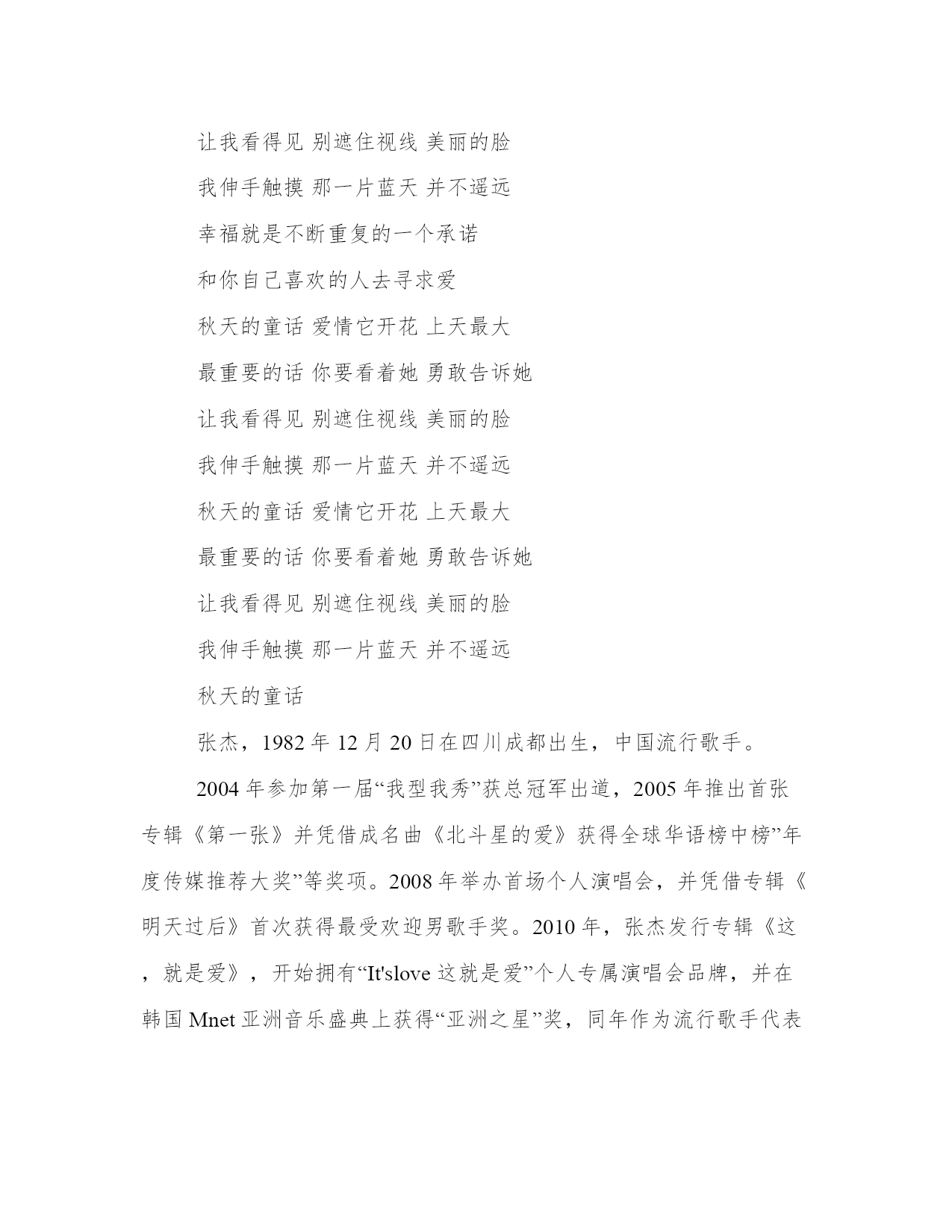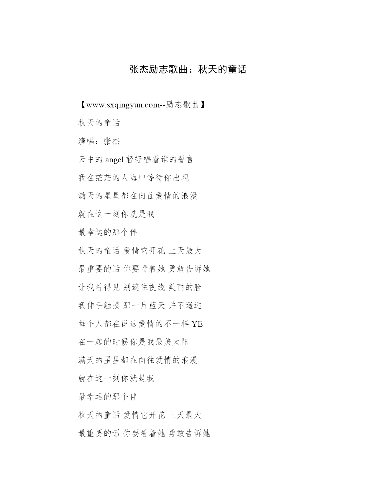 张杰励志歌曲:秋天的童话【www.sxqingyun.com--励志歌曲】秋天的童话演唱:张杰云中的angel轻轻唱着谁的誓言我在茫茫的人海中等待你出现满天的星星都在向往爱情的浪漫就在这一刻你就是我最幸运的那个伴秋天的童话爱情它开花上天最大最重要的话你要看着她勇敢告诉她让我看得见别遮住视线美丽的脸我伸手触摸那一片蓝天并不遥远每个人都在说这爱情的不一样YE在一起的时候你是我最美太阳满天的星星都在向往爱情的浪漫就在这一刻你就是我最幸运的那个伴秋天的童话爱情它开花上天最大最重要的话你要看着她勇敢告诉她让我看得见别遮住视线美丽的脸我伸手触摸那一片蓝天并不遥远幸福就是不断重复的一个承诺和你自己喜欢的人去寻求爱秋天的童话爱情它开花上天最大最重要的话你要看着她勇敢告诉她让我看得见别遮住视线美丽的脸我伸手触摸那一片蓝天并不遥远秋天的童话爱情它开花上天最大最重要的话你要看着她勇敢告诉她让我看得见别遮住视线美丽的脸我伸手触摸那一片蓝天并不遥远秋天的童话张杰,1982年12月20日在四川成都出生,中国流行歌手。2004年参加第一届“我型我秀”获总冠军出道,2005年推出首张专辑《第一张》并凭借成名曲《北斗星的爱》获得全球华语榜中榜”年度传媒推荐大奖”等奖项。2008年举办首场个人演唱会,并凭借专辑《明天过后》首次获得最受欢迎男歌手奖。2010年,张杰发行专辑《这,就是爱》,开始拥有“It'slove这就是爱”个人专属演唱会品牌,并在韩国Mnet亚洲音乐盛典上获得“亚洲之星”奖,同年作为流行歌手代表受邀担任博鳌亚洲论坛表演嘉宾。2012年,张杰在北京人民大会堂开启了第一次巡演的历程。2013年首次登上央视春晚的舞台