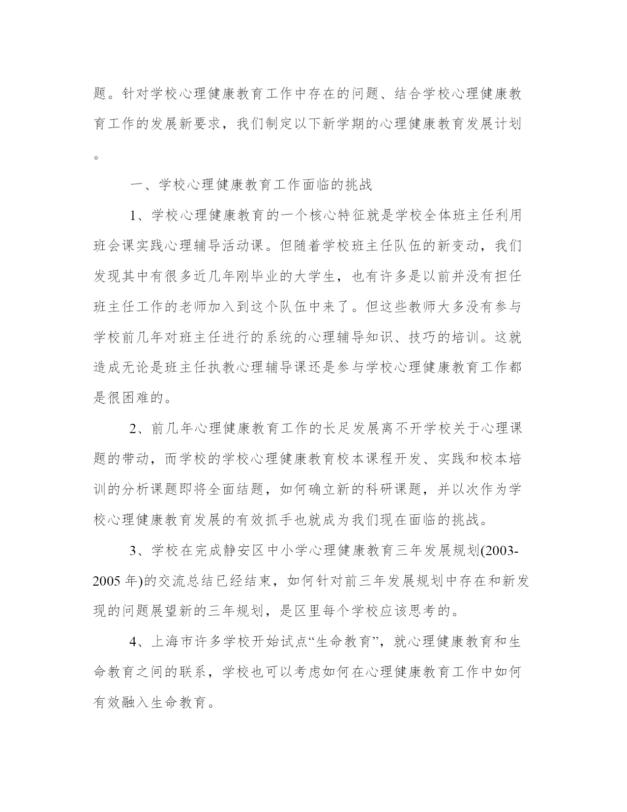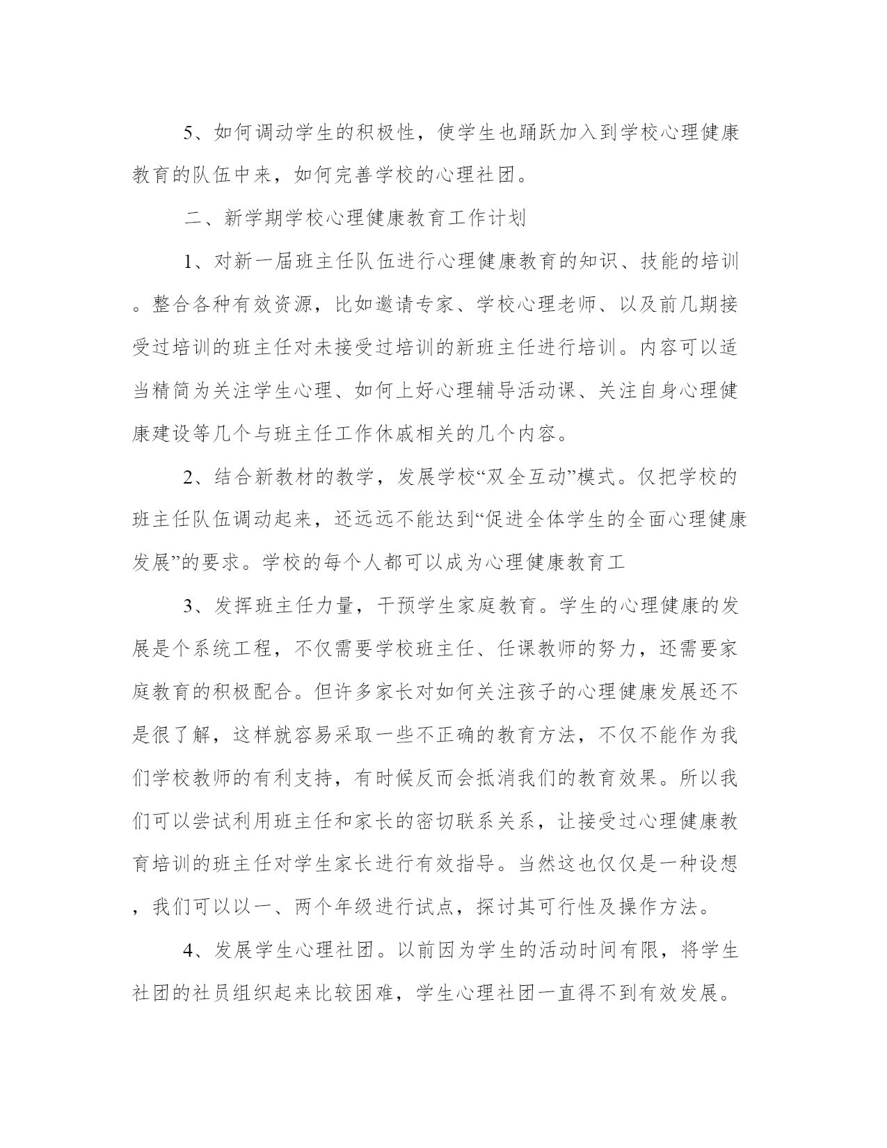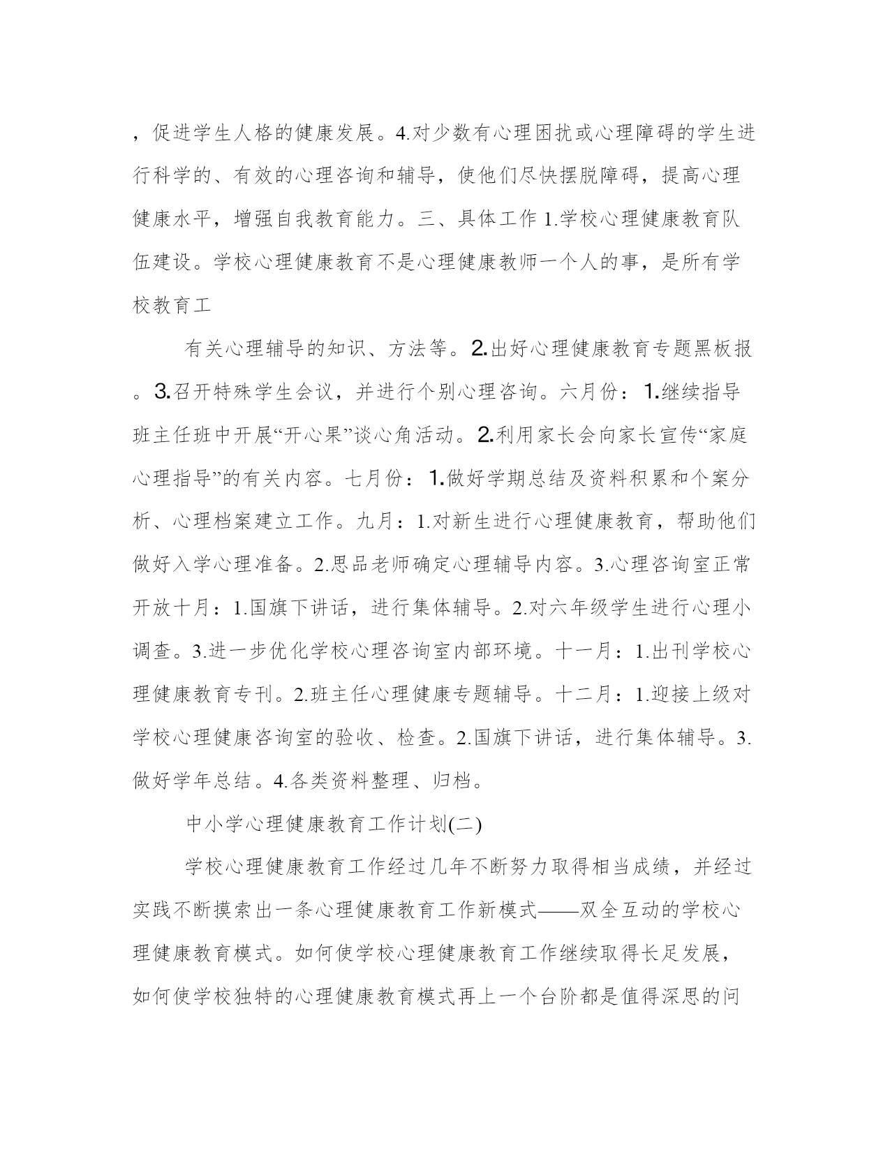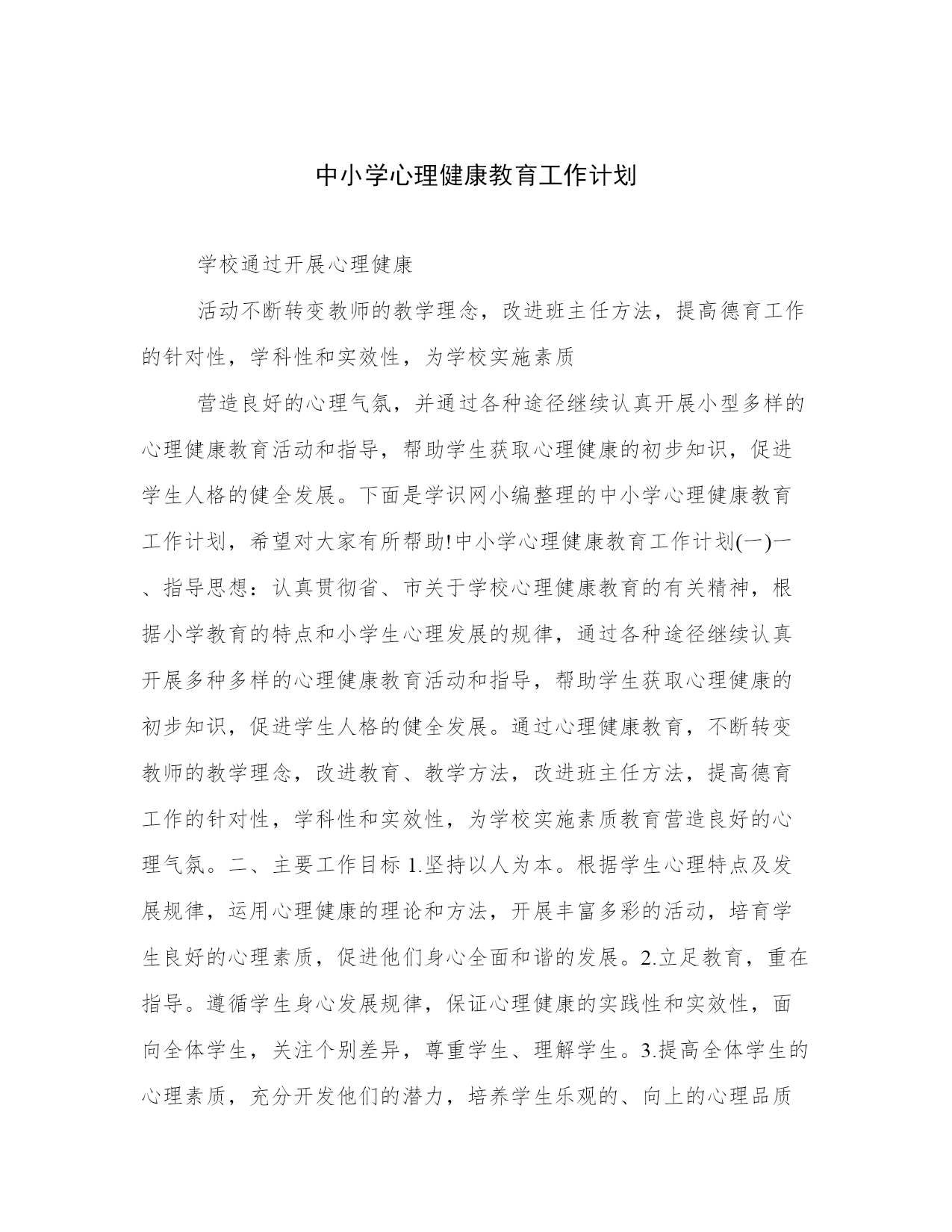 中小学心理健康教育工作计划学校通过开展心理健康活动不断转变教师的教学理念,改进班主任方法,提高德育工作的针对性,学科性和实效性,为学校实施素质营造良好的心理气氛,并通过各种途径继续认真开展小型多样的心理健康教育活动和指导,帮助学生获取心理健康的初步知识,促进学生人格的健全发展。下面是学识网小编整理的中小学心理健康教育工作计划,希望对大家有所帮助!中小学心理健康教育工作计划(一)一、指导思想:认真贯彻省、市关于学校心理健康教育的有关精神,根据小学教育的特点和小学生心理发展的规律,通过各种途径继续认真开展多种多样的心理健康教育活动和指导,帮助学生获取心理健康的初步知识,促进学生人格的健全发展。通过心理健康教育,不断转变教师的教学理念,改进教育、教学方法,改进班主任方法,提高德育工作的针对性,学科性和实效性,为学校实施素质教育营造良好的心理气氛。二、主要工作目标1.坚持以人为本。根据学生心理特点及发展规律,运用心理健康的理论和方法,开展丰富多彩的活动,培育学生良好的心理素质,促进他们身心全面和谐的发展。2.立足教育,重在指导。遵循学生身心发展规律,保证心理健康的实践性和实效性,面向全体学生,关注个别差异,尊重学生、理解学生。3.提高全体学生的心理素质,充分开发他们的潜力,培养学生乐观的、向上的心理品质,促进学生人格的健康发展。4.对少数有心理困扰或心理障碍的学生进行科学的、有效的心理咨询和辅导,使他们尽快摆脱障碍,提高心理健康水平,增强自我教育能力。三、具体工作1.学校心理健康教育队伍建设。学校心理健康教育不是心理健康教师一个人的事,是所有学校教育工有关心理辅导的知识、方法等。⒉出好心理健康教育专题黑板报。⒊召开特殊学生会议,并进行个别心理咨询。六月份:⒈继续指导班主任班中开展“开心果”谈心角活动。⒉利用家长会向家长宣传“家庭心理指导”的有关内容。七月份:⒈做好学期总结及资料积累和个案分析、心理档案建立工作。九月:1.对新生进行心理健康教育,帮助他们做好入学心理准备。2.思品老师确定心理辅导内容。3.心理咨询室正常开放十月:1.国旗下讲话,进行集体辅导。2.对六年级学生进行心理小调查。3.进一步优化学校心理咨询室内部环境。十一月:1.出刊学校心理健康教育专刊。2.班主任心理健康专题辅导。十二月:1.迎接上级对学校心理健康咨询室的验收、检查。2.国旗下讲话,进行集体辅导。3.做好学年总结。4.各类资料整理、归档。中小学心理健康教育工作计划(二)学校心理健康教育工作经过几年不断努力取得相当成绩,并经过实践不断摸索出一条心理健康教育工作新模式——双全互动的学校心理健康教育模式。如何使学校心理健康教育工作继续取得长足发展,如何使学校独特的心理健康教育模式再上一个台阶都是值得深思的问题。针对学校心理健康教育工作中存在的问题、结合学校心理健康教育工作的发展新要求,我们制定以下新学期的心理健康教育发展计划。一、学校心理健康教育工作面临的挑战1、学校心理健康教育的一个核心特征就是学校全体班主任利用班会课实践心理辅导活动课。但随着学校班主任队伍的新变动,我们发现其中有很多近几年刚毕业的大学生,也有许多是以前并没有担任班主任工作的老师加入到这个队伍中来了。但这些教师大多没有参与学校前几年对班主任进行的系统的心理辅导知识、技巧的培训。这就造成无论是班主任执教心理辅导课还是参与学校心理健康教育工作都是很困难的。2、前几年心理健康教育工作的长足发展离不开学校关于心理课题的带动,而学校的学校心理健康教育校本课程开发、实践和校本培训的分析课题即将全面结题,如何确立新的科研课题,并以次作为学校心理健康教育发展的有效抓手也就成为我们现在面临的挑战。3、学校在完成静安区中小学心理健康教育三年发展规划(2003-2005年)的交流总结已经结束,如何针对前三年发展规划中存在和新发现的问题展望新的三年规划,是区里每个学校应该思考的。4、上海市许多学校开始试点“生命教育”,就心理健康教育和生命教育之间的联系,学校也可以考虑如何在心理健康教育工作中如何有效融入生命教育。5、如何调动学生的积极性,使学生也踊跃加入到学校心理健康教育的队伍中来,如何完善学校的心理社团。二、新学期学校心理健康教育工作计划1、对新一届班主任队伍进行心理健康教育的知识、技能的培训。整合各种有效资源,比如邀请专家、学校心理老师、以及前几期接受过培训的班主任对未接受过培训的新班主任进行培训。内容可以适当精简为关注学生心理、如何上好心理辅导活动课、关注自身心理健康建设等几个与班主任工作休戚相关的几个内容。2、结合新教材的教学,发展学校“双全互动”模式。仅把学校的班主任队伍调动起来,还远远不能达到“促进全体学生的全面心理健康发展”的要求。学校的每个人都可以成为心理健康教育工3、发挥班主任力量,干预学生家庭教育。学
