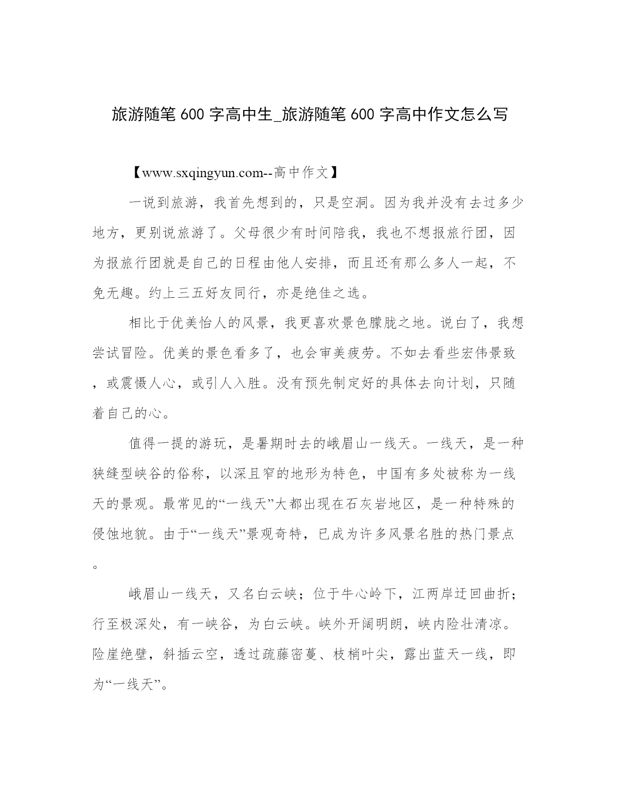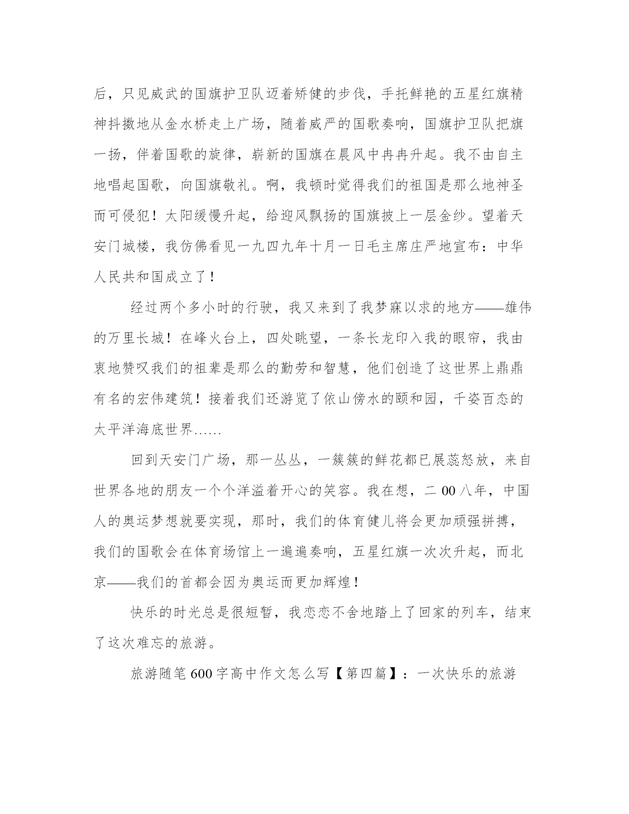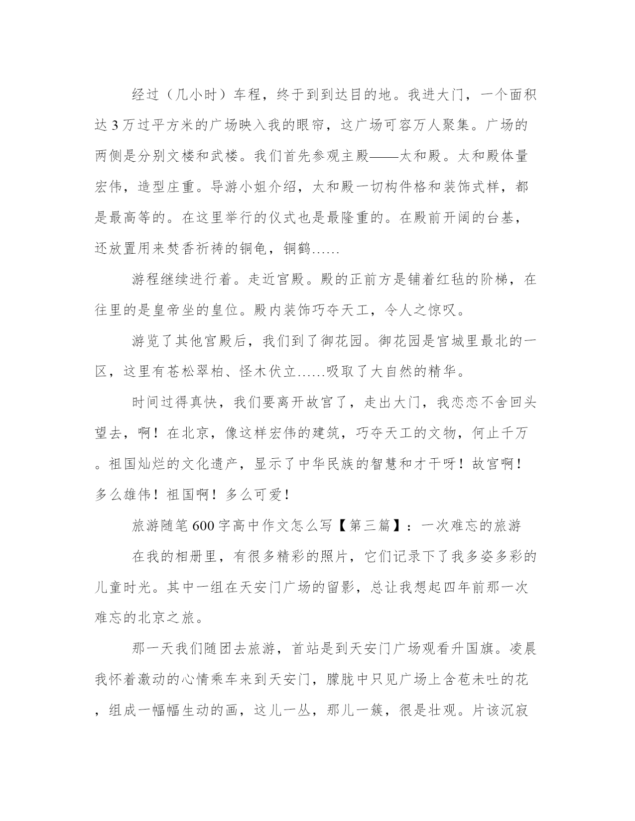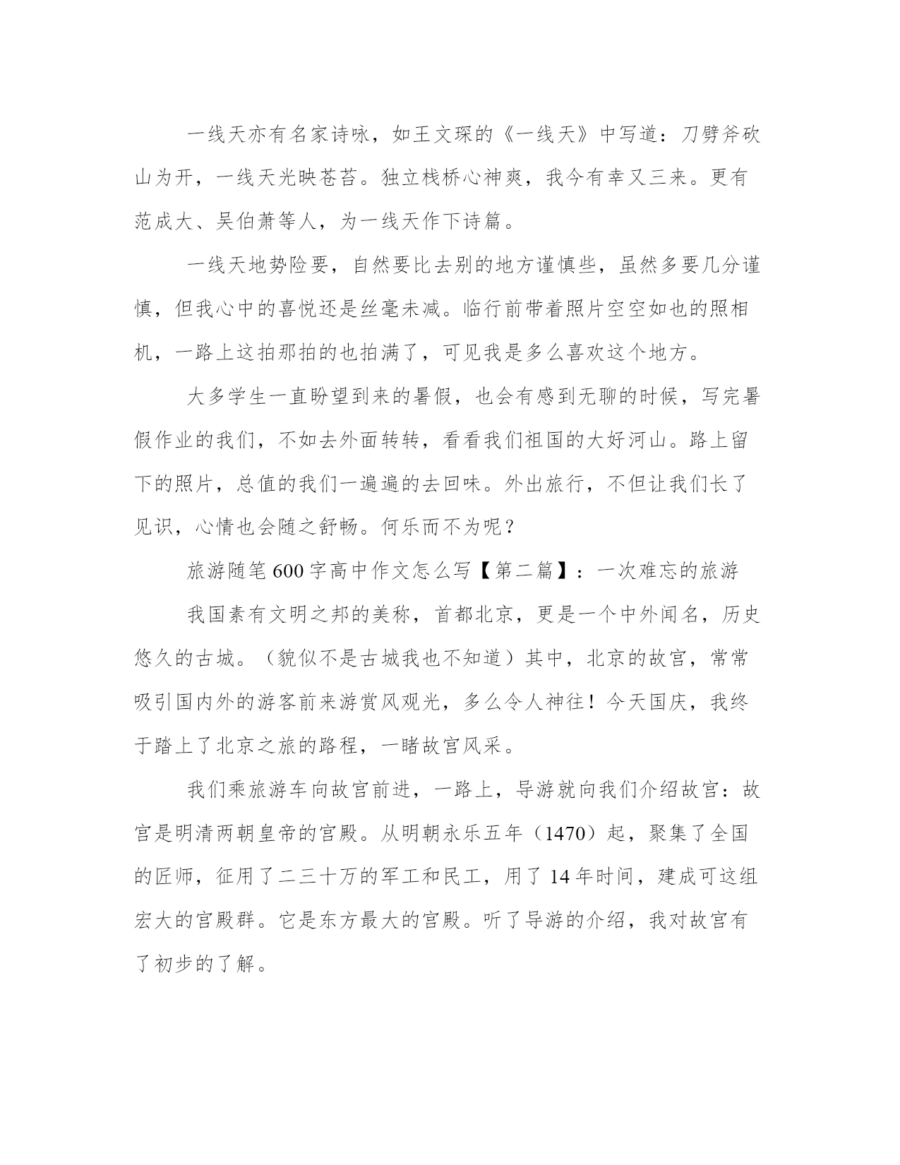 旅游随笔600字高中生_旅游随笔600字高中作文怎么写【www.sxqingyun.com--高中作文】一说到旅游,我首先想到的,只是空洞。因为我并没有去过多少地方,更别说旅游了。父母很少有时间陪我,我也不想报旅行团,因为报旅行团就是自己的日程由他人安排,而且还有那么多人一起,不免无趣。约上三五好友同行,亦是绝佳之选。相比于优美怡人的风景,我更喜欢景色朦胧之地。说白了,我想尝试冒险。优美的景色看多了,也会审美疲劳。不如去看些宏伟景致,或震慑人心,或引人入胜。没有预先制定好的具体去向计划,只随着自己的心。值得一提的游玩,是暑期时去的峨眉山一线天。一线天,是一种狭缝型峡谷的俗称,以深且窄的地形为特色,中国有多处被称为一线天的景观。最常见的“一线天”大都出现在石灰岩地区,是一种特殊的侵蚀地貌。由于“一线天”景观奇特,已成为许多风景名胜的热门景点。峨眉山一线天,又名白云峡;位于牛心岭下,江两岸迂回曲折;行至极深处,有一峡谷,为白云峡。峡外开阔明朗,峡内险壮清凉。险崖绝壁,斜插云空,透过疏藤密蔓、枝梢叶尖,露出蓝天一线,即为“一线天”。一线天亦有名家诗咏,如王文琛的《一线天》中写道:刀劈斧砍山为开,一线天光映苍苔。独立栈桥心神爽,我今有幸又三来。更有范成大、吴伯萧等人,为一线天作下诗篇。一线天地势险要,自然要比去别的地方谨慎些,虽然多要几分谨慎,但我心中的喜悦还是丝毫未减。临行前带着照片空空如也的照相机,一路上这拍那拍的也拍满了,可见我是多么喜欢这个地方。大多学生一直盼望到来的暑假,也会有感到无聊的时候,写完暑假作业的我们,不如去外面转转,看看我们祖国的大好河山。路上留下的照片,总值的我们一遍遍的去回味。外出旅行,不但让我们长了见识,心情也会随之舒畅。何乐而不为呢?旅游随笔600字高中作文怎么写【第二篇】:一次难忘的旅游我国素有文明之邦的美称,首都北京,更是一个中外闻名,历史悠久的古城。(貌似不是古城我也不知道)其中,北京的故宫,常常吸引国内外的游客前来游赏风观光,多么令人神往!今天国庆,我终于踏上了北京之旅的路程,一睹故宫风采。我们乘旅游车向故宫前进,一路上,导游就向我们介绍故宫:故宫是明清两朝皇帝的宫殿。从明朝永乐五年(1470)起,聚集了全国的匠师,征用了二三十万的军工和民工,用了14年时间,建成可这组宏大的宫殿群。它是东方最大的宫殿。听了导游的介绍,我对故宫有了初步的了解。经过(几小时)车程,终于到到达目的地。我进大门,一个面积达3万过平方米的广场映入我的眼帘,这广场可容万人聚集。广场的两侧是分别文楼和武楼。我们首先参观主殿——太和殿。太和殿体量宏伟,造型庄重。导游小姐介绍,太和殿一切构件格和装饰式样,都是最高等的。在这里举行的仪式也是最隆重的。在殿前开阔的台基,还放置用来焚香祈祷的铜龟,铜鹤……游程继续进行着。走近宫殿。殿的正前方是铺着红毡的阶梯,在往里的是皇帝坐的皇位。殿内装饰巧夺天工,令人之惊叹。游览了其他宫殿后,我们到了御花园。御花园是宫城里最北的一区,这里有苍松翠柏、怪木伏立……吸取了大自然的精华。时间过得真快,我们要离开故宫了,走出大门,我恋恋不舍回头望去,啊!在北京,像这样宏伟的建筑,巧夺天工的文物,何止千万。祖国灿烂的文化遗产,显示了中华民族的智慧和才干呀!故宫啊!多么雄伟!祖国啊!多么可爱!旅游随笔600字高中作文怎么写【第三篇】:一次难忘的旅游在我的相册里,有很多精彩的照片,它们记录下了我多姿多彩的儿童时光。其中一组在天安门广场的留影,总让我想起四年前那一次难忘的北京之旅。那一天我们随团去旅游,首站是到天安门广场观看升国旗。凌晨我怀着激动的心情乘车来到天安门,朦胧中只见广场上含苞未吐的花,组成一幅幅生动的画,这儿一丛,那儿一簇,很是壮观。片该沉寂后,只见威武的国旗护卫队迈着矫健的步伐,手托鲜艳的五星红旗精神抖擞地从金水桥走上广场,随着威严的国歌奏响,国旗护卫队把旗一扬,伴着国歌的旋律,崭新的国旗在晨风中冉冉升起。我不由自主地唱起国歌,向国旗敬礼。啊,我顿时觉得我们的祖国是那么地神圣而可侵犯!太阳缓慢升起,给迎风飘扬的国旗披上一层金纱。望着天安门城楼,我仿佛看见一九四九年十月一日毛主席庄严地宣布:中华人民共和国成立了!经过两个多小时的行驶,我又来到了我梦寐以求的地方——雄伟的万里长城!在峰火台上,四处眺望,一条长龙印入我的眼帘,我由衷地赞叹我们的祖辈是那么的勤劳和智慧,他们创造了这世界上鼎鼎有名的宏伟建筑!接着我们还游览了依山傍水的颐和园,千姿百态的太平洋海底世界……回到天安门广场,那一丛丛,一簇簇的鲜花都已展蕊怒放,来自世界各地的朋友一个个洋溢着开心的笑容。我在想,二00八年,中国人的奥运梦想就要实现,那时,我们的体育健儿将会更加顽强拼搏,我们的国歌会在体育场馆上一遍遍奏响,五星红旗一次次升起,而北京——我们