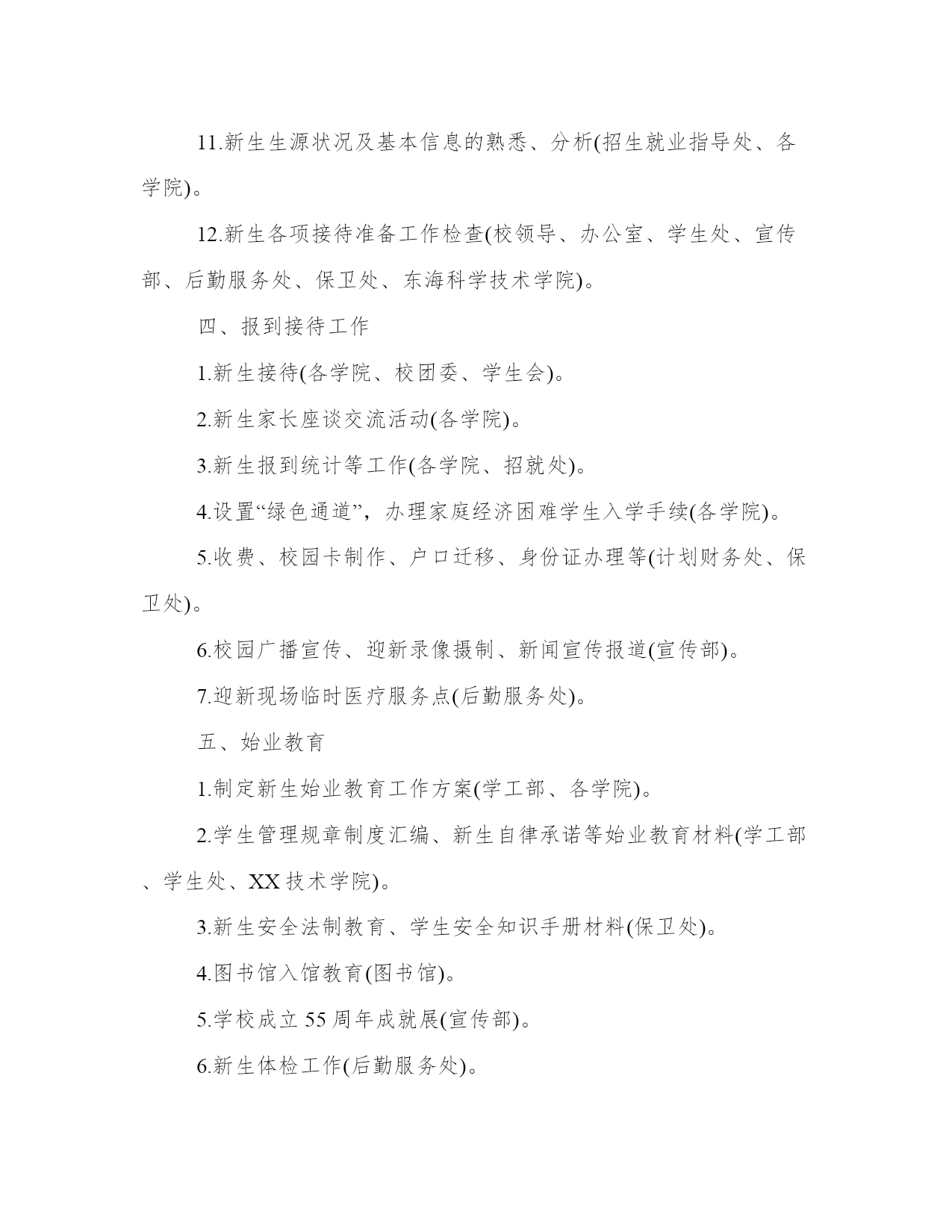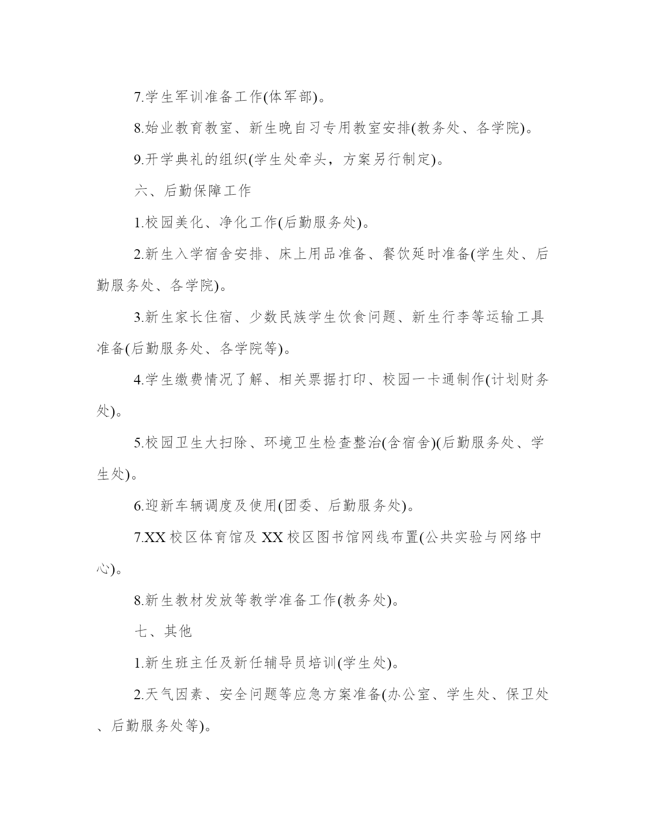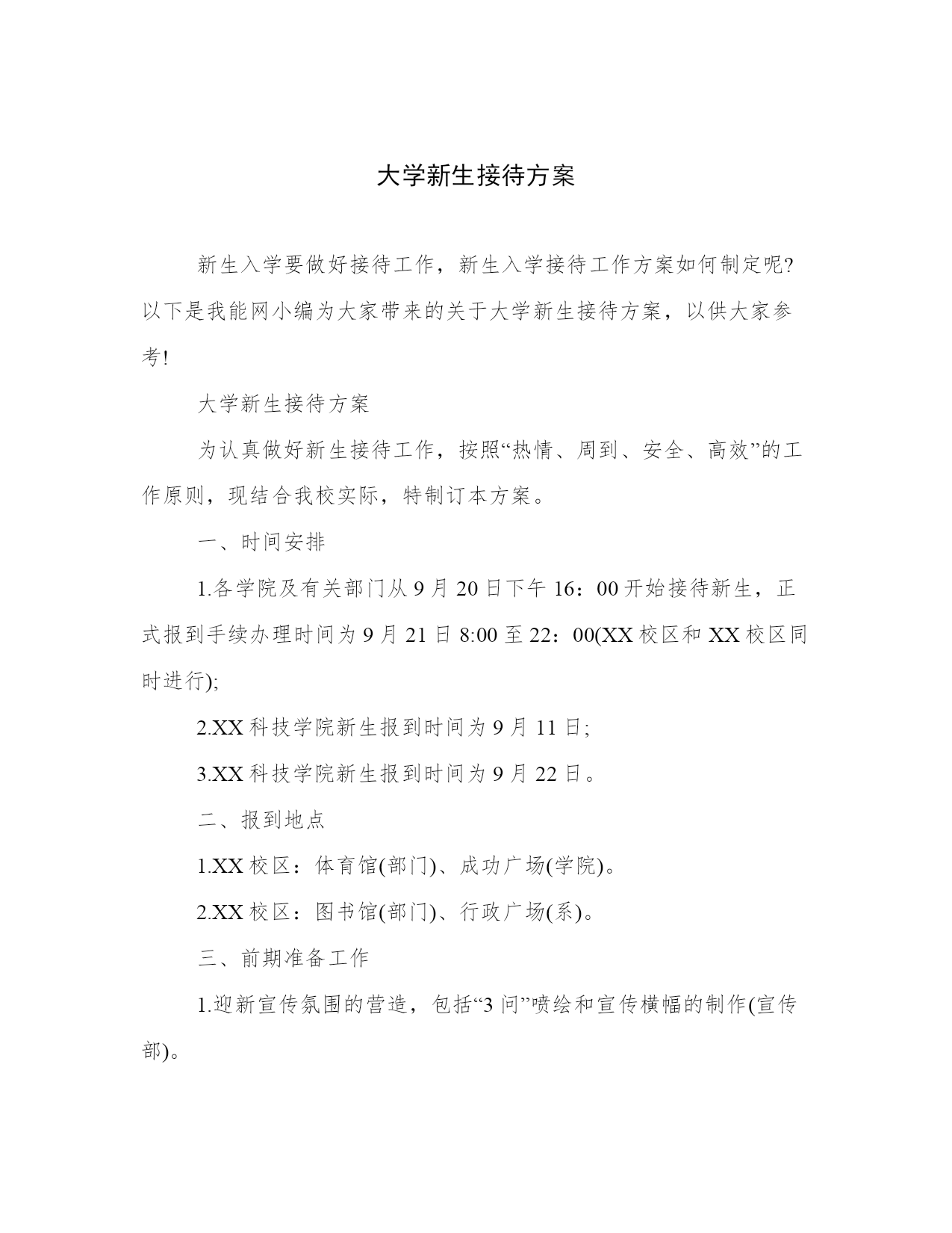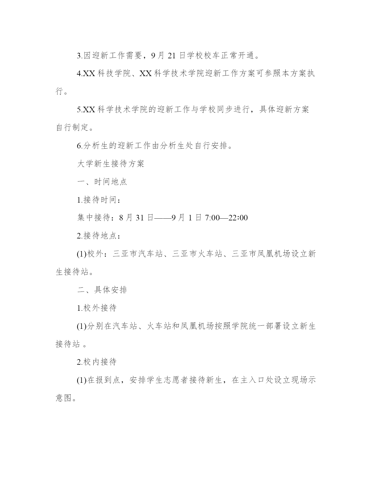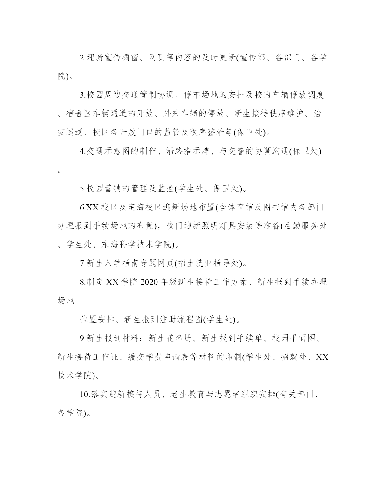 大学新生接待方案新生入学要做好接待工作,新生入学接待工作方案如何制定呢?以下是我能网小编为大家带来的关于大学新生接待方案,以供大家参考!大学新生接待方案为认真做好新生接待工作,按照“热情、周到、安全、高效”的工作原则,现结合我校实际,特制订本方案。一、时间安排1.各学院及有关部门从9月20日下午16:00开始接待新生,正式报到手续办理时间为9月21日8:00至22:00(XX校区和XX校区同时进行);2.XX科技学院新生报到时间为9月11日;3.XX科技学院新生报到时间为9月22日。二、报到地点1.XX校区:体育馆(部门)、成功广场(学院)。2.XX校区:图书馆(部门)、行政广场(系)。三、前期准备工作1.迎新宣传氛围的营造,包括“3问”喷绘和宣传横幅的制作(宣传部)。2.迎新宣传橱窗、网页等内容的及时更新(宣传部、各部门、各学院)。3.校园周边交通管制协调、停车场地的安排及校内车辆停放调度、宿舍区车辆通道的开放、外来车辆的停放、新生接待秩序维护、治安巡逻、校区各开放门口的监管及秩序整治等(保卫处)。4.交通示意图的制作、沿路指示牌、与交警的协调沟通(保卫处)。5.校园营销的管理及监控(学生处、保卫处)。6.XX校区及定海校区迎新场地布置(含体育馆及图书馆内各部门办理报到手续场地的布置),校门迎新照明灯具安装等准备(后勤服务处、学生处、东海科学技术学院)。7.新生入学指南专题网页(招生就业指导处)。8.制定XX学院2020年级新生接待工作方案、新生报到手续办理场地位置安排、新生报到注册流程图(学生处)。9.新生报到材料:新生花名册、新生报到手续单、校园平面图、新生接待工作证、缓交学费申请表等材料的印制(学生处、招就处、XX技术学院)。10.落实迎新接待人员、老生教育与志愿者组织安排(有关部门、各学院)。11.新生生源状况及基本信息的熟悉、分析(招生就业指导处、各学院)。12.新生各项接待准备工作检查(校领导、办公室、学生处、宣传部、后勤服务处、保卫处、东海科学技术学院)。四、报到接待工作1.新生接待(各学院、校团委、学生会)。2.新生家长座谈交流活动(各学院)。3.新生报到统计等工作(各学院、招就处)。4.设置“绿色通道”,办理家庭经济困难学生入学手续(各学院)。5.收费、校园卡制作、户口迁移、身份证办理等(计划财务处、保卫处)。6.校园广播宣传、迎新录像摄制、新闻宣传报道(宣传部)。7.迎新现场临时医疗服务点(后勤服务处)。五、始业教育1.制定新生始业教育工作方案(学工部、各学院)。2.学生管理规章制度汇编、新生自律承诺等始业教育材料(学工部、学生处、XX技术学院)。3.新生安全法制教育、学生安全知识手册材料(保卫处)。4.图书馆入馆教育(图书馆)。5.学校成立55周年成就展(宣传部)。6.新生体检工作(后勤服务处)。7.学生军训准备工作(体军部)。8.始业教育教室、新生晚自习专用教室安排(教务处、各学院)。9.开学典礼的组织(学生处牵头,方案另行制定)。六、后勤保障工作1.校园美化、净化工作(后勤服务处)。2.新生入学宿舍安排、床上用品准备、餐饮延时准备(学生处、后勤服务处、各学院)。3.新生家长住宿、少数民族学生饮食问题、新生行李等运输工具准备(后勤服务处、各学院等)。4.学生缴费情况了解、相关票据打印、校园一卡通制作(计划财务处)。5.校园卫生大扫除、环境卫生检查整治(含宿舍)(后勤服务处、学生处)。6.迎新车辆调度及使用(团委、后勤服务处)。7.XX校区体育馆及XX校区图书馆网线布置(公共实验与网络中心)。8.新生教材发放等教学准备工作(教务处)。七、其他1.新生班主任及新任辅导员培训(学生处)。2.天气因素、安全问题等应急方案准备(办公室、学生处、保卫处、后勤服务处等)。3.因迎新工作需要,9月21日学校校车正常开通。4.XX科技学院、XX科学技术学院迎新工作方案可参照本方案执行。5.XX科学技术学院的迎新工作与学校同步进行,具体迎新方案自行制定。6.分析生的迎新工作由分析生处自行安排。大学新生接待方案一、时间地点1.接待时间:集中接待:8月31日——9月1日7:00—22∶002.接待地点:(1)校外:三亚市汽车站、三亚市火车站、三亚市凤凰机场设立新生接待站。二、具体安排1.校外接待(1)分别在汽车站、火车站和凤凰机场按照学院统一部署设立新生接待站。2.校内接待(1)在报到点,安排学生志愿者接待新生,在主入口处设立现场示意图。(2)新生报到(报到处)→缴费(缴费处)→领取军训服装(服装领取处)→领取住宿备品(备品领取处)→办理住宿手续及家长入住手续(住宿处)→入班报到,填写入学登记表,上交新生报到单(班级报到处)。3.咨询服务在集中报到地点设立咨询室,方便学生及家长了解学校相关招生政策。4.缓交学费及退费手续审批