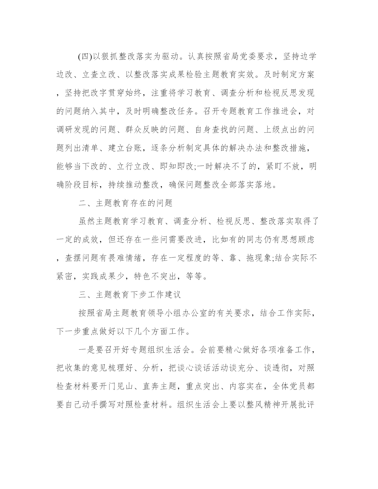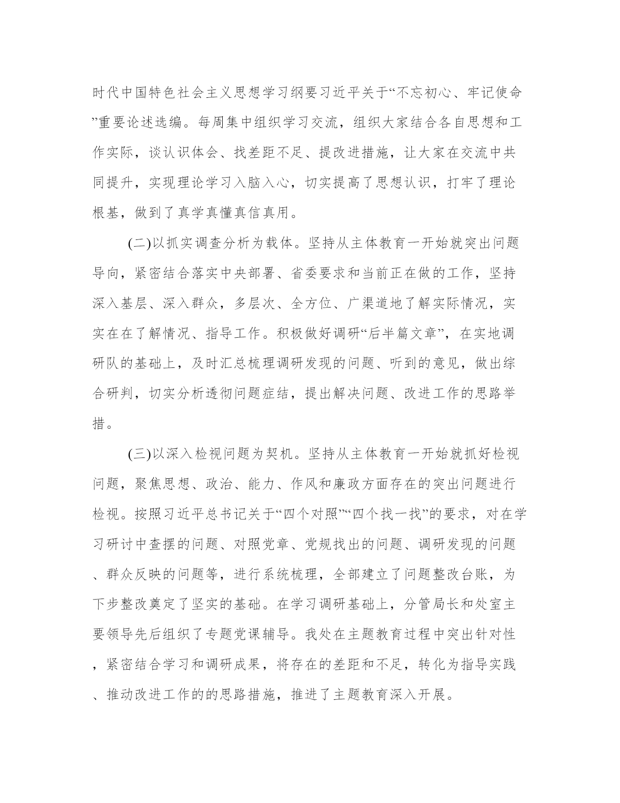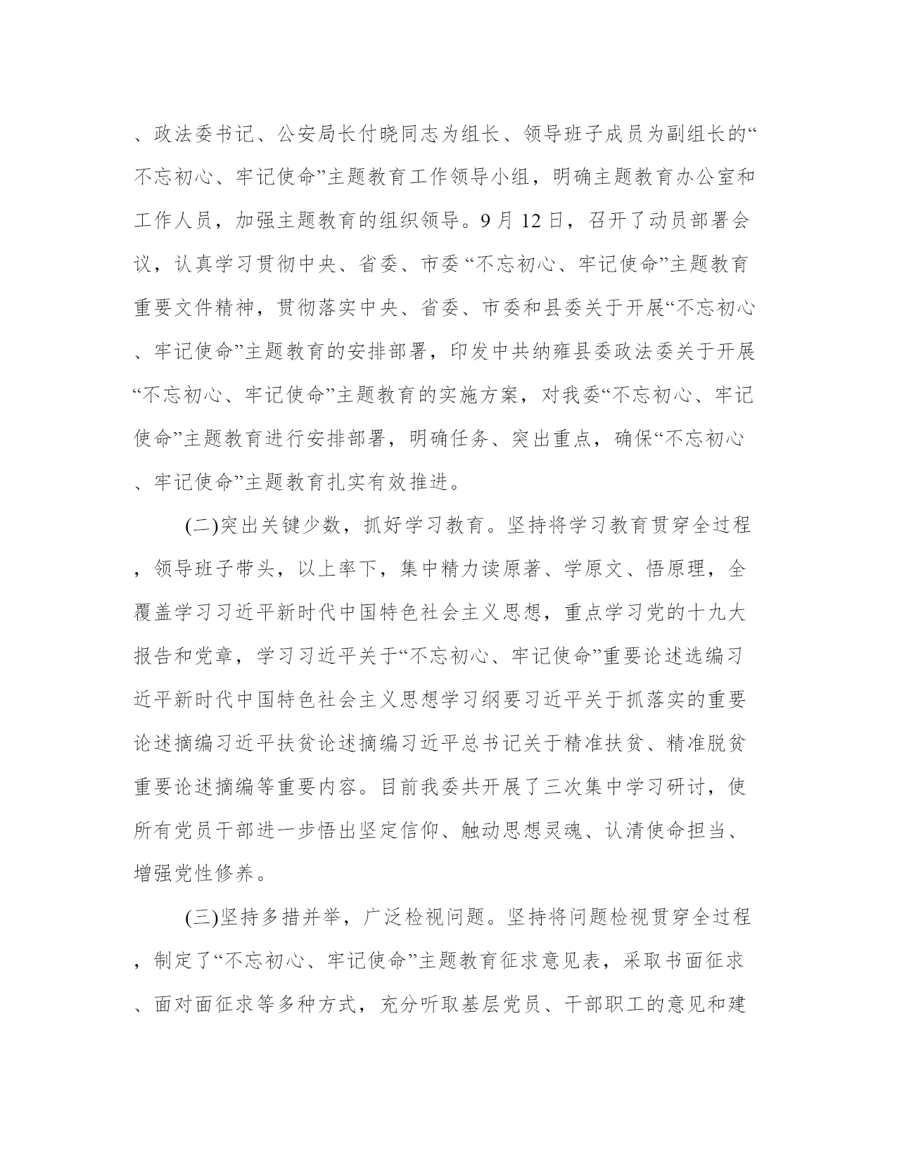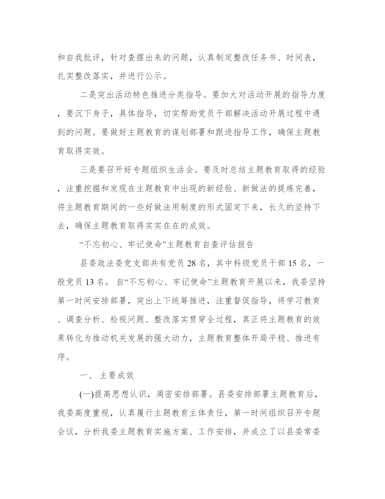 “不忘初心、牢记使命”主题教育自查评估报告通过主题教育,引导广大党员干部在认真学习贯彻习近平新时代中国特色社会主义思想,在坚定信仰信念,传承红色基因,增强“四个意识”、坚定“四个自信”、做到“两个维护”上,立场更坚定、行动更自觉。本站为大家整理的相关的“不忘初心、牢记使命”主题教育自查评估报告,供大家参考选择。“不忘初心、牢记使命”主题教育自查评估报告一、主题教育开展情况“不忘初心,牢记使命”主题教育启动以来,我处认真落实中央和省委的部署要求,按照“不划阶段、不分环节”的要求,以深化理论学习为基础,以抓实调查分析为载体,以深入检视问题为契机,以狠抓整改落实为驱动,切实把学习教育、调查分析、检视问题、整改落实四项重点措施做好做实,取得了较好的成效。(一)以深化理论学习为基础。我们按照主题教育集中学习研讨活动方案安排,坚持以习近平新时代中国特色社会主义思想为指导,把开展主题教育作为一项重大政治任务,以高度负责的精神抓好主题教育,努力做到学在深处、干在实处、走在前列。组织支部全体党员每周进行集体政治学习,深入学习了习近平总书记在“不忘初心,牢记使命”主题教育工作会议、中央政治局第十五次集体学习、中央和国家机关党的建设工作会议,认真学习了党章党规和党史,学习了习近平新时代中国特色社会主义思想学习纲要习近平关于“不忘初心、牢记使命”重要论述选编。每周集中组织学习交流,组织大家结合各自思想和工作实际,谈认识体会、找差距不足、提改进措施,让大家在交流中共同提升,实现理论学习入脑入心,切实提高了思想认识,打牢了理论根基,做到了真学真懂真信真用。(二)以抓实调查分析为载体。坚持从主体教育一开始就突出问题导向,紧密结合落实中央部署、省委要求和当前正在做的工作,坚持深入基层、深入群众,多层次、全方位、广渠道地了解实际情况,实实在在了解情况、指导工作。积极做好调研“后半篇文章”,在实地调研队的基础上,及时汇总梳理调研发现的问题、听到的意见,做出综合研判,切实分析透彻问题症结,提出解决问题、改进工作的思路举措。(三)以深入检视问题为契机。坚持从主体教育一开始就抓好检视问题,聚焦思想、政治、能力、作风和廉政方面存在的突出问题进行检视。按照习近平总书记关于“四个对照”“四个找一找”的要求,对在学习研讨中查摆的问题、对照党章、党规找出的问题、调研发现的问题、群众反映的问题等,进行系统梳理,全部建立了问题整改台账,为下步整改奠定了坚实的基础。在学习调研基础上,分管局长和处室主要领导先后组织了专题党课辅导。我处在主题教育过程中突出针对性,紧密结合学习和调研成果,将存在的差距和不足,转化为指导实践、推动改进工作的的思路措施,推进了主题教育深入开展。(四)以狠抓整改落实为驱动。认真按照省局党委要求,坚持边学边改、立查立改、以整改落实成果检验主题教育实效。及时制定方案,坚持把改字贯穿始终,注重将学习教育、调查分析和检视反思发现的问题纳入其中,及时明确整改任务。召开专题教育工作推进会,对调研发现的问题、群众反映的问题、自身查找的问题、上级点出的问题列出清单、建立台账,逐条分析制定具体的解决办法和整改措施,能够当下改的、立行立改、即知即改;一时解决不了的,紧盯不放,明确阶段目标,持续推动整改,确保问题整改全部落实落地。二、主题教育存在的问题虽然主题教育学习教育、调查分析、检视反思、整改落实取得了一定的成效,但还存在一些问需要改进,比如有的同志仍有思想顾虑,查摆问题有畏难情绪,存在一定程度的等、靠、拖现象;结合实际不紧密,实践成果少,特色不突出,等等。三、主题教育下步工作建议按照省局主题教育领导小组办公室的有关要求,结合工作实际,下一步重点做好以下几个方面工作。一是要召开好专题组织生活会。会前要精心做好各项准备工作,把收集的意见梳理好、分析,把谈心谈话活动谈充分、谈透彻,对照检查材料要开门见山、直奔主题,重点突出、内容实在,全体党员都要自己动手撰写对照检查材料。组织生活会上要以整风精神开展批评和自我批评,针对查摆出来的问题,认真制定整改任务书、时间表,扎实整改落实,并进行公示。二是突出活动特色推进分类指导。要加大对活动开展的指导力度,要沉下身子,具体指导,切实帮助党员干部解决活动开展过程中遇到的问题。要做好主题教育的谋划部署和跟进指导工作,确保主题教育取得实效。三是要召开好专题组织生活会。要及时总结主题教育取得的经验,注重挖掘和发现在主题教育中出现的新经验、新做法的提炼完善,将主题教育期间的一些好做法用制度的形式固定下来,长久的坚持下去,确保主题教育取得实实在在的成效。“不忘初心、牢记使命”主题教育自查评估报告县委政法委党支部共有党员28名,其中科级党员干部15名,一般党员13名。自“不忘初心、牢记使命”主题教育开展以来,我委坚持第一时间安排部署,突出上下统筹推进,注重督促