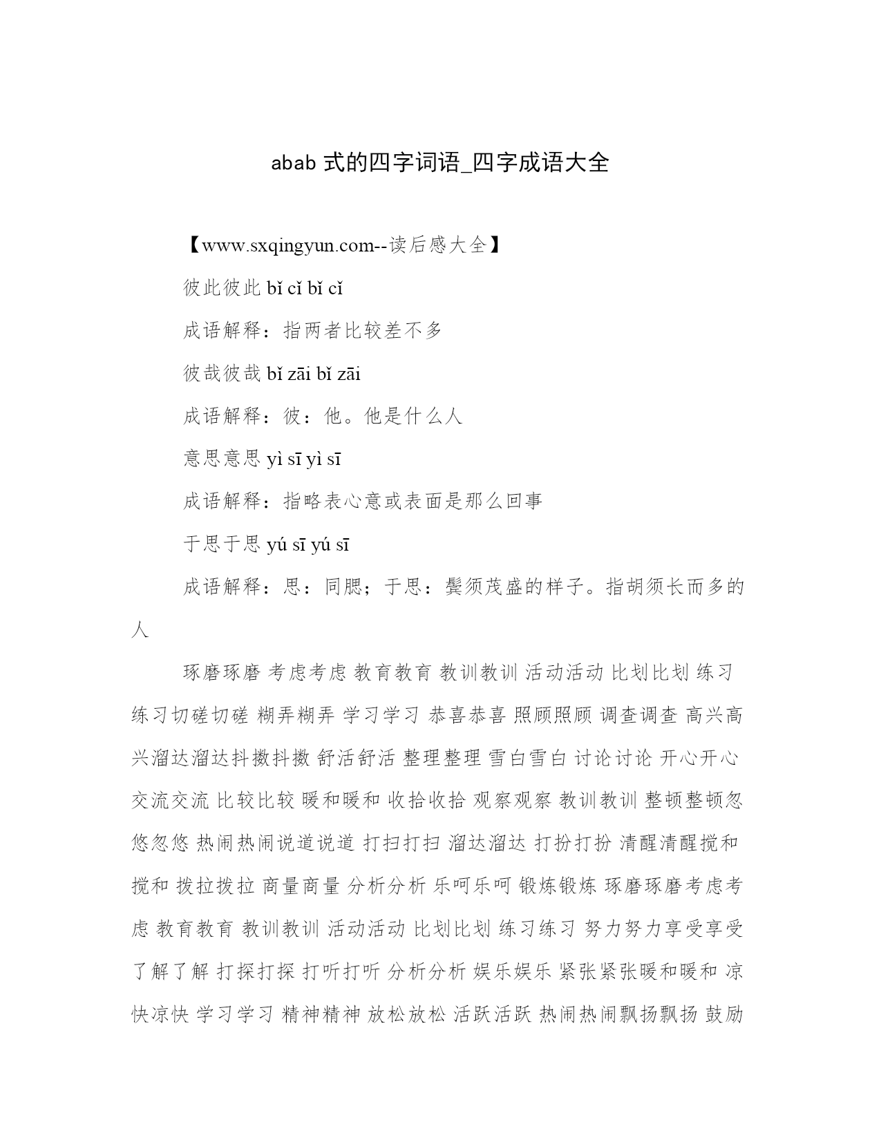 abab式的四字词语_四字成语大全【www.sxqingyun.com--读后感大全】彼此彼此bǐcǐbǐcǐ成语解释:指两者比较差不多彼哉彼哉bǐzāibǐzāi成语解释:彼:他。他是什么人意思意思yìsīyìsī成语解释:指略表心意或表面是那么回事于思于思yúsīyúsī成语解释:思:同腮;于思:鬓须茂盛的样子。指胡须长而多的人琢磨琢磨考虑考虑教育教育教训教训活动活动比划比划练习练习切磋切磋糊弄糊弄学习学习恭喜恭喜照顾照顾调查调查高兴高兴溜达溜达抖擞抖擞舒活舒活整理整理雪白雪白讨论讨论开心开心交流交流比较比较暖和暖和收拾收拾观察观察教训教训整顿整顿忽悠忽悠热闹热闹说道说道打扫打扫溜达溜达打扮打扮清醒清醒搅和搅和拨拉拨拉商量商量分析分析乐呵乐呵锻炼锻炼琢磨琢磨考虑考虑教育教育教训教训活动活动比划比划练习练习努力努力享受享受了解了解打探打探打听打听分析分析娱乐娱乐紧张紧张暖和暖和凉快凉快学习学习精神精神放松放松活跃活跃热闹热闹飘扬飘扬鼓励鼓励表扬表扬说的说的尝试尝试积极积极参与参与麻利麻利伺候伺候孝敬孝敬炫耀炫耀安静安静按摩按摩透露透露照顾照顾安排安排整理整理布置布置打扫打扫清理清理讽刺讽刺羞辱羞辱评价评价体会体会感受感受体验体验检查检查辛苦辛苦分析分析帮助帮助