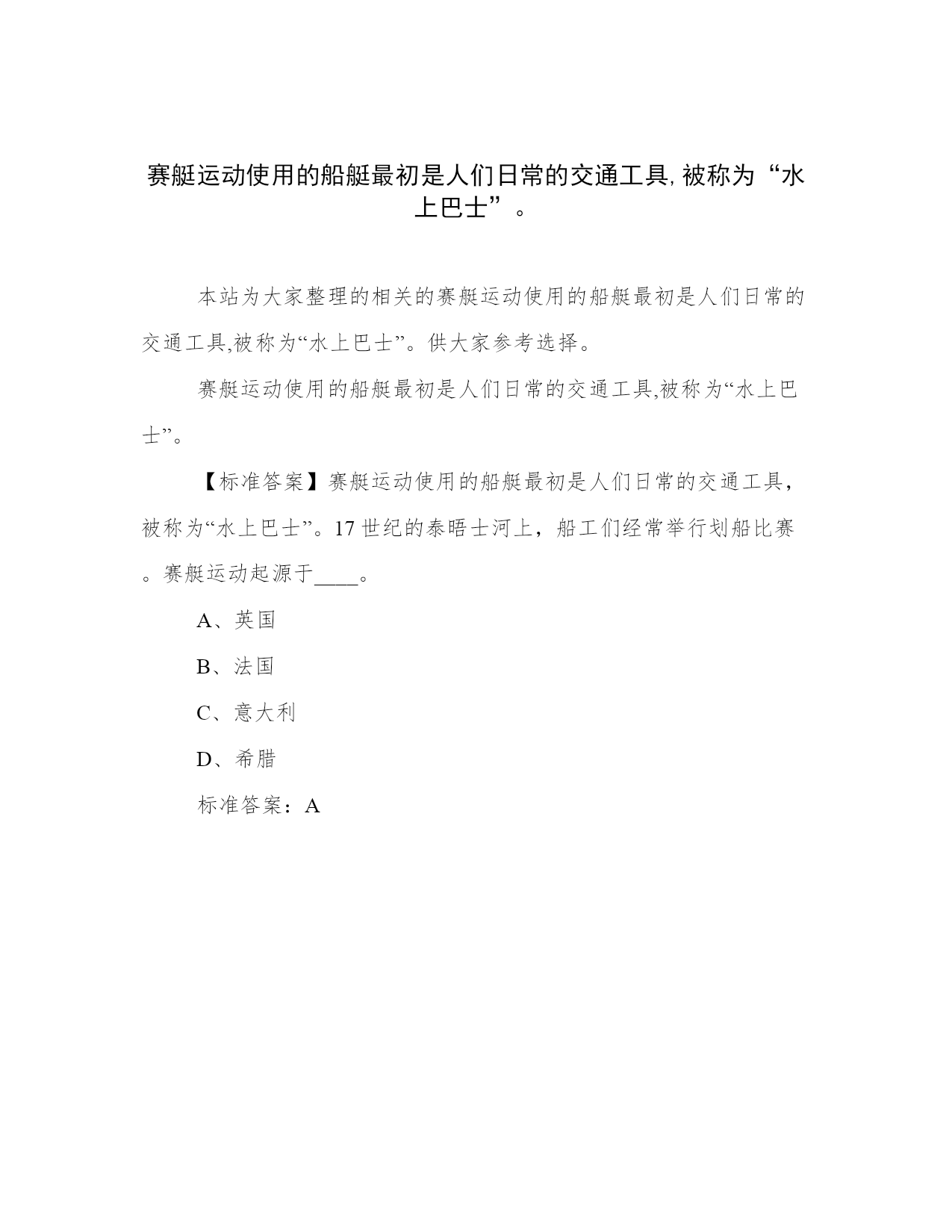 赛艇运动使用的船艇最初是人们日常的交通工具,被称为“水上巴士”。本站为大家整理的相关的赛艇运动使用的船艇最初是人们日常的交通工具,被称为“水上巴士”。供大家参考选择。赛艇运动使用的船艇最初是人们日常的交通工具,被称为“水上巴士”。【标准答案】赛艇运动使用的船艇最初是人们日常的交通工具,被称为“水上巴士”。17世纪的泰晤士河上,船工们经常举行划船比赛。赛艇运动起源于____。A、英国B、法国C、意大利D、希腊标准答案:A