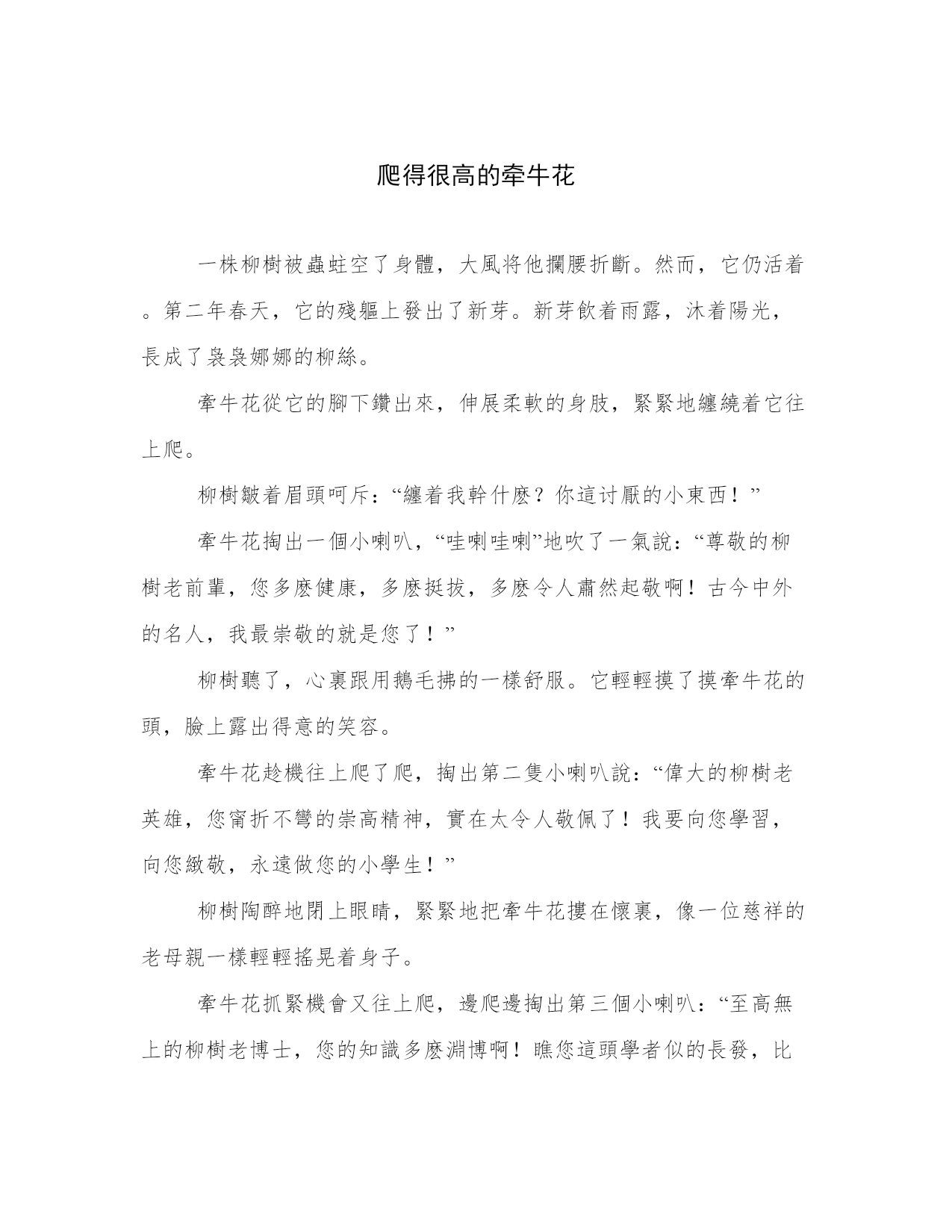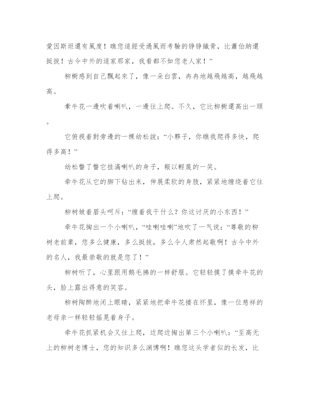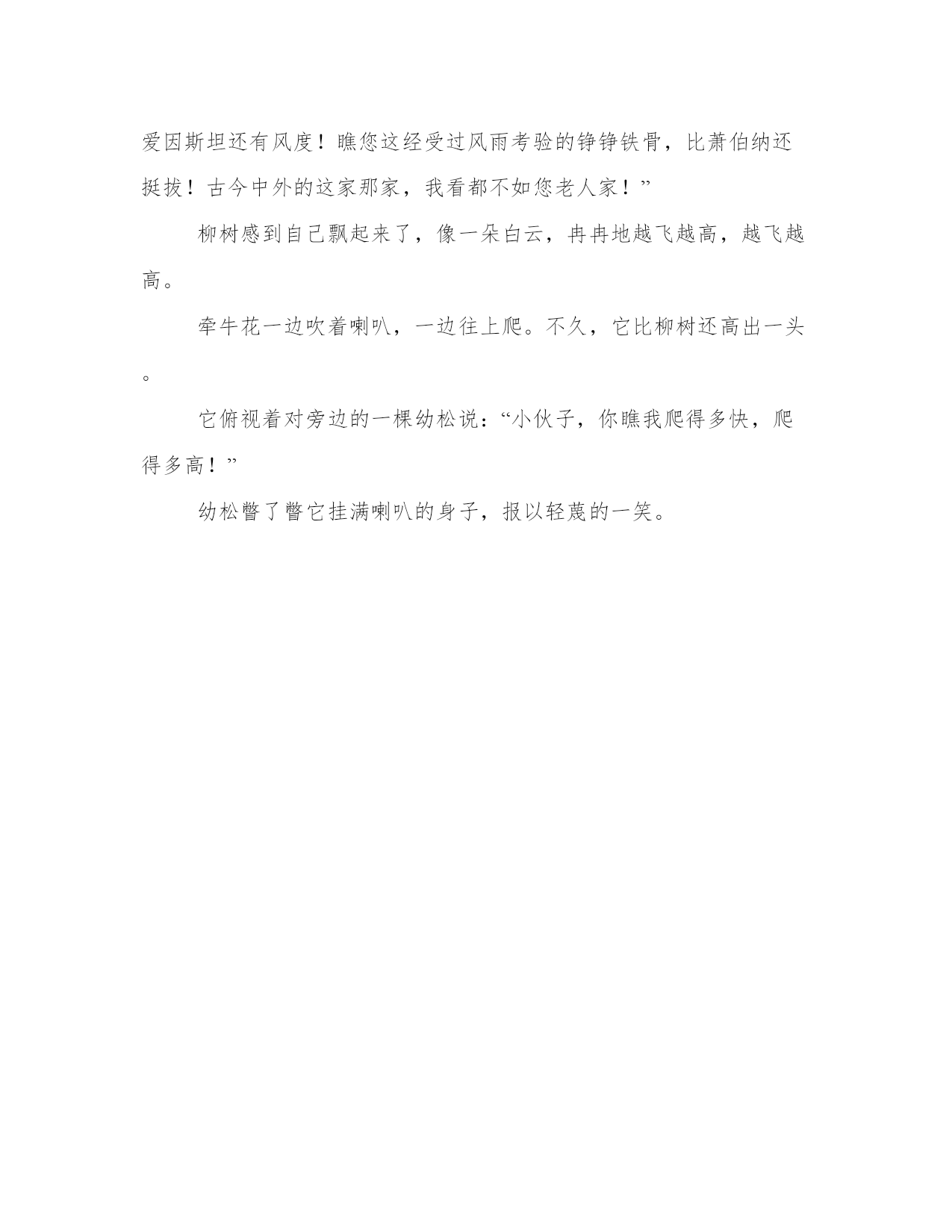 爬得很高的牵牛花一株柳樹被蟲蛀空了身體,大風将他攔腰折斷。然而,它仍活着。第二年春天,它的殘軀上發出了新芽。新芽飲着雨露,沐着陽光,長成了袅袅娜娜的柳絲。牽牛花從它的腳下鑽出來,伸展柔軟的身肢,緊緊地纏繞着它往上爬。柳樹皺着眉頭呵斥:“纏着我幹什麽?你這讨厭的小東西!”牽牛花掏出一個小喇叭,“哇喇哇喇”地吹了一氣說:“尊敬的柳樹老前輩,您多麽健康,多麽挺拔,多麽令人肅然起敬啊!古今中外的名人,我最崇敬的就是您了!”柳樹聽了,心裏跟用鵝毛拂的一樣舒服。它輕輕摸了摸牽牛花的頭,臉上露出得意的笑容。牽牛花趁機往上爬了爬,掏出第二隻小喇叭說:“偉大的柳樹老英雄,您甯折不彎的崇高精神,實在太令人敬佩了!我要向您學習,向您緻敬,永遠做您的小學生!”柳樹陶醉地閉上眼睛,緊緊地把牽牛花摟在懷裏,像一位慈祥的老母親一樣輕輕搖晃着身子。牽牛花抓緊機會又往上爬,邊爬邊掏出第三個小喇叭:“至高無上的柳樹老博士,您的知識多麽淵博啊!瞧您這頭學者似的長發,比愛因斯坦還有風度!瞧您這經受過風雨考驗的铮铮鐵骨,比蕭伯納還挺拔!古今中外的這家那家,我看都不如您老人家!”柳樹感到自己飄起來了,像一朵白雲,冉冉地越飛越高,越飛越高。牽牛花一邊吹着喇叭,一邊往上爬。不久,它比柳樹還高出一頭。它俯視着對旁邊的一棵幼松說:“小夥子,你瞧我爬得多快,爬得多高!”幼松瞥了瞥它挂滿喇叭的身子,報以輕蔑的一笑。牵牛花从它的脚下钻出来,伸展柔软的身肢,紧紧地缠绕着它往上爬。柳树皱着眉头呵斥:“缠着我干什么?你这讨厌的小东西!”牵牛花掏出一个小喇叭,“哇喇哇喇”地吹了一气说:“尊敬的柳树老前辈,您多么健康,多么挺拔,多么令人肃然起敬啊!古今中外的名人,我最崇敬的就是您了!”柳树听了,心里跟用鹅毛拂的一样舒服。它轻轻摸了摸牵牛花的头,脸上露出得意的笑容。柳树陶醉地闭上眼睛,紧紧地把牵牛花搂在怀里,像一位慈祥的老母亲一样轻轻摇晃着身子。牵牛花抓紧机会又往上爬,边爬边掏出第三个小喇叭:“至高无上的柳树老博士,您的知识多么渊博啊!瞧您这头学者似的长发,比爱因斯坦还有风度!瞧您这经受过风雨考验的铮铮铁骨,比萧伯纳还挺拔!古今中外的这家那家,我看都不如您老人家!”柳树感到自己飘起来了,像一朵白云,冉冉地越飞越高,越飞越高。牵牛花一边吹着喇叭,一边往上爬。不久,它比柳树还高出一头。它俯视着对旁边的一棵幼松说:“小伙子,你瞧我爬得多快,爬得多高!”幼松瞥了瞥它挂满喇叭的身子,报以轻蔑的一笑。