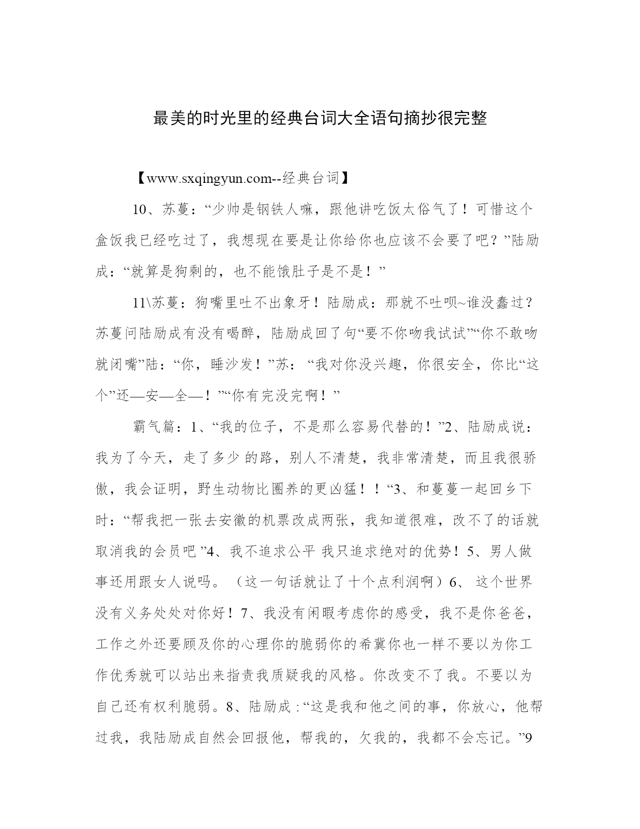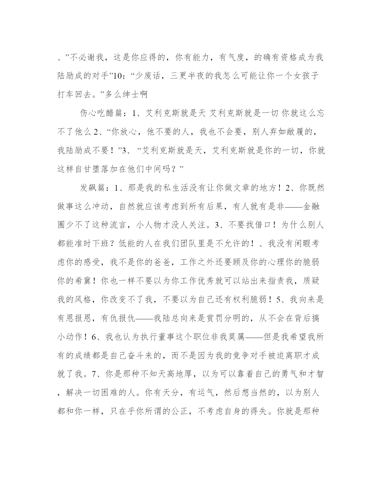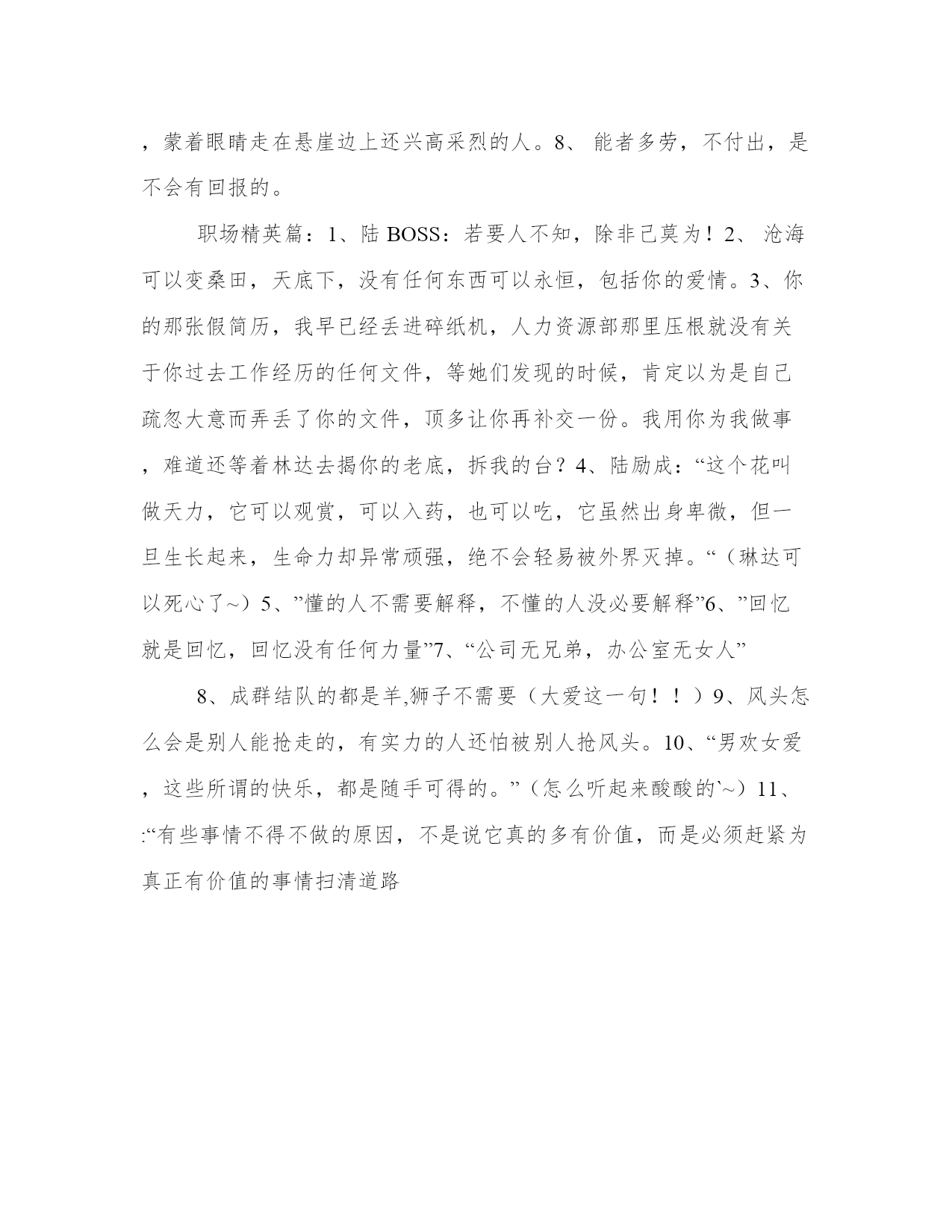 最美的时光里的经典台词大全语句摘抄很完整【www.sxqingyun.com--经典台词】10、苏蔓:“少帅是钢铁人嘛,跟他讲吃饭太俗气了!可惜这个盒饭我已经吃过了,我想现在要是让你给你也应该不会要了吧?”陆励成:“就算是狗剩的,也不能饿肚子是不是!”11\苏蔓:狗嘴里吐不出象牙!陆励成:那就不吐呗~谁没蠢过?苏蔓问陆励成有没有喝醉,陆励成回了句“要不你吻我试试”“你不敢吻就闭嘴”陆:“你,睡沙发!”苏:“我对你没兴趣,你很安全,你比“这个”还—安—全—!”“你有完没完啊!”霸气篇:1、“我的位子,不是那么容易代替的!”2、陆励成说:我为了今天,走了多少的路,别人不清楚,我非常清楚,而且我很骄傲,我会证明,野生动物比圈养的更凶猛!!“3、和蔓蔓一起回乡下时:“帮我把一张去安徽的机票改成两张,我知道很难,改不了的话就取消我的会员吧”4、我不追求公平我只追求绝对的优势!5、男人做事还用跟女人说吗。(这一句话就让了十个点利润啊)6、这个世界没有义务处处对你好!7、我没有闲暇考虑你的感受,我不是你爸爸,工作之外还要顾及你的心理你的脆弱你的希冀你也一样不要以为你工作优秀就可以站出来指责我质疑我的风格。你改变不了我。不要以为自己还有权利脆弱。8、陆励成:“这是我和他之间的事,你放心,他帮过我,我陆励成自然会回报他,帮我的,欠我的,我都不会忘记。”9、”不必谢我,这是你应得的,你有能力,有气度,的确有资格成为我陆励成的对手”10:“少废话,三更半夜的我怎么可能让你一个女孩子打车回去。”多么绅士啊伤心吃醋篇:1、艾利克斯就是天艾利克斯就是一切你就这么忘不了他么2、“你放心,他不要的人,我也不会要,别人弃如敝履的,我陆励成不要!”3、“艾利克斯就是天,艾利克斯就是你的一切,你就这样自甘堕落加在他们中间吗?”发飙篇:1、那是我的私生活没有让你做文章的地方!2、你既然做事这么冲动,自然就应该考虑到所有后果,有人就有是非——金融圈少不了这种流言,小人物才没人关注。3、不要找借口!为什么别人都能准时下班?低能的人在我们团队里是不允许的!、我没有闲暇考虑你的感受,我不是你的爸爸,工作之外还要顾及你的心理你的脆弱你的希冀!你也一样不要以为你工作优秀就可以站出来指责我,质疑我的风格,你改变不了我,不要以为自己还有权利脆弱!5、我向来是有恩报恩,有仇报仇——我陆总向来是赏罚分明的,从不会在背后搞小动作!6、我也认为执行董事这个职位非我莫属——但是我希望我所有的成绩都是自己奋斗来的,而不是因为我的竞争对手被迫离职才成就了我。7、你是那种不知天高地厚,以为可以靠着自己的勇气和才智,解决一切困难的人。你有天分,有运气,然后想当然的,以为别人都和你一样,只在乎你所谓的公正,不考虑自身的得失。你就是那种,蒙着眼睛走在悬崖边上还兴高采烈的人。8、能者多劳,不付出,是不会有回报的。职场精英篇:1、陆BOSS:若要人不知,除非己莫为!2、沧海可以变桑田,天底下,没有任何东西可以永恒,包括你的爱情。3、你的那张假简历,我早已经丢进碎纸机,人力资源部那里压根就没有关于你过去工作经历的任何文件,等她们发现的时候,肯定以为是自己疏忽大意而弄丢了你的文件,顶多让你再补交一份。我用你为我做事,难道还等着林达去揭你的老底,拆我的台?4、陆励成:“这个花叫做天力,它可以观赏,可以入药,也可以吃,它虽然出身卑微,但一旦生长起来,生命力却异常顽强,绝不会轻易被外界灭掉。“(琳达可以死心了~)5、”懂的人不需要解释,不懂的人没必要解释”6、”回忆就是回忆,回忆没有任何力量”7、“公司无兄弟,办公室无女人”8、成群结队的都是羊,狮子不需要(大爱这一句!!)9、风头怎么会是别人能抢走的,有实力的人还怕被别人抢风头。10、“男欢女爱,这些所谓的快乐,都是随手可得的。”(怎么听起来酸酸的`~)11、:“有些事情不得不做的原因,不是说它真的多有价值,而是必须赶紧为真正有价值的事情扫清道路