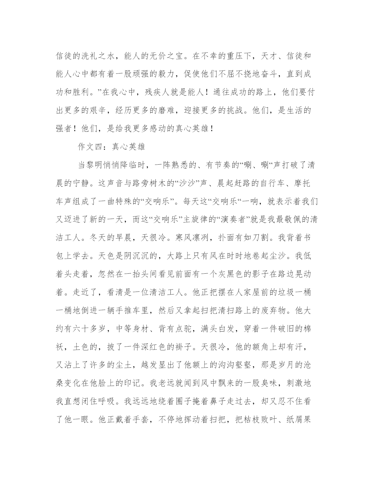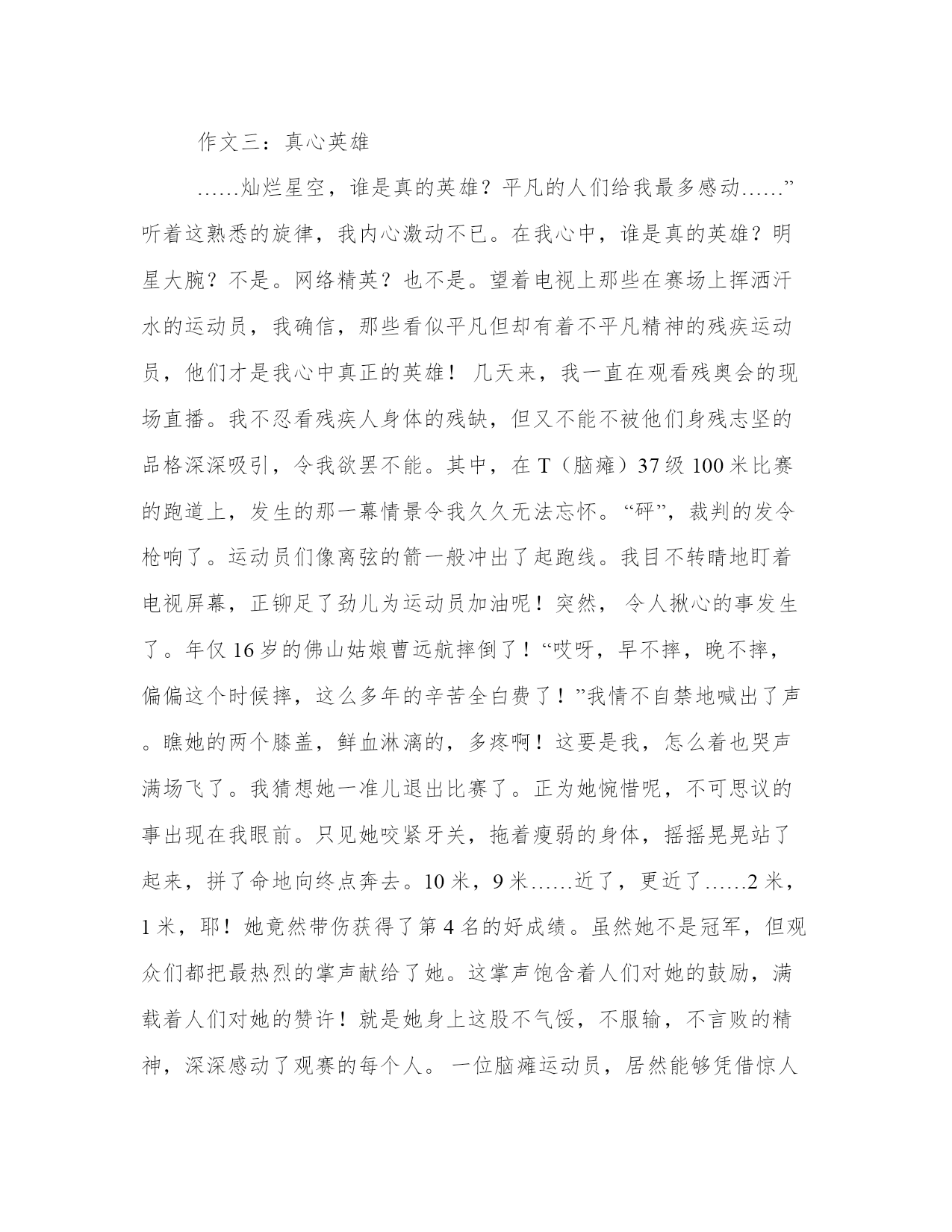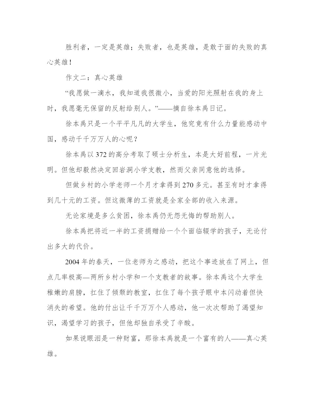 真心英雄作文【www.sxqingyun.com--小学作文】作文一:真心英雄“不经历风雨,怎么见彩虹,没有人可以随随便便成功。”这是我最喜欢的《真心英雄》里面的歌词,以前,我对于这首歌只不过是简单听听,可是,在这周的小组长竞选中,我明白了这首歌的真谛!“开始竞选,请否决六名同学,”听到鲁老师的宣布后,我心里很激动的想:最后一刻来了,虽说这几个人都是学校里的佼佼者,但以我在上期期考中的3A成绩,拿下这个学习组长应该还是没有问题的。接着,同学们开始投反对票了。“朱颖,应为她……”“杨薇,因为她……”渐渐地,黑板上只剩下我和其他十一位同学的名字了,我心里忐忑不安的想:到底会是谁呢?……这是,一位同学站起来说:“淘汰罗杰仁,因为他没有太好的卫生习惯”这时,同学们议论纷纷……不过最后,我还是没能当上学习组长。当时,我的心到了崩溃的边缘,差点儿就哭了出来……下课后,我一个人静静的坐在座位上“不经历风雨,怎么见彩虹,没有人可以随随便便成功!”突然,我的耳畔回响着《真心英雄》的歌词。是啊!不经历风雨,怎么见彩虹!这次的失败也是对我的一次警告,让我做到最好。放学时,鲁老师还和我稍稍进行了沟通,这还让我更加端正了对待这次失败的态度。胜利者,一定是英雄;失败者,也是英雄,是敢于面的失败的真心英雄!作文二:真心英雄“我愿做一滴水,我知道我很微小,当爱的阳光照射在我的身上时,我愿毫无保留的反射给别人。”——摘自徐本禹日记。徐本禹只是一个平平凡凡的大学生,他究竟有什么力量能感动中国,感动千千万万人的心呢?徐本禹以372的高分考取了硕士分析生,本是大好前程,一片光明。但他却毅然决定回岩洞小学支教,然而父亲同意他的选择。但做乡村的小学老师一个月才拿得到270多元。甚至有时才拿得到几十元的工资。但这微薄的工资就是全家全部的收入来源。无论家境是多么贫困,徐本禹仍无怨无悔的帮助别人。徐本禹把将近一半的工资捐赠给一个个面临辍学的孩子,无论付出多大的代价。2004年的春天,一位老师为之感动,把这个事迹放在了网上,但点几率极高―两所乡村小学和一个支教者的故事。徐本禹这个大学生稚嫩的肩膀,扛住了倾颓的教室,扛住了每个孩子眼中本闪动着但快消失的希望。他的付出让千千万万个人感动,他一次次帮助了渴望知识,渴望学习的孩子,但他却独自承受了辛酸。如果说眼泪是一种财富,那徐本禹就是一个富有的人——真心英雄。作文三:真心英雄……灿烂星空,谁是真的英雄?平凡的人们给我最多感动……”听着这熟悉的旋律,我内心激动不已。在我心中,谁是真的英雄?明星大腕?不是。网络精英?也不是。望着电视上那些在赛场上挥洒汗水的运动员,我确信,那些看似平凡但却有着不平凡精神的残疾运动员,他们才是我心中真正的英雄!几天来,我一直在观看残奥会的现场直播。我不忍看残疾人身体的残缺,但又不能不被他们身残志坚的品格深深吸引,令我欲罢不能。其中,在T(脑瘫)37级100米比赛的跑道上,发生的那一幕情景令我久久无法忘怀。“砰”,裁判的发令枪响了。运动员们像离弦的箭一般冲出了起跑线。我目不转睛地盯着电视屏幕,正铆足了劲儿为运动员加油呢!突然,令人揪心的事发生了。年仅16岁的佛山姑娘曹远航摔倒了!“哎呀,早不摔,晚不摔,偏偏这个时候摔,这么多年的辛苦全白费了!”我情不自禁地喊出了声。瞧她的两个膝盖,鲜血淋漓的,多疼啊!这要是我,怎么着也哭声满场飞了。我猜想她一准儿退出比赛了。正为她惋惜呢,不可思议的事出现在我眼前。只见她咬紧牙关,拖着瘦弱的身体,摇摇晃晃站了起来,拼了命地向终点奔去。10米,9米……近了,更近了……2米,1米,耶!她竟然带伤获得了第4名的好成绩。虽然她不是冠军,但观众们都把最热烈的掌声献给了她。这掌声饱含着人们对她的鼓励,满载着人们对她的赞许!就是她身上这股不气馁,不服输,不言败的精神,深深感动了观赛的每个人。一位脑瘫运动员,居然能够凭借惊人的勇气跌倒了爬起来,重新投入比赛,最终取得佳绩。这是怎样的一股韧劲儿支撑着她啊!那一刻,我明白了“坚持到底就是胜利!”这句话的真正含义;那一刻,我脑海中再次浮现出台湾残疾歌手郑智化架着双拐,铿锵有力地唱响《水手》的情景:“……他说风雨中这点痛算什么,擦干泪,不要怕,至少我们还有梦……”是啊,残疾人在他们人生的风雨之路上无数次地跌倒过,但这点儿伤痛又算得了什么呢?与他们心中那渴望自由,渴望平等,渴望尊重,渴望像正常人一样自强不息生活的梦相比,肉体上的痛苦的确算不了什么!他们凭借自身顽强拼搏的精神,挑战极限的毅力,超越自我的信念跌倒了,爬起来,再跌倒,再爬起来……在生活中,在工作中,在追寻人生梦想的跑道上,在实现生命价值的事业中……肉体上,他们是残疾人;精神上,他们和健全人一样,同在一片蓝天下,共处一个世界中,追逐梦想,满怀希望。尽管上帝为他们关上了一扇健康的门,但他们用百倍于常