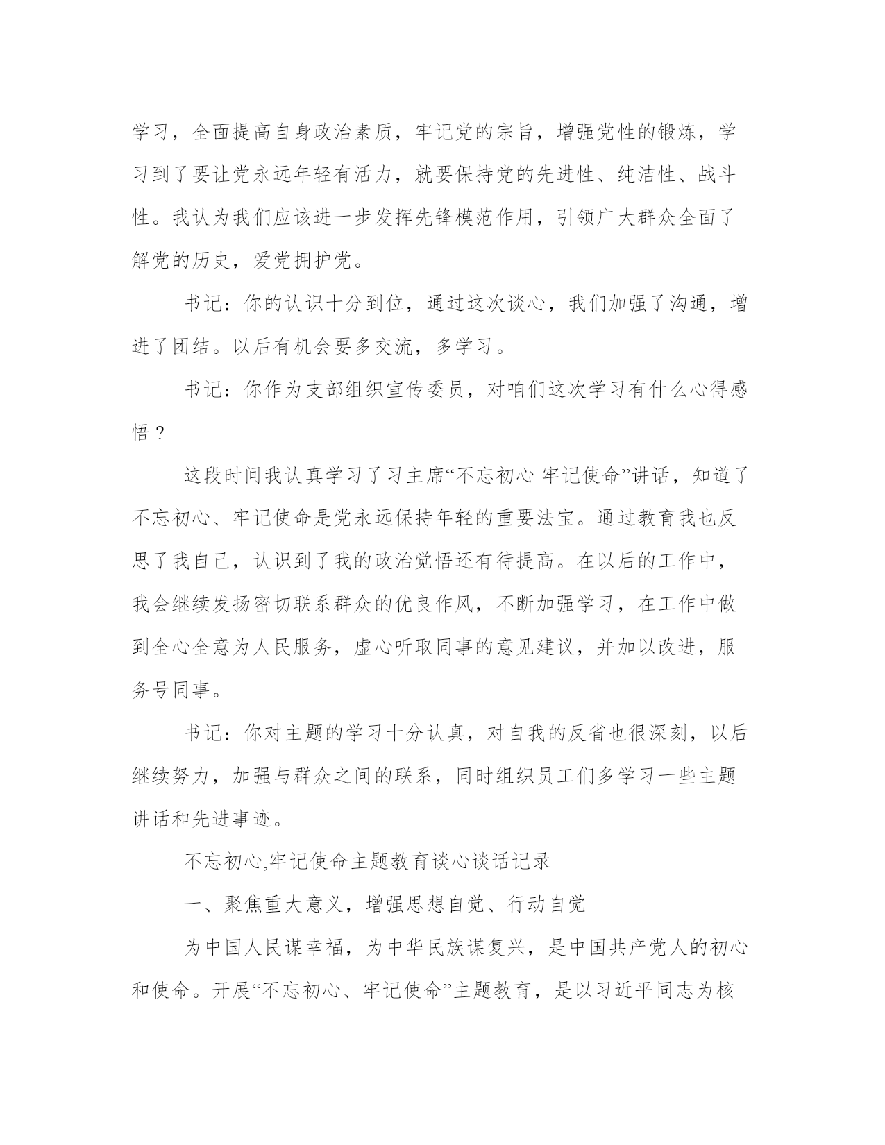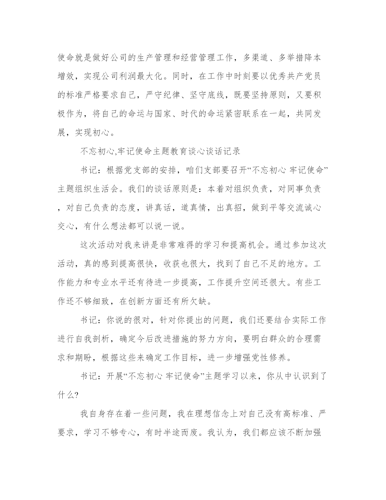 不忘初心,牢记使命主题教育谈心谈话记录初心就是情怀,使命就是担当。初心和使命是一个人、一个民族、一个政党不断前进的根本动力。本站精心为大家整理了不忘初心,牢记使命主题教育谈心谈话记录,希望对你有帮助。不忘初心,牢记使命主题教育谈心谈话记录LD:同志,请对我一贯表现作出评价,并对我提出要求和需要改进的地方。yg:ld,您作为我的分管领导和电气工程技术的专家,在您身上我看到了“活到老学到老”的钻研精神,您对学习的热忱和对专业的严谨让我很佩服。您时常强调在工作中要严格遵守国家的法律法规和集团以及公司的规章制度,严控经营风险,让我受益匪浅。在对分管部门的管理中,您注重实事求是和以人为本,以身作则,清正廉洁,我从心底非常敬重您。我希望您在今后的工作中能在专业上给我们更多的指导和帮助,尤其是电气工程技术方面。也希望您继续加强对公司新兴业务专业知识的学习和分析,对我们提供更多的指导和帮助。ld:请结合“不忘初心,牢记使命”主题教育,谈谈自己的看法?yg:“不忘初心,牢记使命”主题教育让我思考了很多,我们当初奔着公司来的初心是什么?就是要在sc的环保领域作出自己的一点成绩,把我们公司发展好,经营好,成为能投集团环保产业的一面旗帜,员工有成就感、获得感和幸福感。作为公司的生产经营部门,我们的使命就是做好公司的生产管理和经营管理工作,多渠道、多举措降本增效,实现公司利润最大化。同时,在工作中时刻要以优秀共产党员的标准严格要求自己,严守纪律、坚守底线,既要坚持原则,又要积极作为,将自己的命运与国家、时代的命运紧密联系在一起,共同发展,实现初心。不忘初心,牢记使命主题教育谈心谈话记录书记:根据党支部的安排,咱们支部要召开“不忘初心牢记使命”主题组织生活会。我们的谈话原则是:本着对组织负责,对同事负责,对自己负责的态度,讲真话,道真情,出真招,做到平等交流诚心交心,有什么想法都可以说一说。这次活动对我来讲是非常难得的学习和提高机会。通过参加这次活动,真的感到提高很快,收获也很大,找到了自己不足的地方。工作能力和专业水平还有待进一步提高,工作提升空间还很大。有些工作还不够细致,在创新方面还有所欠缺。书记:你说的很对,针对你提出的问题,我们还要结合实际工作进行自我剖析,确定今后改进措施的努力方向,要明白群众的合理需求和期盼,根据这些来确定工作目标,进一步增强党性修养。书记:开展“不忘初心牢记使命”主题学习以来,你从中认识到了什么?我自身存在着一些问题,我在理想信念上对自己没有高标准、严要求,学习不够专心,有时半途而废。我认为,我们都应该不断加强学习,全面提高自身政治素质,牢记党的宗旨,增强党性的锻炼,学习到了要让党永远年轻有活力,就要保持党的先进性、纯洁性、战斗性。我认为我们应该进一步发挥先锋模范作用,引领广大群众全面了解党的历史,爱党拥护党。书记:你的认识十分到位,通过这次谈心,我们加强了沟通,增进了团结。以后有机会要多交流,多学习。书记:你作为支部组织宣传委员,对咱们这次学习有什么心得感悟?这段时间我认真学习了习主席“不忘初心牢记使命”讲话,知道了不忘初心、牢记使命是党永远保持年轻的重要法宝。通过教育我也反思了我自己,认识到了我的政治觉悟还有待提高。在以后的工作中,我会继续发扬密切联系群众的优良作风,不断加强学习,在工作中做到全心全意为人民服务,虚心听取同事的意见建议,并加以改进,服务号同事。书记:你对主题的学习十分认真,对自我的反省也很深刻,以后继续努力,加强与群众之间的联系,同时组织员工们多学习一些主题讲话和先进事迹。不忘初心,牢记使命主题教育谈心谈话记录一、聚焦重大意义,增强思想自觉、行动自觉为中国人民谋幸福,为中华民族谋复兴,是中国共产党人的初心和使命。开展“不忘初心、牢记使命”主题教育,是以习近平同志为核心的党中央作出的重大部署,意义重大、影响深远。要深化认识,增强思想自觉、行动自觉。——“不忘初心、牢记使命”是信心所在。信心是信仰之心、信任之心。中国共产党从诞生之日起就把马克思主义写在自己的旗帜上,一路走来从未动摇对马克思主义的坚定信仰。习近平新时代中国特色社会主义思想,是当代中国马克思主义、21世纪马克思主义,是党和国家必须长期坚持的指导思想。有以习近平同志为核心的党中央坚强领导,有习近平新时代中国特色社会主义思想的科学指引,我们对实现新时代党的伟大使命充满必胜信心。开展主题教育,就是要用习近平新时代中国特色社会主义思想武装全党,不断增强“四个意识”、坚定“四个自信”、做到“两个维护”,坚定不移走中国特色社会主义道路,为实现中华民族伟大复兴的中国梦而努力奋斗。——“不忘初心、牢记使命”是党心所系。先进性和纯洁性是马克思主义政党的本质属性,是永远不能改变的党心。坚守初心是维护党心的永恒主题。中国特色社会主义进入新时代,各项事业蒸蒸日上,但要
