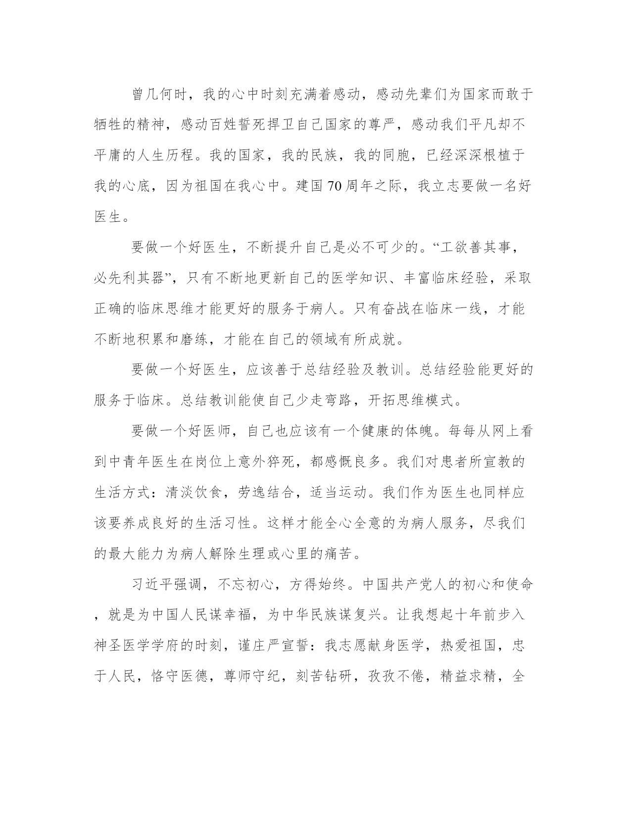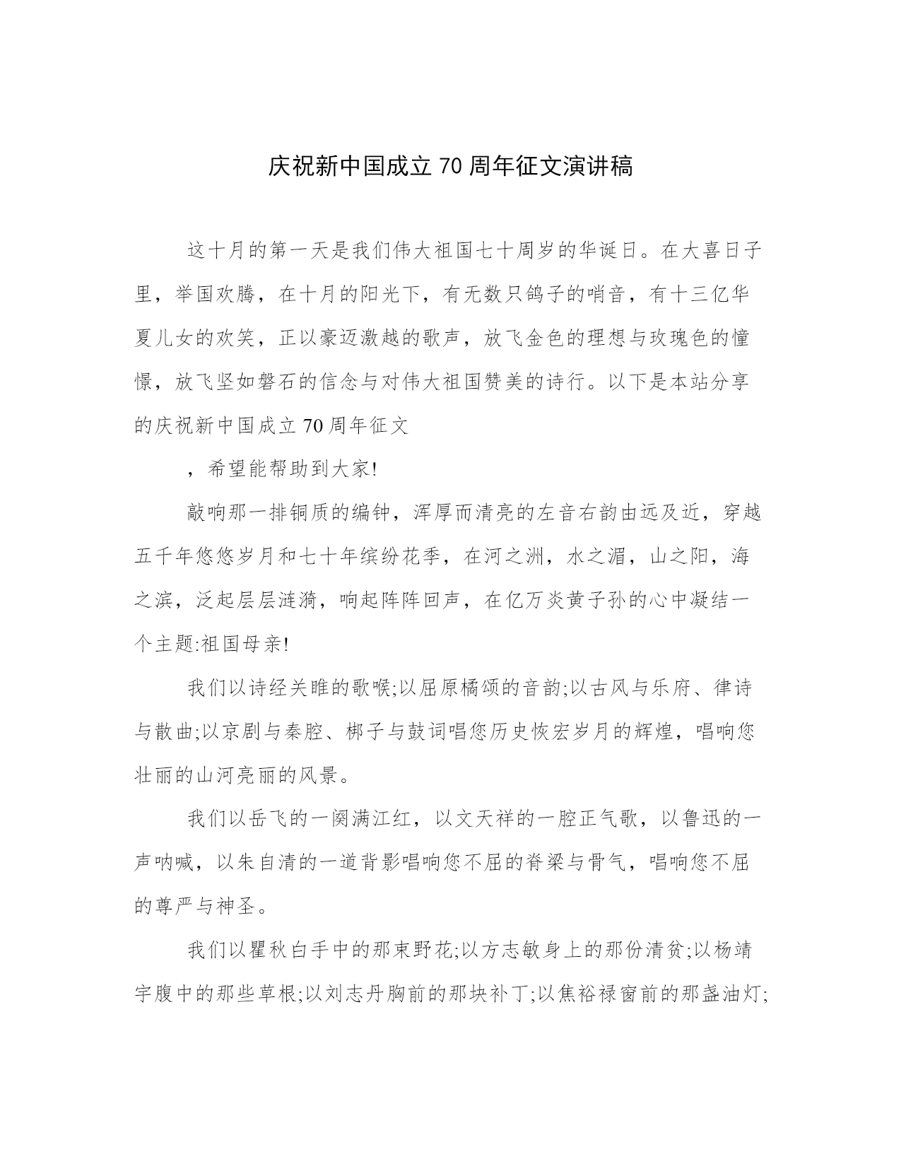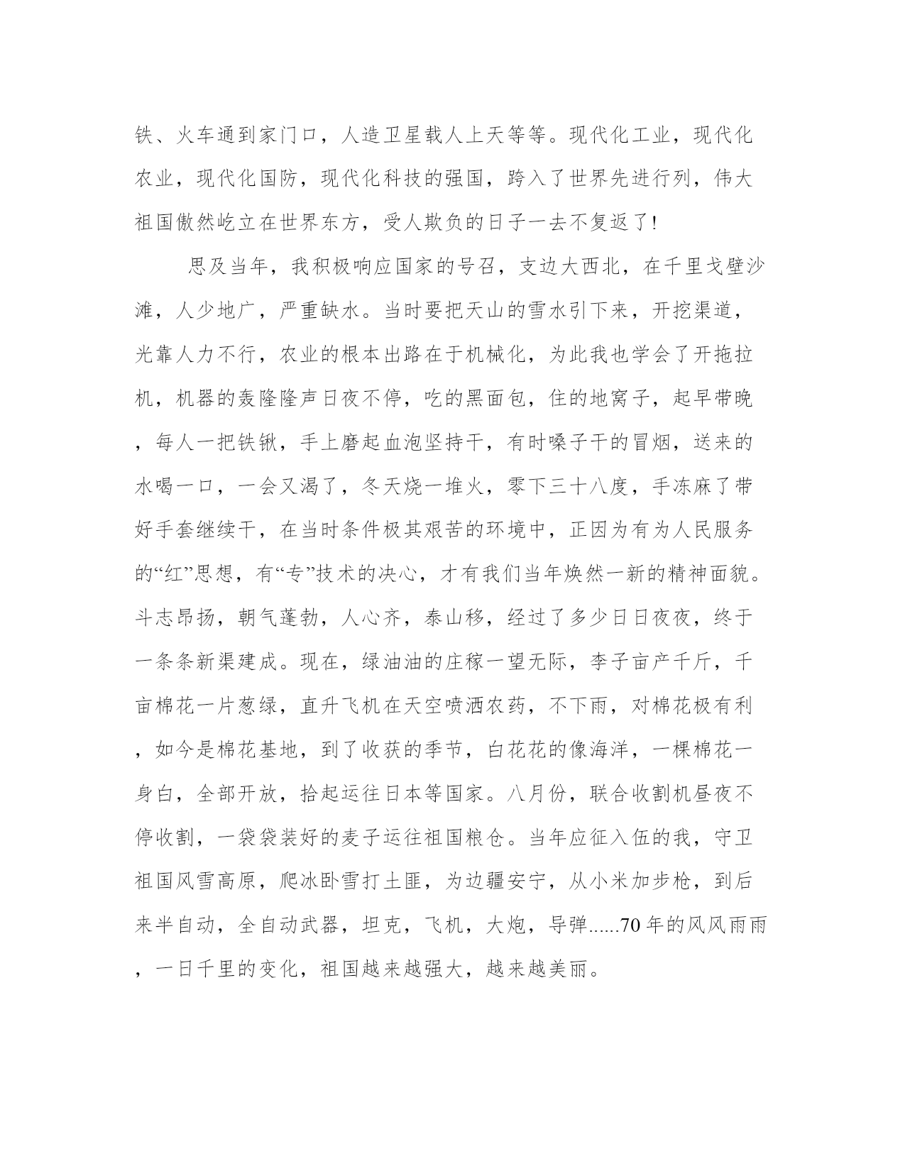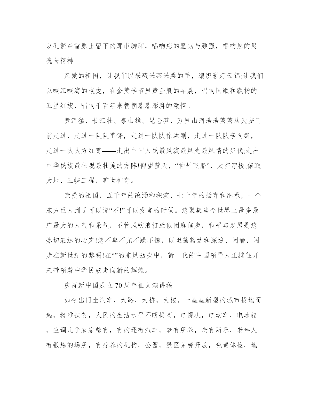 庆祝新中国成立70周年征文演讲稿这十月的第一天是我们伟大祖国七十周岁的华诞日。在大喜日子里,举国欢腾,在十月的阳光下,有无数只鸽子的哨音,有十三亿华夏儿女的欢笑,正以豪迈激越的歌声,放飞金色的理想与玫瑰色的憧憬,放飞坚如磐石的信念与对伟大祖国赞美的诗行。以下是本站分享的庆祝新中国成立70周年征文,希望能帮助到大家!敲响那一排铜质的编钟,浑厚而清亮的左音右韵由远及近,穿越五千年悠悠岁月和七十年缤纷花季,在河之洲,水之湄,山之阳,海之滨,泛起层层涟漪,响起阵阵回声,在亿万炎黄子孙的心中凝结一个主题:祖国母亲!我们以诗经关睢的歌喉;以屈原橘颂的音韵;以古风与乐府、律诗与散曲;以京剧与秦腔、梆子与鼓词唱您历史恢宏岁月的辉煌,唱响您壮丽的山河亮丽的风景。我们以岳飞的一阕满江红,以文天祥的一腔正气歌,以鲁迅的一声呐喊,以朱自清的一道背影唱响您不屈的脊梁与骨气,唱响您不屈的尊严与神圣。我们以瞿秋白手中的那束野花;以方志敏身上的那份清贫;以杨靖宇腹中的那些草根;以刘志丹胸前的那块补丁;以焦裕禄窗前的那盏油灯;以孔繁森雪原上留下的那串脚印,唱响您的坚韧与顽强,唱响您的灵魂与精神。亲爱的祖国,让我们以采薇采茶采桑的手,编织彩灯云锦;让我们以喊江喊海的喉咙,在金黄季节里黄金般的早晨,唱响国歌和飘扬的五星红旗,唱响千百年来朝朝暮暮澎湃的激情。黄河猛、长江壮、泰山雄、昆仑莽,万里山河浩浩荡荡从天安门前走过,走过一队队雷锋,走过一队队徐洪刚,走过一队队李向群,走过一队队方红霄——走出中国人民最风流最风光最风情的步伐;走出中华民族最壮观最壮美的方阵!仰望蓝天,“神州飞船”,太空穿梭;俯瞰大地、三峡工程,旷世神奇。亲爱的祖国,五千年的蕴涵和积淀,七十年的扬弃和继承,一个东方巨人到了可以说“不!”可以发言的时候。您聚集当今世界上最多最广最大的人气和景气,不管风吹浪打胜似闲庭信步,和平与发展是您热切表达的心声!您不卑不亢不躁不惊,以坦荡豁达和深邃、闲静,阔步在新世纪的黎明!在“”的东风劲吹中,新一代的中国领导人正继往开来带领着中华民族走向新的辉煌。庆祝新中国成立70周年征文演讲稿如今出门坐汽车,大路,大桥,大楼,一座座新型的城市拔地而起,精准扶贫,人民的生活水平不断提高,电视机,电动车,电冰箱,空调几乎家家都有,有的还有汽车,老有所养,老有所乐,老年人有锻炼的场所,有疗养的机构,公园,景区免费开放,免费体检,地铁、火车通到家门口,人造卫星载人上天等等。现代化工业,现代化农业,现代化国防,现代化科技的强国,跨入了世界先进行列,伟大祖国傲然屹立在世界东方,受人欺负的日子一去不复返了!思及当年,我积极响应国家的号召,支边大西北,在千里戈壁沙滩,人少地广,严重缺水。当时要把天山的雪水引下来,开挖渠道,光靠人力不行,农业的根本出路在于机械化,为此我也学会了开拖拉机,机器的轰隆隆声日夜不停,吃的黑面包,住的地窝子,起早带晚,每人一把铁锹,手上磨起血泡坚持干,有时嗓子干的冒烟,送来的水喝一口,一会又渴了,冬天烧一堆火,零下三十八度,手冻麻了带好手套继续干,在当时条件极其艰苦的环境中,正因为有为人民服务的“红”思想,有“专”技术的决心,才有我们当年焕然一新的精神面貌。斗志昂扬,朝气蓬勃,人心齐,泰山移,经过了多少日日夜夜,终于一条条新渠建成。现在,绿油油的庄稼一望无际,李子亩产千斤,千亩棉花一片葱绿,直升飞机在天空喷洒农药,不下雨,对棉花极有利,如今是棉花基地,到了收获的季节,白花花的像海洋,一棵棉花一身白,全部开放,拾起运往日本等国家。八月份,联合收割机昼夜不停收割,一袋袋装好的麦子运往祖国粮仓。当年应征入伍的我,守卫祖国风雪高原,爬冰卧雪打土匪,为边疆安宁,从小米加步枪,到后来半自动,全自动武器,坦克,飞机,大炮,导弹......70年的风风雨雨,一日千里的变化,祖国越来越强大,越来越美丽。曾几何时,我的心中时刻充满着感动,感动先辈们为国家而敢于牺牲的精神,感动百姓誓死捍卫自己国家的尊严,感动我们平凡却不平庸的人生历程。我的国家,我的民族,我的同胞,已经深深根植于我的心底,因为祖国在我心中。建国70周年之际,我立志要做一名好医生。要做一个好医生,不断提升自己是必不可少的。“工欲善其事,必先利其器”,只有不断地更新自己的医学知识、丰富临床经验,采取正确的临床思维才能更好的服务于病人。只有奋战在临床一线,才能不断地积累和磨练,才能在自己的领域有所成就。要做一个好医生,应该善于总结经验及教训。总结经验能更好的服务于临床。总结教训能使自己少走弯路,开拓思维模式。要做一个好医师,自己也应该有一个健康的体魄。每每从网上看到中青年医生在岗位上意外猝死,都感慨良多。我们对患者所宣教的生活方式:清淡饮食,劳逸结合,适当运动。我们作为医生也同样应该要养成良好的生活习性。这样才能全心全意的为病人