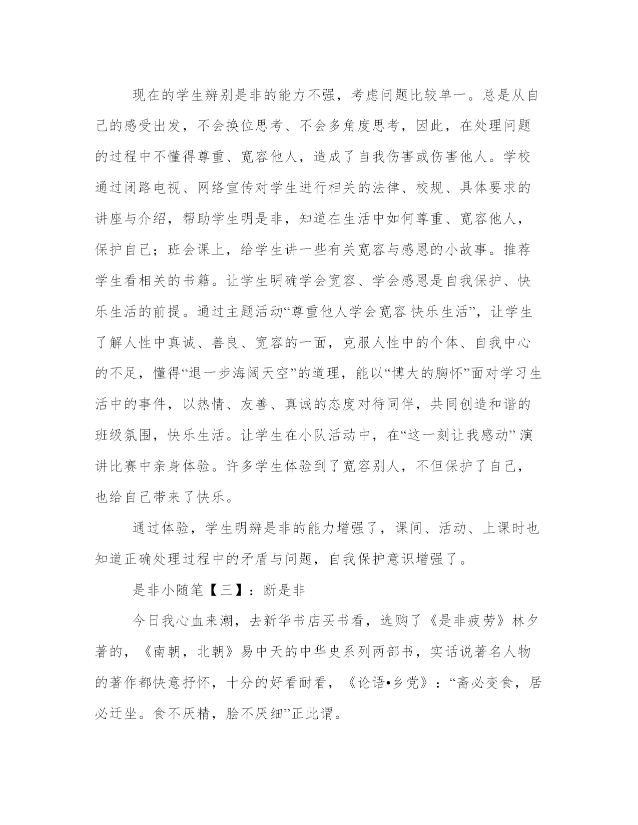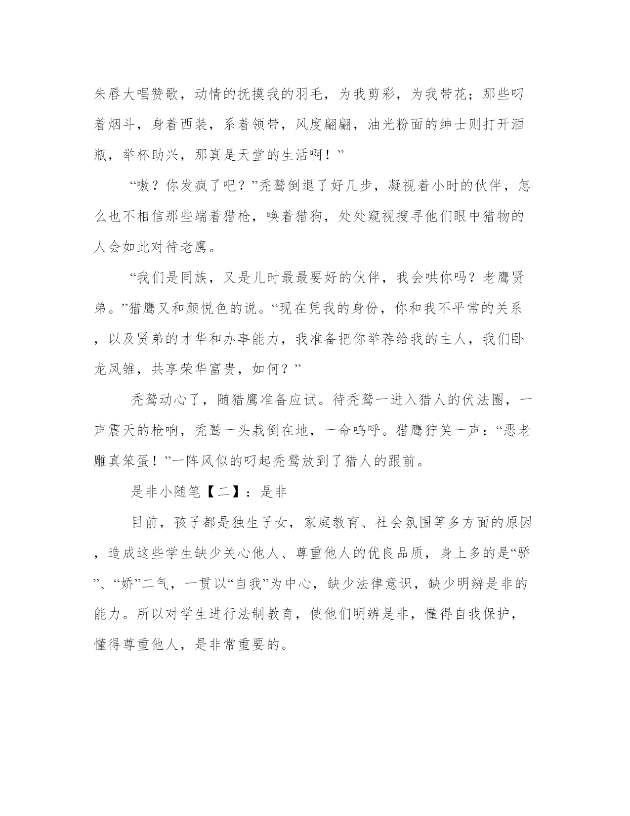 【是非小说免费阅读】是非小随笔【www.sxqingyun.com--励志故事】是非小随笔【一】:分辨是非一只被猎人驯化的老鹰遇见了森林中的故友秃鹫,两个森林中的斗士互吐衷肠,呱呱而谈。“老鹫贤弟,”猎鹰说。“饥一蹲饱一顿的生活并没有消磨掉你的意志,你照旧意气风发,精神勃勃,真令我敬佩啊!”“咳,老鹰大哥。”秃鹫答道。“自从你落入猎人的手掌之后,我多担心啊,人们称我为恶老雕,称你为恶鹰,的确我们这外貌真叫同类们望而生畏,毛骨悚然,带钩的嘴巴,锐利的双爪,放绿光的眼睛,好事不做,坏事做绝,你落入了他们手中,不落个剥皮抽筋,丢入火锅油炸才怪!而你竟然能平安归来,真谢天谢地,你是怎样脱身的呢?”“天有不测风云,人有旦夕祸福!”猎鹰梳了梳油光发亮的羽毛。“实不相满贤弟,我不慎落入他们的网中之后,我也认为必死无疑,拼命挣扎反抗,嗓子都嘶哑了,可他们并没有杀我。实话说,这家主人太善良了,他烧香拜佛,慈悲为怀,学识广博,量才而用,我被他选为御驾官了。我每次在前开道,为主人立下了汗马功劳,虽然也辛苦劳累一些,但顿顿有猴头燕窝,肉美汤香,不比早日过的流浪日子舒服吗?主人每次满载而归,总要为我大摆酒宴,如花似玉的美女启动朱唇大唱赞歌,动情的抚摸我的羽毛,为我剪彩,为我带花;那些叼着烟斗,身着西装,系着领带,风度翩翩,油光粉面的绅士则打开酒瓶,举杯助兴,那真是天堂的生活啊!”“嗷?你发疯了吧?”秃鹫倒退了好几步,凝视着小时的伙伴,怎么也不相信那些端着猎枪,唤着猎狗,处处窥视搜寻他们眼中猎物的人会如此对待老鹰。“我们是同族,又是儿时最最要好的伙伴,我会哄你吗?老鹰贤弟。”猎鹰又和颜悦色的说。“现在凭我的身份,你和我不平常的关系,以及贤弟的才华和办事能力,我准备把你举荐给我的主人,我们卧龙凤雏,共享荣华富贵,如何?”秃鹫动心了,随猎鹰准备应试。待秃鹫一进入猎人的伏法圈,一声震天的枪响,秃鹫一头栽倒在地,一命呜呼。猎鹰狞笑一声:“恶老雕真笨蛋!”一阵风似的叼起秃鹫放到了猎人的跟前。是非小随笔【二】:是非目前,孩子都是独生子女,家庭教育、社会氛围等多方面的原因,造成这些学生缺少关心他人、尊重他人的优良品质,身上多的是“骄”、“娇”二气,一贯以“自我”为中心,缺少法律意识,缺少明辨是非的能力。所以对学生进行法制教育,使他们明辨是非,懂得自我保护,懂得尊重他人,是非常重要的。本学期,确定了“学会宽容、学会感恩”的班级建设主题,并以此为切入口,对学生进行法制教育,让学生懂得自我保护的意义,让学生学会自我保护。一、寻找身上的“骄”、“娇”二气,懂得自我保护的重要性现在的孩子,有太多的娇宠,因此,都以“自我”为中心,具体表现在与同学相处时,不肯谦让,在遇到问题的第一时间总是指责别人的错误,很少会想到反思自己的错误,自己的不足;觉得老师与家长对他们的关爱是应该的,而很少想到对父母、老师的尊重与孝敬。于是,我利用品社课,让每个学生针对“骄”、“娇”二气反思自己的不足,当学生们针对自己的不足进行了思考后,又组织他们坦诚地交流自己的不足。绝大部分学生能反思到身上存在的“以自我为中心”的不足。如,课间休息时,与同学进行一些不文明的游戏,游戏过程中发生摩擦时,总是很冲动,不肯罢休,这在伤害别人的同时,也伤害自己,甚至会危害自己的身体,造成遗憾。如,课堂小组竞赛后,比赛双方互不服气,下课后引起争执,造成伤害……通过讨论,学生了解了自己身上存在的不足,知道了自我保护的重要性。在学习生活中遇到矛盾要多为他人着想,能换位思考,能体会到宽容、友善、和睦给他人带来的方便,给自己带来的快乐。使班级氛围更加和谐。更明确了明辨是非,学会宽容是自我保护的好方法。二、提高明辨是非能力,懂得尊重、宽容他人现在的学生辨别是非的能力不强,考虑问题比较单一。总是从自己的感受出发,不会换位思考、不会多角度思考,因此,在处理问题的过程中不懂得尊重、宽容他人,造成了自我伤害或伤害他人。学校通过闭路电视、网络宣传对学生进行相关的法律、校规、具体要求的讲座与介绍,帮助学生明是非,知道在生活中如何尊重、宽容他人,保护自己;班会课上,给学生讲一些有关宽容与感恩的小故事。推荐学生看相关的书籍。让学生明确学会宽容、学会感恩是自我保护、快乐生活的前提。通过主题活动“尊重他人学会宽容快乐生活”,让学生了解人性中真诚、善良、宽容的一面,克服人性中的个体、自我中心的不足,懂得“退一步海阔天空”的道理,能以“博大的胸怀”面对学习生活中的事件,以热情、友善、真诚的态度对待同伴,共同创造和谐的班级氛围,快乐生活。让学生在小队活动中,在“这一刻让我感动”演讲比赛中亲身体验。许多学生体验到了宽容别人,不但保护了自己,也给自己带来了快乐。通过体验,学生明辨是非的能力增强了,课间、活动、上课时也知道正确处理过程中的矛盾与问题,自我保护意识增强了。