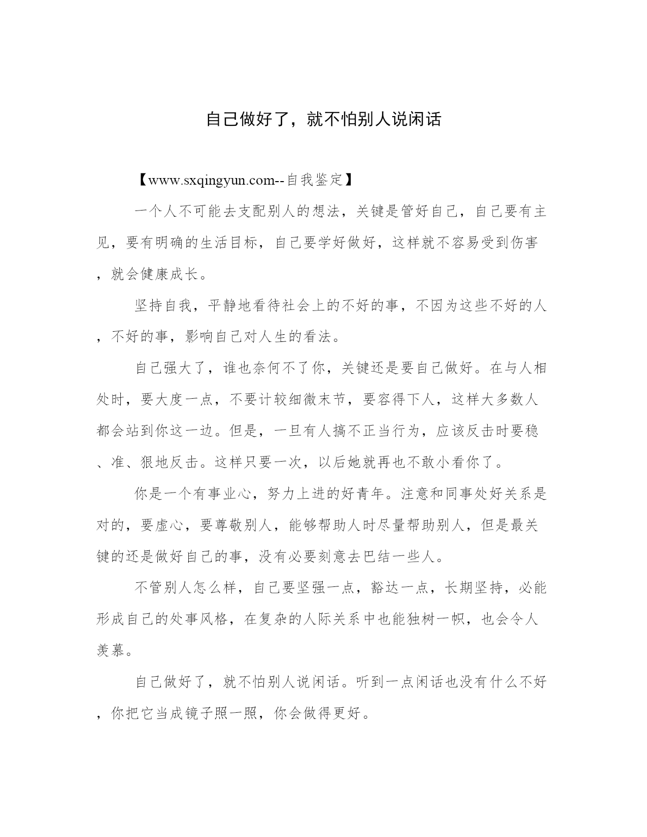 自己做好了,就不怕别人说闲话【www.sxqingyun.com--自我鉴定】一个人不可能去支配别人的想法,关键是管好自己,自己要有主见,要有明确的生活目标,自己要学好做好,这样就不容易受到伤害,就会健康成长。坚持自我,平静地看待社会上的不好的事,不因为这些不好的人,不好的事,影响自己对人生的看法。自己强大了,谁也奈何不了你,关键还是要自己做好。在与人相处时,要大度一点,不要计较细微末节,要容得下人,这样大多数人都会站到你这一边。但是,一旦有人搞不正当行为,应该反击时要稳、准、狠地反击。这样只要一次,以后她就再也不敢小看你了。你是一个有事业心,努力上进的好青年。注意和同事处好关系是对的,要虚心,要尊敬别人,能够帮助人时尽量帮助别人,但是最关键的还是做好自己的事,没有必要刻意去巴结一些人。不管别人怎么样,自己要坚强一点,豁达一点,长期坚持,必能形成自己的处事风格,在复杂的人际关系中也能独树一帜,也会令人羡慕。自己做好了,就不怕别人说闲话。听到一点闲话也没有什么不好,你把它当成镜子照一照,你会做得更好。