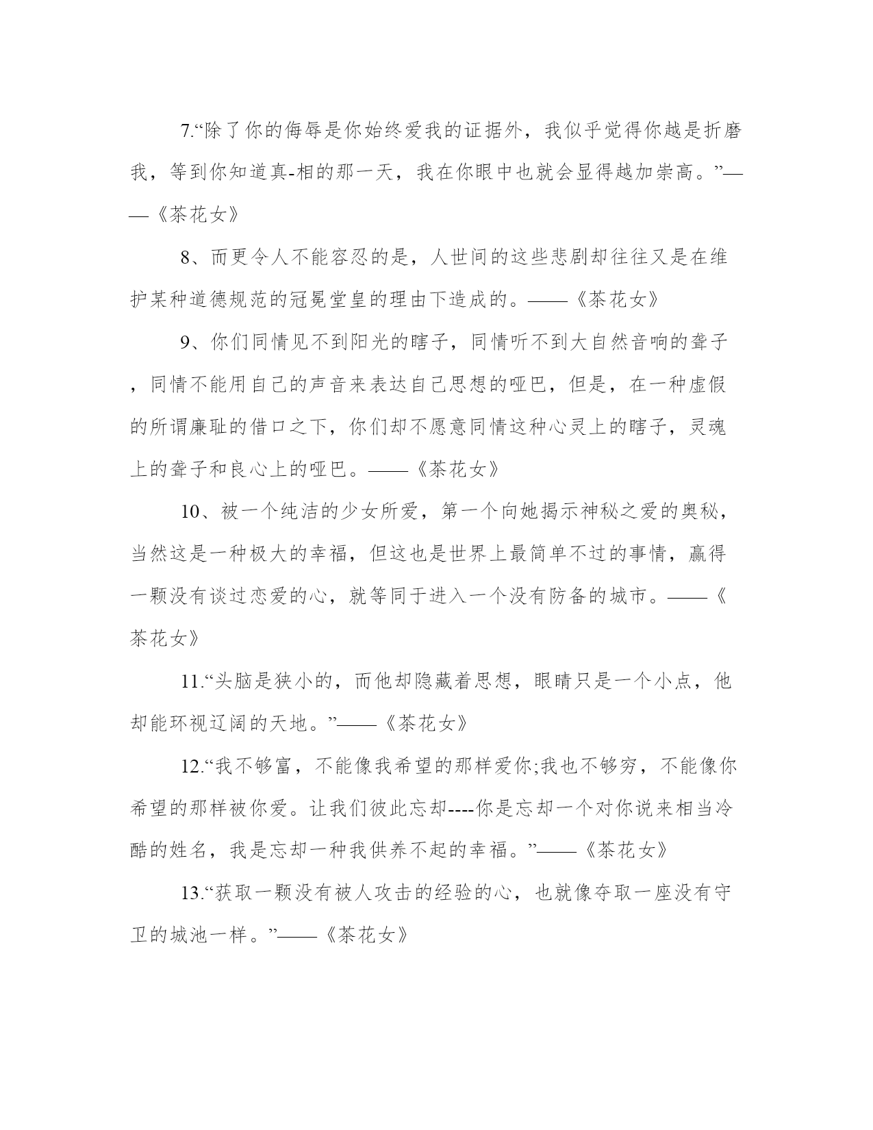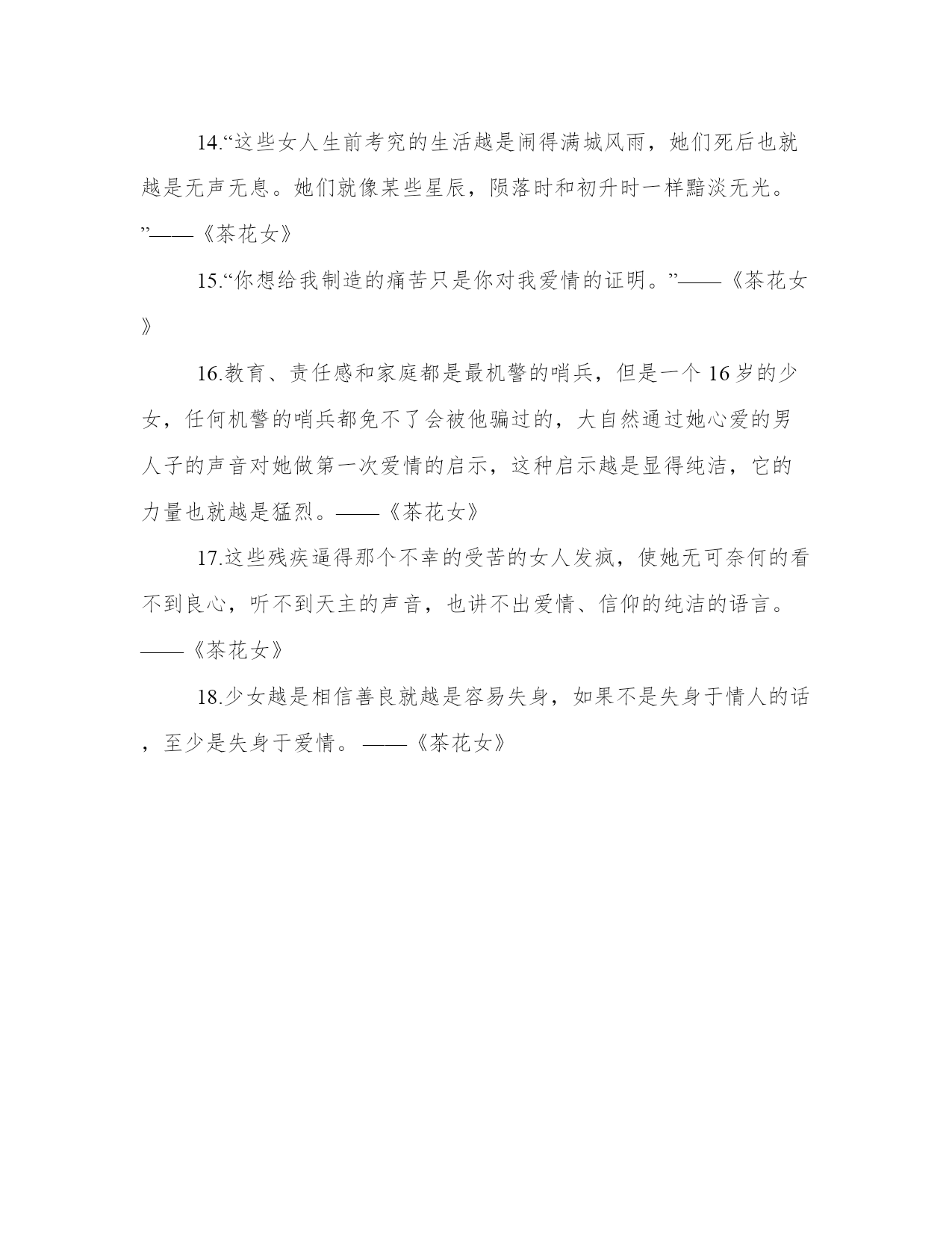 茶花女经典好词好句摘抄【www.sxqingyun.com--爱情说说】1、人生只不过是为了满足不断地欲望,灵魂只不过是维持爱情圣火的守灶女神。——《茶花女》2、像我们这样的关系,如果做女人还有一点点自尊心的话,她就应该忍受所有可能的牺牲,也绝不向她的情人要钱,否则她的爱情就与卖淫无异。——《茶花女》3、一个人心中没有爱情的时候可以满足于虚荣,但一旦有了爱情,虚荣就变得庸俗不堪了。——《茶花女》4、当爱情成了生活中的一种习惯,要想改变这种习惯,而不同时损坏生活中所有其他方面的联系,似乎是不可能的。——《茶花女》5、男人在他那狭隘的欲望受到伤害时,变得有多么渺小和卑鄙呀!——《茶花女》6.“世界上最遥远的距离不是生与死而是我就站在你面前你却不知道我爱你;世界上最遥远的距离不是我就站在你面前你却不知道我爱你,而是明明知道彼此相爱却不能够在一起;世界上最遥远的距离不是明明知道彼此相爱却不能够在一起而是明明无法抵挡这股相爱的气息却不能够不继续。”——《茶花女》7.“除了你的侮辱是你始终爱我的证据外,我似乎觉得你越是折磨我,等到你知道真-相的那一天,我在你眼中也就会显得越加崇高。”——《茶花女》8、而更令人不能容忍的是,人世间的这些悲剧却往往又是在维护某种道德规范的冠冕堂皇的理由下造成的。——《茶花女》9、你们同情见不到阳光的瞎子,同情听不到大自然音响的聋子,同情不能用自己的声音来表达自己思想的哑巴,但是,在一种虚假的所谓廉耻的借口之下,你们却不愿意同情这种心灵上的瞎子,灵魂上的聋子和良心上的哑巴。——《茶花女》10、被一个纯洁的少女所爱,第一个向她揭示神秘之爱的奥秘,当然这是一种极大的幸福,但这也是世界上最简单不过的事情,赢得一颗没有谈过恋爱的心,就等同于进入一个没有防备的城市。——《茶花女》11.“头脑是狭小的,而他却隐藏着思想,眼睛只是一个小点,他却能环视辽阔的天地。”——《茶花女》12.“我不够富,不能像我希望的那样爱你;我也不够穷,不能像你希望的那样被你爱。让我们彼此忘却----你是忘却一个对你说来相当冷酷的姓名,我是忘却一种我供养不起的幸福。”——《茶花女》13.“获取一颗没有被人攻击的经验的心,也就像夺取一座没有守卫的城池一样。”——《茶花女》14.“这些女人生前考究的生活越是闹得满城风雨,她们死后也就越是无声无息。她们就像某些星辰,陨落时和初升时一样黯淡无光。”——《茶花女》15.“你想给我制造的痛苦只是你对我爱情的证明。”——《茶花女》16.教育、责任感和家庭都是最机警的哨兵,但是一个16岁的少女,任何机警的哨兵都免不了会被他骗过的,大自然通过她心爱的男人子的声音对她做第一次爱情的启示,这种启示越是显得纯洁,它的力量也就越是猛烈。——《茶花女》17.这些残疾逼得那个不幸的受苦的女人发疯,使她无可奈何的看不到良心,听不到天主的声音,也讲不出爱情、信仰的纯洁的语言。——《茶花女》18.少女越是相信善良就越是容易失身,如果不是失身于情人的话,至少是失身于爱情。——《茶花女》