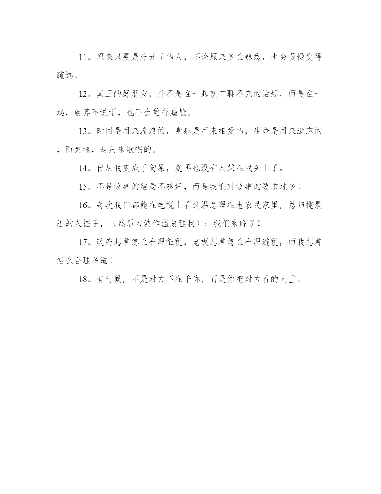周立波搞笑语录【www.sxqingyun.com--搞笑语录】2。我心眼儿有些小,但是不缺;我脾气很好,但不是没有!3。是金子总要发光的,但当满地都是金子的时候,我自己也不知道自己是哪颗了。4。人人以为自己是股神,炒一个赚一个,连小菜场卖葱的阿姨都说:我有消息的!5。单身并不难,难的是应付那些千方百计想让你结束单身的人。6。去披萨店买披萨!服务员问我是要切成8块还是12块?我想了想说:还是8块吧!12块吃不完!7。谎言与誓言的区别在于:一个是听的人当真了,一个是说的人当真了。8。把十个男人和一个女人放荒岛上,三个月后,见男人们做了一顶轿子抬着那个女人在玩耍,女人娇媚动人、面若桃花!再把十个女人和一个男人放荒岛上,三个月后,见女人们围着一棵椰子树,有往上丢石头的,有拿果子逗的,那个男人瘦得像猴子,抱住树死也不肯下来!9。鲜花往往不属于赏花的人,而属于牛粪。10。人和猪的区别就是:猪一直是猪,而人有时却不是人!11。原来只要是分开了的人,不论原来多么熟悉,也会慢慢变得疏远。12。真正的好朋友,并不是在一起就有聊不完的话题,而是在一起,就算不说话,也不会觉得尴尬。13。时间是用来流浪的,身躯是用来相爱的,生命是用来遗忘的,而灵魂,是用来歌唱的。14。自从我变成了狗屎,就再也没有人踩在我头上了。15。不是故事的结局不够好,而是我们对故事的要求过多!16。每次我们都能在电视上看到温总理在老农民家里,总归挑最脏的人握手,(然后力波作温总理状):我们来晚了!17。政府想着怎么合理征税,老板想着怎么合理避税,而我想着怎么合理多睡!18。有时候,不是对方不在乎你,而是你把对方看的太重。
