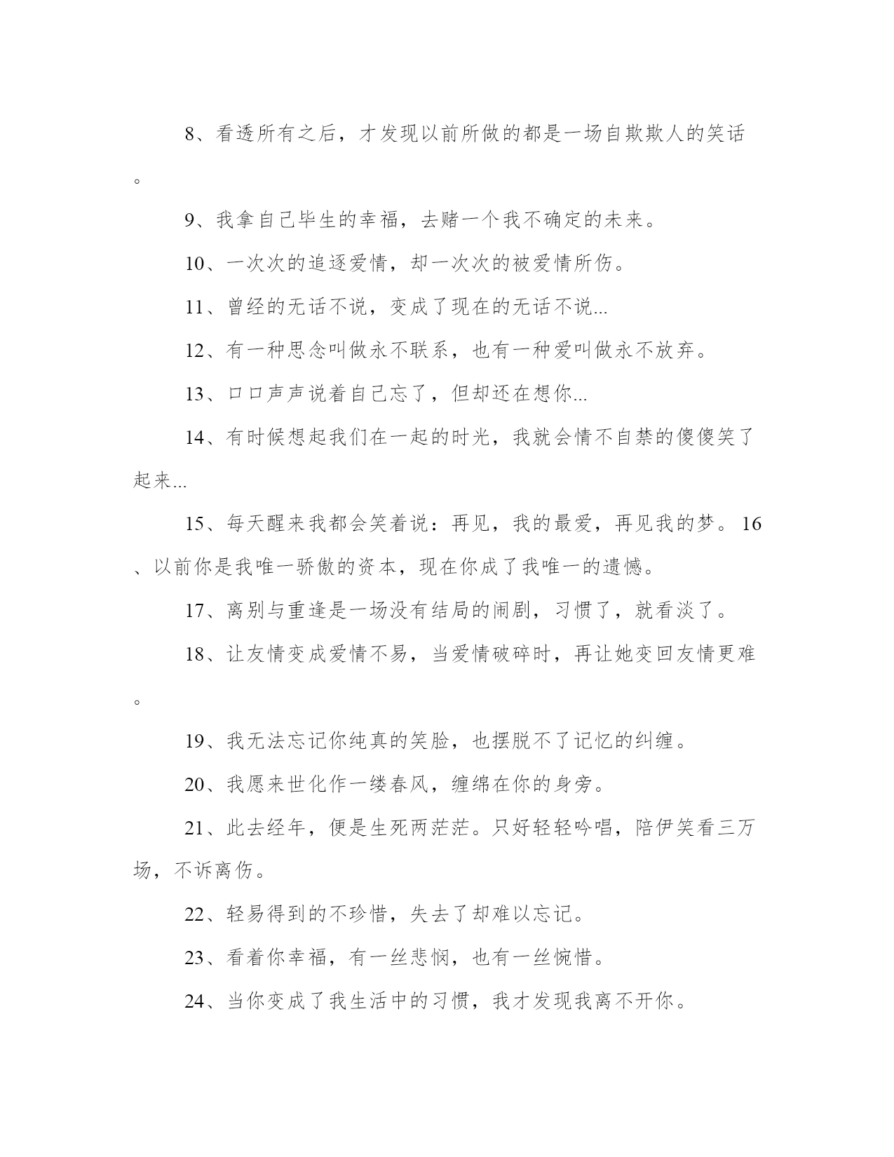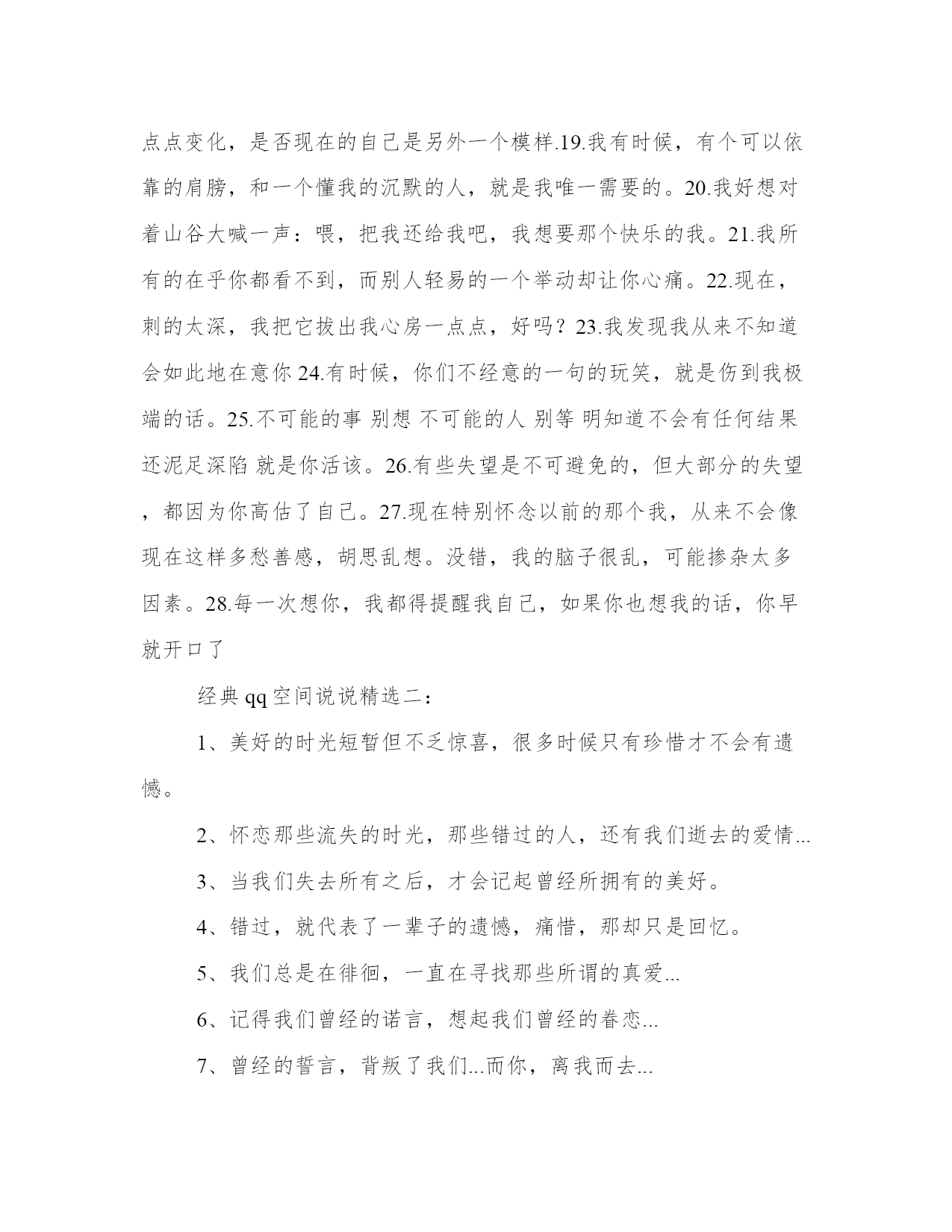 qq空间心情说说:很多人不需要再见,因为只是路过而已【www.sxqingyun.com--心情说说】qq空间大全精选:1.在生活中,给自己留一些空间,多宽容一下自己。搞搞怪,多一点幽默,乐观地去生活吧。2.很多人不需要再见,因为只是路过而已3.找一个你愿意忍受你的人,一起走到最后4.其实,我很累,只是一直没有人懂我5.一个人总是可以善待他毫不在意的人。6.被现实逼出来的成熟的纸孩,多么让人心疼!7.我想成为一个很厉害的人,让这个世界因为有了我而有一点点的改变,而我的世界,不过就是你的心。8.爱一个人,明明知道他的不好,却丝毫不会在意;明明知道比他好的还有很多,却只会倾心于他。9.最大的缺点就是偏执地爱一个不爱自己的人10.坚持做你自己,而不是在路上被别人修改的面目全非。11.如果你累了,请你回头,我一直都在12.我们换心吧,这样你就能懂我心中的难过,我也能看你心里是怎样的我.13.有一些人,总是在有些时候带来温暖,让人迷惑而犹豫的时候却离开了14.能够哭就好,哭是开始痊愈的象征15.我喜欢你长长的身影。这就好像你跟我告别时是不舍的心情。16.有时候,不是对方不在乎你而是你把对方看得太重17.心里有些话,想说出来。也许不一定是为了告诉你,也许有些话只是为了告诉自己。18.你是否和我一样,有时候会想,如果过去的人生的某个环节发生一点点变化,是否现在的自己是另外一个模样.19.我有时候,有个可以依靠的肩膀,和一个懂我的沉默的人,就是我唯一需要的。20.我好想对着山谷大喊一声:喂,把我还给我吧,我想要那个快乐的我。21.我所有的在乎你都看不到,而别人轻易的一个举动却让你心痛。22.现在,刺的太深,我把它拔出我心房一点点,好吗?23.我发现我从来不知道会如此地在意你24.有时候,你们不经意的一句的玩笑,就是伤到我极端的话。25.不可能的事别想不可能的人别等明知道不会有任何结果还泥足深陷就是你活该。26.有些失望是不可避免的,但大部分的失望,都因为你高估了自己。27.现在特别怀念以前的那个我,从来不会像现在这样多愁善感,胡思乱想。没错,我的脑子很乱,可能掺杂太多因素。28.每一次想你,我都得提醒我自己,如果你也想我的话,你早就开口了经典qq空间说说精选二:1、美好的时光短暂但不乏惊喜,很多时候只有珍惜才不会有遗憾。2、怀恋那些流失的时光,那些错过的人,还有我们逝去的爱情...3、当我们失去所有之后,才会记起曾经所拥有的美好。4、错过,就代表了一辈子的遗憾,痛惜,那却只是回忆。5、我们总是在徘徊,一直在寻找那些所谓的真爱...6、记得我们曾经的诺言,想起我们曾经的眷恋...7、曾经的誓言,背叛了我们...而你,离我而去...8、看透所有之后,才发现以前所做的都是一场自欺欺人的笑话。9、我拿自己毕生的幸福,去赌一个我不确定的未来。10、一次次的追逐爱情,却一次次的被爱情所伤。11、曾经的无话不说,变成了现在的无话不说...12、有一种思念叫做永不联系,也有一种爱叫做永不放弃。13、口口声声说着自己忘了,但却还在想你...14、有时候想起我们在一起的时光,我就会情不自禁的傻傻笑了起来...15、每天醒来我都会笑着说:再见,我的最爱,再见我的梦。16、以前你是我唯一骄傲的资本,现在你成了我唯一的遗憾。17、离别与重逢是一场没有结局的闹剧,习惯了,就看淡了。18、让友情变成爱情不易,当爱情破碎时,再让她变回友情更难。19、我无法忘记你纯真的笑脸,也摆脱不了记忆的纠缠。20、我愿来世化作一缕春风,缠绵在你的身旁。21、此去经年,便是生死两茫茫。只好轻轻吟唱,陪伊笑看三万场,不诉离伤。22、轻易得到的不珍惜,失去了却难以忘记。23、看着你幸福,有一丝悲悯,也有一丝惋惜。24、当你变成了我生活中的习惯,我才发现我离不开你。25、怀恋那美好的日子,不知道,我们还是否会回到从前...