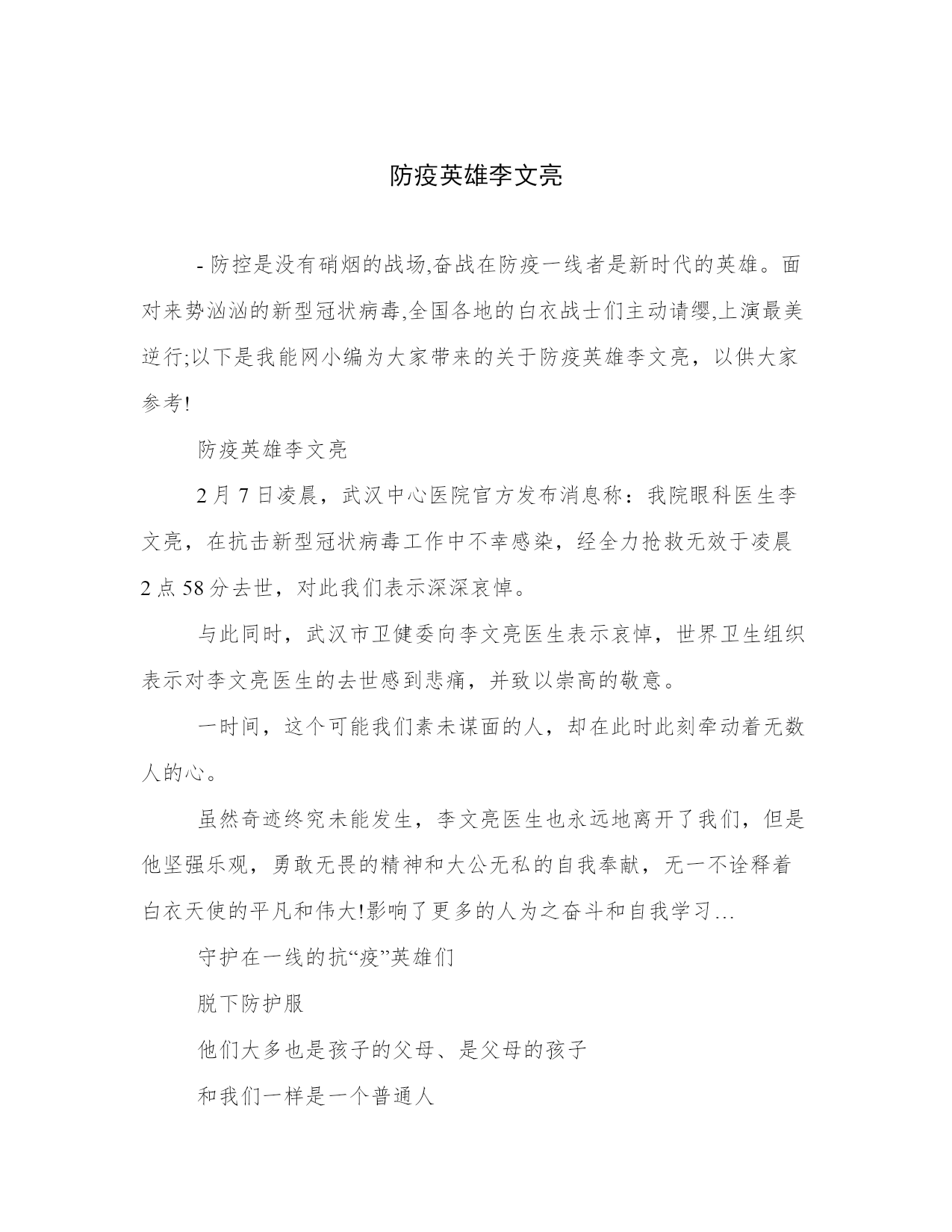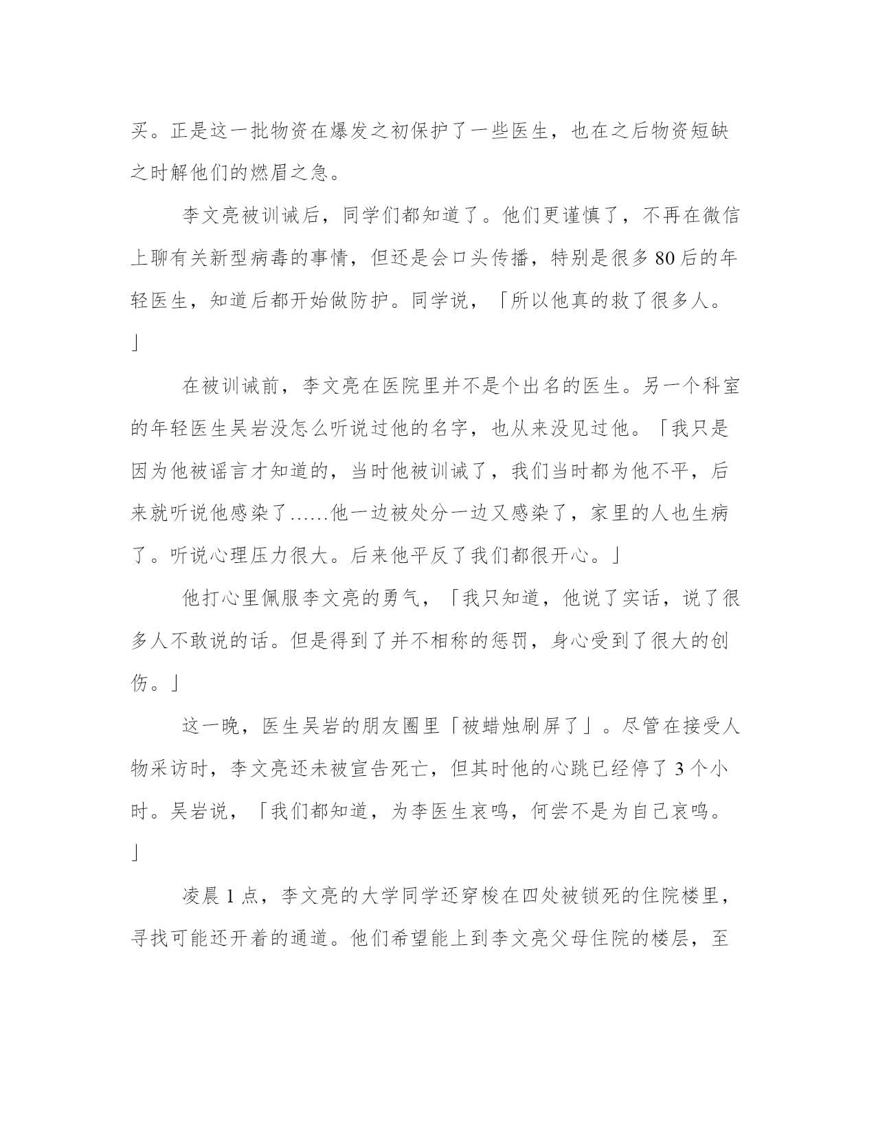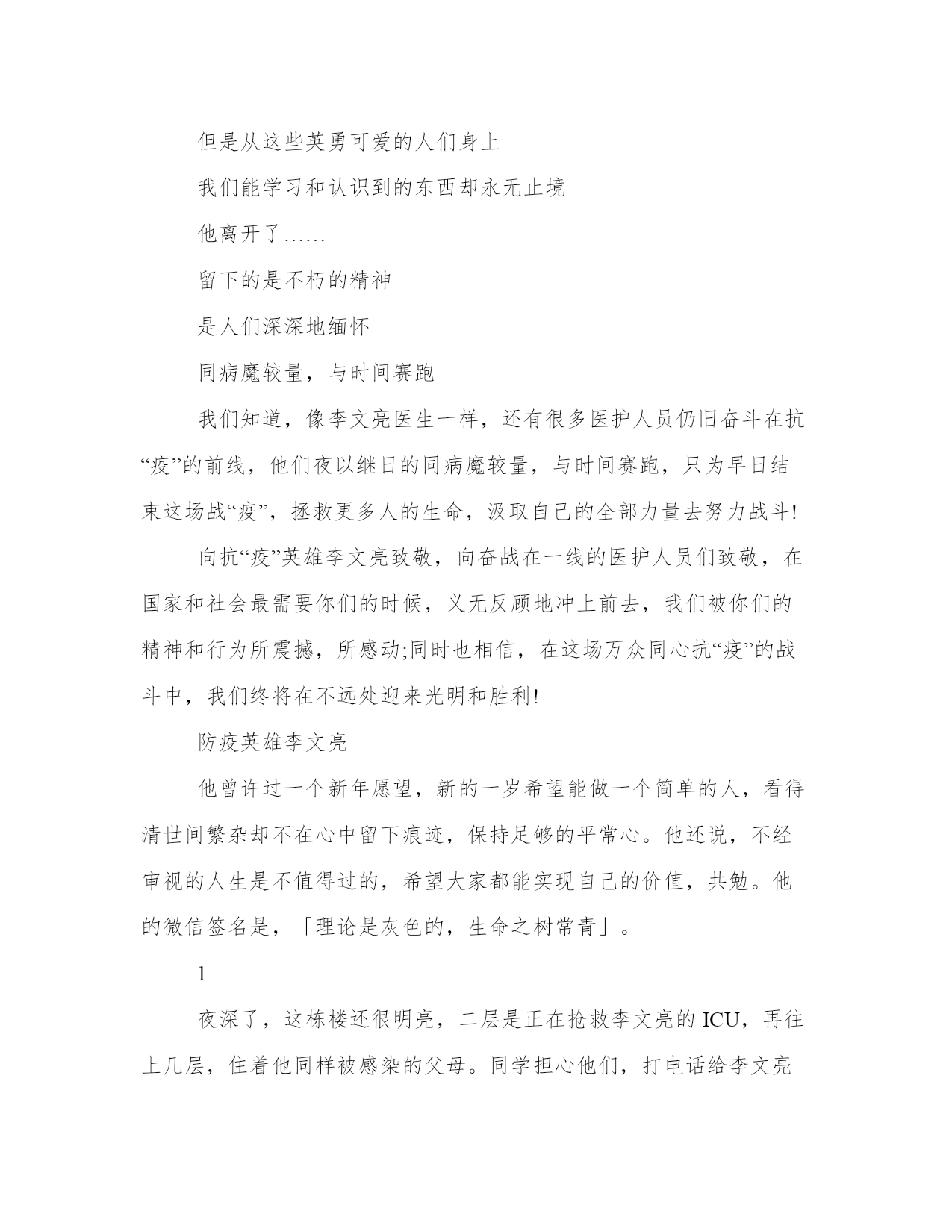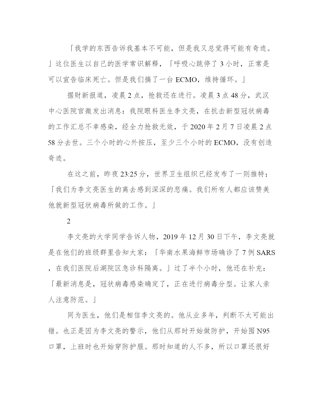 防疫英雄李文亮-防控是没有硝烟的战场,奋战在防疫一线者是新时代的英雄。面对来势汹汹的新型冠状病毒,全国各地的白衣战士们主动请缨,上演最美逆行;以下是我能网小编为大家带来的关于防疫英雄李文亮,以供大家参考!防疫英雄李文亮2月7日凌晨,武汉中心医院官方发布消息称:我院眼科医生李文亮,在抗击新型冠状病毒工作中不幸感染,经全力抢救无效于凌晨2点58分去世,对此我们表示深深哀悼。与此同时,武汉市卫健委向李文亮医生表示哀悼,世界卫生组织表示对李文亮医生的去世感到悲痛,并致以崇高的敬意。一时间,这个可能我们素未谋面的人,却在此时此刻牵动着无数人的心。虽然奇迹终究未能发生,李文亮医生也永远地离开了我们,但是他坚强乐观,勇敢无畏的精神和大公无私的自我奉献,无一不诠释着白衣天使的平凡和伟大!影响了更多的人为之奋斗和自我学习…守护在一线的抗“疫”英雄们脱下防护服他们大多也是孩子的父母、是父母的孩子和我们一样是一个普通人但是从这些英勇可爱的人们身上我们能学习和认识到的东西却永无止境他离开了……留下的是不朽的精神是人们深深地缅怀同病魔较量,与时间赛跑我们知道,像李文亮医生一样,还有很多医护人员仍旧奋斗在抗“疫”的前线,他们夜以继日的同病魔较量,与时间赛跑,只为早日结束这场战“疫”,拯救更多人的生命,汲取自己的全部力量去努力战斗!向抗“疫”英雄李文亮致敬,向奋战在一线的医护人员们致敬,在国家和社会最需要你们的时候,义无反顾地冲上前去,我们被你们的精神和行为所震撼,所感动;同时也相信,在这场万众同心抗“疫”的战斗中,我们终将在不远处迎来光明和胜利!防疫英雄李文亮他曾许过一个新年愿望,新的一岁希望能做一个简单的人,看得清世间繁杂却不在心中留下痕迹,保持足够的平常心。他还说,不经审视的人生是不值得过的,希望大家都能实现自己的价值,共勉。他的微信签名是,「理论是灰色的,生命之树常青」。1夜深了,这栋楼还很明亮,二层是正在抢救李文亮的ICU,再往上几层,住着他同样被感染的父母。同学担心他们,打电话给李文亮父亲,希望能上去陪着。但医院的工作人员正陪在他父亲身边,在电话里拒绝了这一请求。后来他们又与在外地的、怀着孕的李文亮妻子通话,她着急、担忧,但又不知道最新的信息。他们告诉她:「有什么消息的话,一定会第一时间给你打电话。」那时刚过零点,院方还在继续着对李文亮的抢救。但有一位楼里的护士,穿得很单薄,独自下到一楼,大哭起来。先是靠着墙,后来又蹲在地上哭。就算是站在十几米外,那哭声都清晰可闻,在深夜安静的医院里回荡。同学谈到了李文亮的病情。李文亮曾在几天前接受媒体采访,看起来精神状态不错。但实际上,十多天来,李文亮一直都没有脱离过呼吸机。他的同学说,「这本来就是个很不好的预兆。」昨天下午,李文亮从武汉中心医院南京路院区转到后湖院区,据这位同学说,原因是他已经需要用ECMO(体外肺循环)了,但是中心医院南京路院区没有——他们的所有设备全都被调到了金银潭医院。而后湖院区还有一台,能救他的命。但网上也有另一种说法,说这台呼吸机,也是从另一家医院借的。他的病情已经严重到了要用体外肺的地步了吗?这位同学说,「实际上,早就该用了。」「我尽管知道他大约已经走了,但是我仍然盼望网上的传言是真的,ECMO能够创造奇迹。」今天凌晨00:43,该医生告诉人物。「我学的东西告诉我基本不可能,但是我又总觉得可能有奇迹。」这位医生以自己的医学常识解释,「呼吸心跳停了3小时,正常是可以宣告临床死亡。但是我们搞了一台ECMO,维持循环。」据财新报道,凌晨2点,抢救还在进行。凌晨3点48分,武汉中心医院官微发出消息:我院眼科医生李文亮,在抗击新型冠状病毒的工作汇总不幸感染,经全力抢救无效,于2020年2月7日凌晨2点58分去世。三个小时的心外按压,至少三个小时的ECMO,没有创造奇迹。在这之前,昨夜23:25分,世界卫生组织已经发布了一则推特:「我们为李文亮医生的离去感到深深的悲痛。我们所有人都应该赞美他就新型冠状病毒所做的工作。」2李文亮的大学同学告诉人物,2019年12月30日下午,李文亮就是在他们的班级群里告知大家:「华南水果海鲜市场确诊了7例SARS,在我们医院后湖院区急诊科隔离。」过了半个小时,他还在补充:「最新消息是,冠状病毒感染确定了,正在进行病毒分型。让家人亲人注意防范。」同为医生,他们是相信李文亮的。他从业多年,判断不太可能出错。也正是因为李文亮的警示,他们从那时开始做防护,开始囤N95口罩,上班时也开始穿防护服。那时知道的人不多,所以口罩还很好买。正是这一批物资在爆发之初保护了一些医生,也在之后物资短缺之时解他们的燃眉之急。李文亮被训诫后,同学们都知道了。他们更谨慎了,不再在微信上聊有关新型病毒的事情,但还是会口头传播,特别是很多80后的年轻医生,知道后都开始做防护。同学说,「所以他真