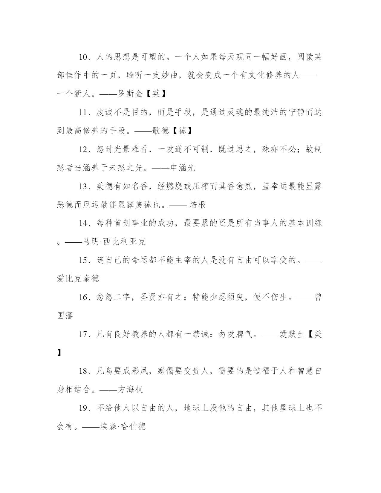 关于素质的名人名言警句大全【www.sxqingyun.com--其他名言】2、真正的自由属于那些自食其力的人,并且在自己的工作中有所作为的人。——罗·科林伍德3、在普遍堕落的人群当中,自由是不可能长久存在的。——伯克4、勇气是一种素质,有了勇气,一切事情都好办了。——巴里5、修养的本质如同人的性格,最终还是归结到道德情操这个问题上。——爱默生【美】6、性情的修养,不是为了别人,而是为自己增强生活能力。——池田大作【日】7、心的陶冶,心的修养和锻炼是替美的发现和体验做准备。——宗白华8、身不修则德不立,德不立而能化成于家者盖寡矣,而况于天下乎?——武则天9、如果我们自己心中没有自由与宁静,如果我们内心深处和隐藏最深的自我只不过是一潭酸臭污浊的死水,那么争取身外的自由又有什么价值呢?——梭格10、人的思想是可塑的。一个人如果每天观同一幅好画,阅读某部佳作中的一页,聆听一支妙曲,就会变成一个有文化修养的人——一个新人。——罗斯金【英】11、虔诚不是目的,而是手段,是通过灵魂的最纯洁的宁静而达到最高修养的手段。——歌德【德】12、怒时光景难看,一发遂不可制,既过思之,殊亦不必;故制怒者当涵养于未怒之先。——申涵光13、美德有如名香,经燃烧或压榨而其香愈烈,盖幸运最能显露恶德而厄运最能显露美德也。——培根14、每种首创事业的成功,最要紧的还是所有当事人的基本训练。——马明·西比利亚克15、连自己的命运都不能主宰的人是没有自由可以享受的。——爱比克泰德16、忿怒二字,圣贤亦有之;特能少忍须臾,便不伤生。——曾国藩17、凡有良好教养的人都有一禁诫:勿发脾气。——爱默生【美】18、凡鸟要成彩凤,寒儒要变贵人,需要的是造福于人和智慧自身相结合。——方海权19、不给他人以自由的人,地球上没他的自由,其他星球上也不会有。——埃森·哈伯德
