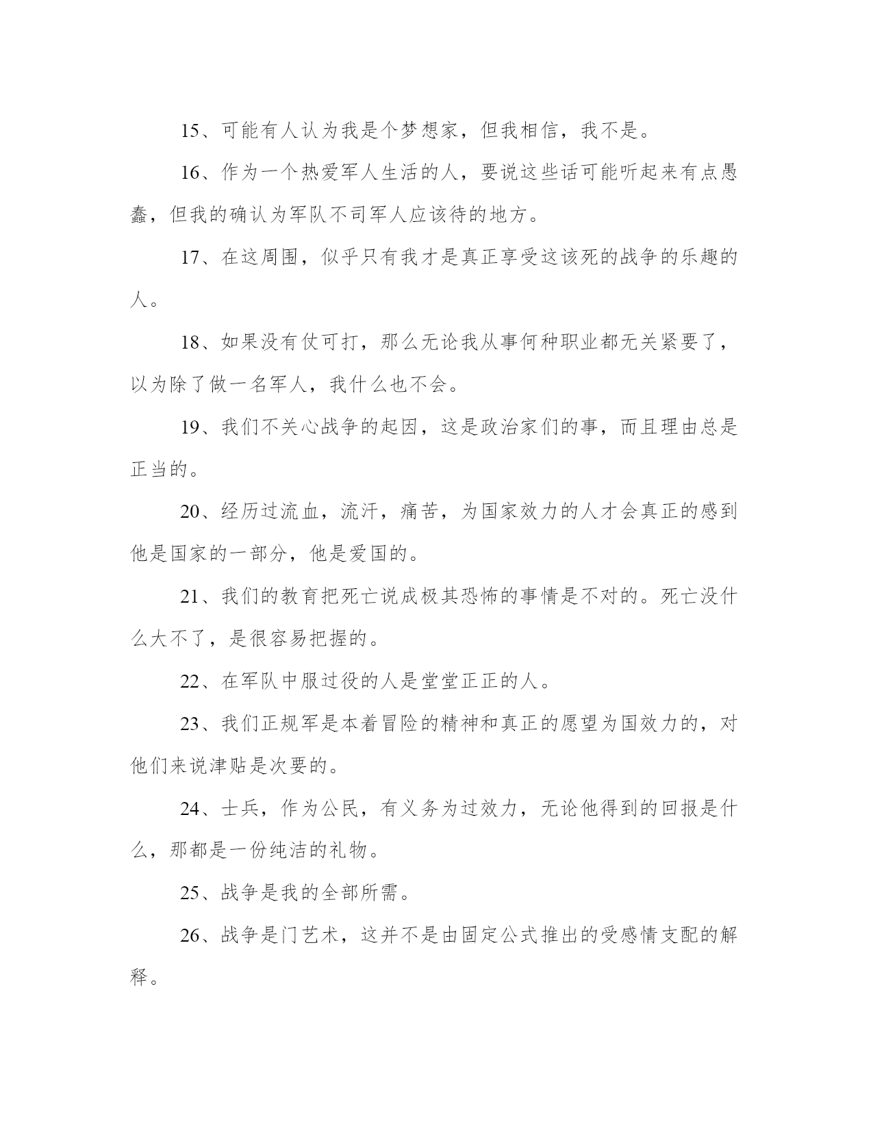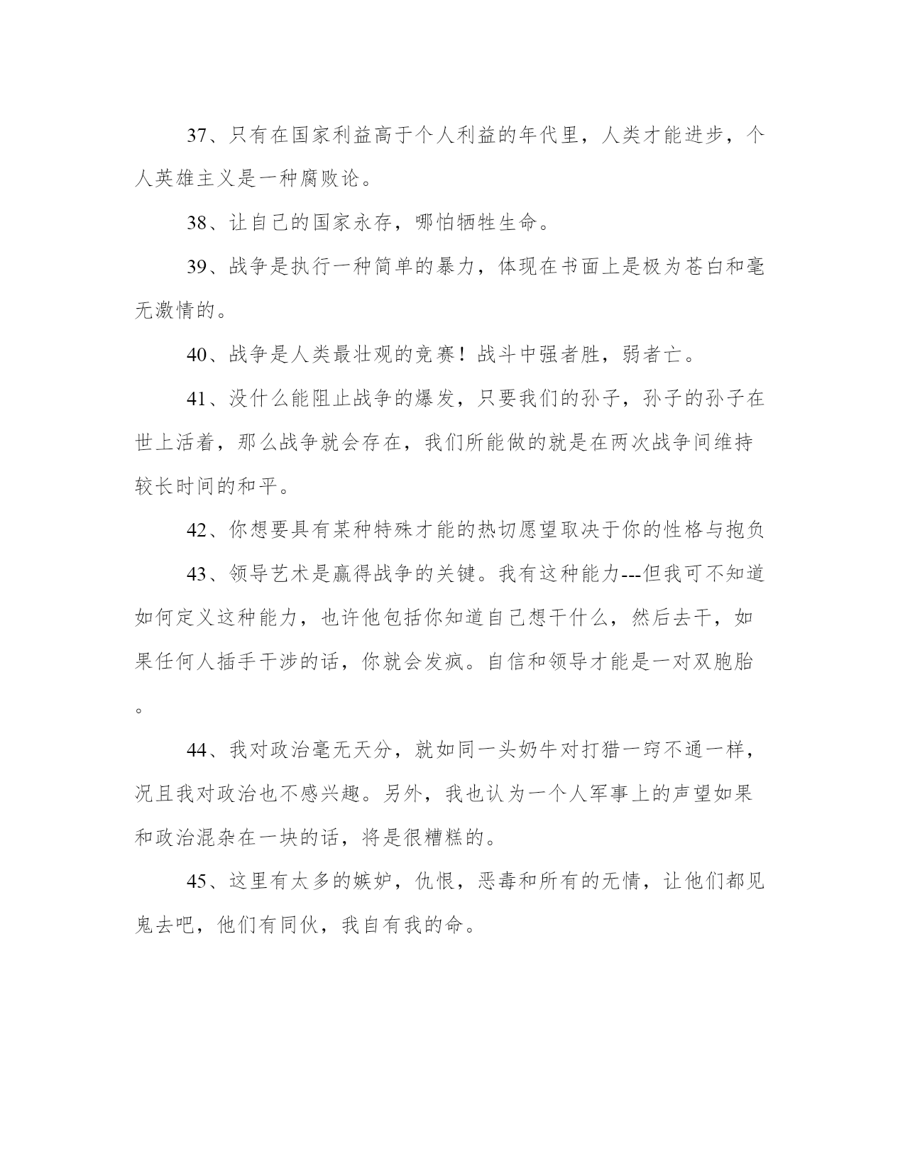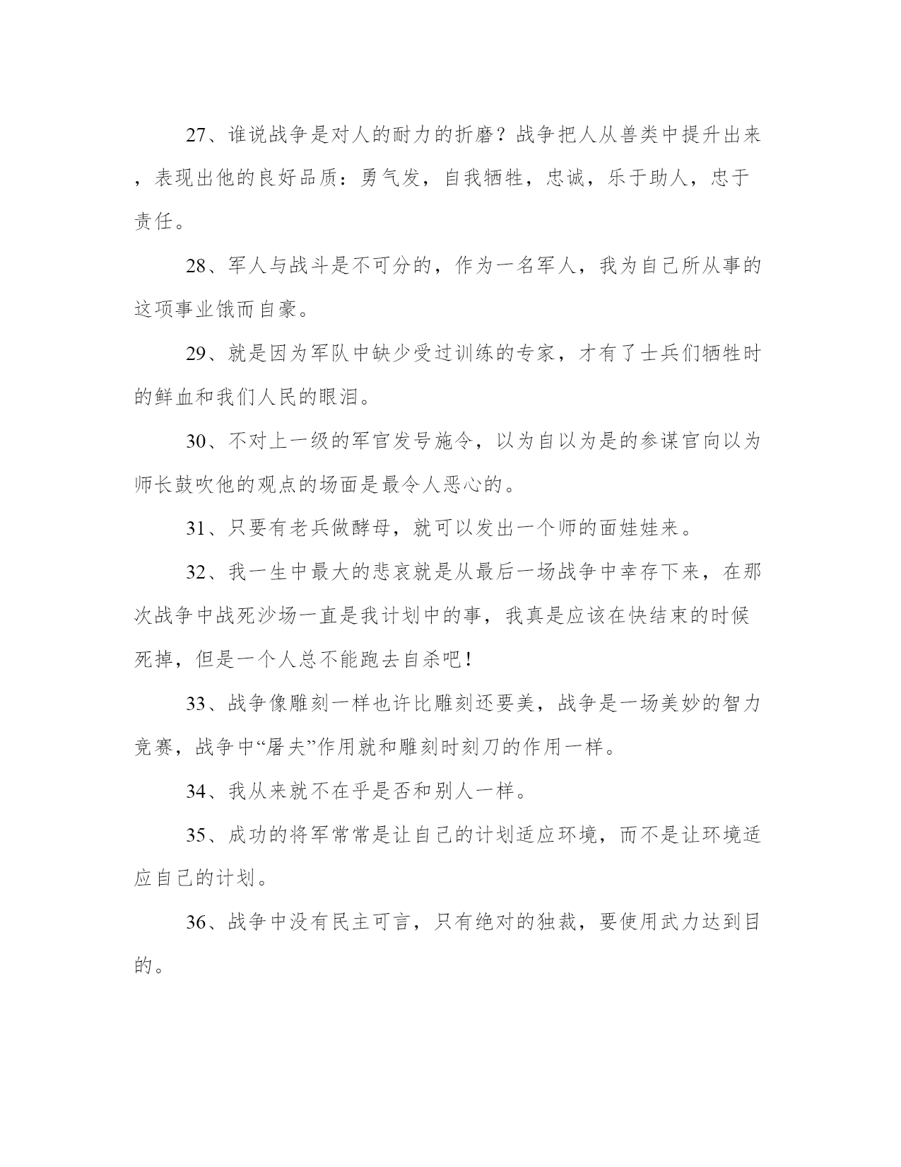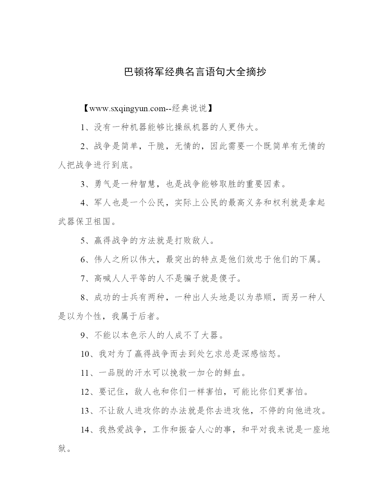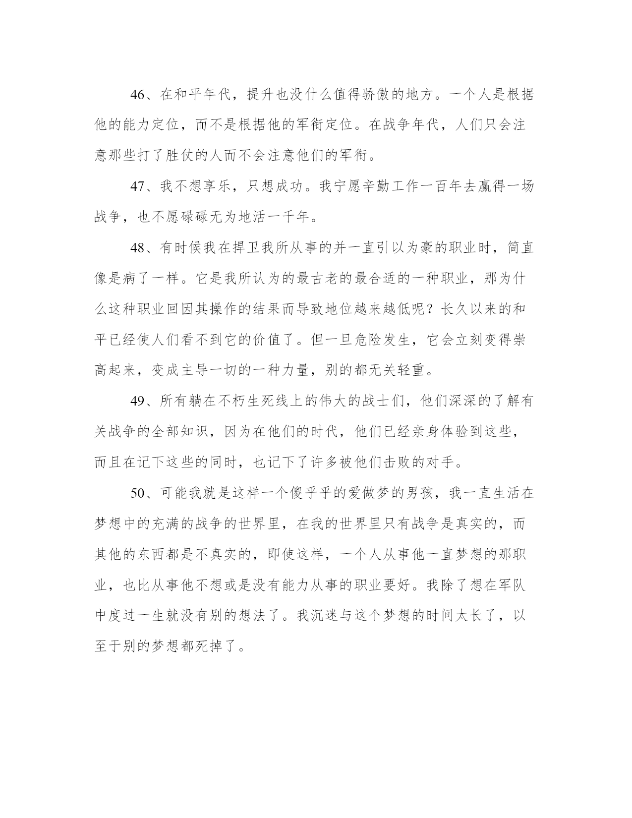 巴顿将军经典名言语句大全摘抄【www.sxqingyun.com--经典说说】1、没有一种机器能够比操纵机器的人更伟大。2、战争是简单,干脆,无情的,因此需要一个既简单有无情的人把战争进行到底。3、勇气是一种智慧,也是战争能够取胜的重要因素。4、军人也是一个公民,实际上公民的最高义务和权利就是拿起武器保卫祖国。5、赢得战争的方法就是打败敌人。6、伟人之所以伟大,最突出的特点是他们效忠于他们的下属。7、高喊人人平等的人不是骗子就是傻子。8、成功的士兵有两种,一种出人头地是以为恭顺,而另一种人是以为个性,我属于后者。9、不能以本色示人的人成不了大器。10、我对为了赢得战争而去到处乞求总是深感恼怒。11、一品脱的汗水可以挽救一加仑的鲜血。12、要记住,敌人也和你们一样害怕,可能比你们更害怕。13、不让敌人进攻你的办法就是你去进攻他,不停的向他进攻。14、我热爱战争,工作和振奋人心的事,和平对我来说是一座地狱。15、可能有人认为我是个梦想家,但我相信,我不是。16、作为一个热爱军人生活的人,要说这些话可能听起来有点愚蠢,但我的确认为军队不司军人应该待的地方。17、在这周围,似乎只有我才是真正享受这该死的战争的乐趣的人。18、如果没有仗可打,那么无论我从事何种职业都无关紧要了,以为除了做一名军人,我什么也不会。19、我们不关心战争的起因,这是政治家们的事,而且理由总是正当的。20、经历过流血,流汗,痛苦,为国家效力的人才会真正的感到他是国家的一部分,他是爱国的。21、我们的教育把死亡说成极其恐怖的事情是不对的。死亡没什么大不了,是很容易把握的。22、在军队中服过役的人是堂堂正正的人。23、我们正规军是本着冒险的精神和真正的愿望为国效力的,对他们来说津贴是次要的。24、士兵,作为公民,有义务为过效力,无论他得到的回报是什么,那都是一份纯洁的礼物。25、战争是我的全部所需。26、战争是门艺术,这并不是由固定公式推出的受感情支配的解释。27、谁说战争是对人的耐力的折磨?战争把人从兽类中提升出来,表现出他的良好品质:勇气发,自我牺牲,忠诚,乐于助人,忠于责任。28、军人与战斗是不可分的,作为一名军人,我为自己所从事的这项事业饿而自豪。29、就是因为军队中缺少受过训练的专家,才有了士兵们牺牲时的鲜血和我们人民的眼泪。30、不对上一级的军官发号施令,以为自以为是的参谋官向以为师长鼓吹他的观点的场面是最令人恶心的。31、只要有老兵做酵母,就可以发出一个师的面娃娃来。32、我一生中最大的悲哀就是从最后一场战争中幸存下来,在那次战争中战死沙场一直是我计划中的事,我真是应该在快结束的时候死掉,但是一个人总不能跑去自杀吧!33、战争像雕刻一样也许比雕刻还要美,战争是一场美妙的智力竞赛,战争中“屠夫”作用就和雕刻时刻刀的作用一样。34、我从来就不在乎是否和别人一样。35、成功的将军常常是让自己的计划适应环境,而不是让环境适应自己的计划。36、战争中没有民主可言,只有绝对的独裁,要使用武力达到目的。37、只有在国家利益高于个人利益的年代里,人类才能进步,个人英雄主义是一种腐败论。38、让自己的国家永存,哪怕牺牲生命。39、战争是执行一种简单的暴力,体现在书面上是极为苍白和毫无激情的。40、战争是人类最壮观的竞赛!战斗中强者胜,弱者亡。41、没什么能阻止战争的爆发,只要我们的孙子,孙子的孙子在世上活着,那么战争就会存在,我们所能做的就是在两次战争间维持较长时间的和平。42、你想要具有某种特殊才能的热切愿望取决于你的性格与抱负43、领导艺术是赢得战争的关键。我有这种能力---但我可不知道如何定义这种能力,也许他包括你知道自己想干什么,然后去干,如果任何人插手干涉的话,你就会发疯。自信和领导才能是一对双胞胎。44、我对政治毫无天分,就如同一头奶牛对打猎一窍不通一样,况且我对政治也不感兴趣。另外,我也认为一个人军事上的声望如果和政治混杂在一块的话,将是很糟糕的。45、这里有太多的嫉妒,仇恨,恶毒和所有的无情,让他们都见鬼去吧,他们有同伙,我自有我的命。46、在和平年代,提升也没什么值得骄傲的地方。一个人是根据他的能力定位,而不是根据他的军衔定位。在战争年代,人们只会注意那些打了胜仗的人而不会注意他们的军衔。47、我不想享乐,只想成功。我宁愿辛勤工作一百年去赢得一场战争,也不愿碌碌无为地活一千年。48、有时候我在捍卫我所从事的并一直引以为豪的职业时,简直像是病了一样。它是我所认为的最古老的最合适的一种职业,那为什么这种职业回因其操作的结果而导致地位越来越低呢?长久以来的和平已经使人们看不到它的价值了。但一旦危险发生,它会立刻变得崇高起来,变成主导一切的一种力量,别的都无关轻重。49、所有躺在不朽生死线上的伟大的战士们,他们深深的了解有关战争的全部知识,因为在他们的时代,他