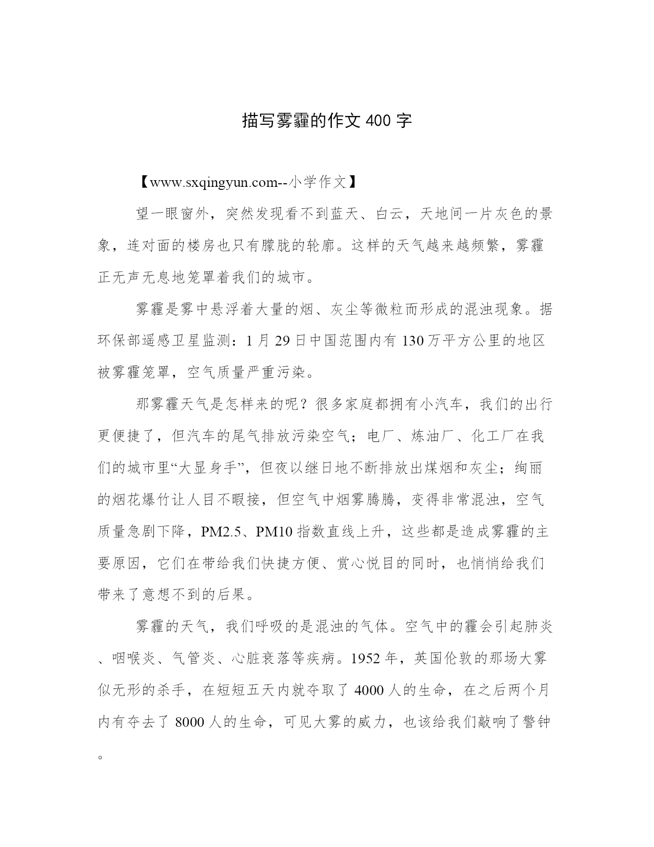描写雾霾的作文400字【www.sxqingyun.com--小学作文】望一眼窗外,突然发现看不到蓝天、白云,天地间一片灰色的景象,连对面的楼房也只有朦胧的轮廓。这样的天气越来越频繁,雾霾正无声无息地笼罩着我们的城市。雾霾是雾中悬浮着大量的烟、灰尘等微粒而形成的混浊现象。据环保部遥感卫星监测:1月29日中国范围内有130万平方公里的地区被雾霾笼罩,空气质量严重污染。那雾霾天气是怎样来的呢?很多家庭都拥有小汽车,我们的出行更便捷了,但汽车的尾气排放污染空气;电厂、炼油厂、化工厂在我们的城市里“大显身手”,但夜以继日地不断排放出煤烟和灰尘;绚丽的烟花爆竹让人目不暇接,但空气中烟雾腾腾,变得非常混浊,空气质量急剧下降,PM2.5、PM10指数直线上升,这些都是造成雾霾的主要原因,它们在带给我们快捷方便、赏心悦目的同时,也悄悄给我们带来了意想不到的后果。雾霾的天气,我们呼吸的是混浊的气体。空气中的霾会引起肺炎、咽喉炎、气管炎、心脏衰落等疾病。1952年,英国伦敦的那场大雾似无形的杀手,在短短五天内就夺取了4000人的生命,在之后两个月内有夺去了8000人的生命,可见大雾的威力,也该给我们敲响了警钟。我们要的是清新的空气,要的是健康的体魄。请不要以牺牲健康为代价,而换来所谓的美好生活。少开车,绿色出行,多种树,保护森林。治霾,从我做起。